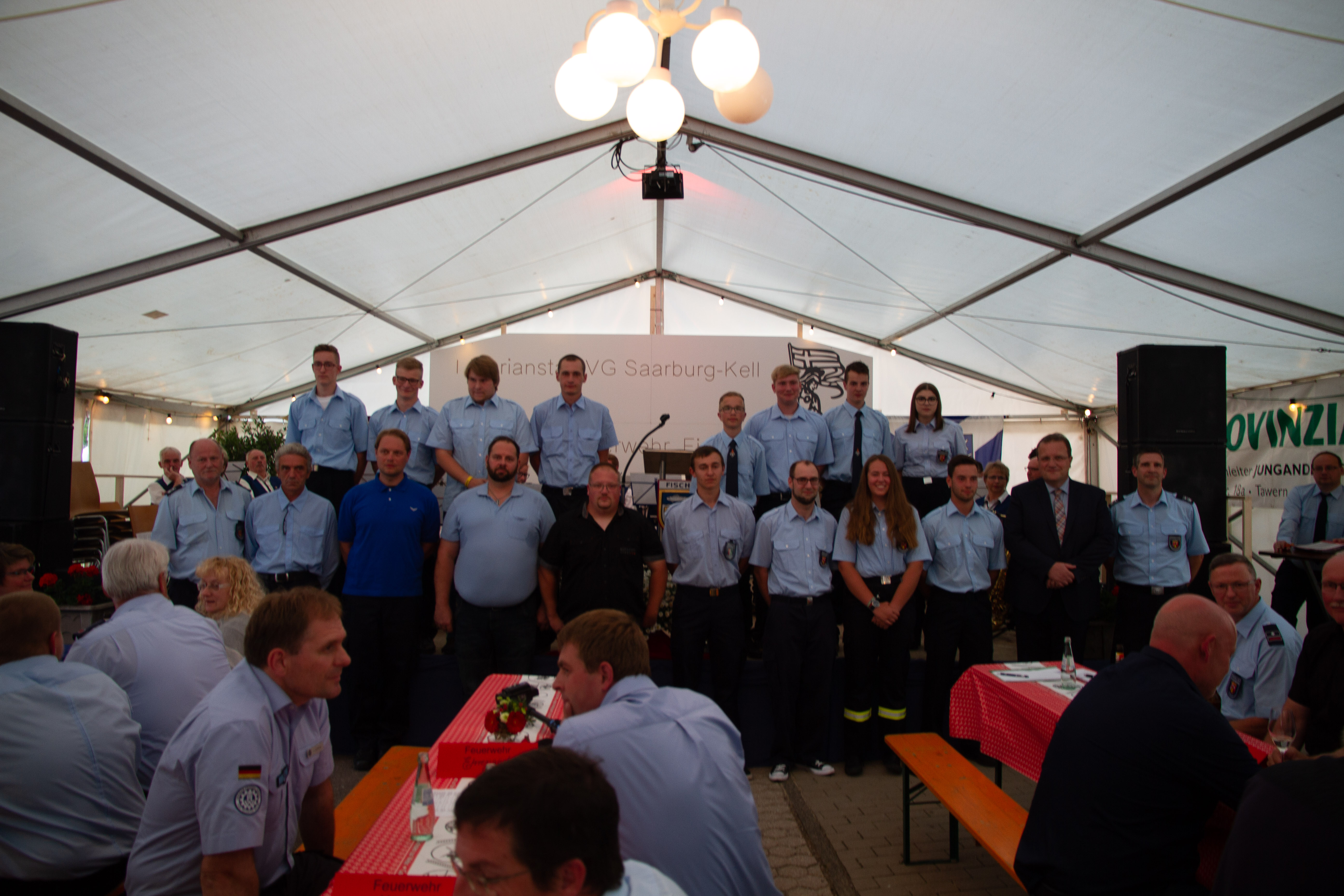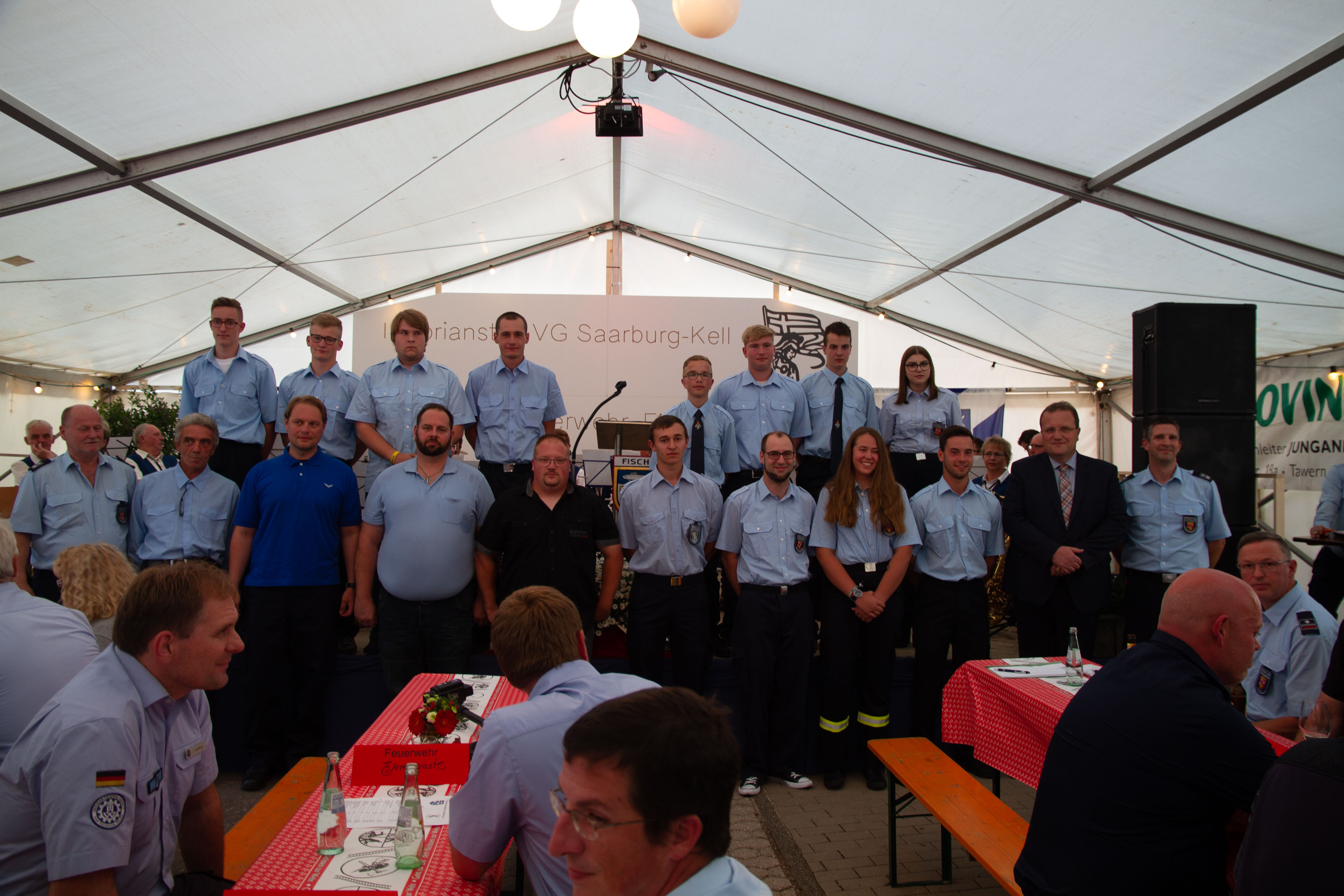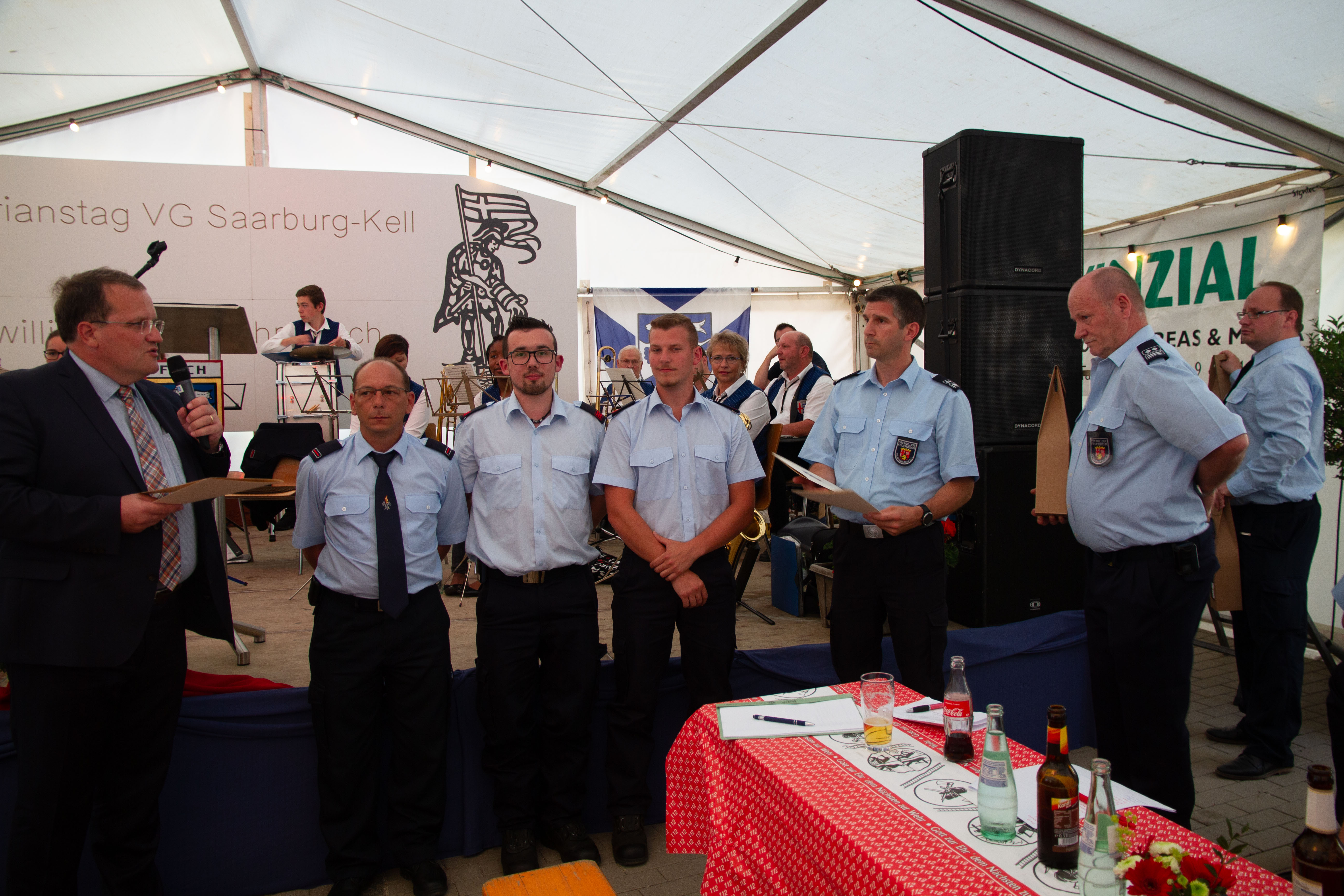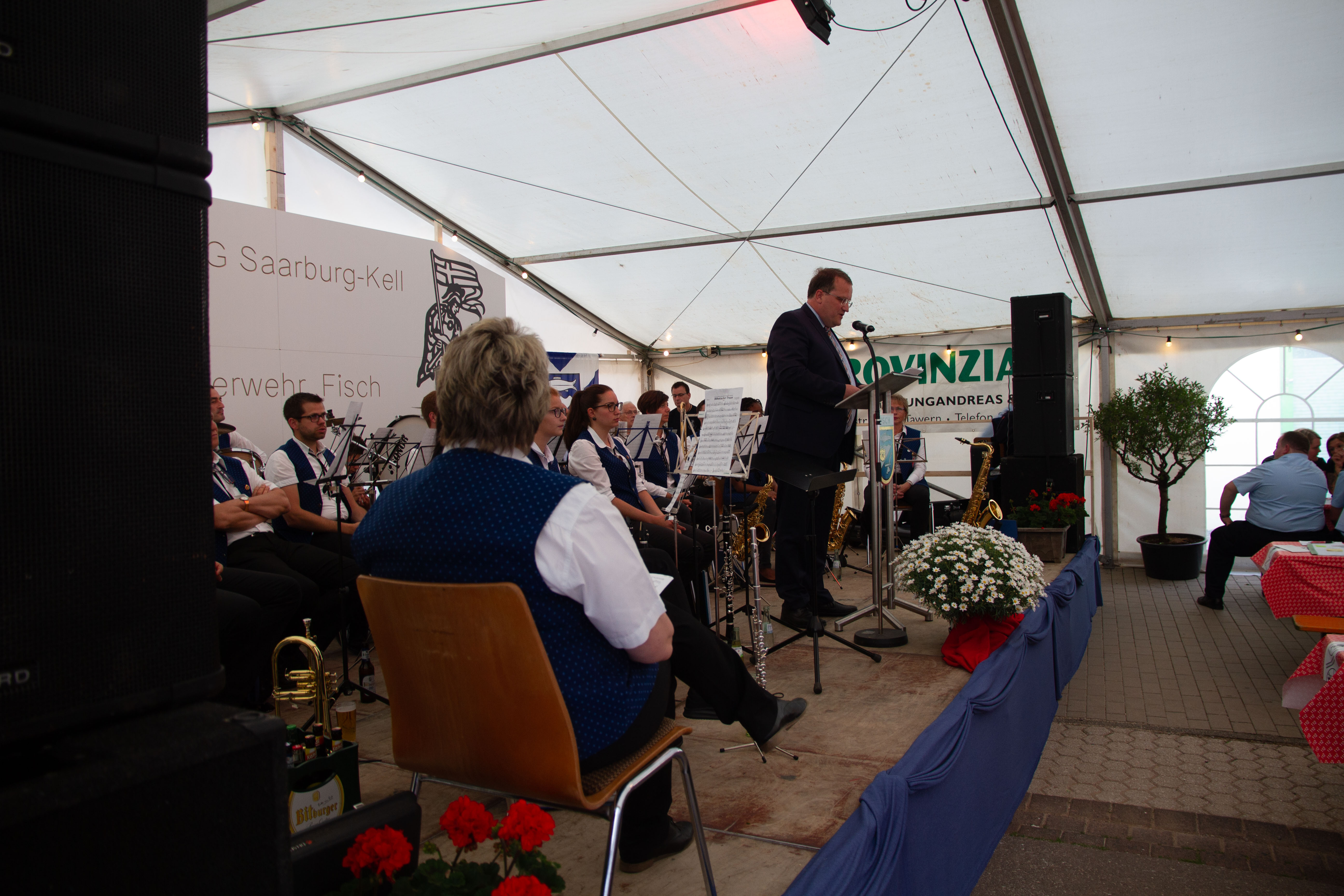 In seiner Ansprache bedankte sich Martin Alten bei der Feuerwehr Fisch für die Ausrichtung dieser Festveranstaltung. Dieses Fest bietet den Feuerwehrleuten der beiden ehemaligen Verbandsgemeinden Saarburg und Kell die Möglichkeit sich kennenzulernen und es ist ein wichtiger Baustein des Zusammenwachsens innerhalb der neuen Verbandsgemeinde. Gerade in den Feuerwehren sind ein gutes Miteinander und ein starkes Wehrgefühl sehr wichtig. In 47 Feuerwehreinheiten sind zurzeit rund 1000 Feuerwehrleute ehrenamtlich rund um die Uhr in 365 Tagen tätig, um in Not geratenen Menschen und Sachwerte zu schützen.