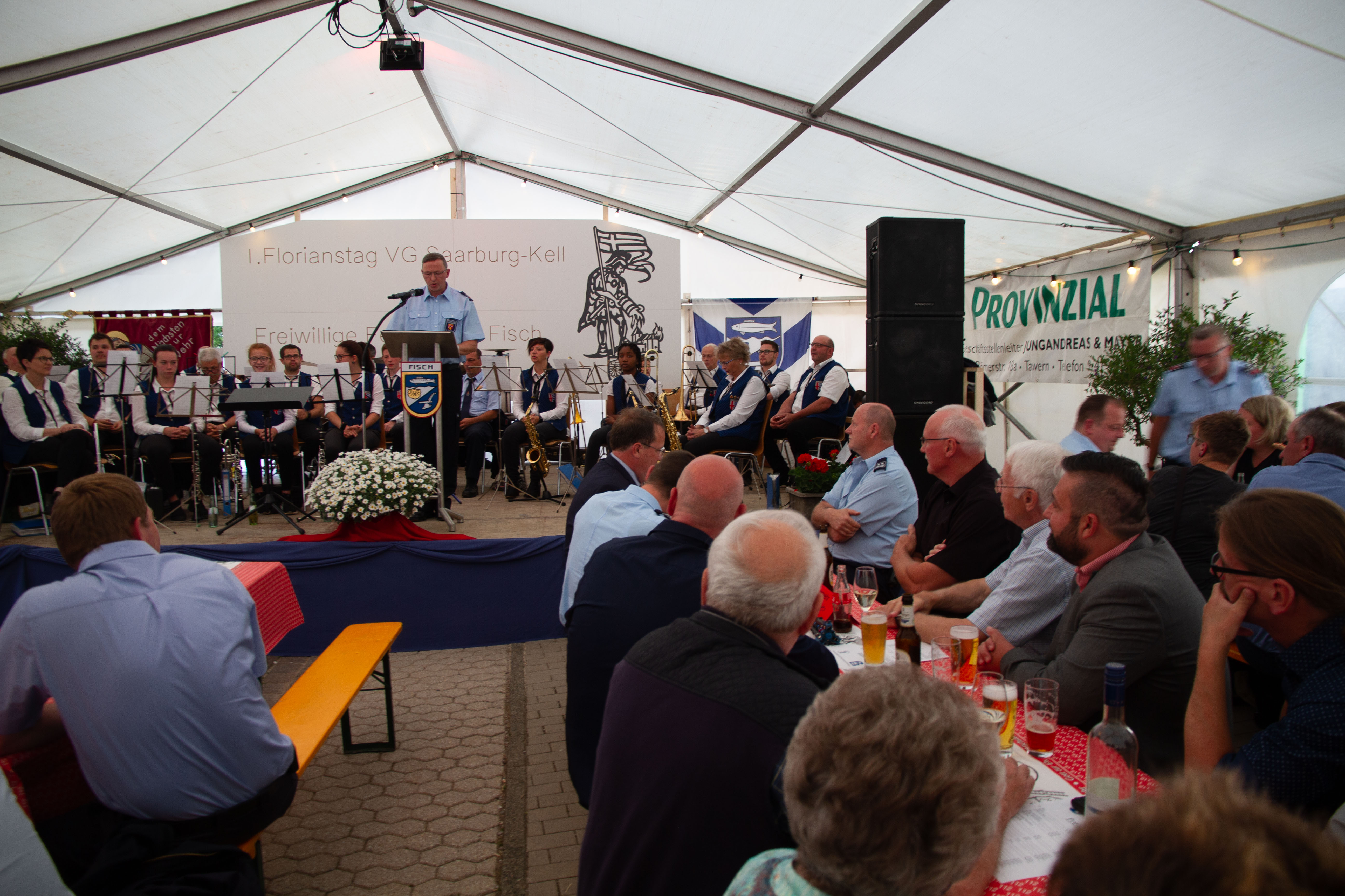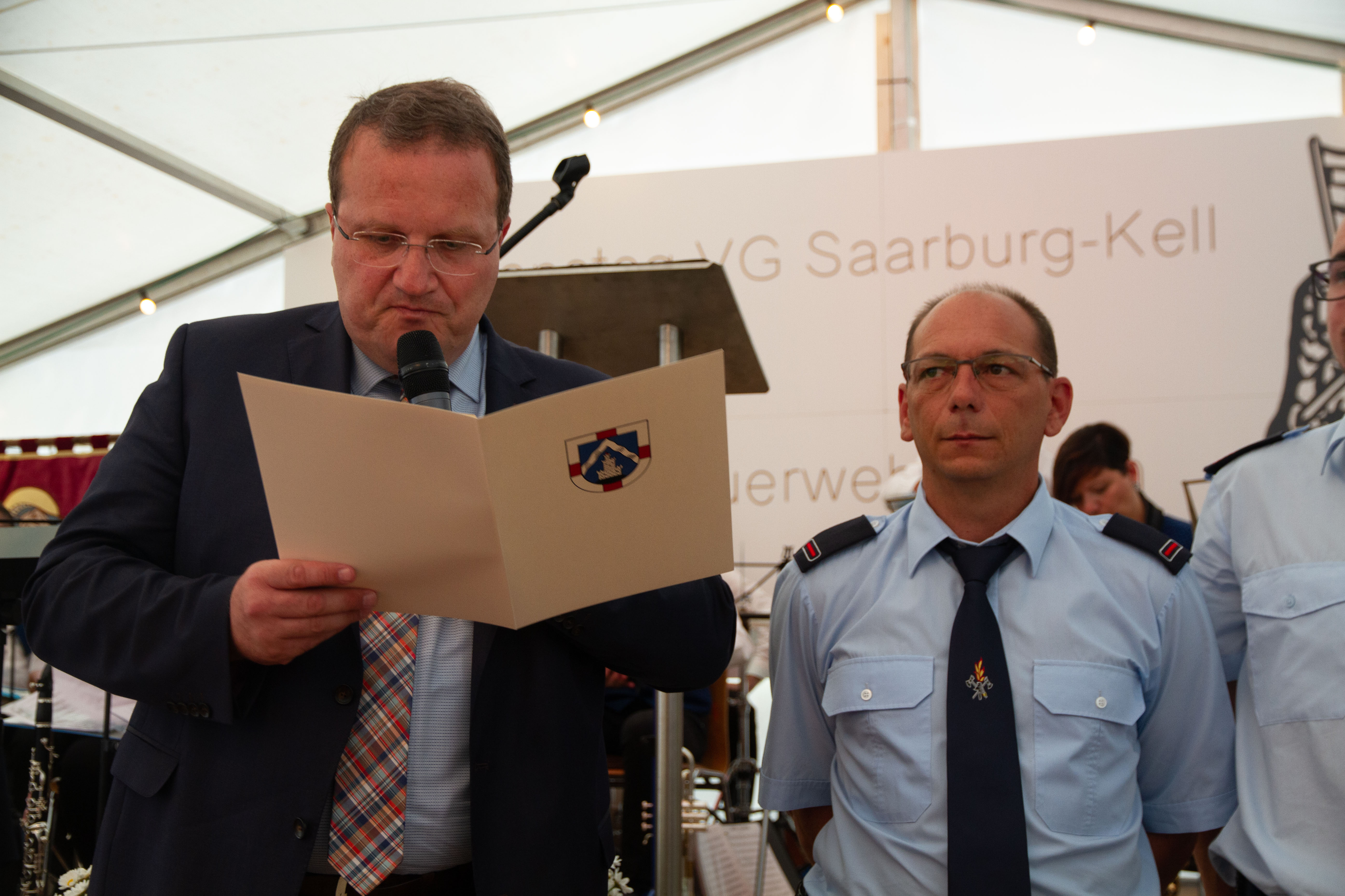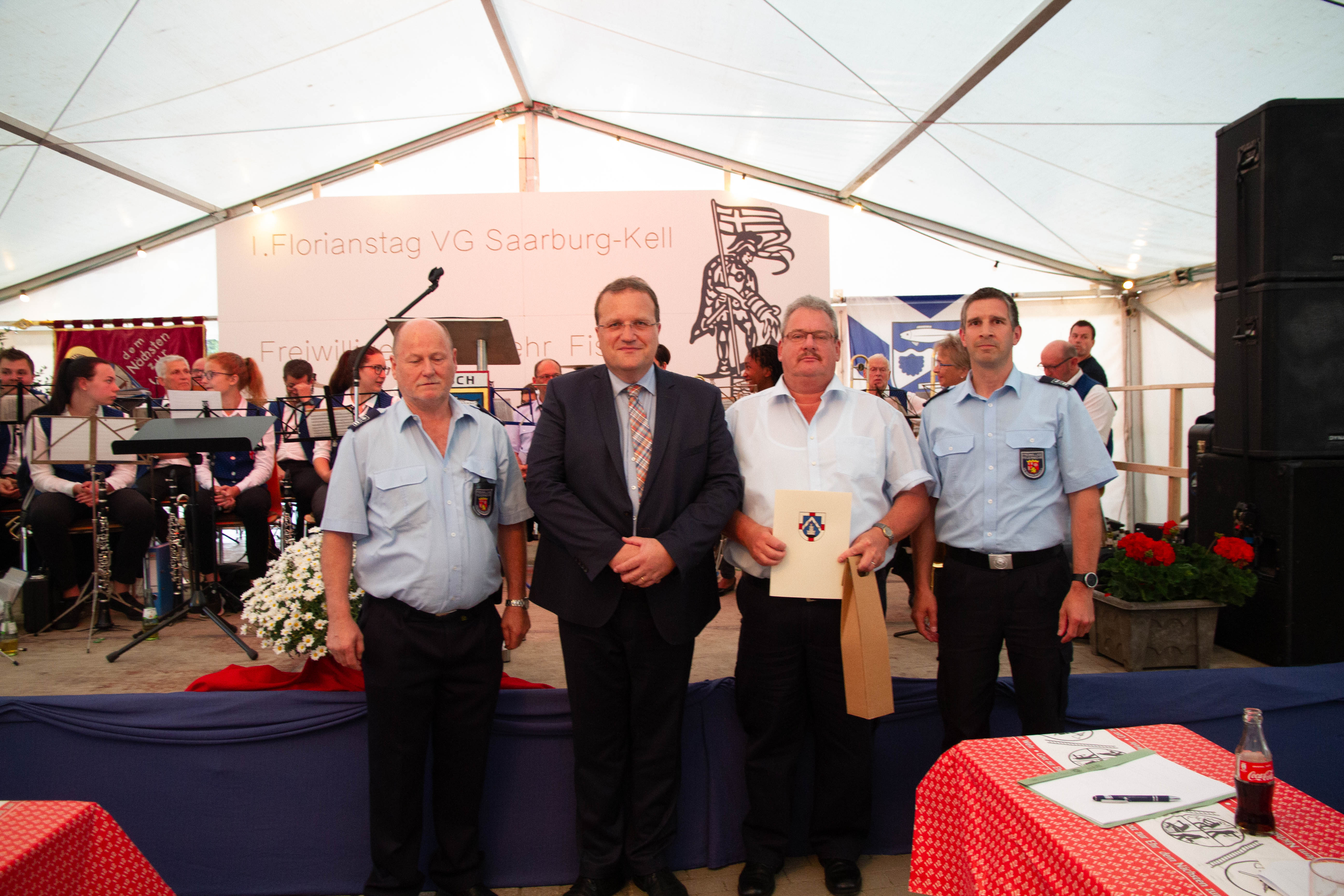 In seiner Ansprache bedankte sich Martin Alten bei der Feuerwehr Fisch für die Ausrichtung dieser Festveranstaltung. Dieses Fest bietet den Feuerwehrleuten der beiden ehemaligen Verbandsgemeinden Saarburg und Kell die Möglichkeit sich kennenzulernen und es ist ein wichtiger Baustein des Zusammenwachsens innerhalb der neuen Verbandsgemeinde. Gerade in den Feuerwehren sind ein gutes Miteinander und ein starkes Wehrgefühl sehr wichtig. In 47 Feuerwehreinheiten sind zurzeit rund 1000 Feuerwehrleute ehrenamtlich rund um die Uhr in 365 Tagen tätig, um in Not geratenen Menschen und Sachwerte zu schützen.