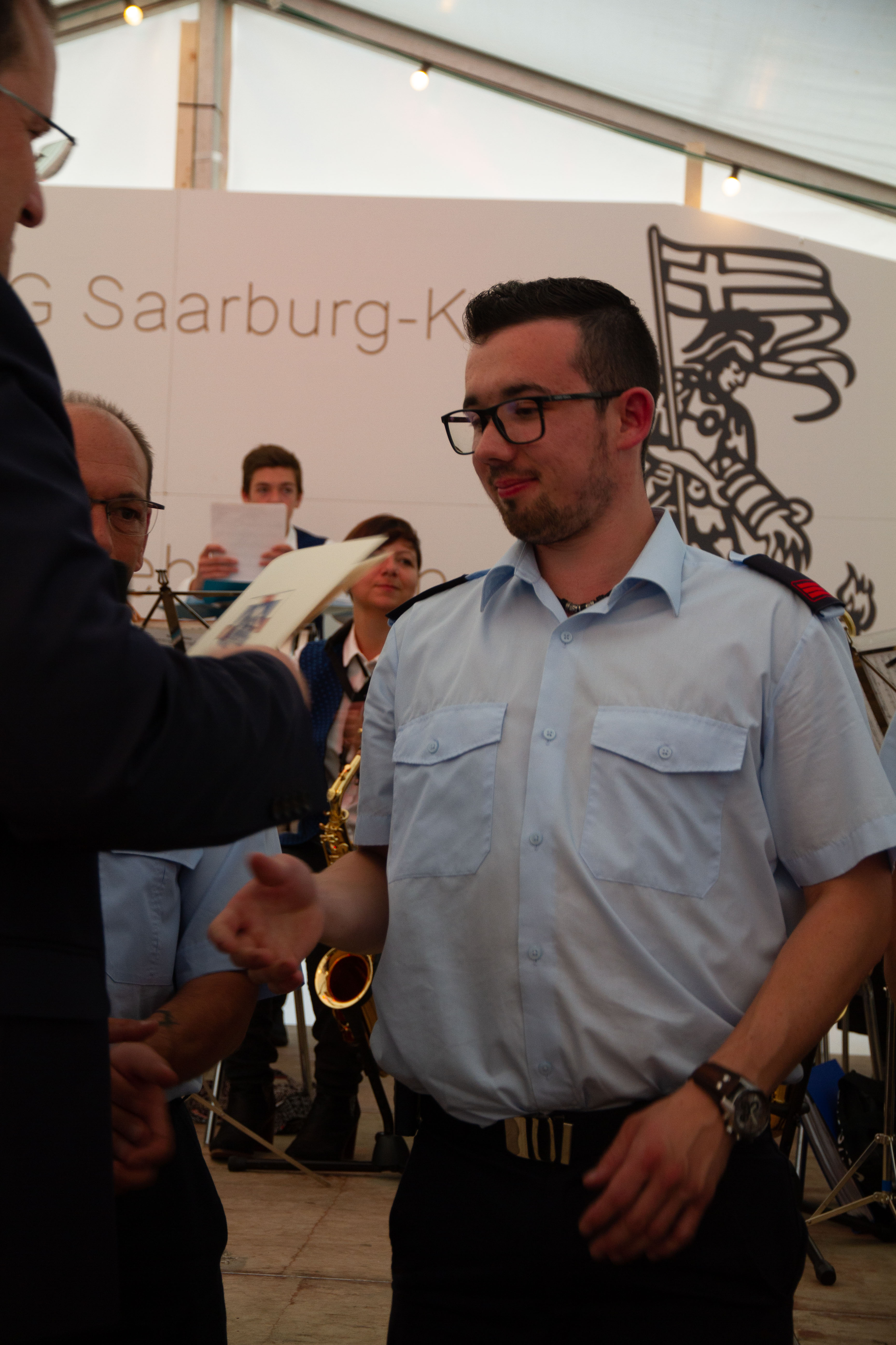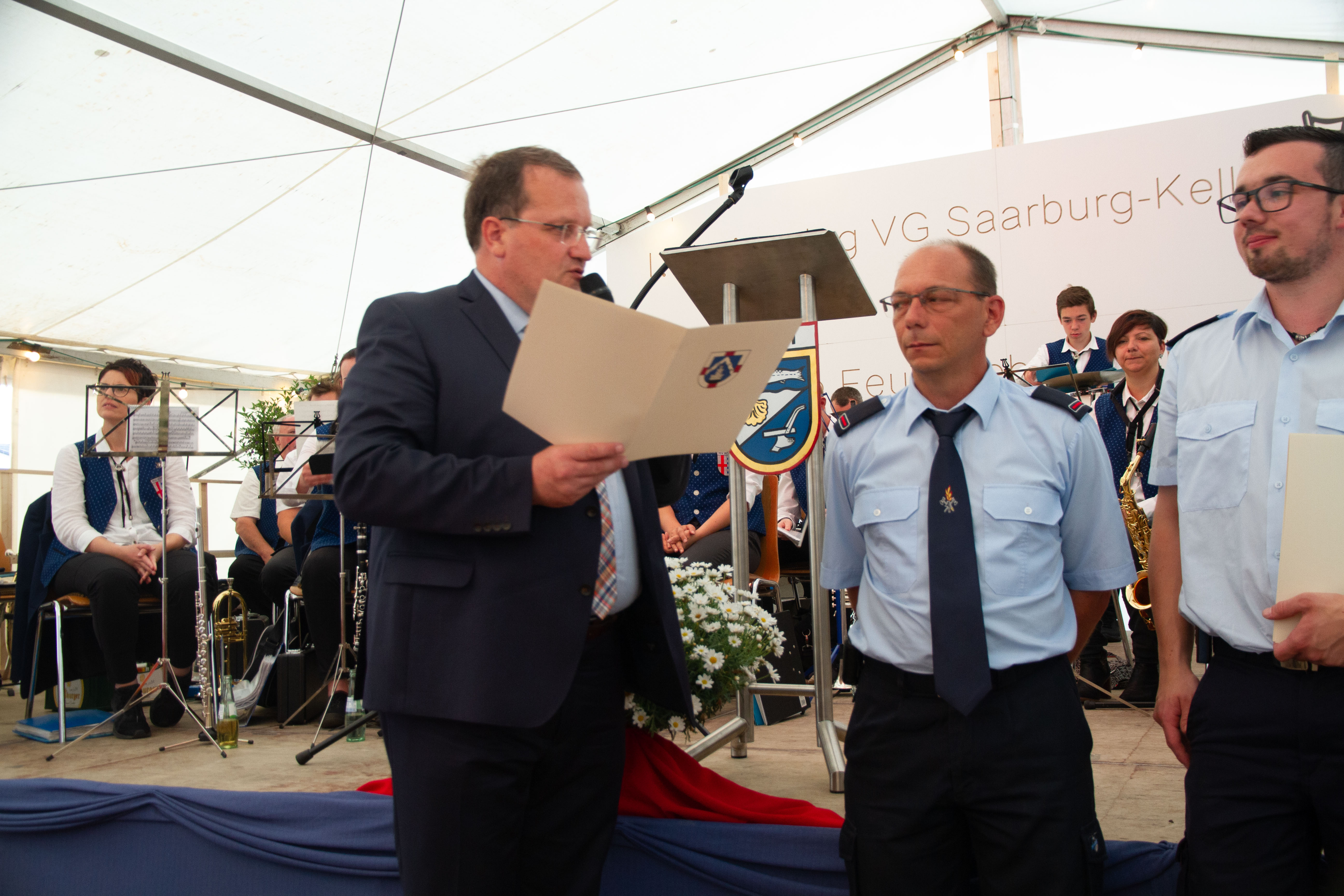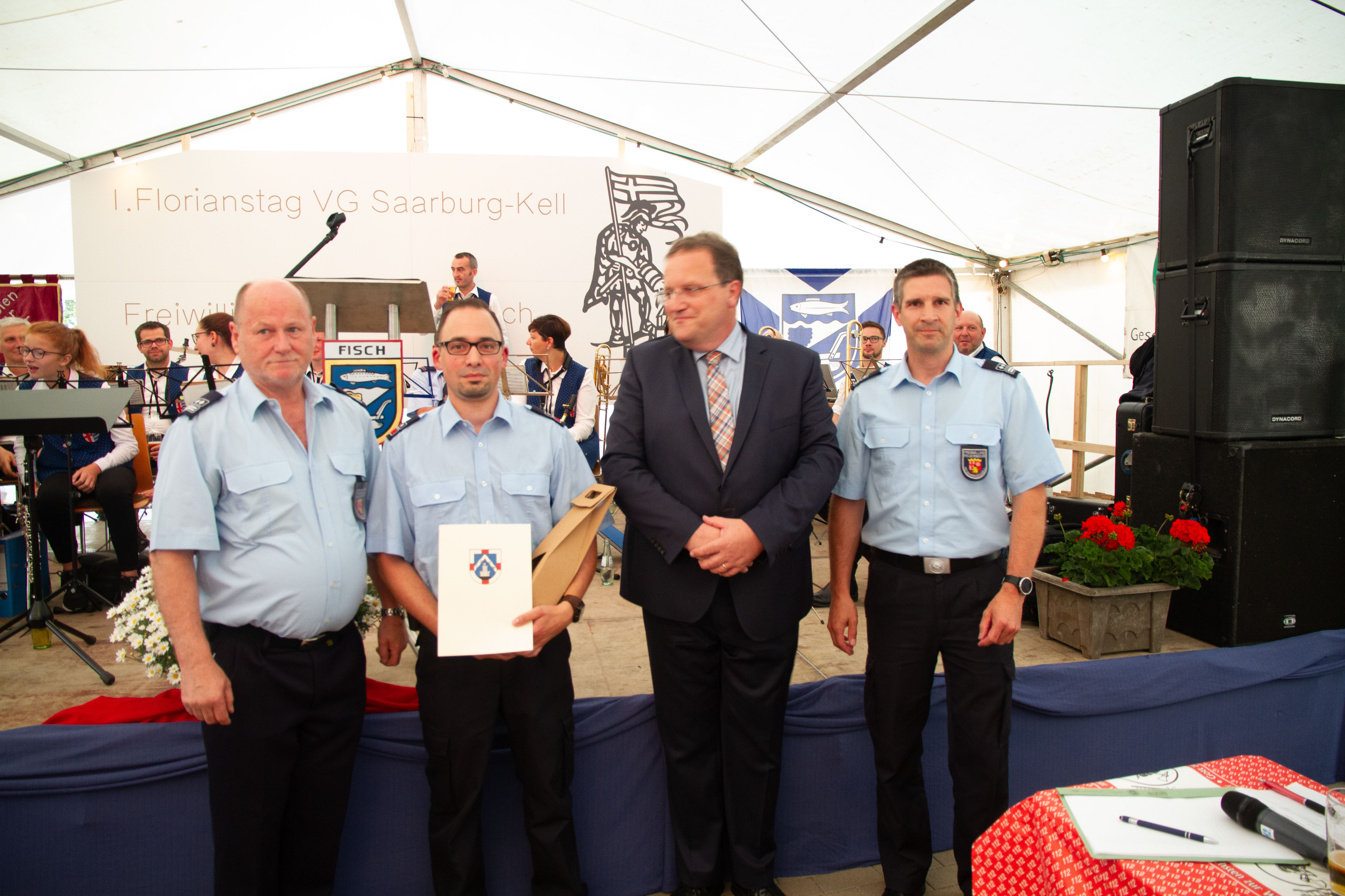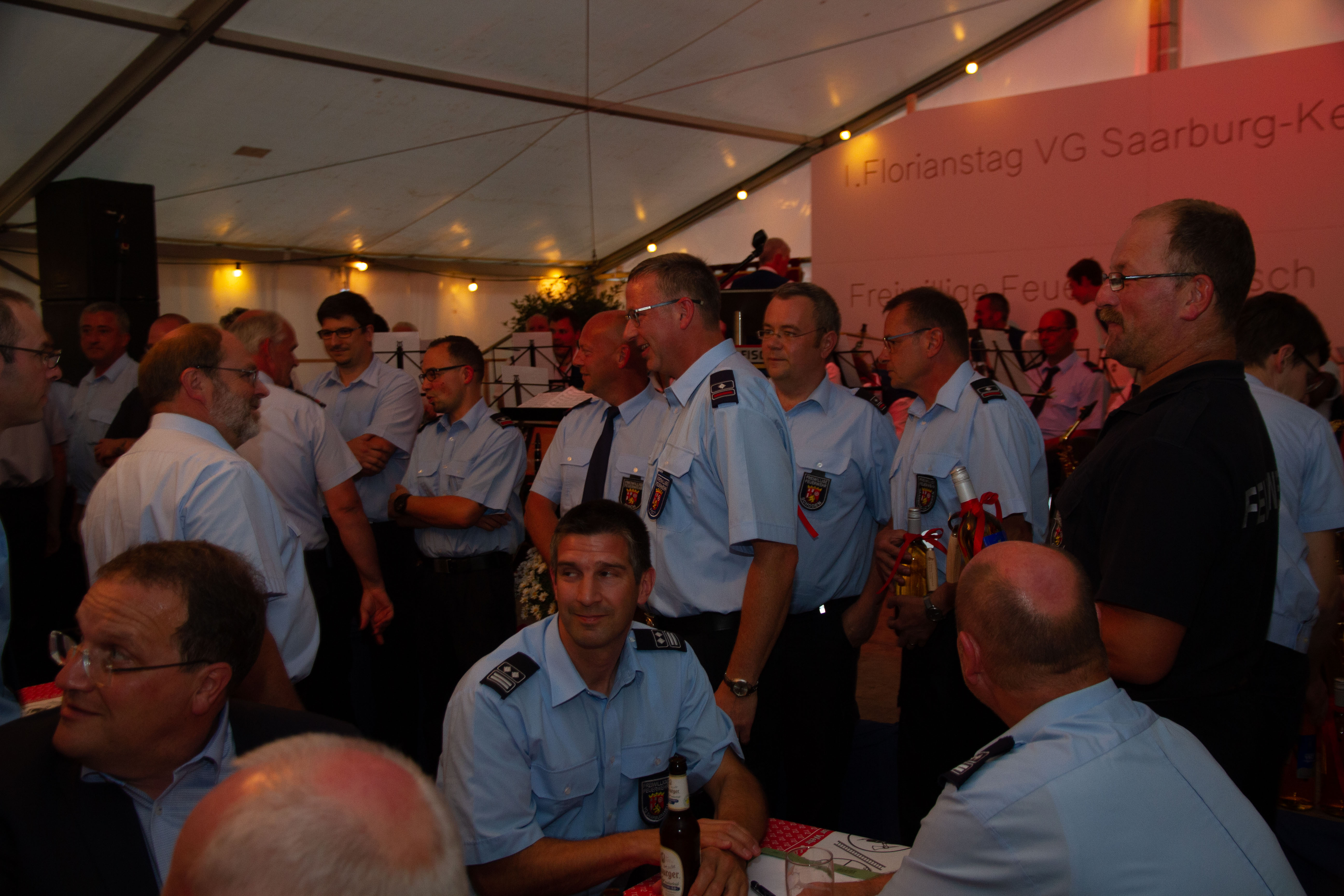 In seiner Ansprache bedankte sich Martin Alten bei der Feuerwehr Fisch für die Ausrichtung dieser Festveranstaltung. Dieses Fest bietet den Feuerwehrleuten der beiden ehemaligen Verbandsgemeinden Saarburg und Kell die Möglichkeit sich kennenzulernen und es ist ein wichtiger Baustein des Zusammenwachsens innerhalb der neuen Verbandsgemeinde. Gerade in den Feuerwehren sind ein gutes Miteinander und ein starkes Wehrgefühl sehr wichtig. In 47 Feuerwehreinheiten sind zurzeit rund 1000 Feuerwehrleute ehrenamtlich rund um die Uhr in 365 Tagen tätig, um in Not geratenen Menschen und Sachwerte zu schützen.