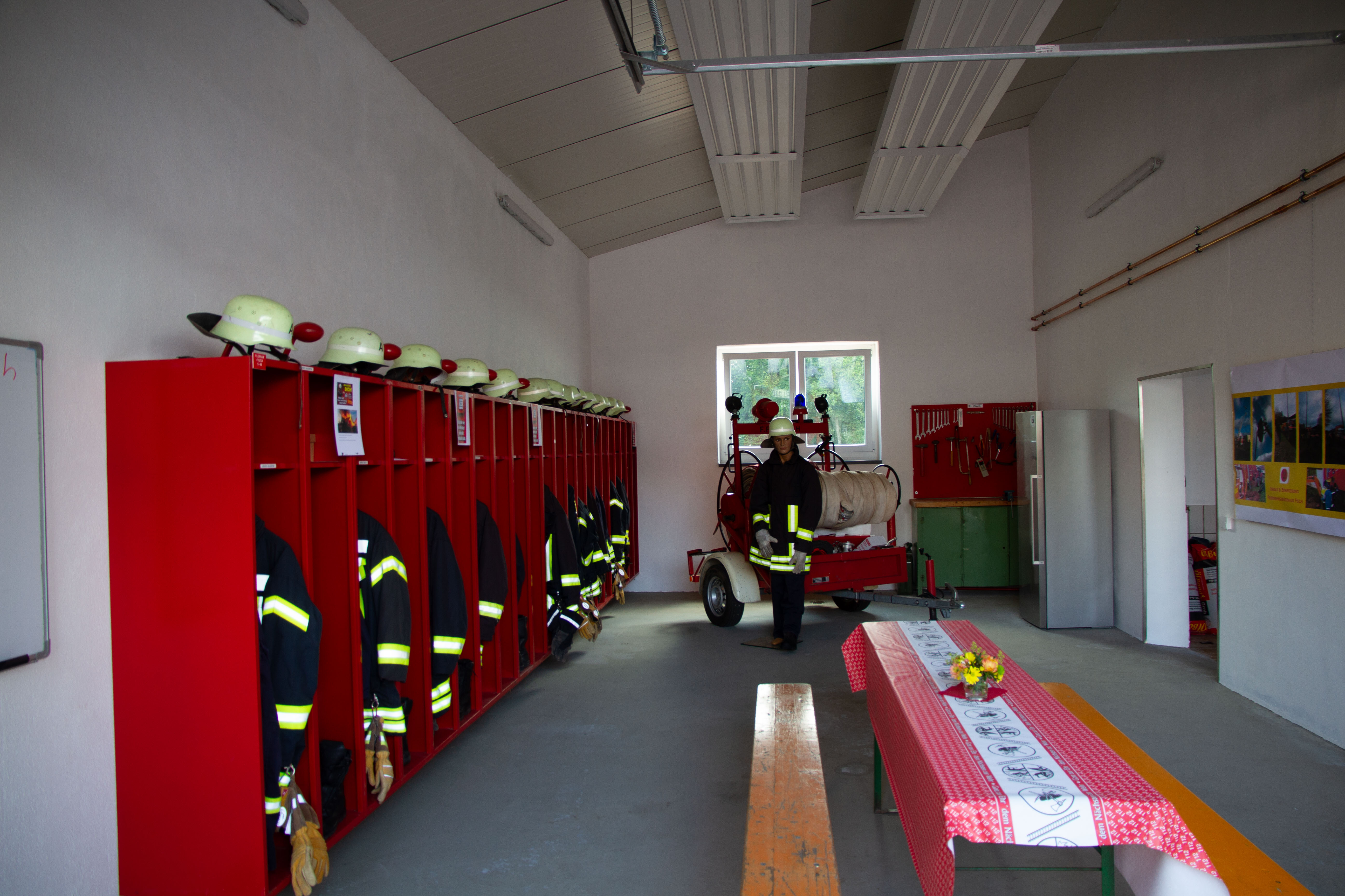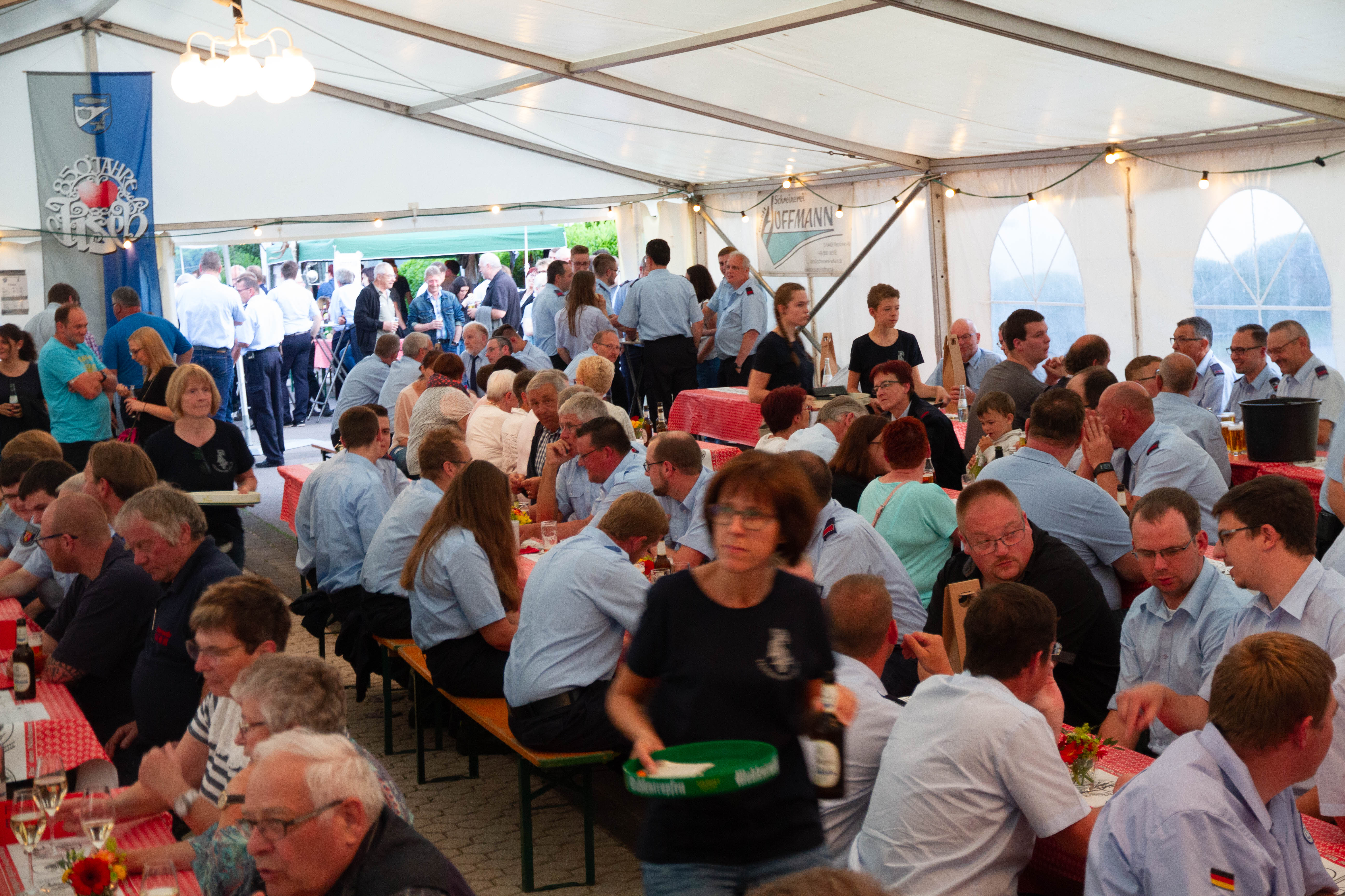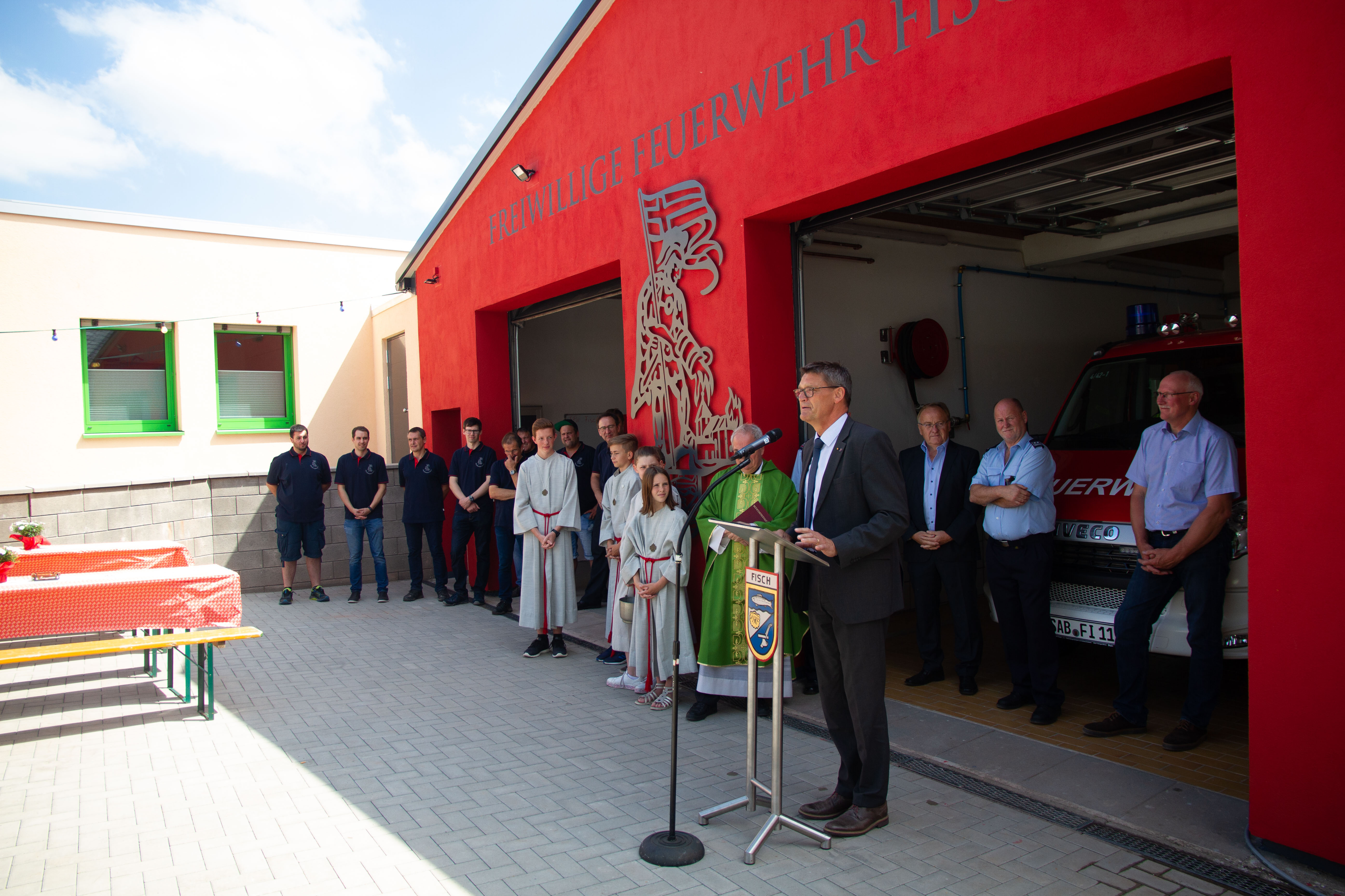 Die neu verpflichteten Wehrleute Ernennung zum Jugendwart Sascha Pütz, (FW Wincheringen) Alexander Jäger, FW Taben-Rodt wurde zum Oberbrandmeister befördert.Der Sonntag begann um 11 Uhr mit einer festlichen Floriansmesse im Festzelt mit Pastor Georg Goeres. Der Höhepunkt der Festlichkeiten war die Einsegnung des renovierten Feuerwehrgerätehauses mit seinem neuen Anbau. Heiko Valentin begrüßte den 1. Beigeordneten der VG Saarburg-Kell, Siegfried Büdinger Herrn Landrat Günther Schartz, Ortsbürgermeister Otmar Wacht und von der Wehrleitung Bernhard Hein und Thorsten Petry.Herr Valentin dankte Pastor Goeres für die schön gestaltetet Floriansmesse. Dann erläutertein seiner Ansprache den Ablauf und Organisation der Baumaßnahme. Im März 2017 begann man mit den Bauarbeiten, hier wurden 2.500 Arbeitsstunden von den Wehrangehörigen und weiteren Helfern geleistet. Von der Verbandsgemeinde wurden die Kosten für die Baumaterialien von rd. 36.000 € übernommen.