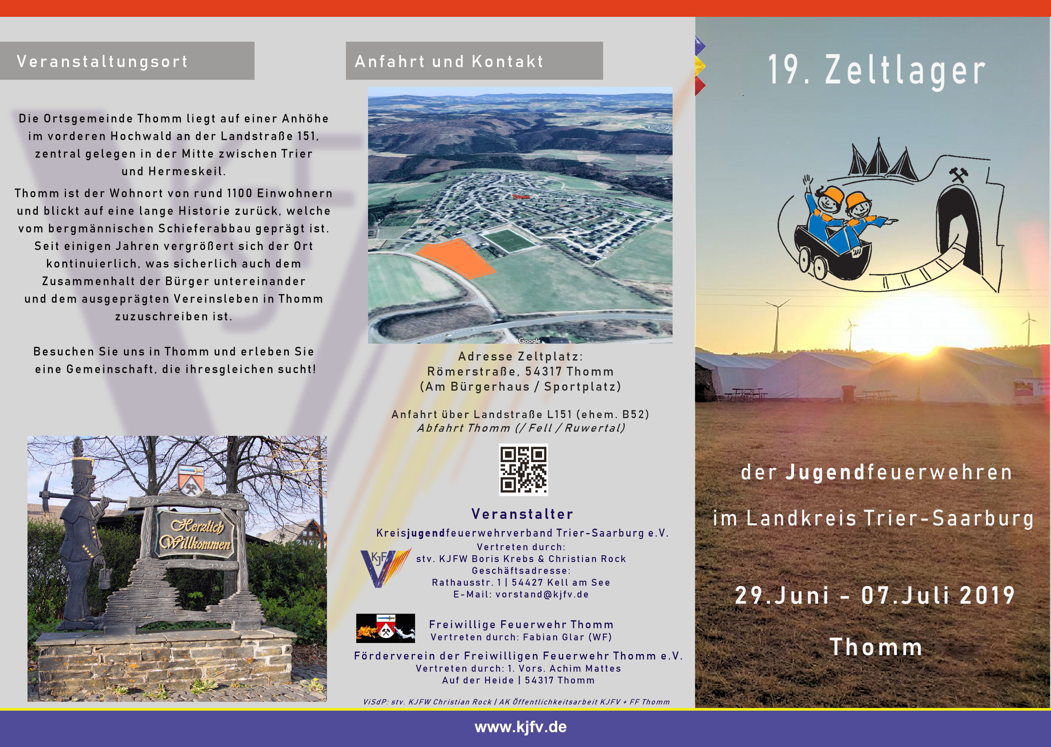 Der Kreisjugendfeuerwehrverband Trier-Saarburg e.V. hat sich natürlich sehr über die Bereitschaft der Ortsgemeinde Thomm gefreut, darunter Boris Krebs und Christian Rock als stellv. Vorsitzender des geschäftsführenden Vorstands des KJFV Trier-Saarburg e.V. Innerhalb von zwei Wochen schaffte man es solch eine Zeltstadt mit einem hohen organisatorischen Aufwand in verschiedenen Arbeitsgruppen zu organisieren und aufzubauen.
