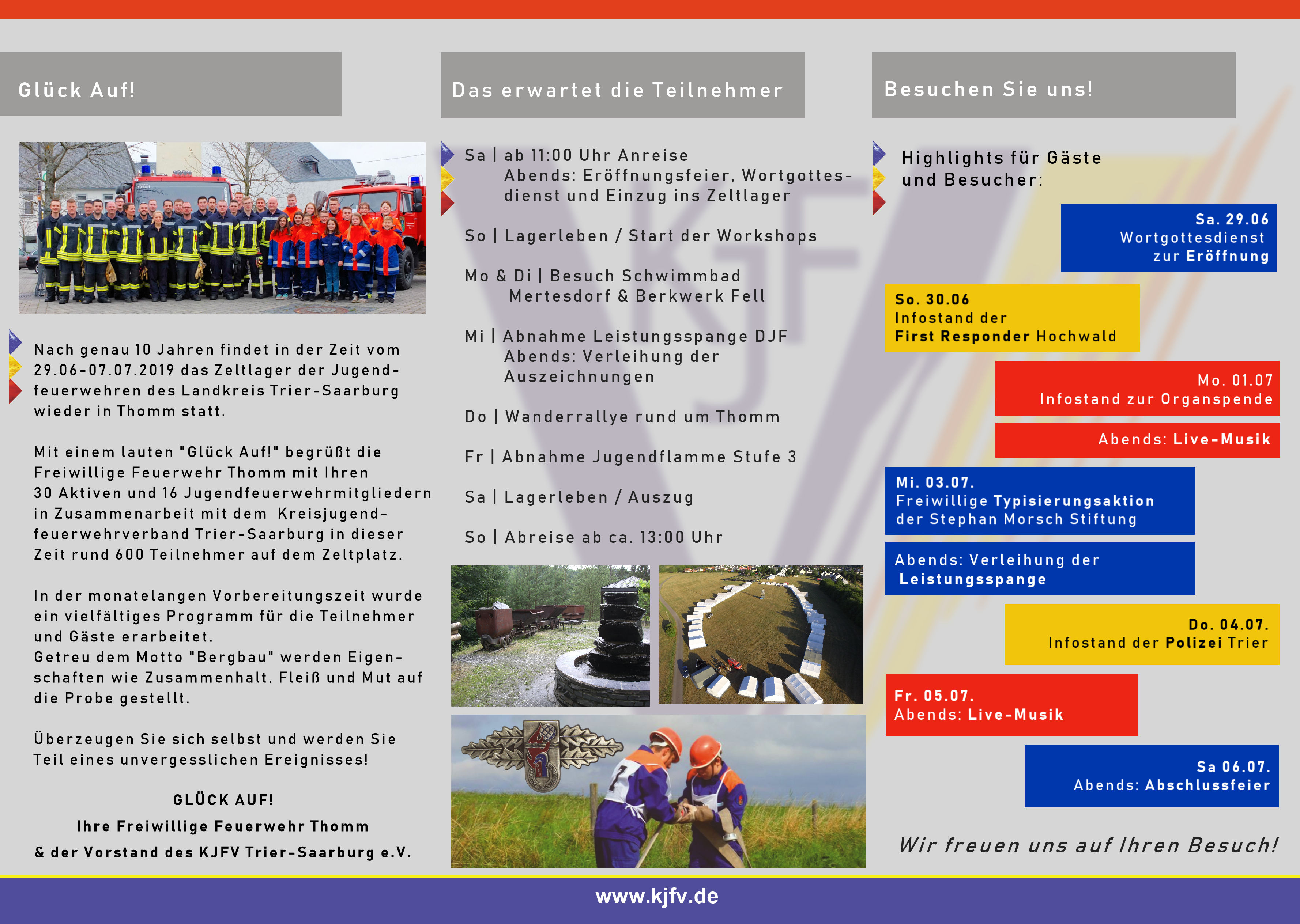 Besucher und Freunde sind herzlich willkommen. Verfolgen Sie die täglichen Aktivitäten im Jugendzeltlager Thomm mit Berichten und Bildmaterial in Facebook unter Kreisjugendfeuerwehrverband Trier-Saarburg.e.V.