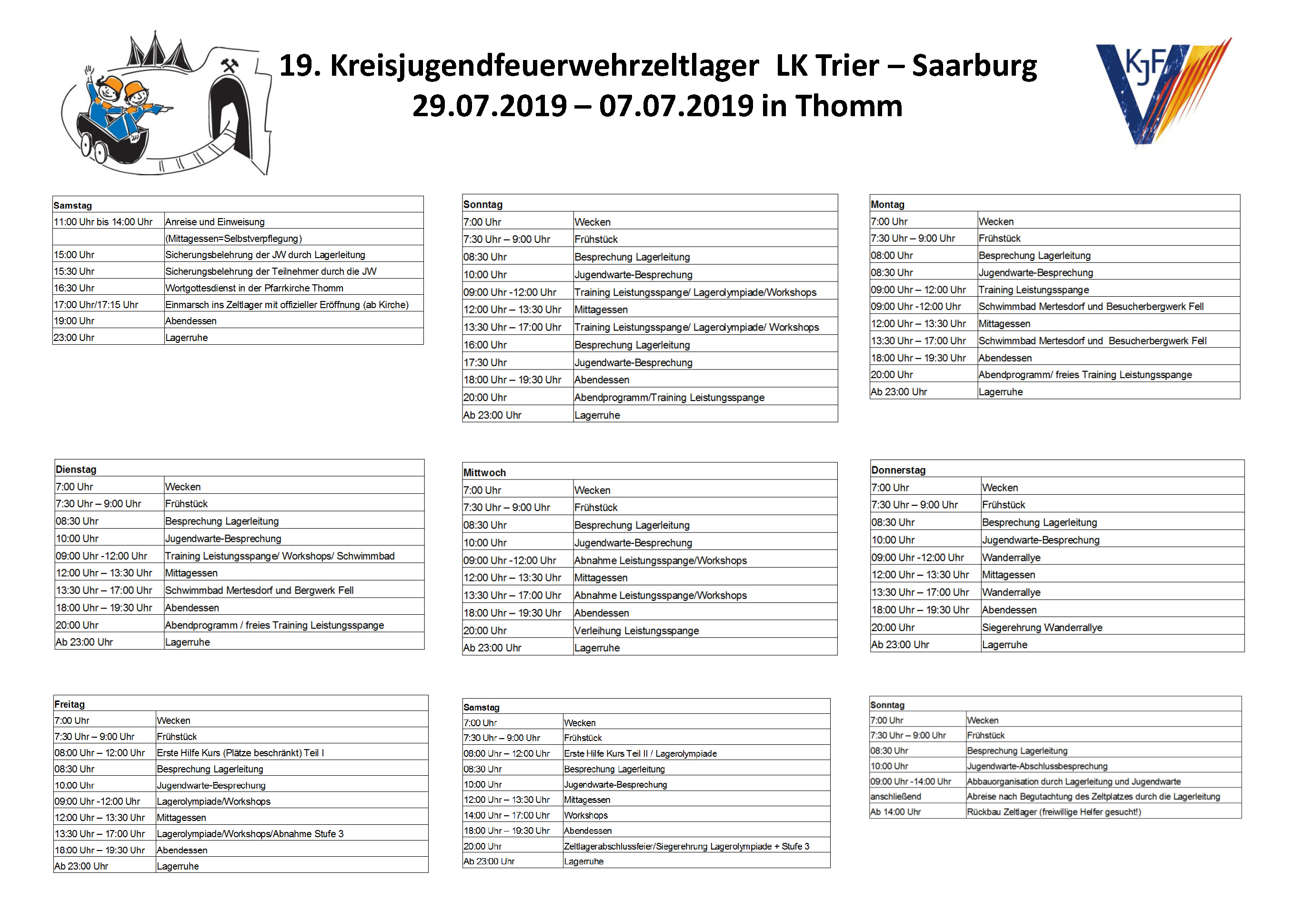 Die Teilnehmer erwartet ein buntes Programm: Schwimmbad in Mertesdorf (Montag und Dienstag, Besucherbergwerk in Fell (Montag u. Dienstag). Außerdem können verschiedene Abzeichen wie die Leistungsspange und die Jugendflamme 3 abgelegt werden.