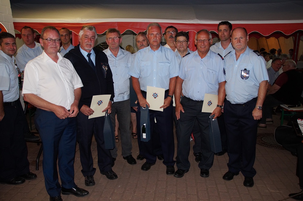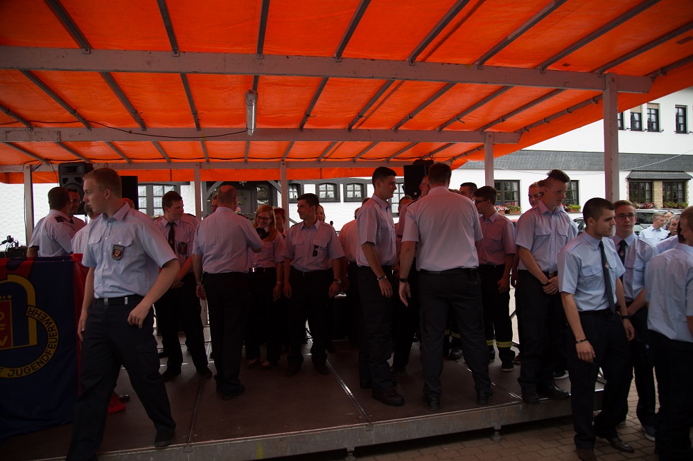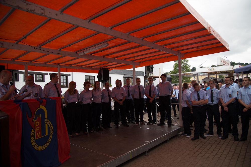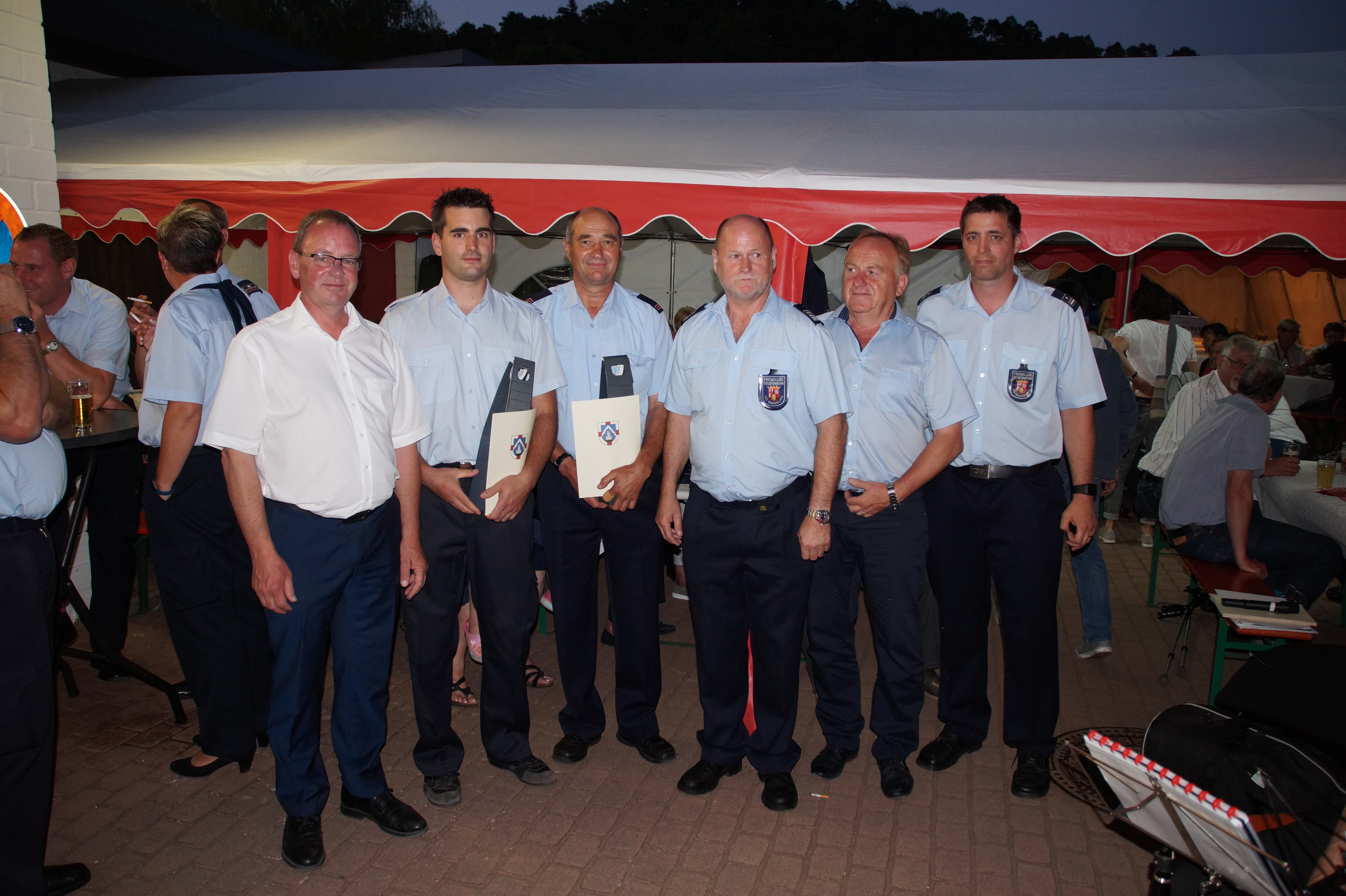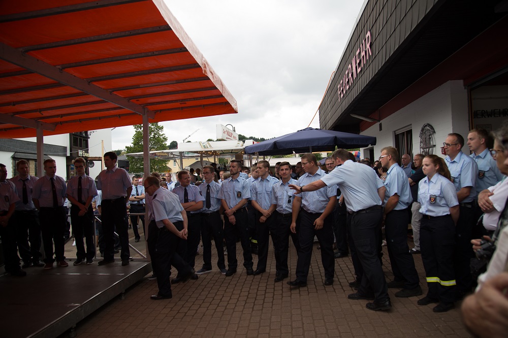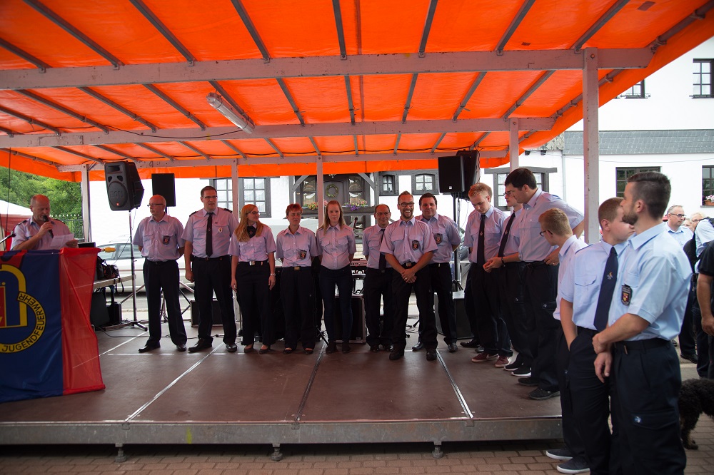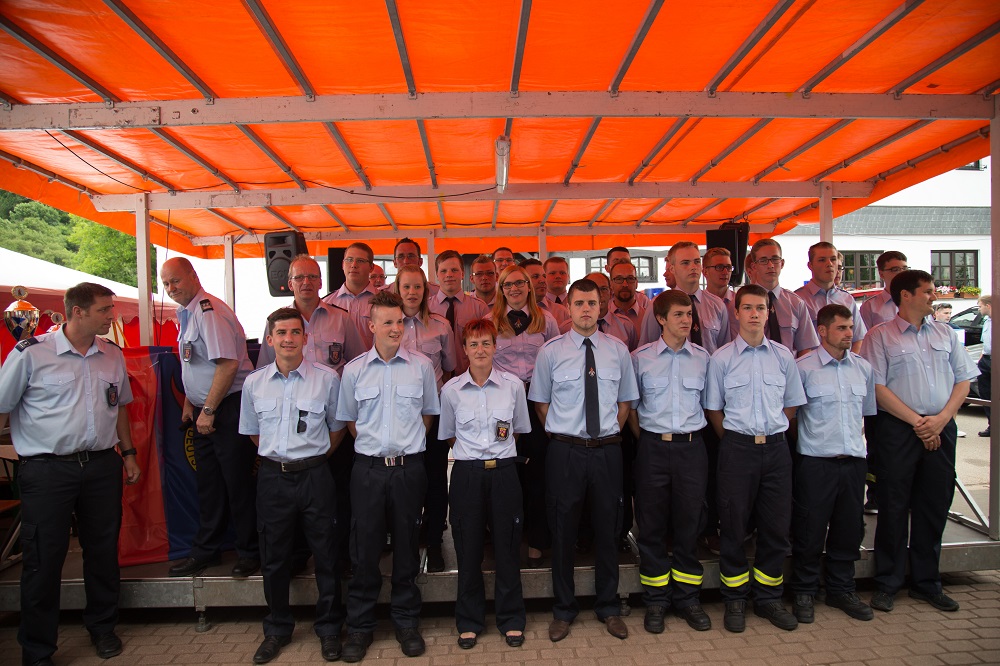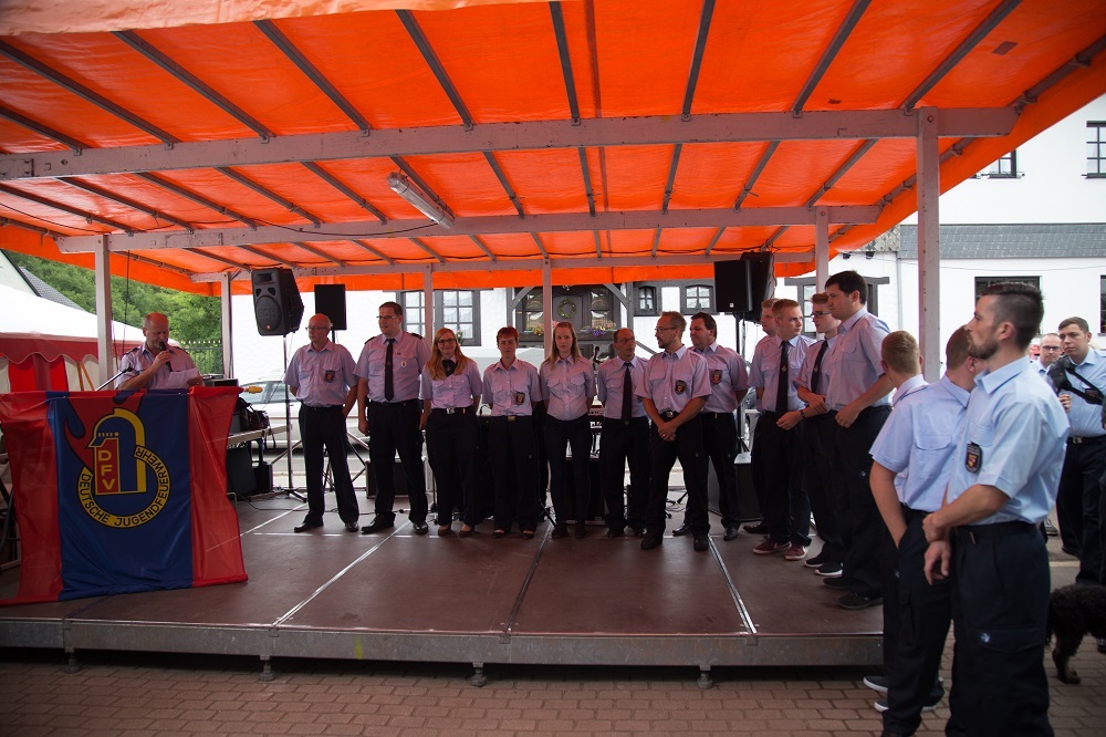Die aufgebaute Bühne war schon fast etwas zu klein für die beachtliche Anzahl von 43 neu verpflichteten Kameradinnen und Kameraden innerhalb den Ortswehren der VG Saarburg, die ebenfalls von Bernhard Hein und Jürgen Dixius per Handschlag begrüßt wurden.