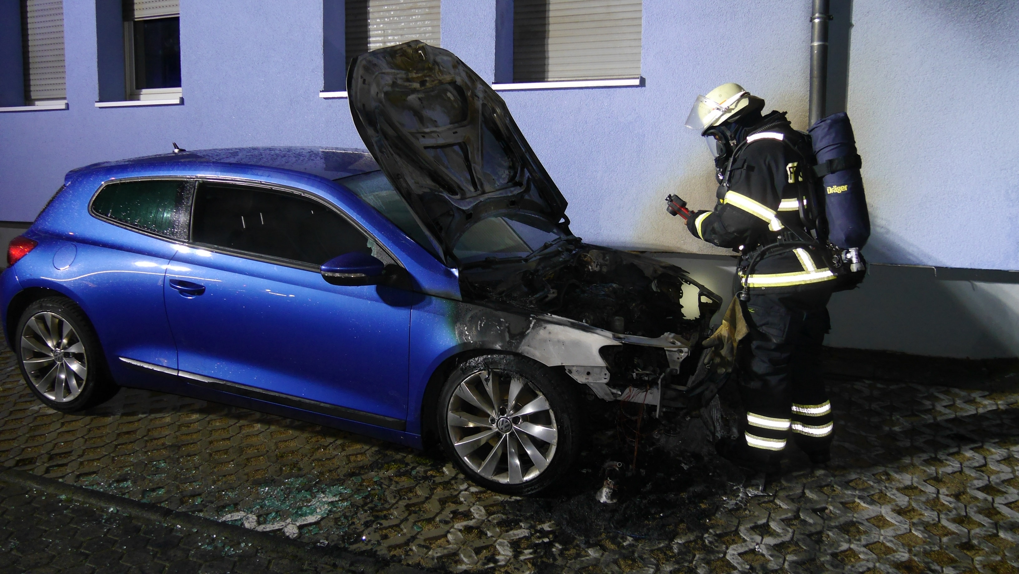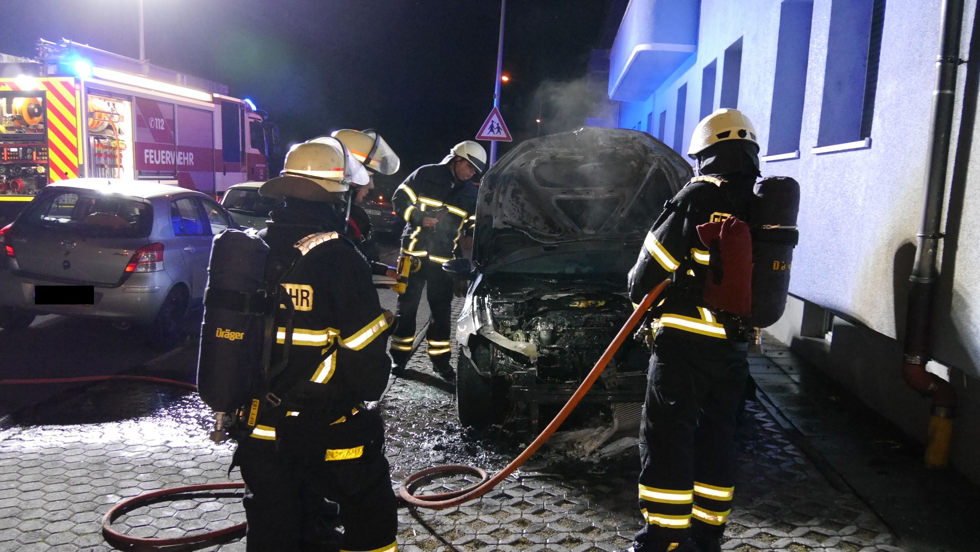 Anwohner meldeten einen PKW Brand. Bei Ankunft an der Einsatzstelle stand der Motorraum des Autos in Vollbrand. Das Feuer breitete sich schnell vom Motor bis ins Auto aus. Starker Rauch und die enorme Hitzebelastung beschädigten die Hausfassade eines Mehrfamilienhauses.