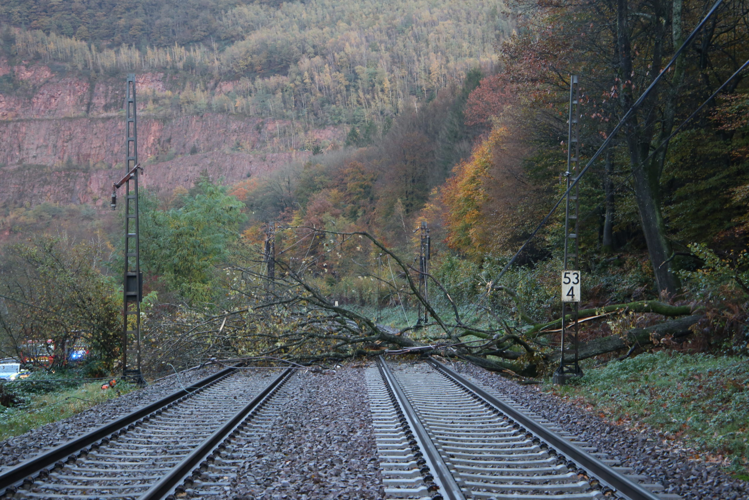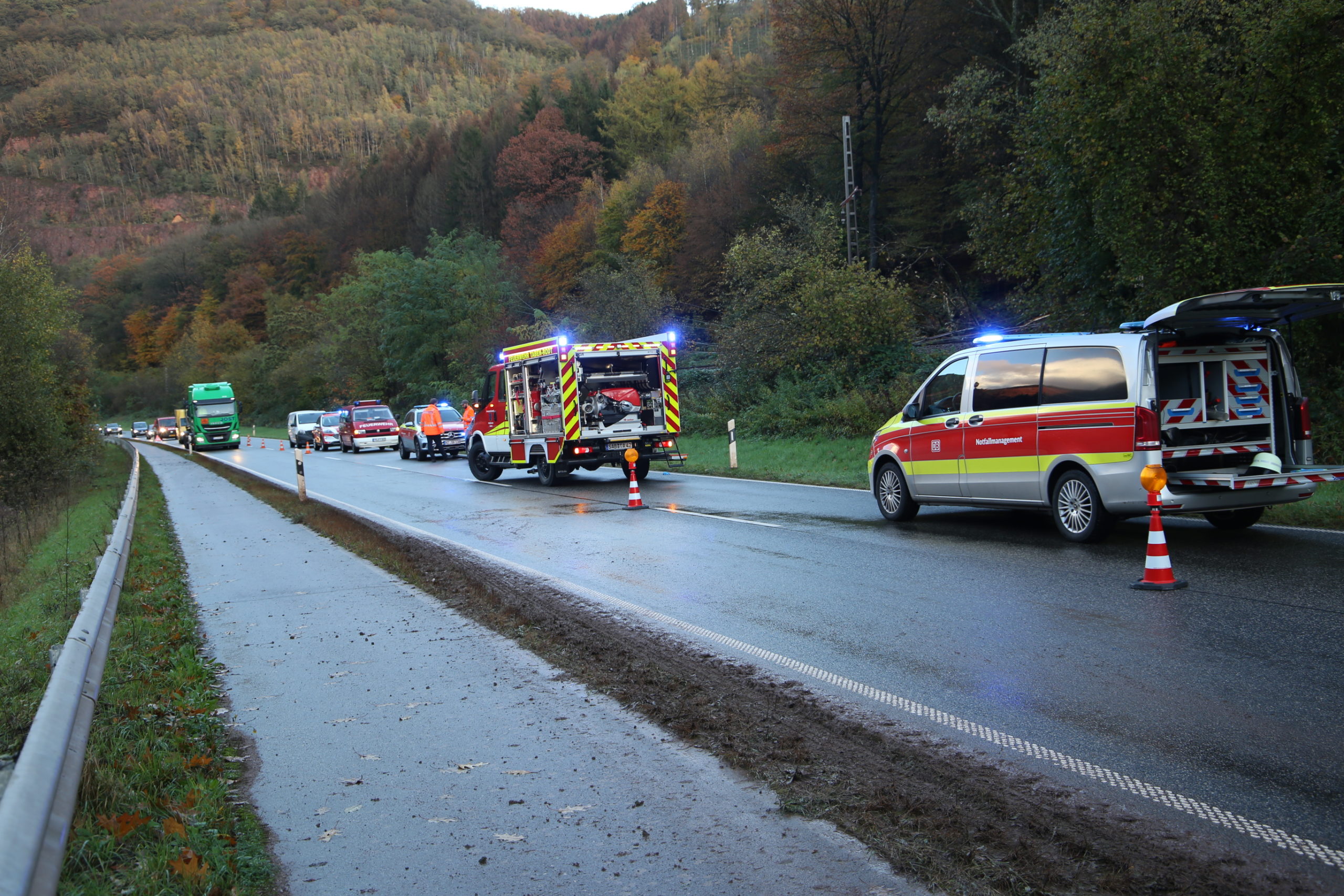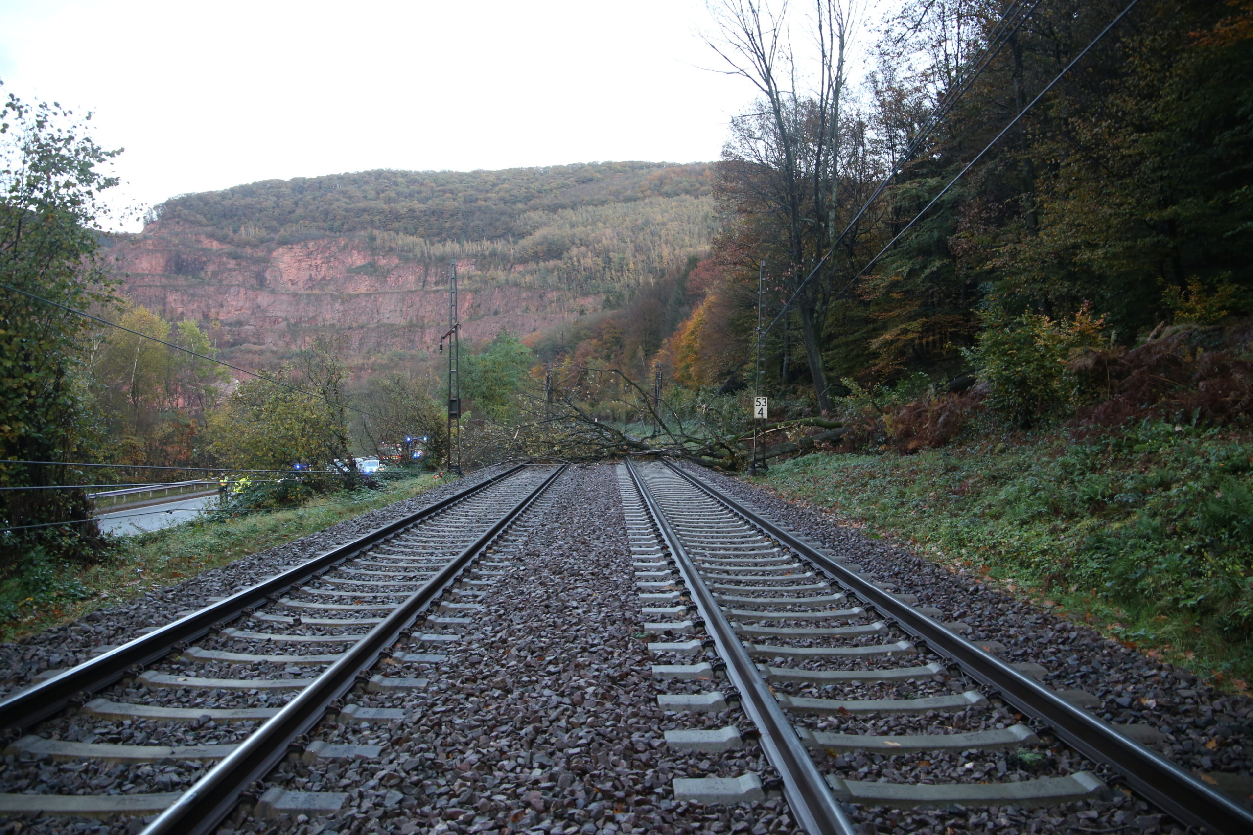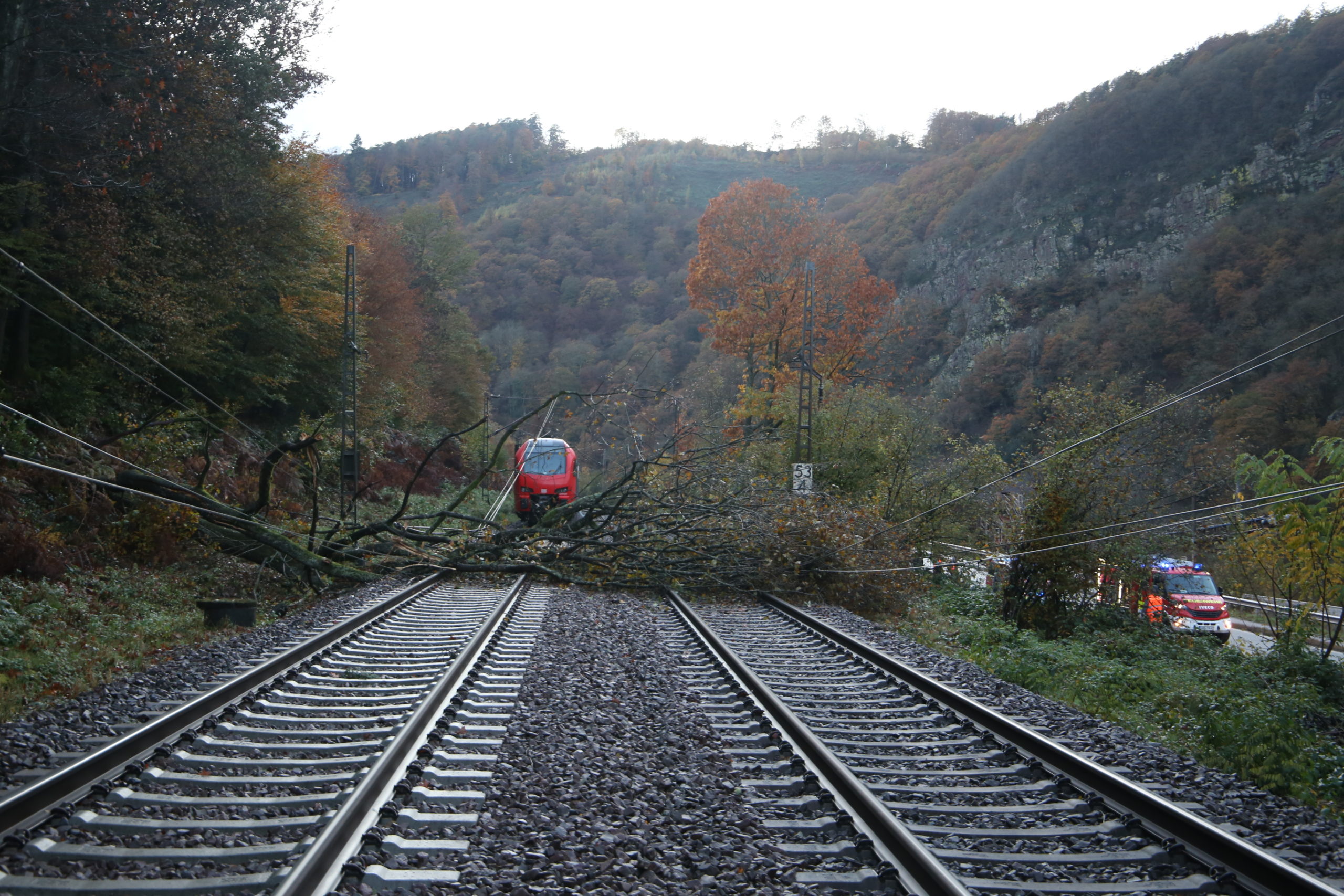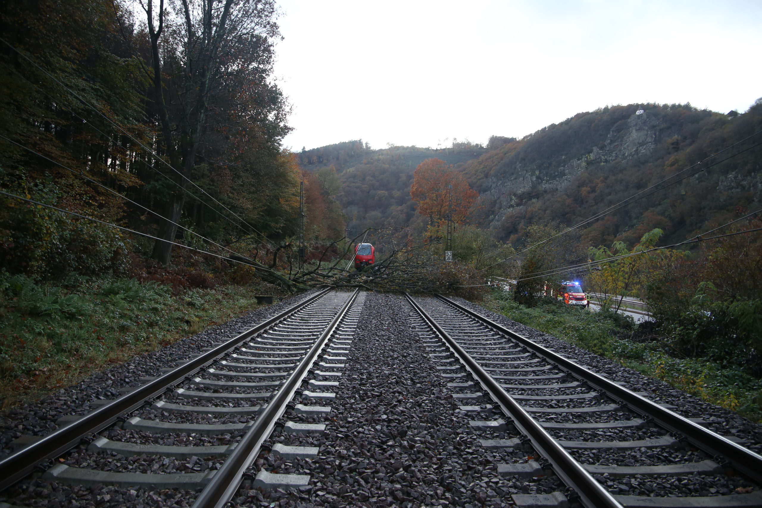 Zum späteren Zeitpunkt wurde die B51 zeitweise voll gesperrt um die am Boden liegende Oberleitung zu beseitigen und die Drehleiter der Feuerwehr Saarburg-Löschzug Mitte-mit der Lichtanlage zu positionieren um den Baum sowie weiteres Geäst von den Schienen zu beseitigen.
