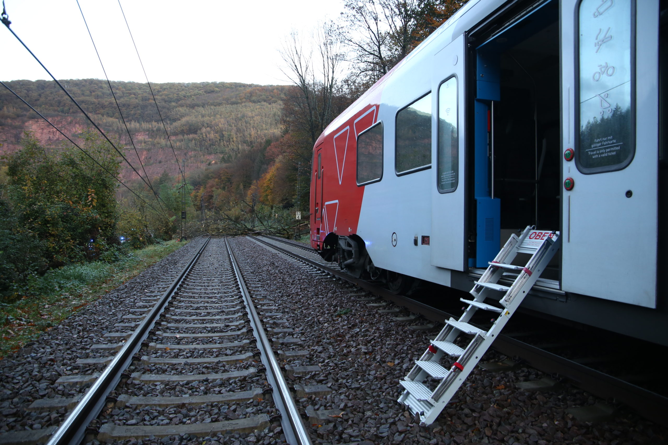 Taben-Rodt/Saarhölzbach. Gegen 16.00 Uhr kam es auf der oben genannten Bahnstrecke beidseitig zum Stillstand der Regio Bahn. Ein Baumsturz hatte die Oberleitung komplett heruntergerissen.