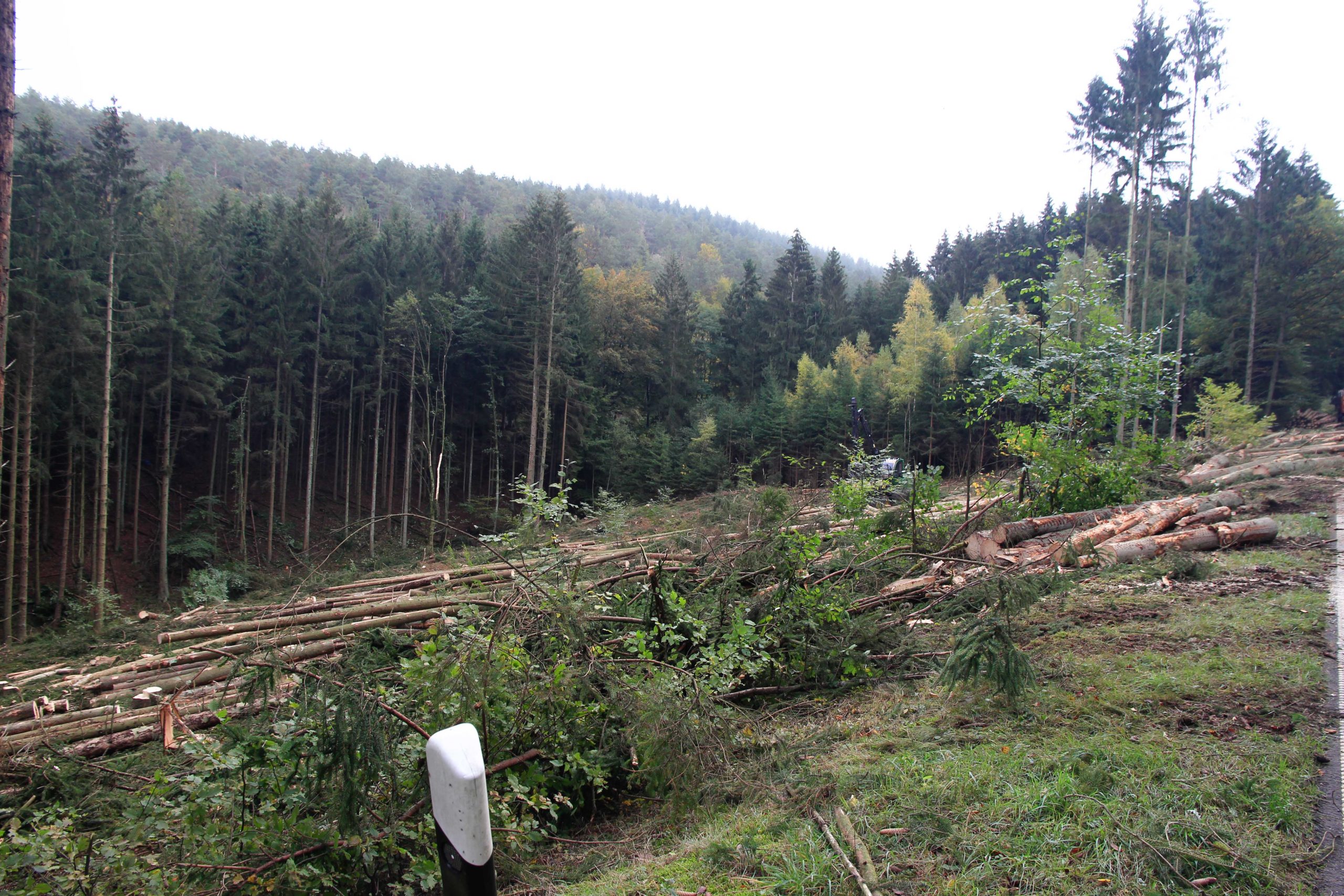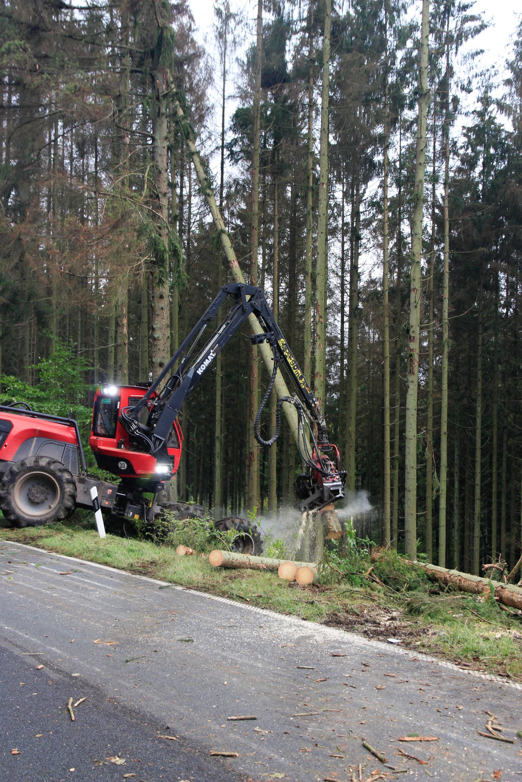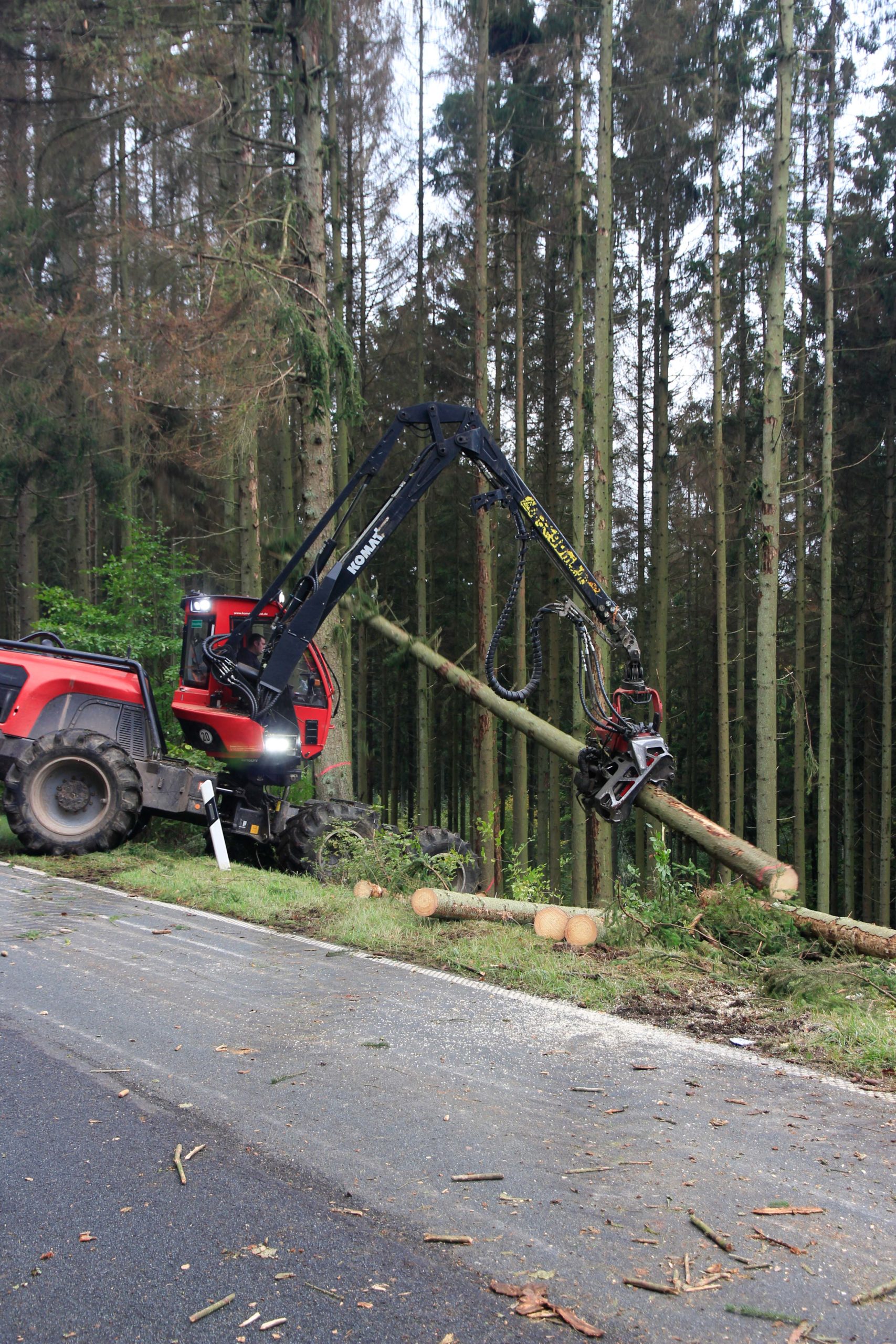 Die Vollsperrung ermöglicht es konzentriert mit schweren Maschinen einsetzen zu können und es damit schneller geht. Für den Verkehrsteilnehmer wirken zwei Wochen sehr lange, aber ca. 750 Bäume zu fällen und zu ernten, an die Straße zu bringen und vor allem abzufahren, bedarf halt entsprechende Zeit und die Witterung tut Ihres dazu.