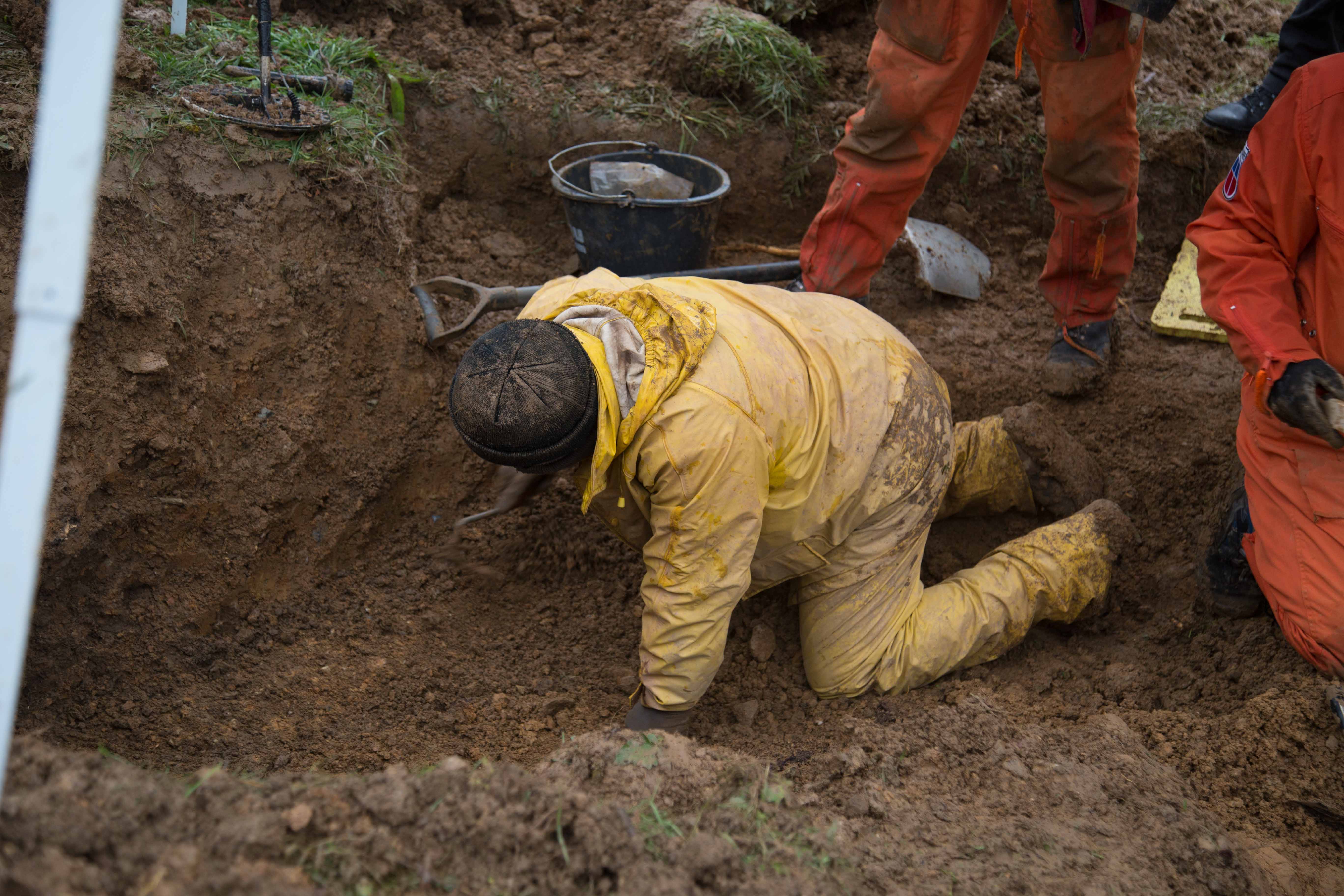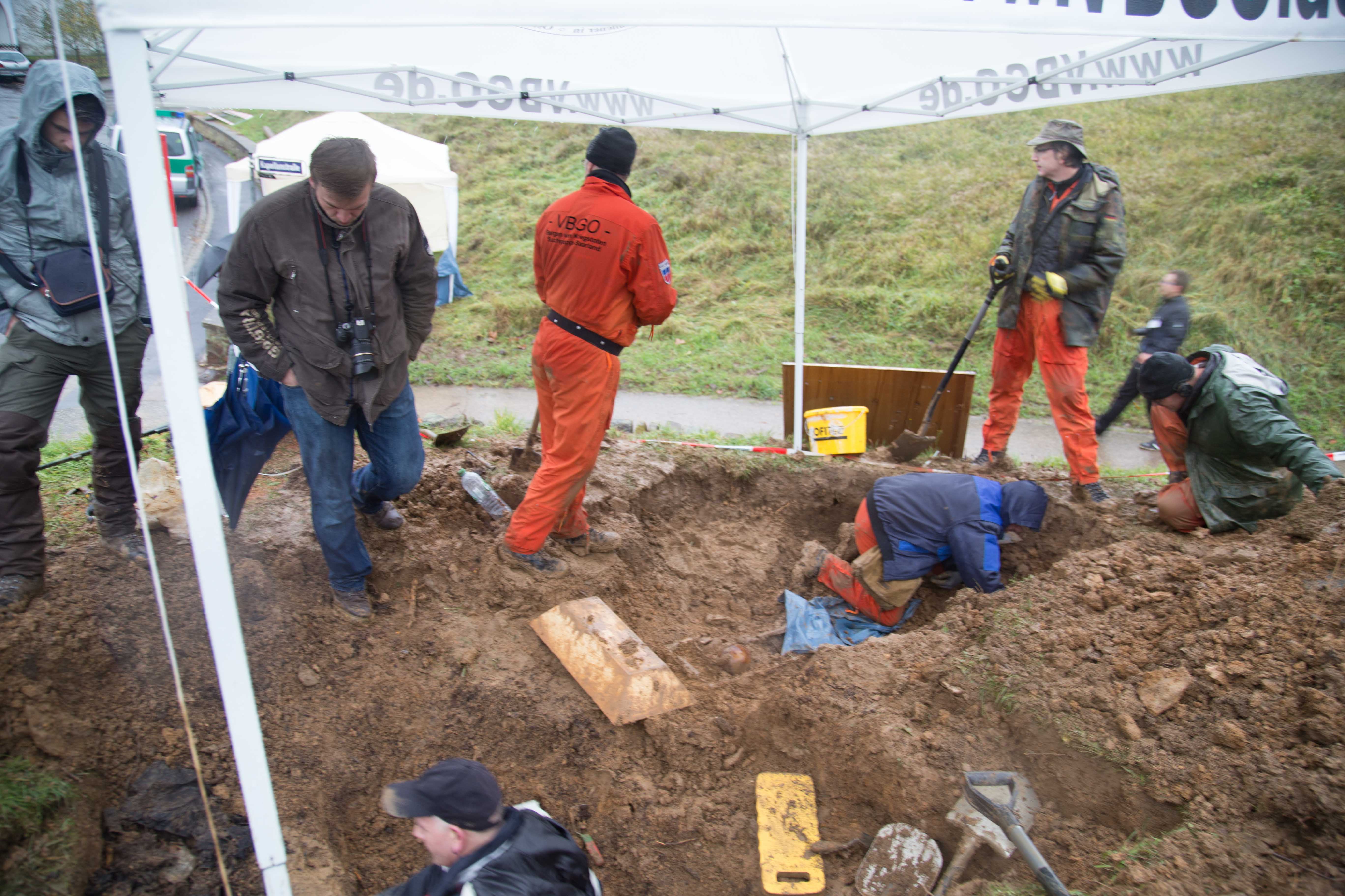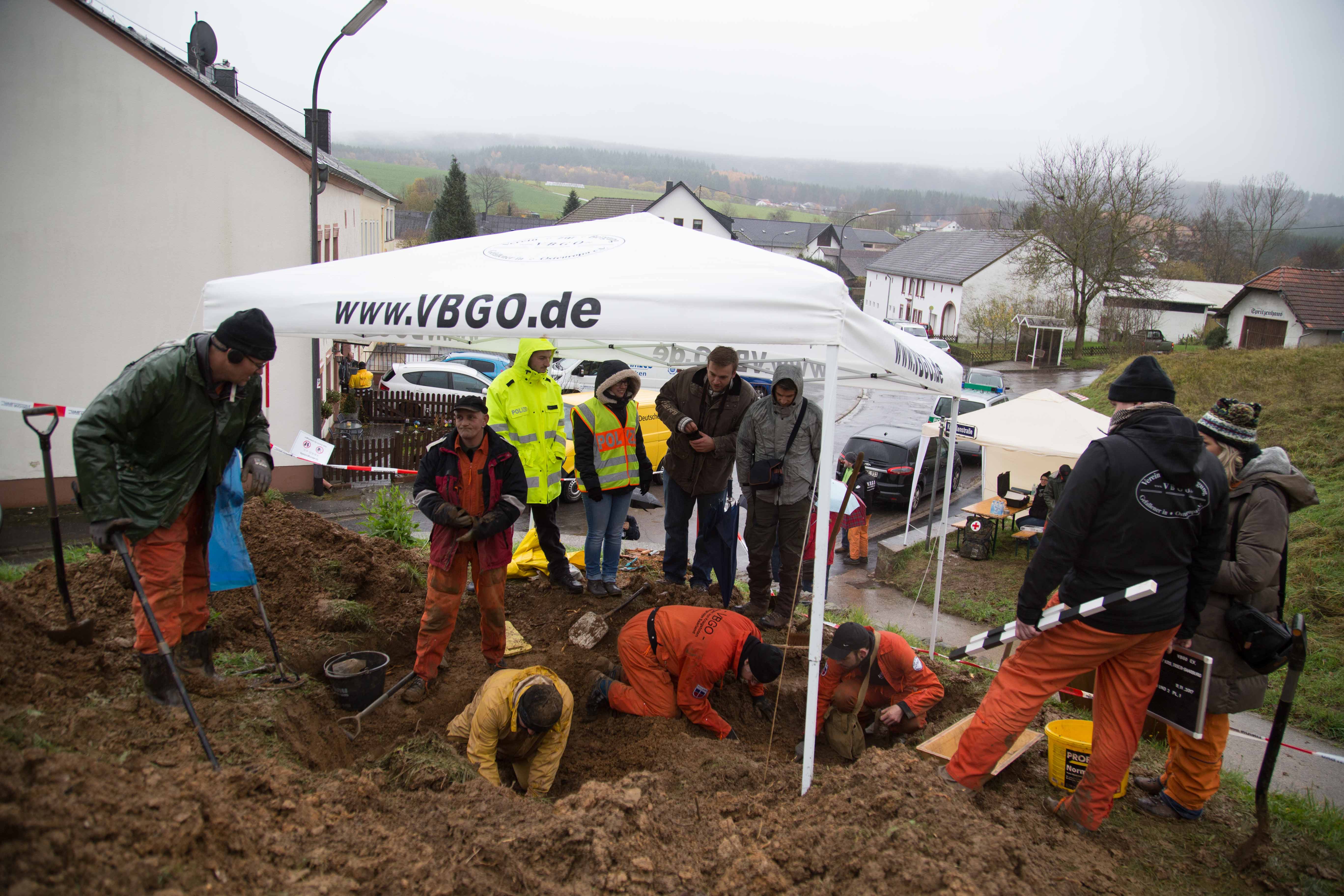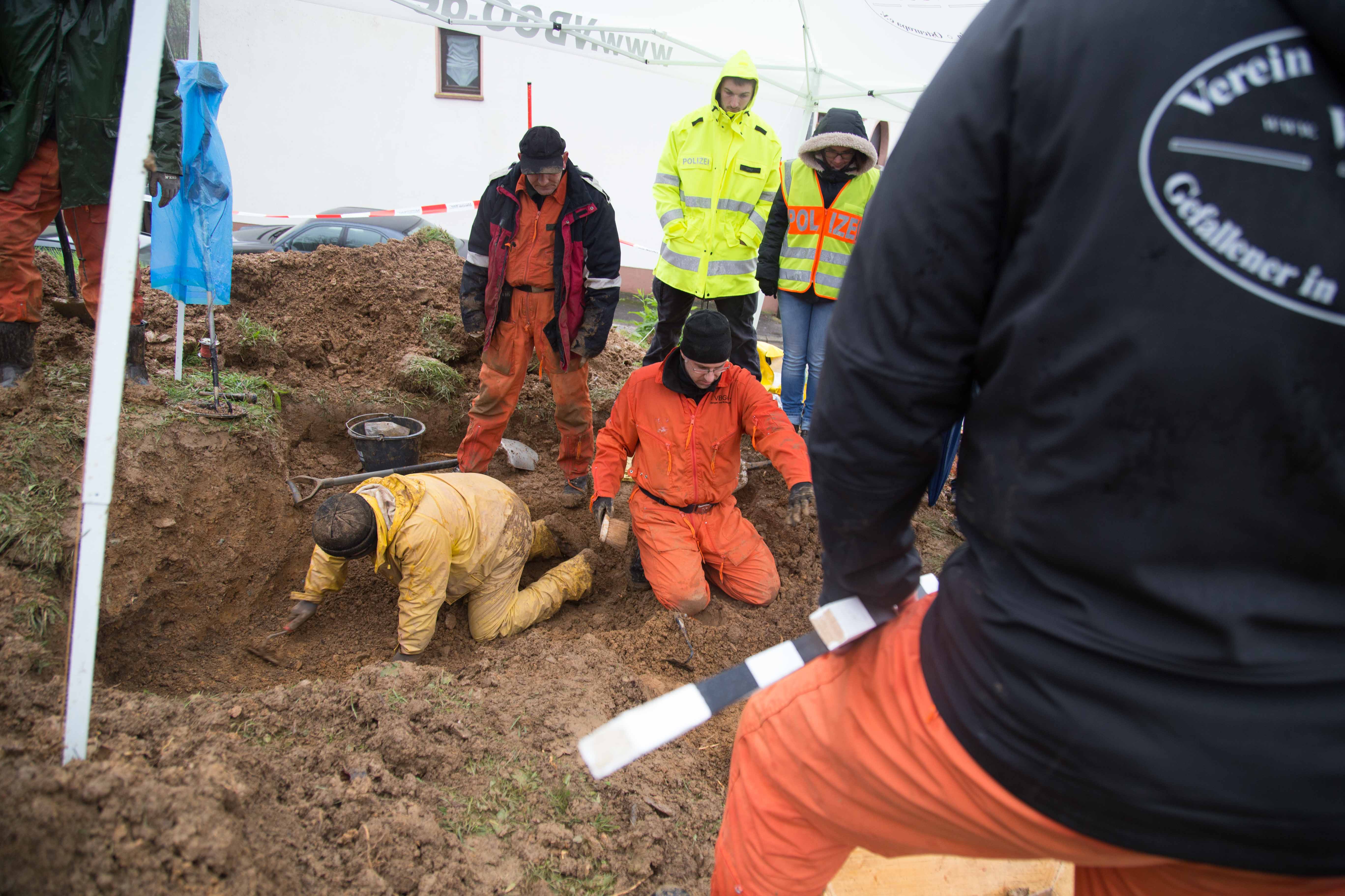 Ein Grabungsteam des Vereins zur Bergung Gefallener in Osteuropa e.V. (VBGO) in Zusammenarbeit und Genehmigung der Generaldirektion Kulturelles Erbe hat die Bergung nach archäolgisches Grundsätzen angefangen. Es wird akribisch nach Hinweisen gesucht, die zur Klärung der Identität der Soldaten führen könnten. So konnten bis zum frühen Nachmittag mehrere Skelettteile, Kleidungsreste, Zigarettenspitzen und diverse Metallteile gefunden werden. Diese Fundstücke werden durch die GDKE sorgfältig einzeln in Plastiktütchen verpackt, um zum