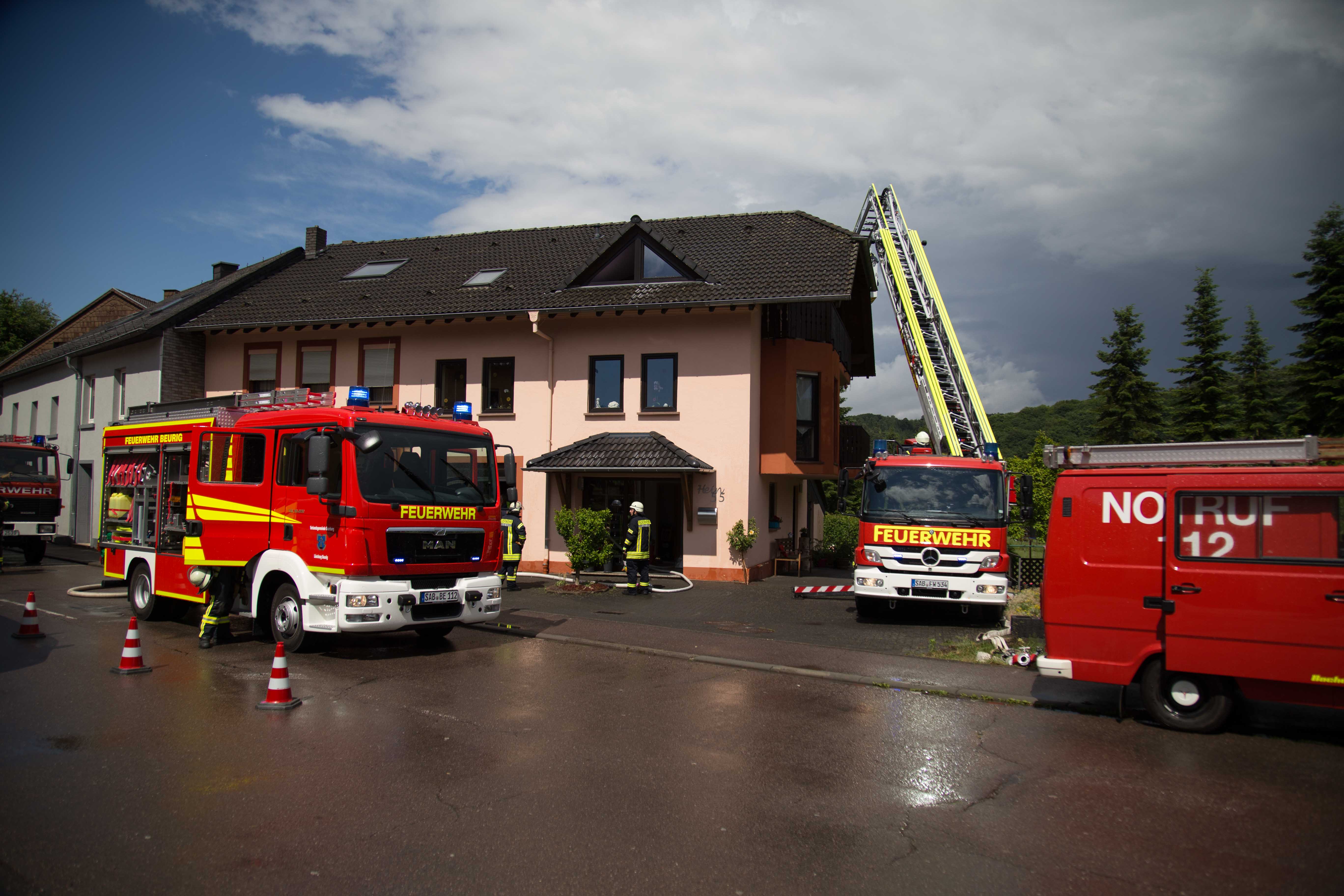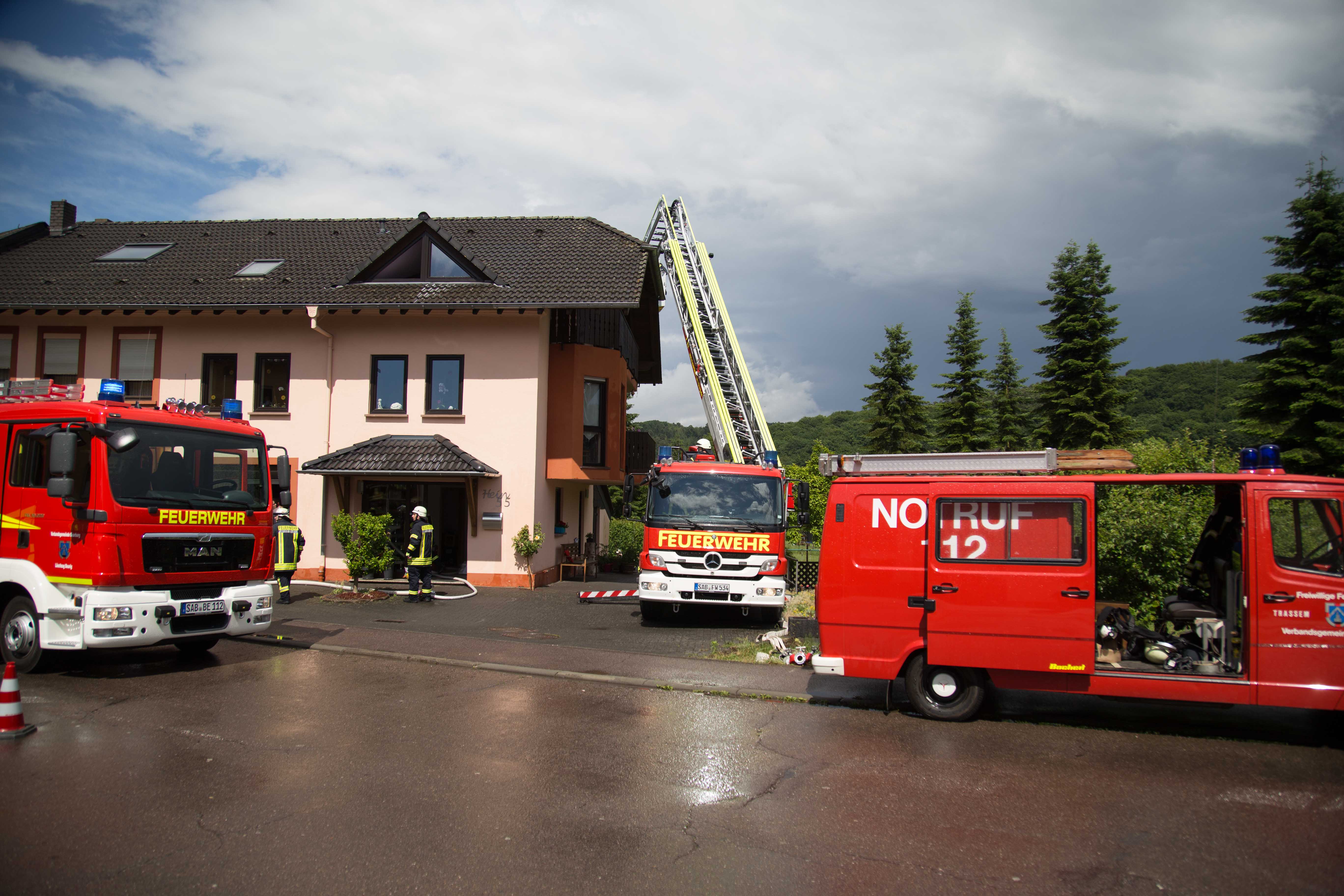 Trassem. Am Freitagnachmittag gewitterte es in vielen Orten der Verbandsgemeinde Saarburg. Gegen 15:24 Uhr schlug in Saarburgerstraße in Trassem ein Blitz in ein Wohnhaus ein. Der Blitzeinschlag war auf der rückseitigen Dachfläche und löste einen Brand im Dachgeschoss aus.