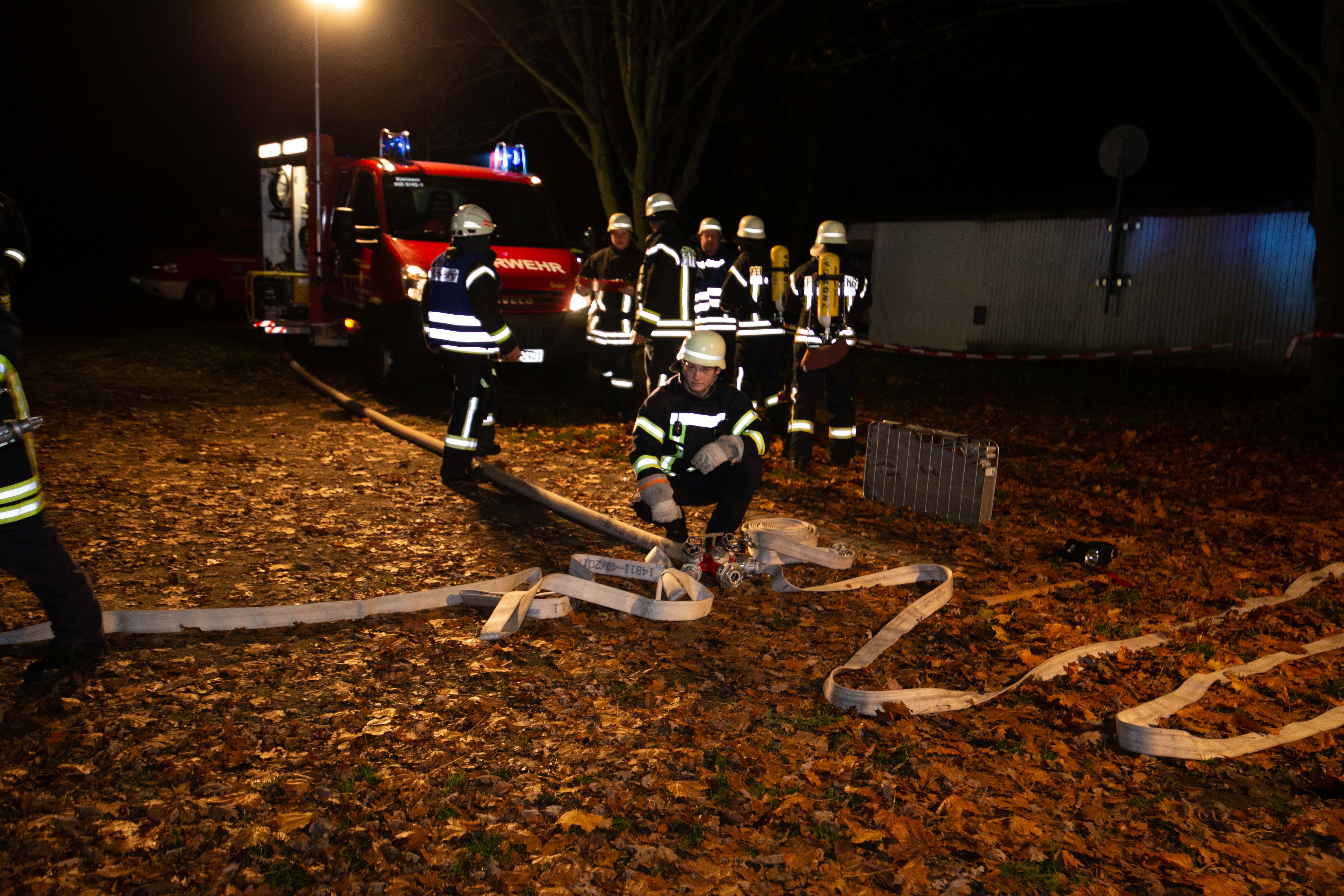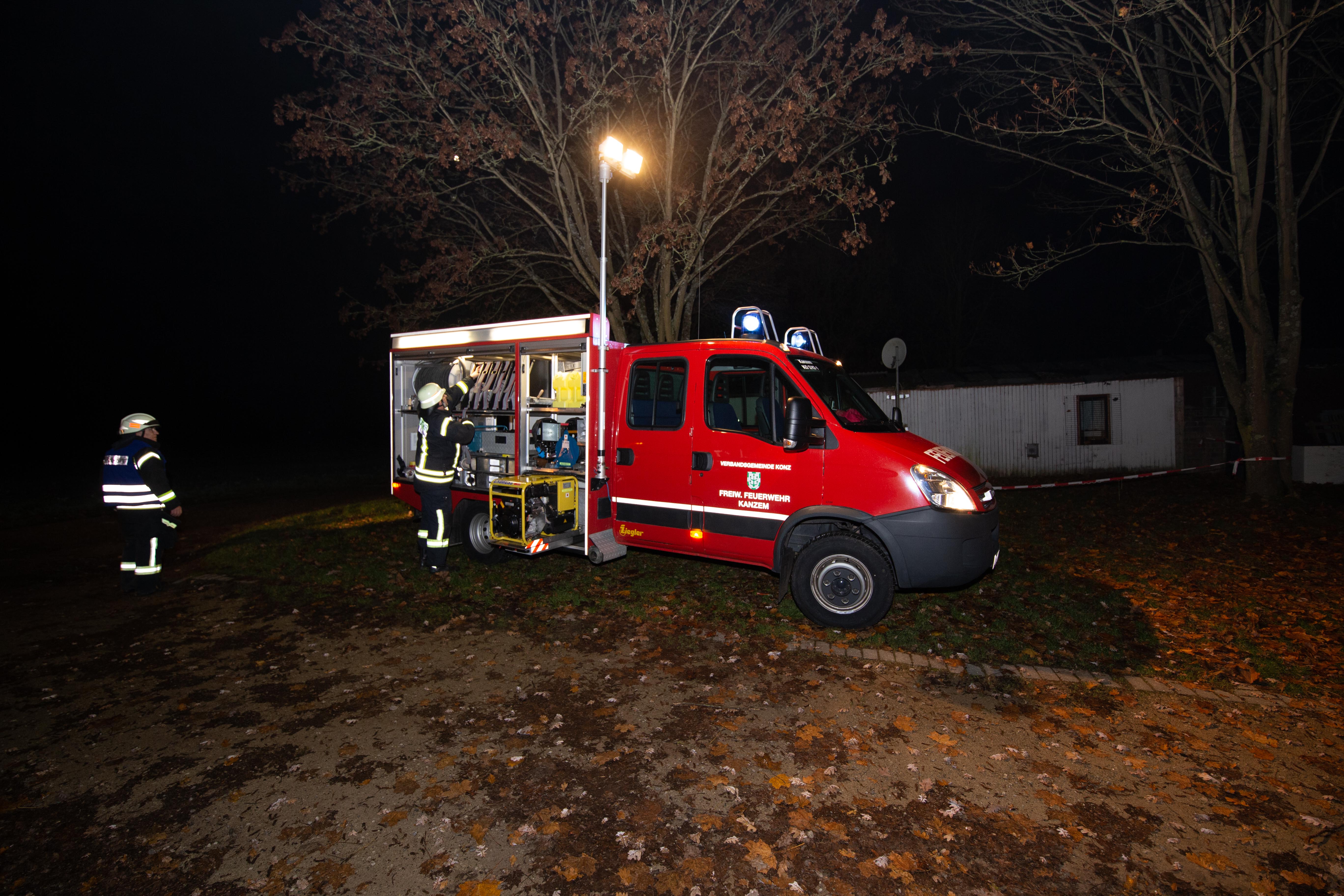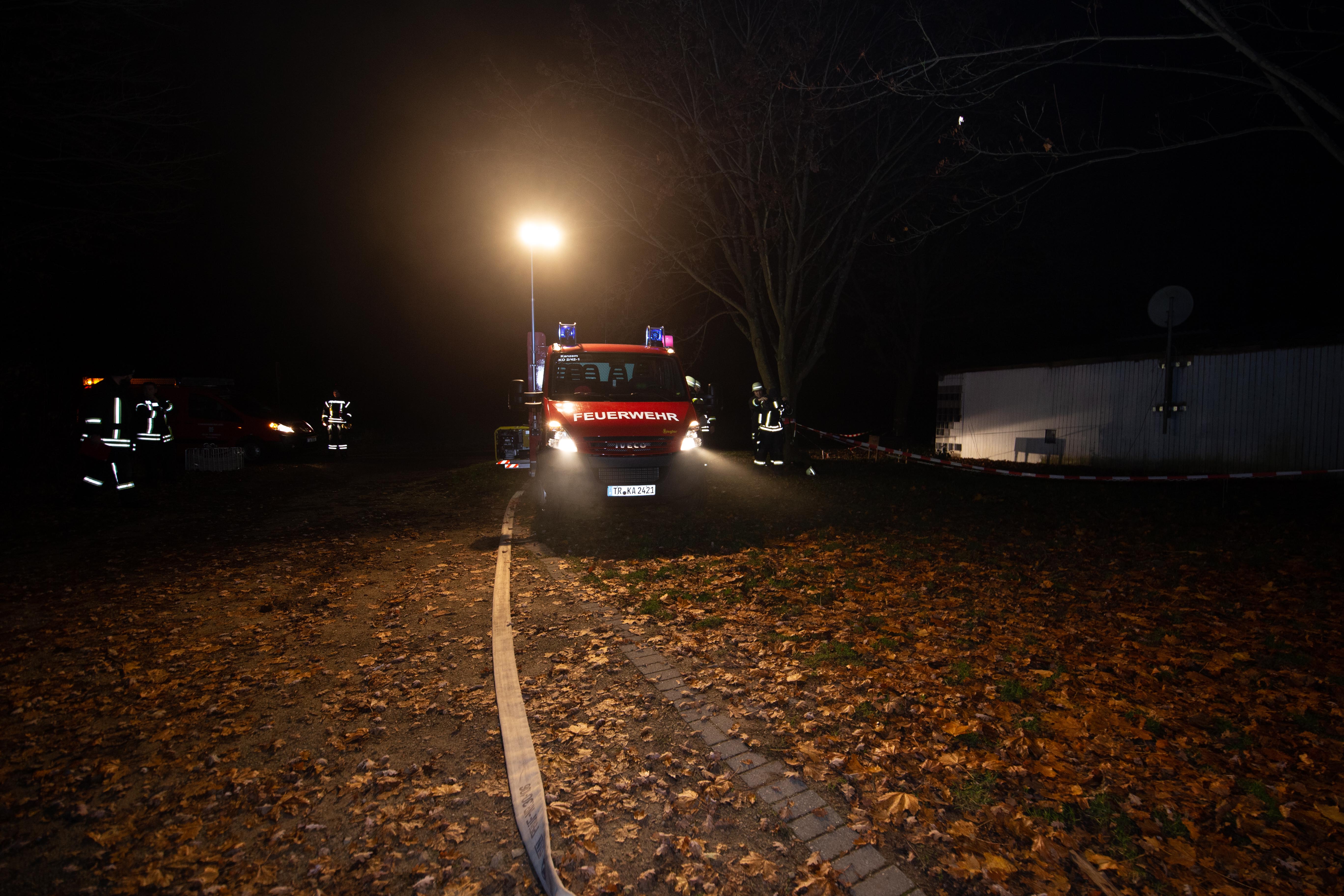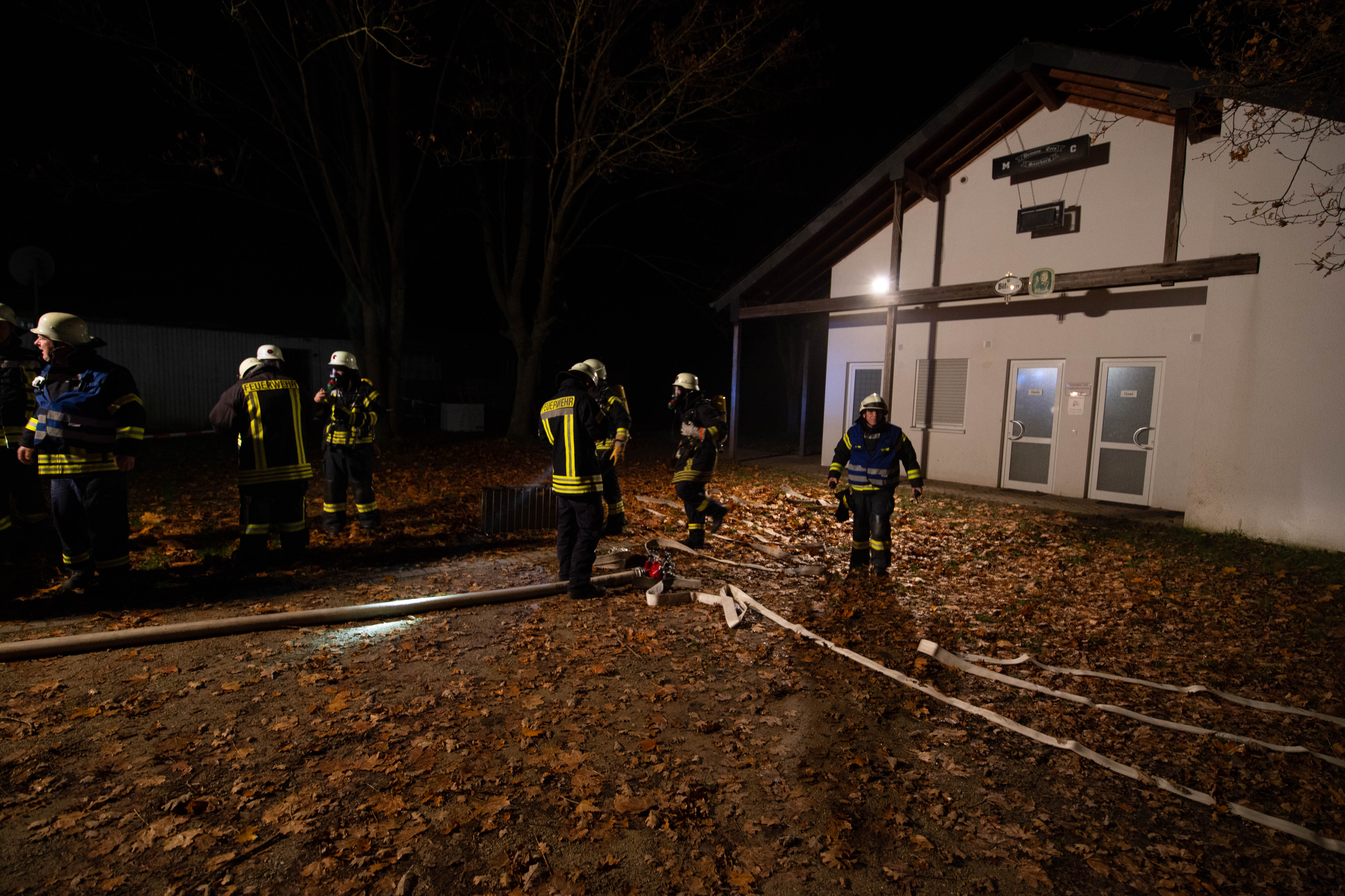 Mit Atemschutzträger wurde das Gebäude des ersten Trupps durchsucht und die Wasserversorgung mittels Pumpen mit einer Länge von etwa 50 Meter von der Saar aus aufgebaut. Zudem war es wegen der Dunkelheit und des außerorts gelegenen Sportplatzes erforderlich, entsprechende Lichtmasten zu installieren und aktivieren.