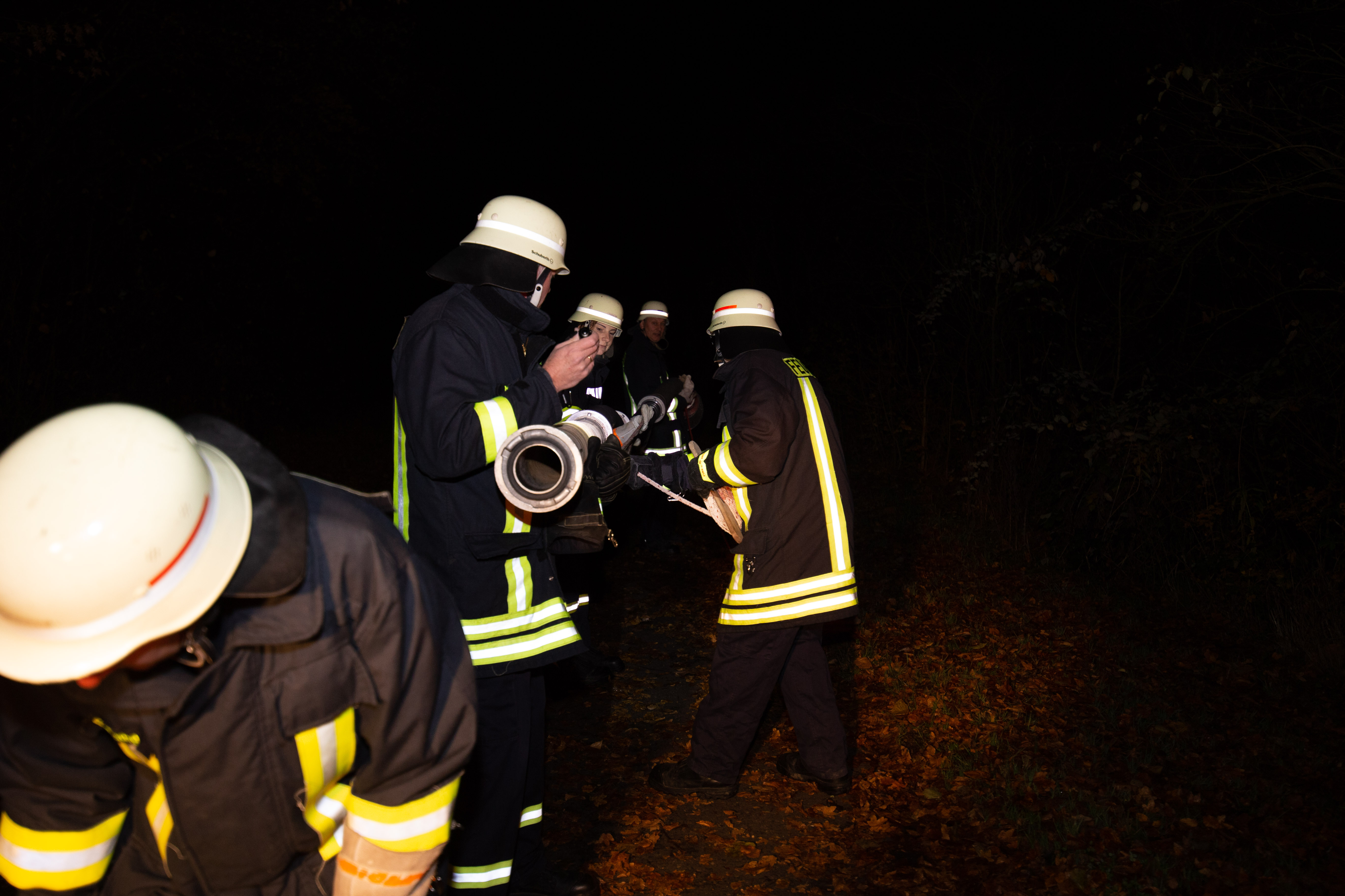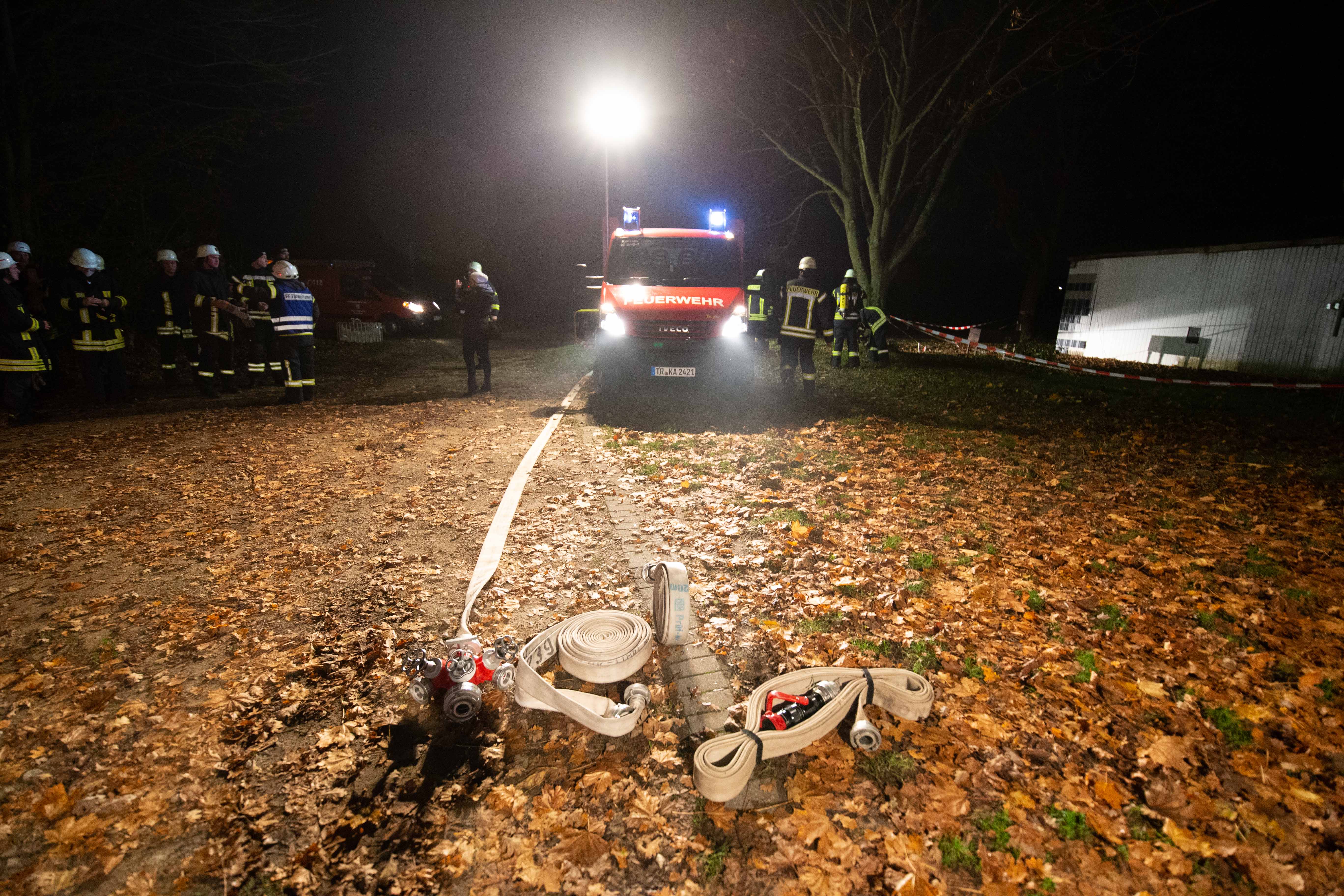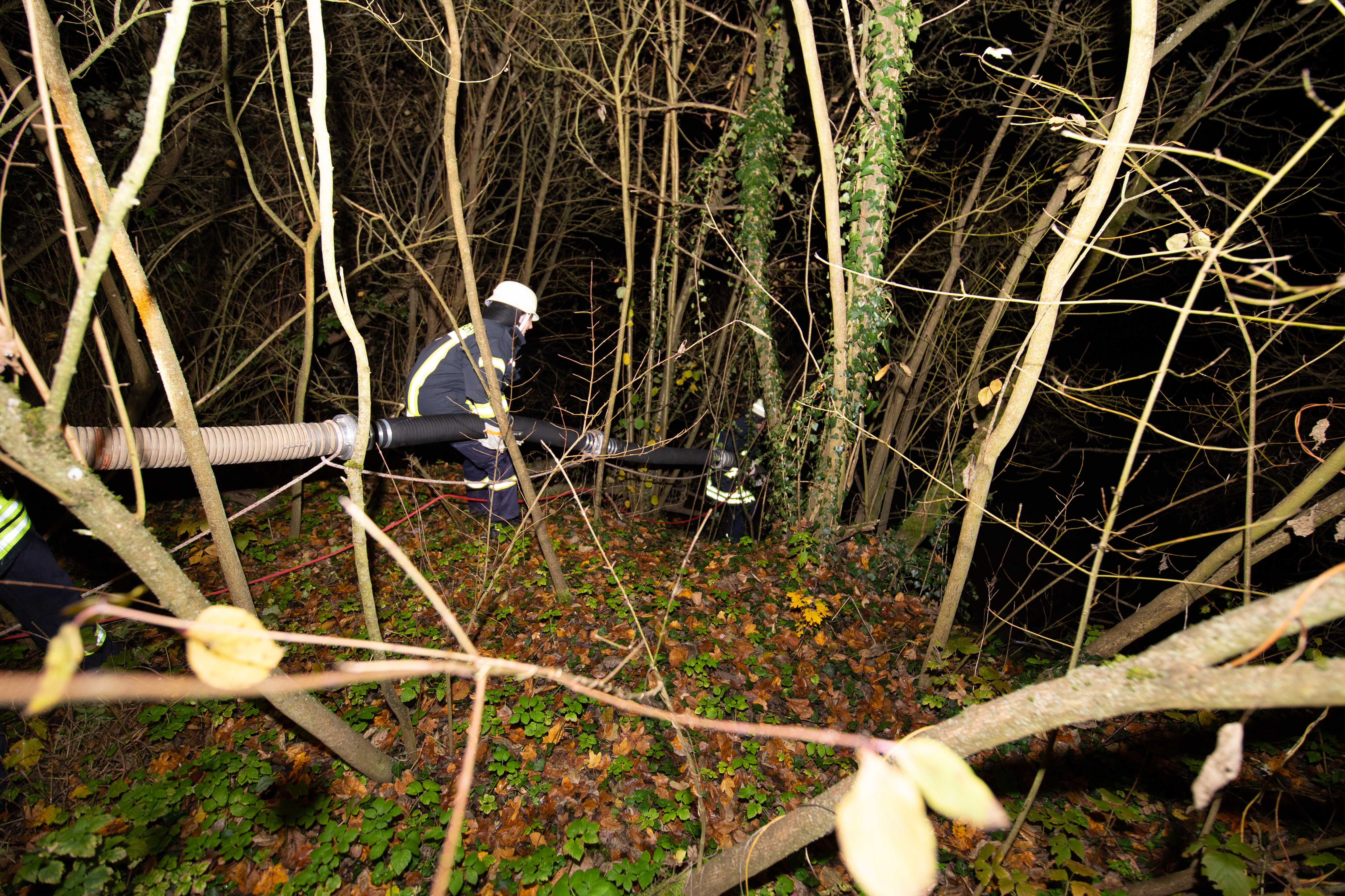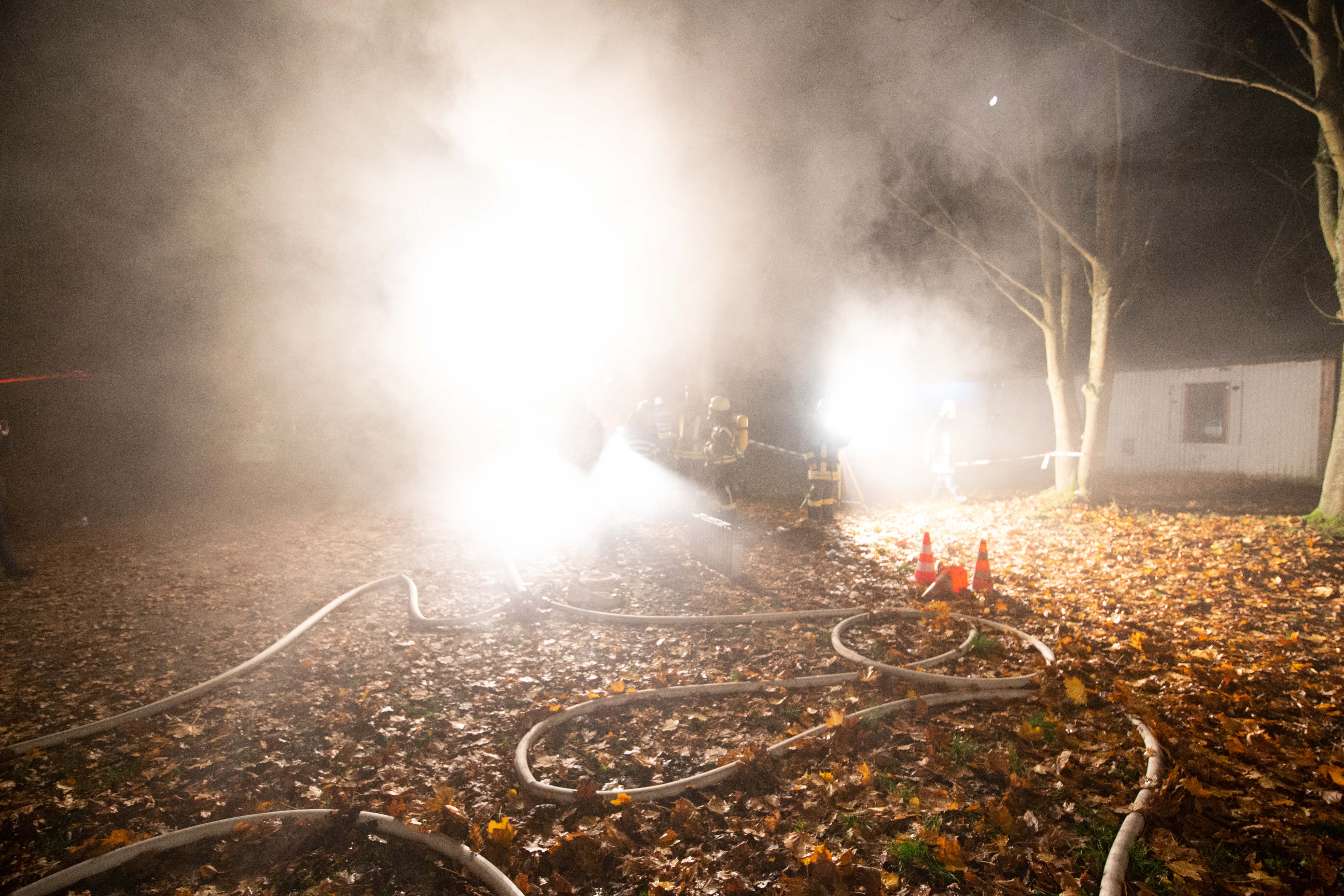 Mit Atemschutzträger wurde das Gebäude des ersten Trupps durchsucht und die Wasserversorgung mittels Pumpen mit einer Länge von etwa 50 Meter von der Saar aus aufgebaut. Zudem war es wegen der Dunkelheit und des außerorts gelegenen Sportplatzes erforderlich, entsprechende Lichtmasten zu installieren und aktivieren.