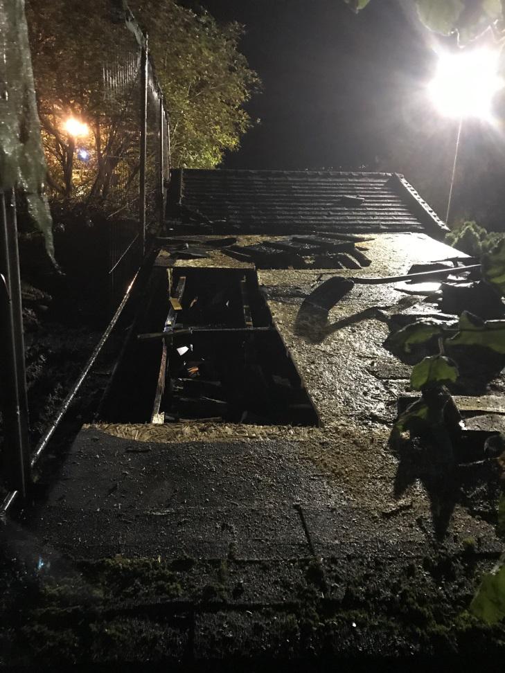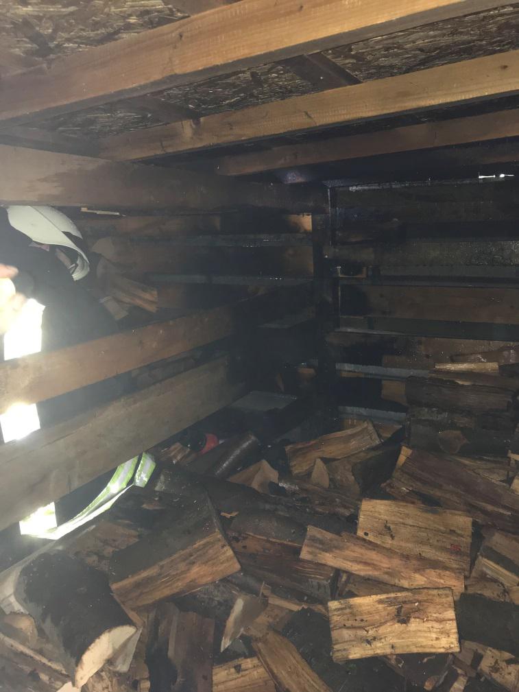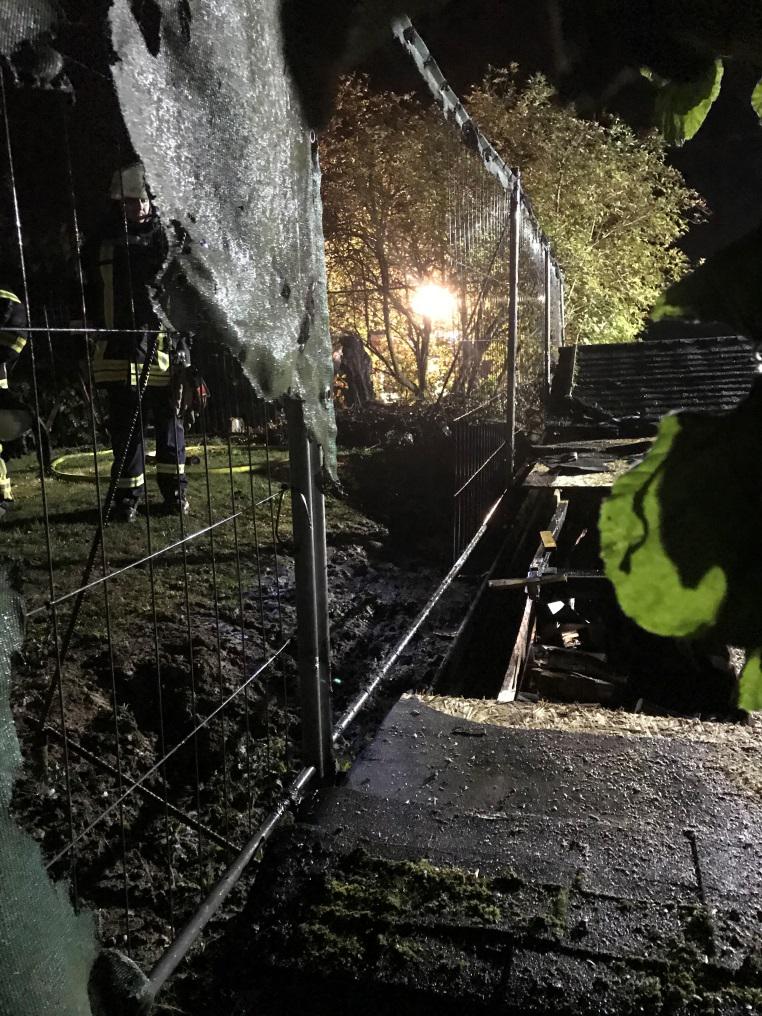 Somit mußte der Holzschuppen ausgeräumt werden um an die Brandnester zu gelangen.  Auch die Dachhaut aus Bitumenschindel musste entfernt werden um in die Holzplatten mit einer Kettensäge  Öffnungen zu schaffen.  Durch   diese Öffnungen und durch das Ausräumen des Holzschuppen konnte der Brand vollständig abgelöscht werden. Die Brandursache war vermutlich Selbstentzündung im Komposthaufen. Durch das Feuer des Komposthaufens fing eine Kunststoffplane am Zaun zu brennen, dadurch geriet auch der Holzschuppen in Brand. Der Einsatzt zog sich z eineinhalb Stunden hin.  Ein Feuerwehrmann verletzte sich leicht und musste im Krankenhaus ärtzlich behandelt werden.