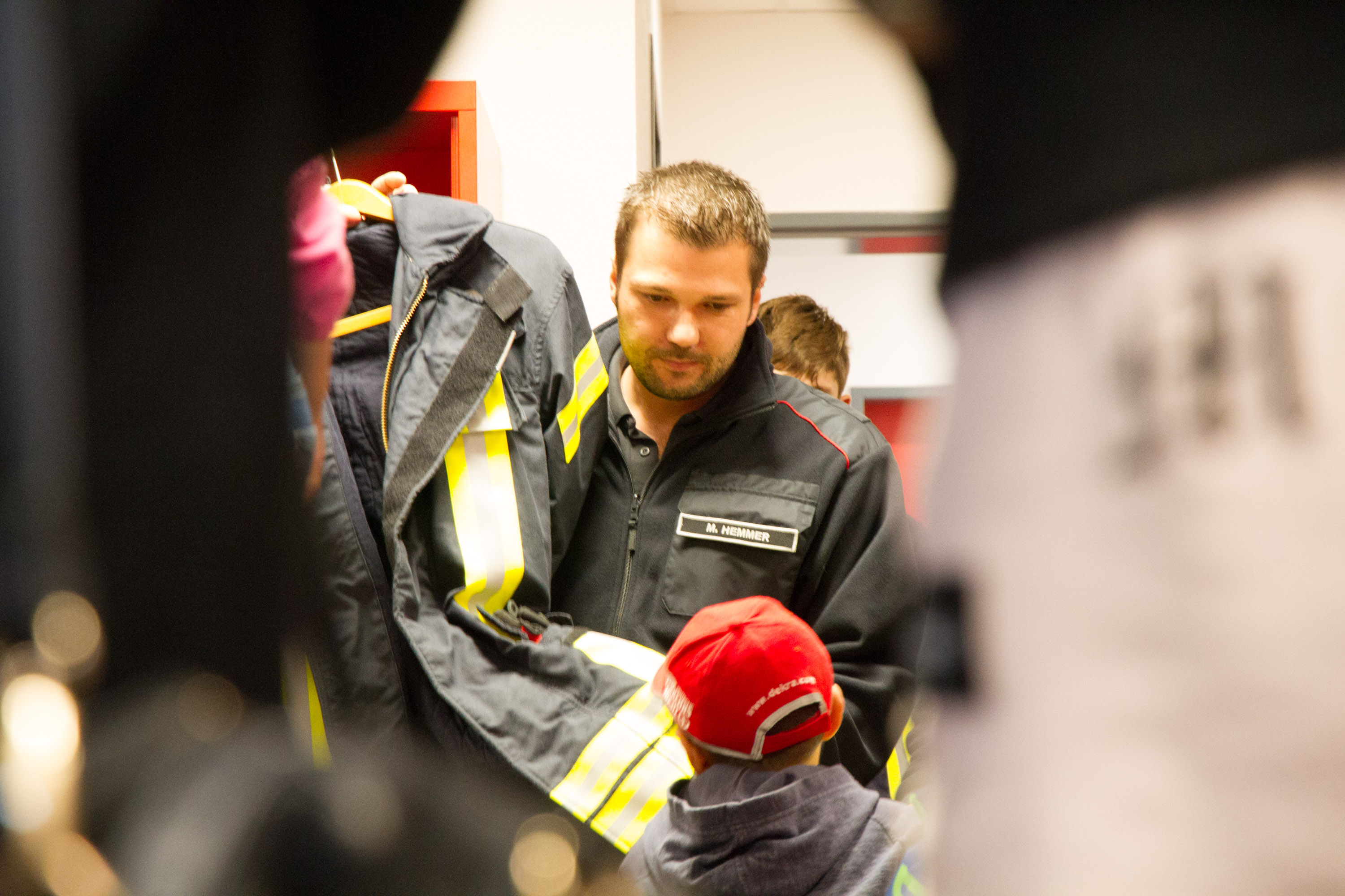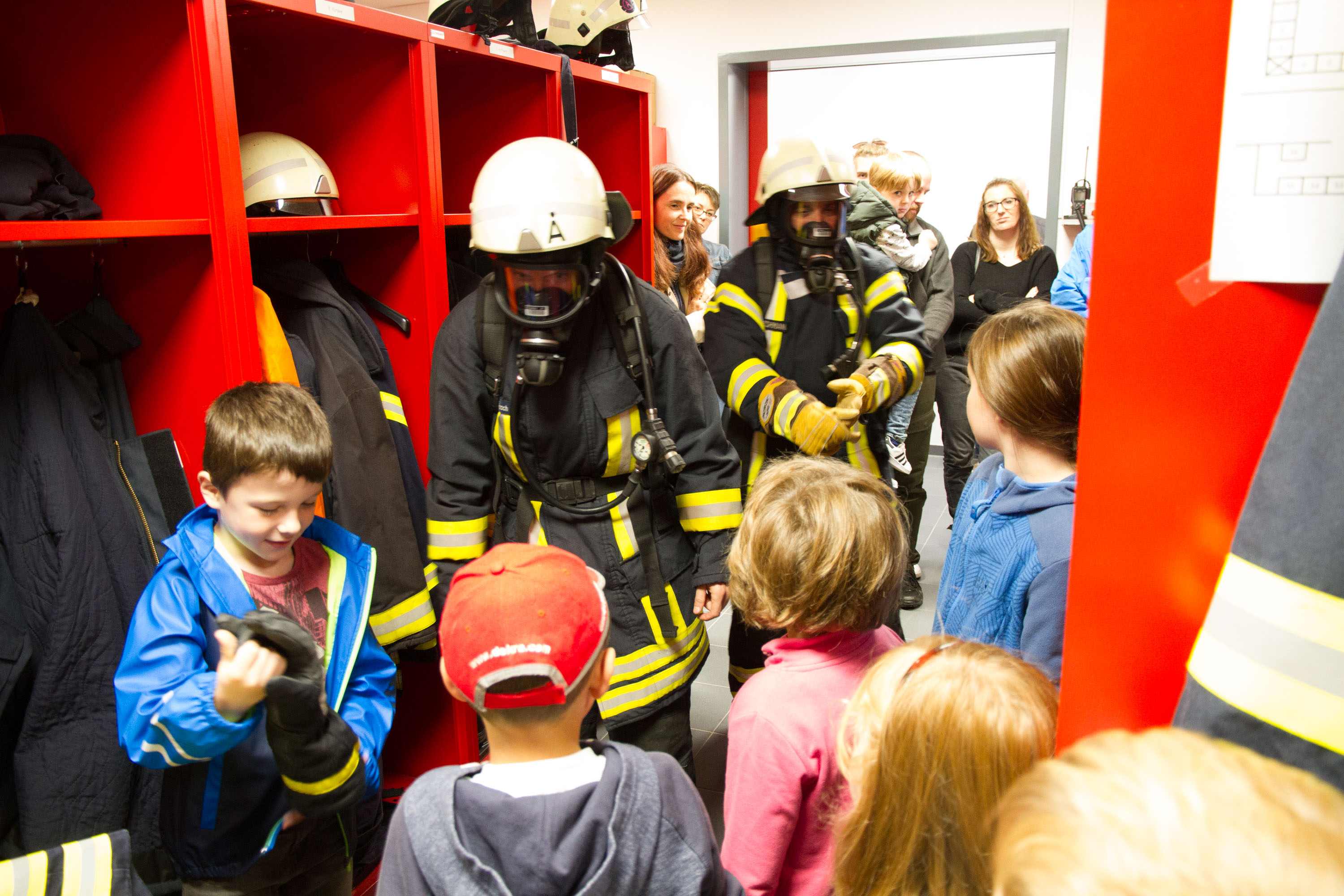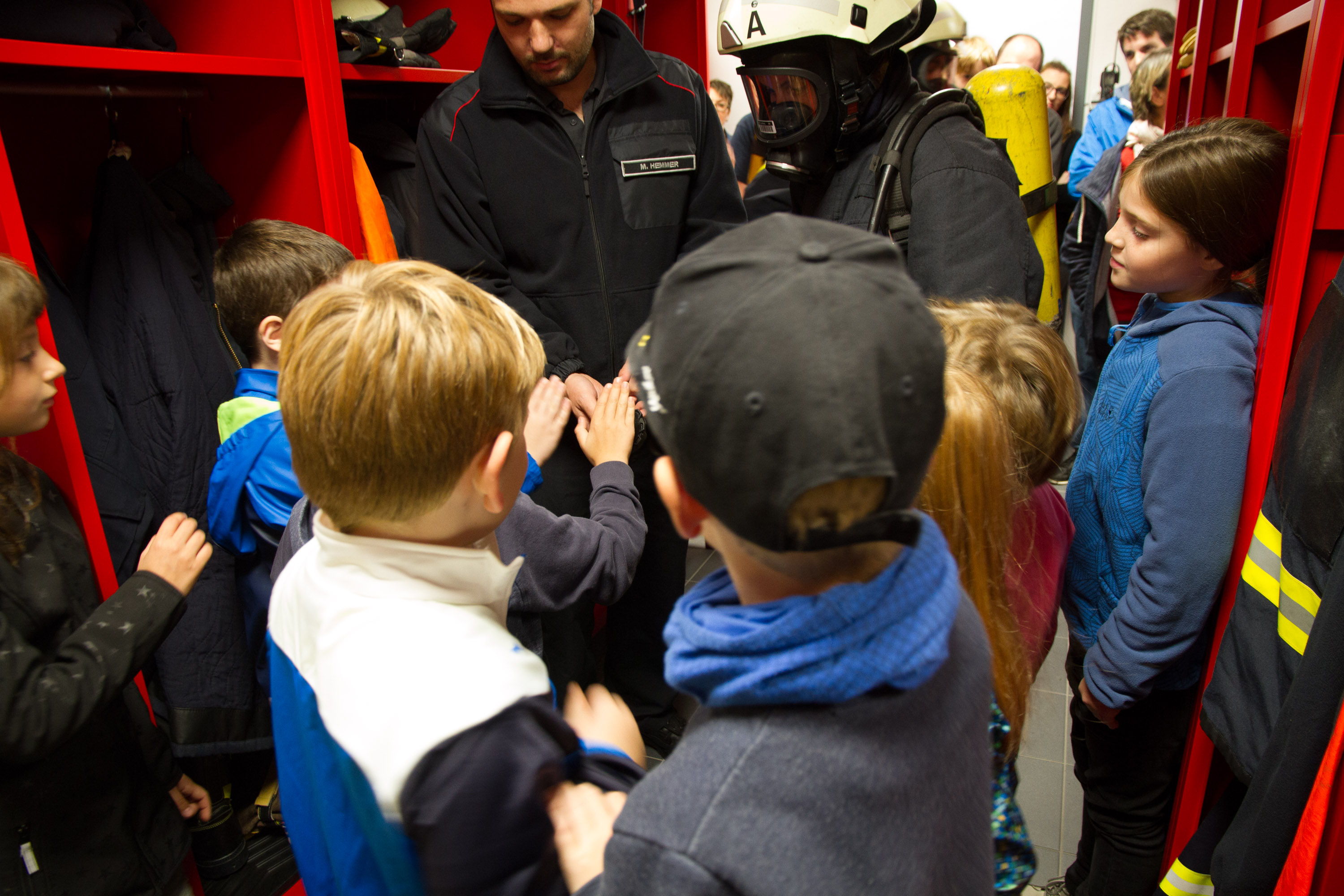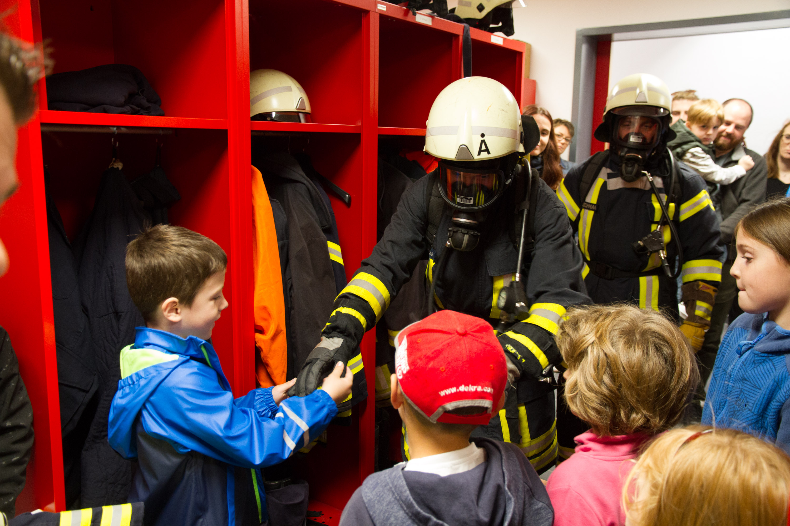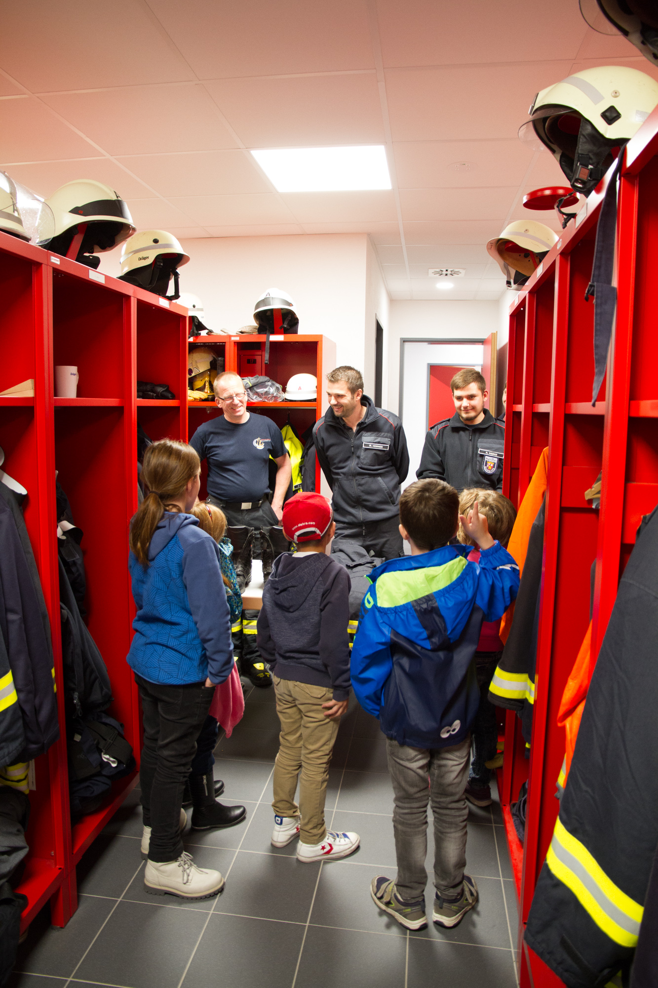 Der nächste Schritt führte die Kinder zur Kleiderkammer. Eine ausführliche Erklärung der Kleidung und Ausrüstung war von den Kindern mit viel Interesse und Fragen verknüpft. Die Spannung stieg, als zwei Wehrkameraden mit voller Atemschutzausrüstung wie im Realeinsatz die Kleiderkammer betraten.