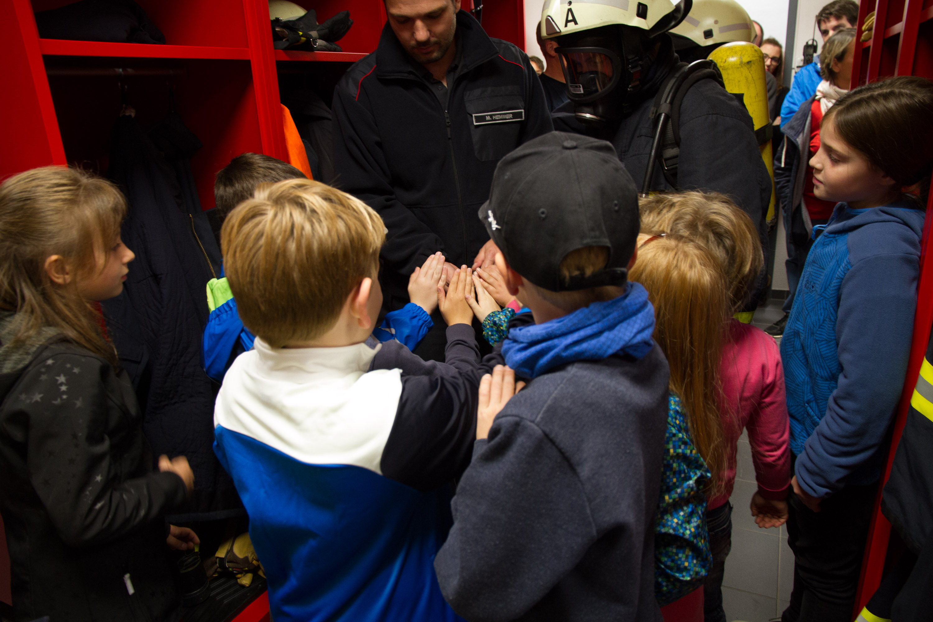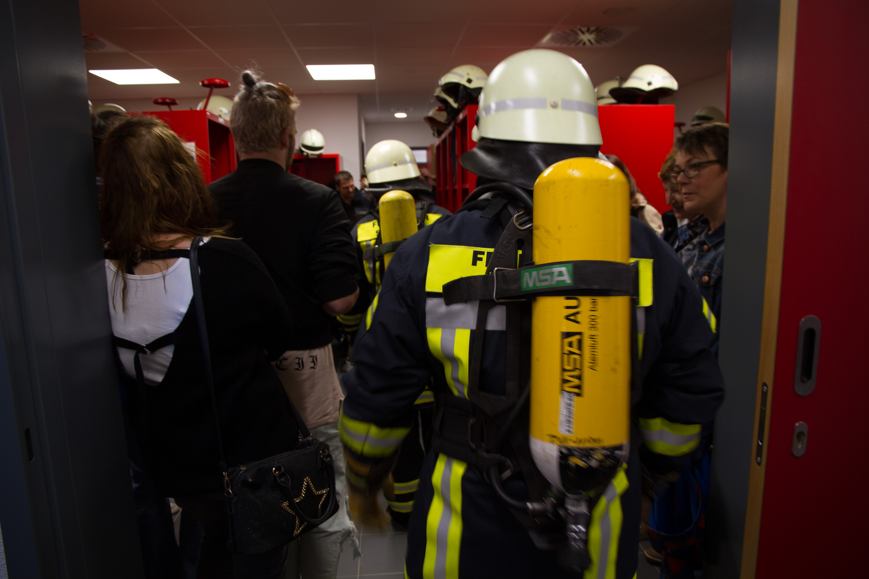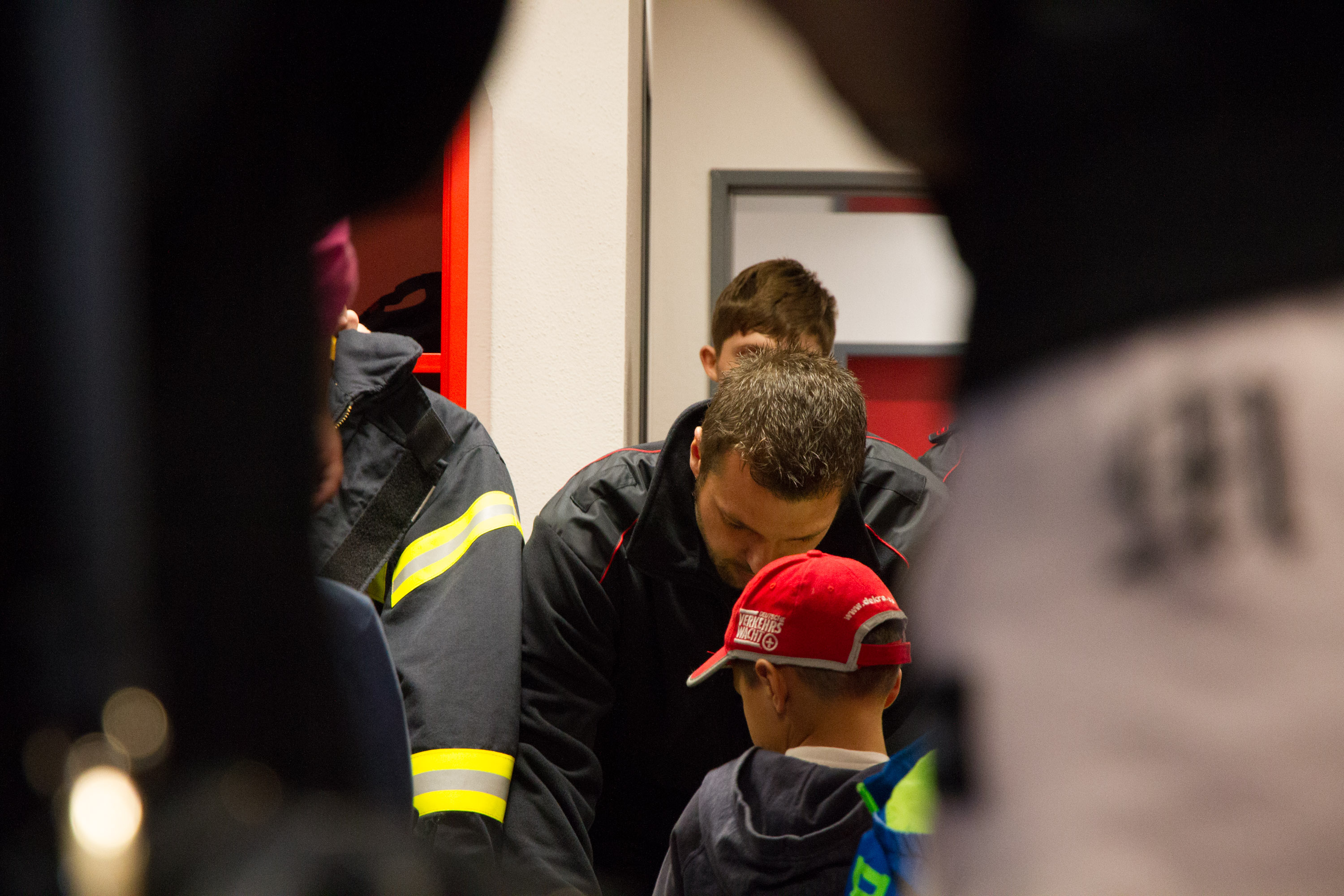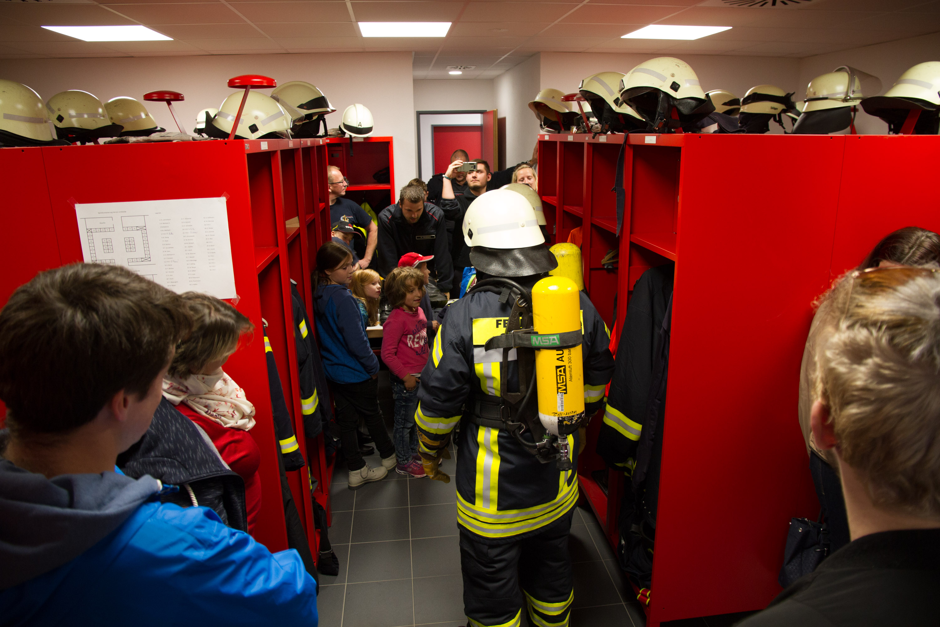 Der nächste Schritt führte die Kinder zur Kleiderkammer. Eine ausführliche Erklärung der Kleidung und Ausrüstung war von den Kindern mit viel Interesse und Fragen verknüpft. Die Spannung stieg, als zwei Wehrkameraden mit voller Atemschutzausrüstung wie im Realeinsatz die Kleiderkammer betraten.