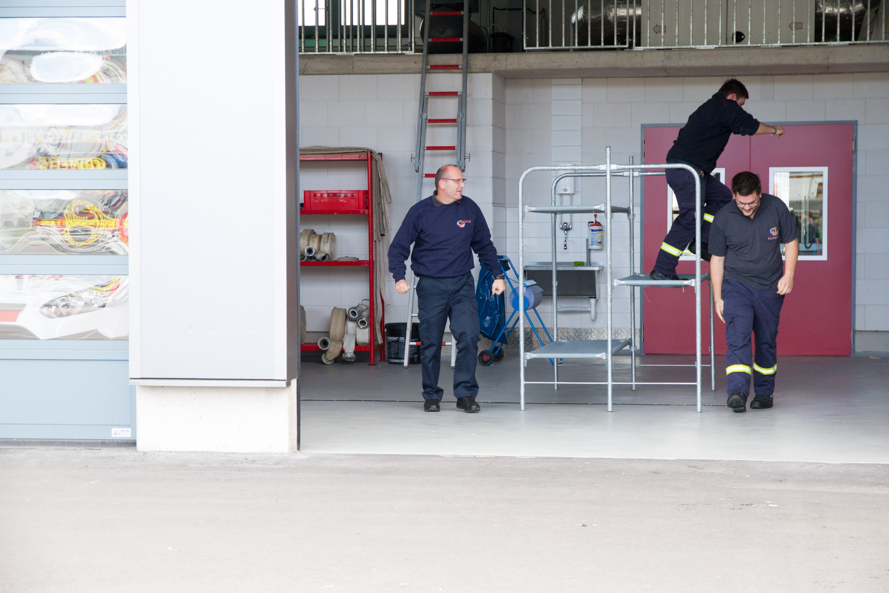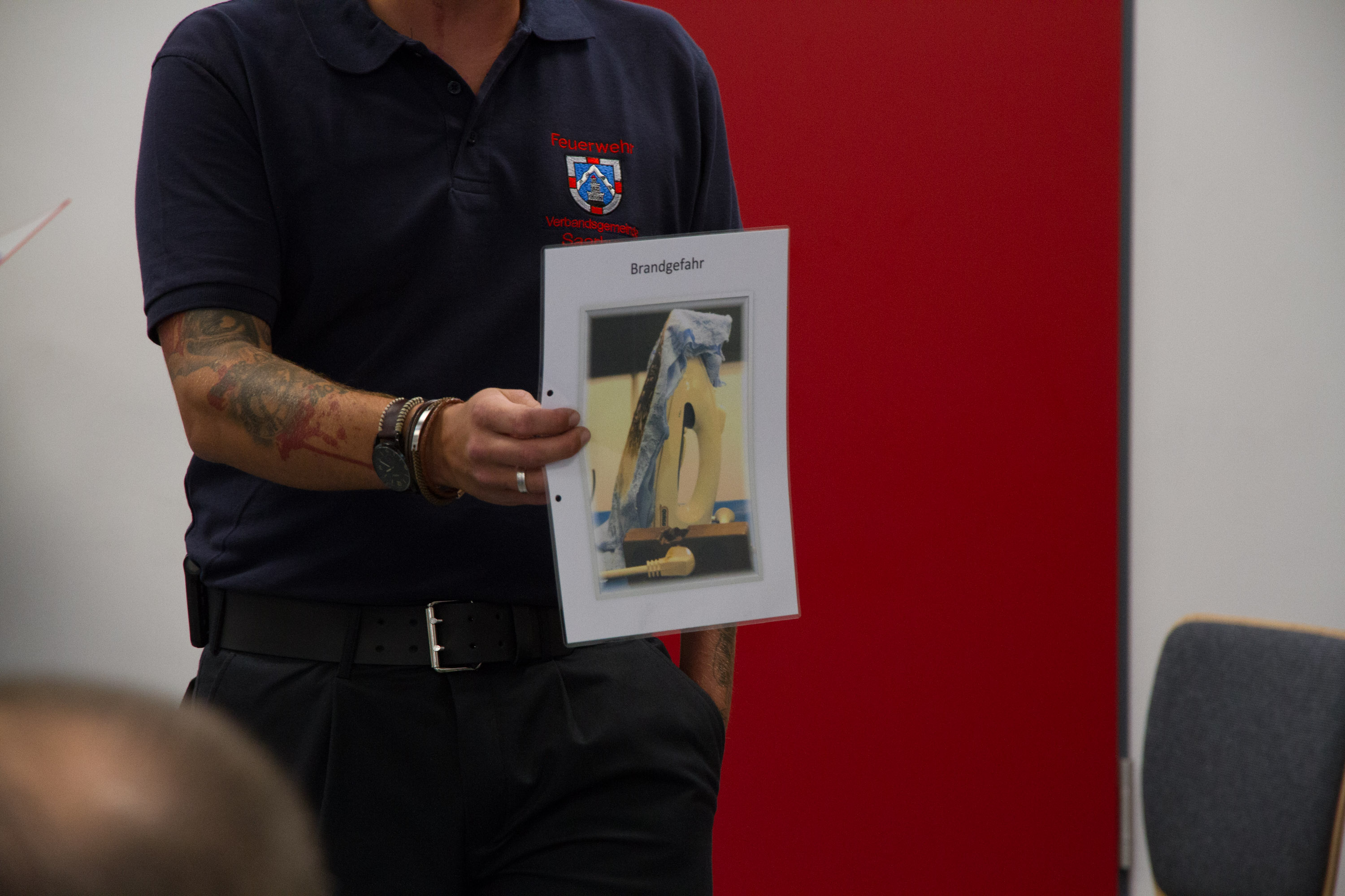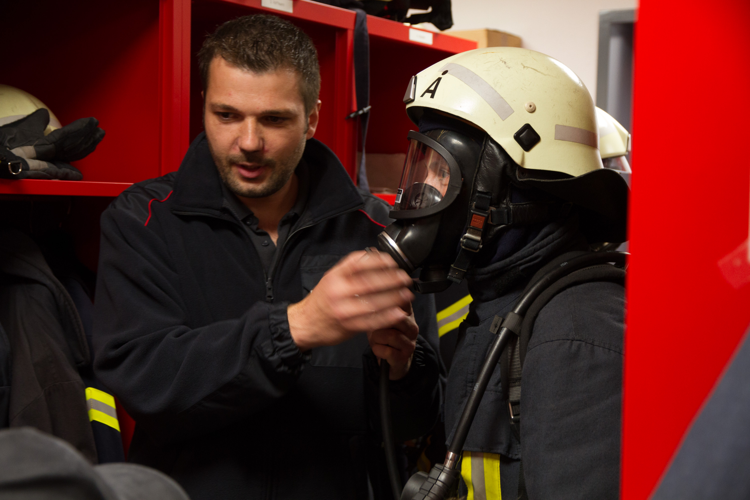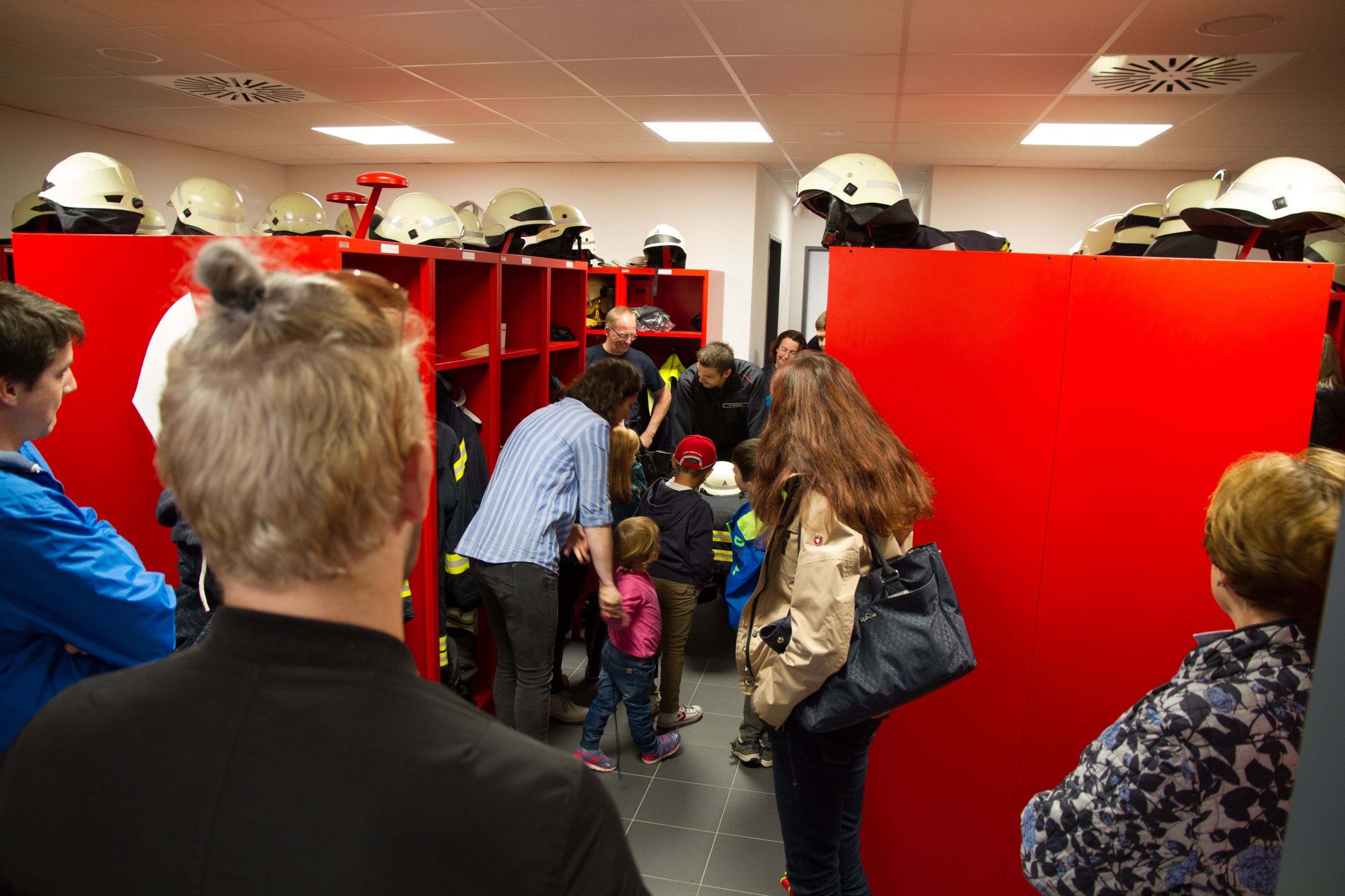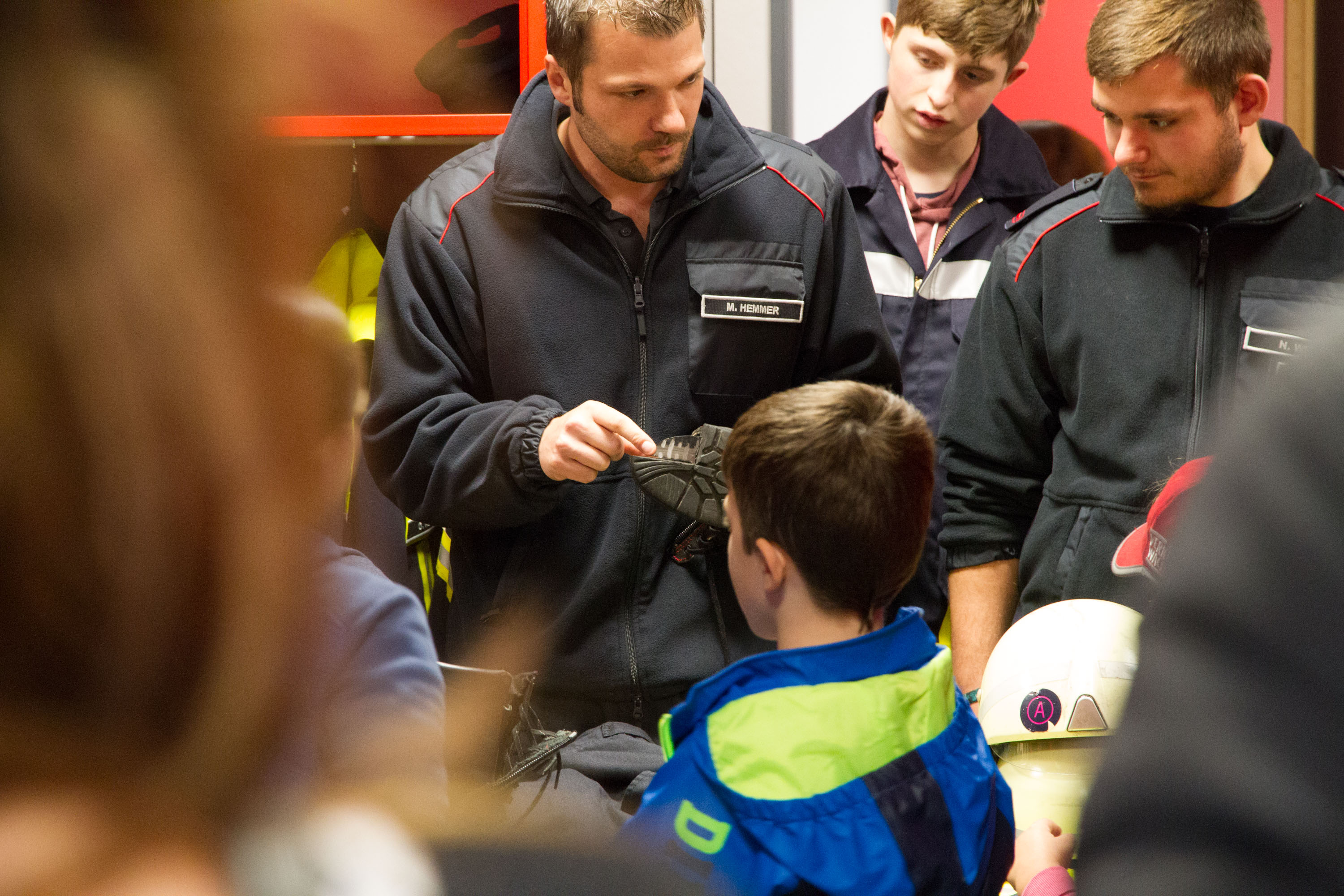 Der nächste Schritt führte die Kinder zur Kleiderkammer. Eine ausführliche Erklärung der Kleidung und Ausrüstung war von den Kindern mit viel Interesse und Fragen verknüpft. Die Spannung stieg, als zwei Wehrkameraden mit voller Atemschutzausrüstung wie im Realeinsatz die Kleiderkammer betraten.