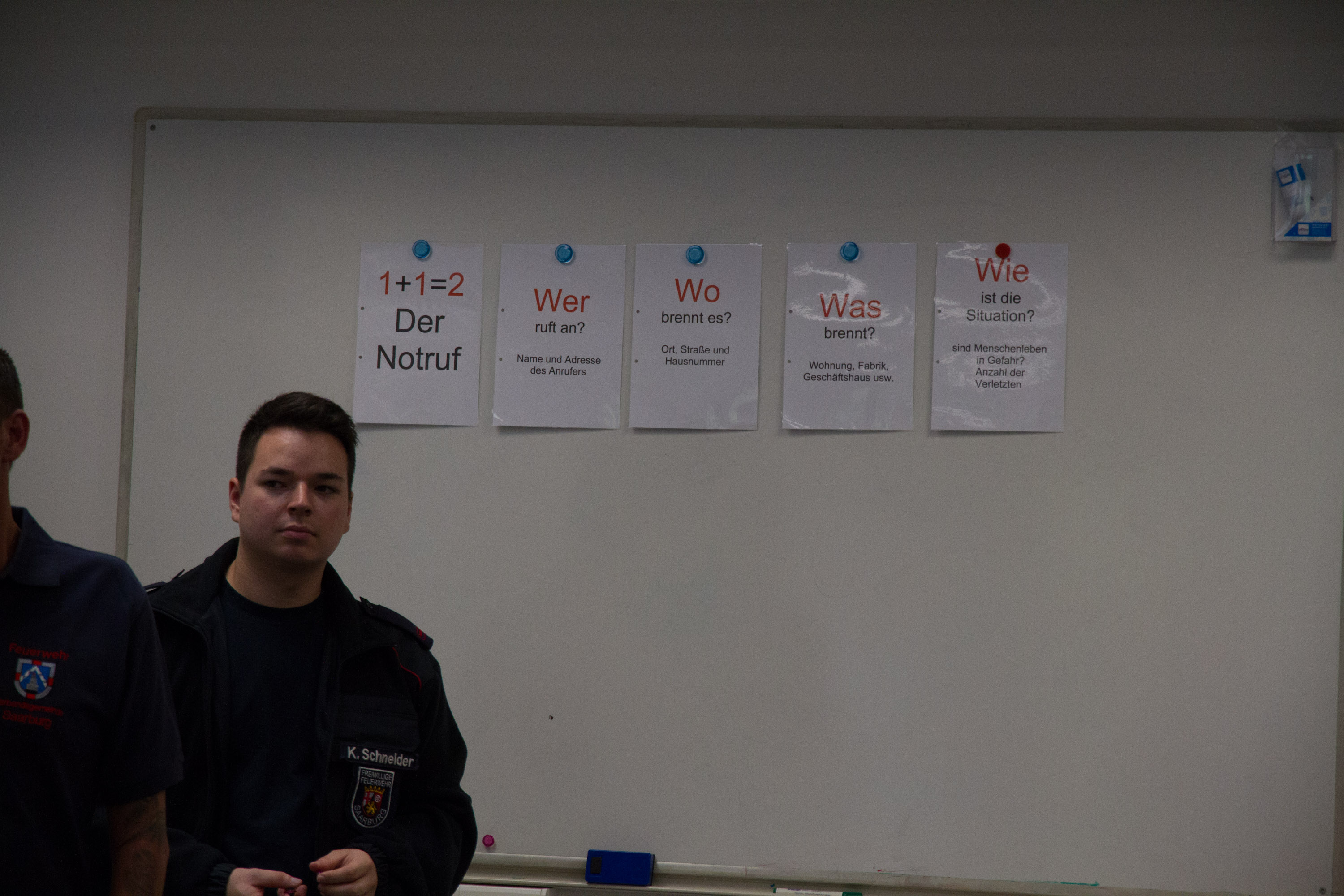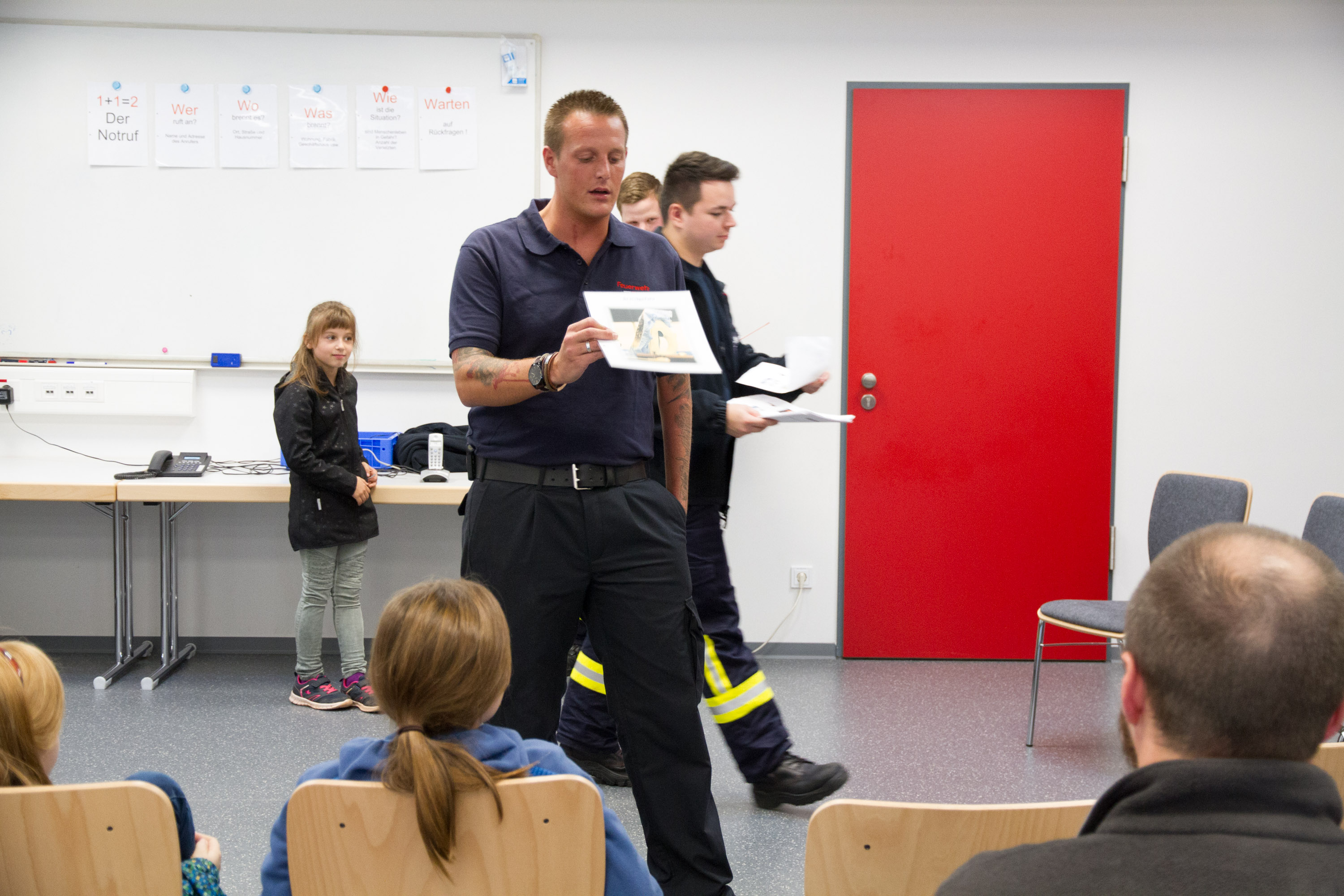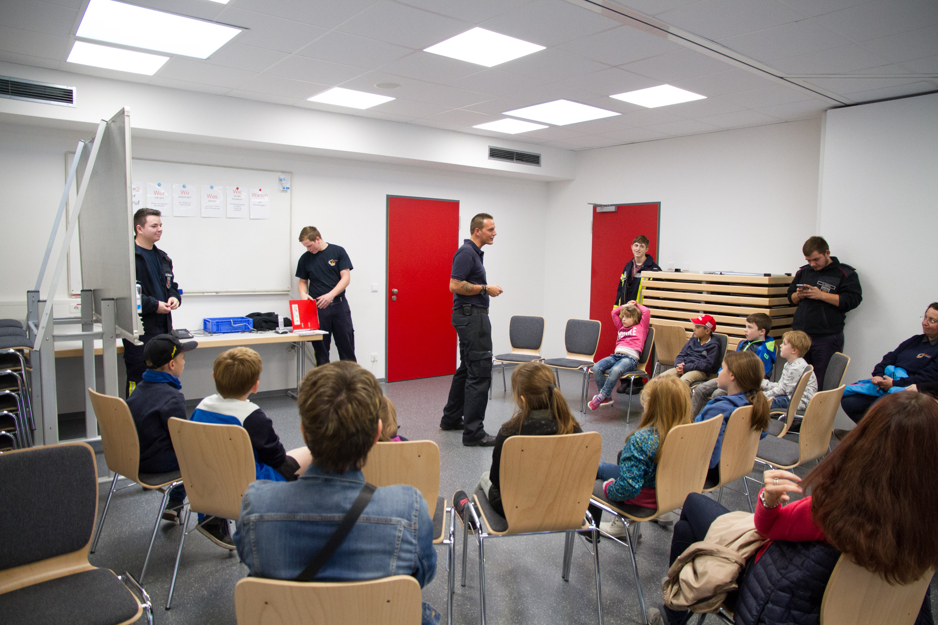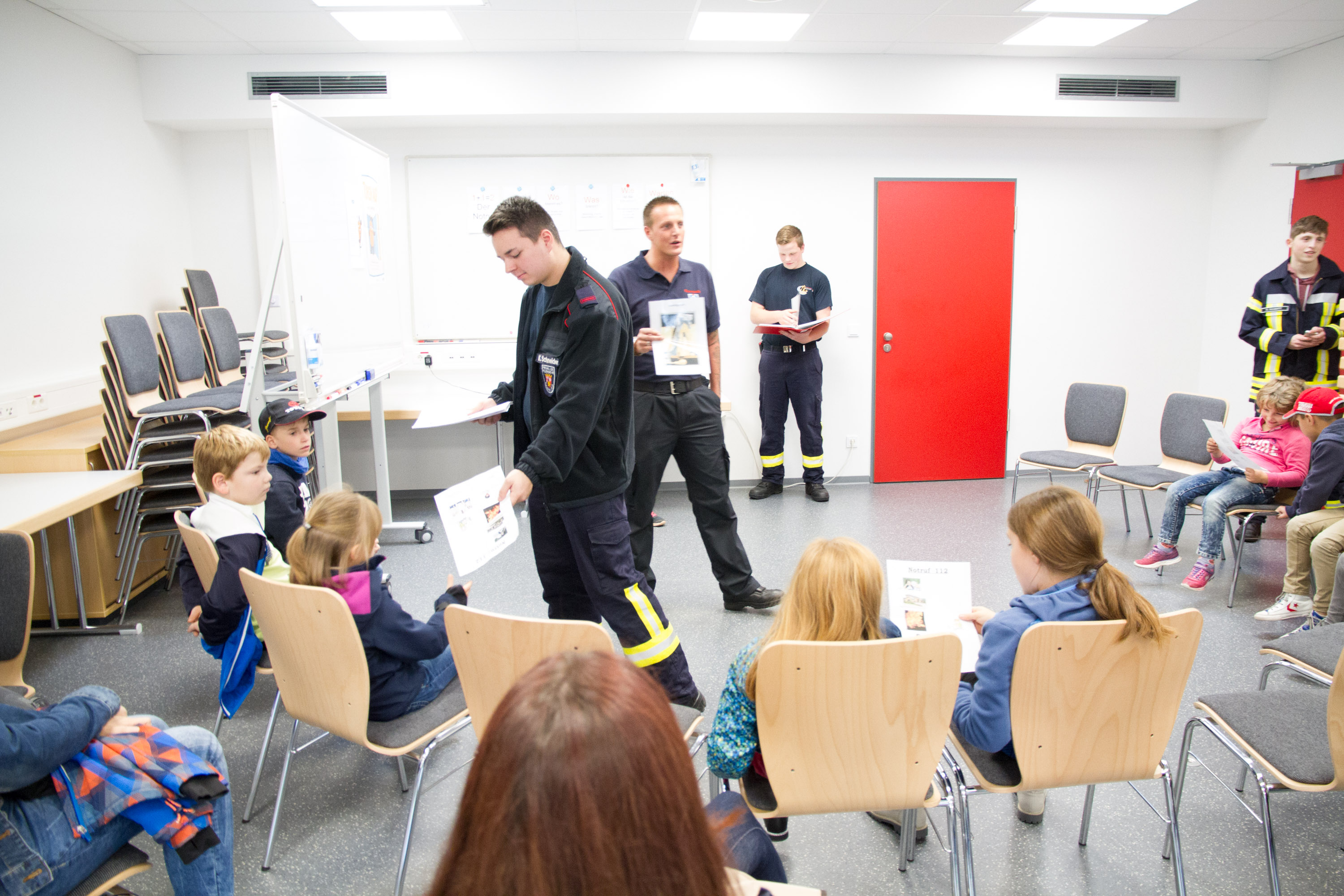 Ein abwechslungsreiches Programm boten die Kameradinnen und Kameraden den 40 Grundschulkinder im Alter von 6 – 10 Jahre mit Ihren Eltern und Großeltern in zwei Gruppen am vergangenen Sonntag. Nach der Einweisung und Begrüßung der zwei Gruppen im großen Schulungsraum der Wache wurden die Kinder aktiv mit denen fünf W,s durch Präsentation eines DIN A4 Realfotos auf den Absatz eines Notrufes eingestimmt. Mit Anspannung und Begeisterung setzten die Kinder den Notruf über die 110 ab, während am anderen Ende der Leitung der Kamerad Max Wagner die Anrufe entgegennahm und Verhaltensanweisungen in „Kindessprache“ umsetzte. Wer,wo,was,wie und warten. Mit Erfolg, denn nach der Frage, wer will noch einmal, musste man abklatschen und hatte viel Spaß dabei.
