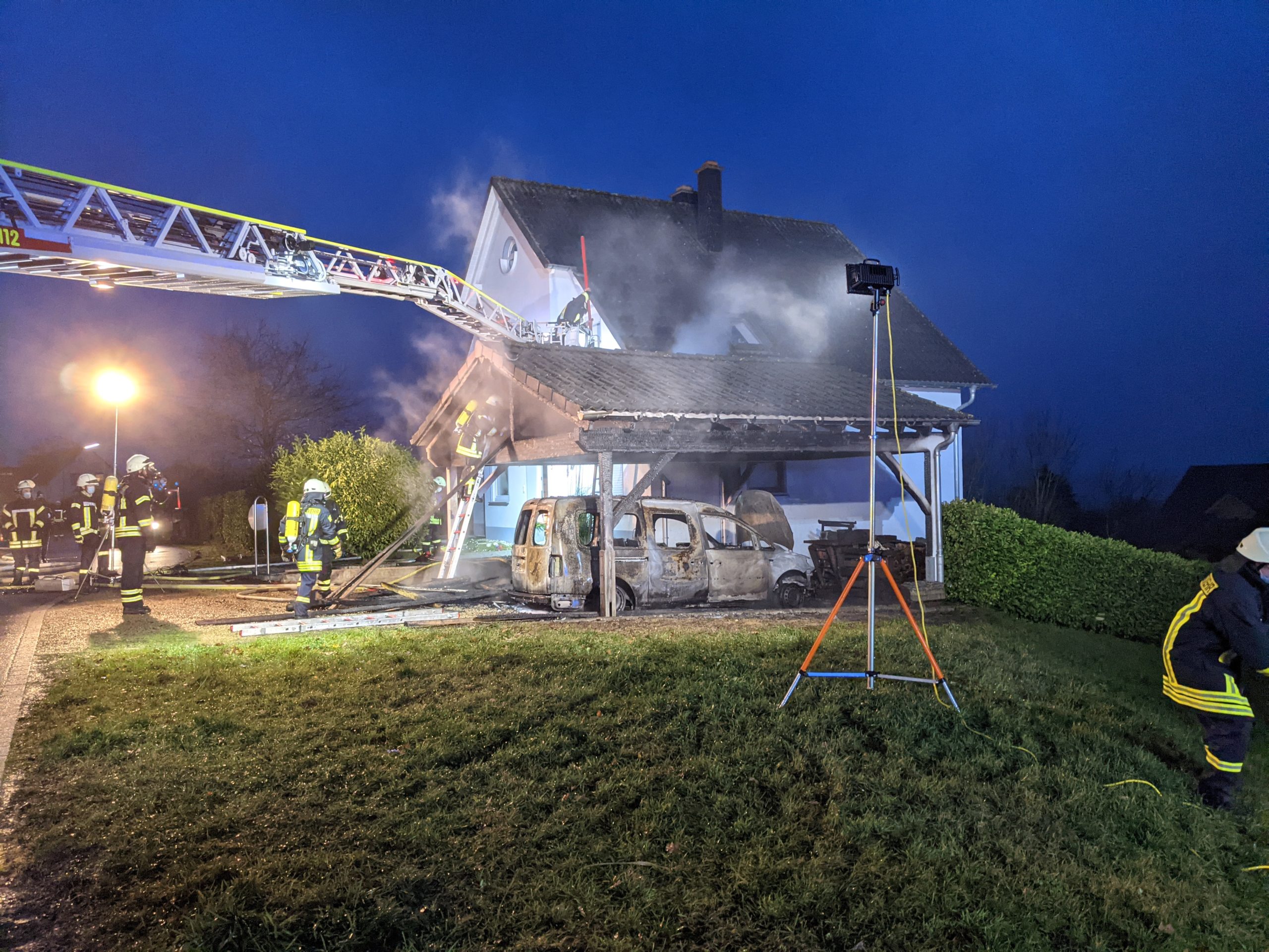 Laut Augenzeugen kam es vermutlich aufgrund eines technischen Defekts an einer Lampe zum Brand im Carport. Daraufhin sind die Flammen vom Dachgebälk auch auf ein geparktes Auto übergegriffen. Dieses ging ebenfalls in Flammen auf, ein zweites Auto konnte noch rechtzeitig gerettet werden.