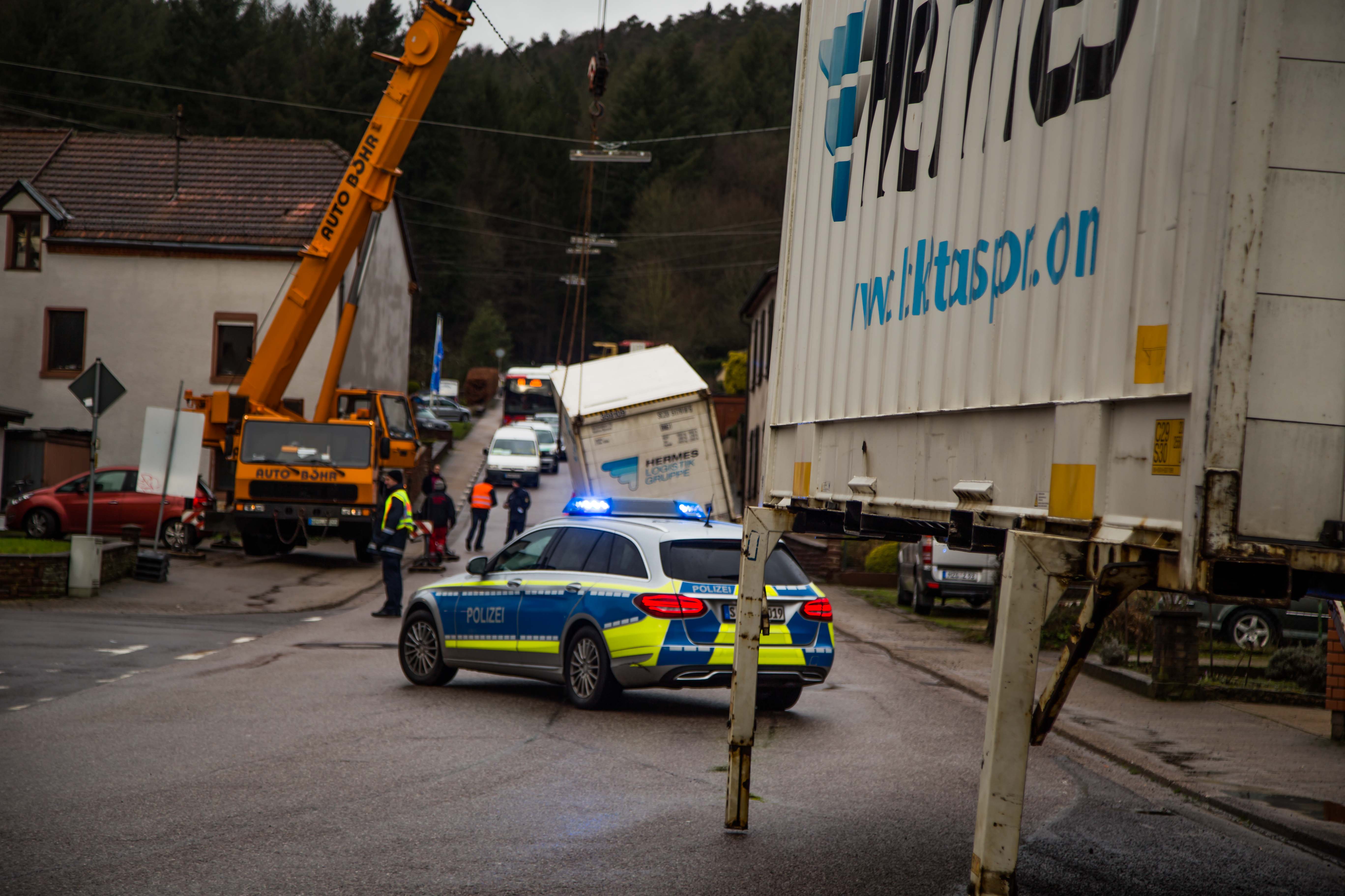 Die Mettlacher Polizei hat den Unfallort abgesperrt und die Firma Bohr hat den Container geborgen und wieder auf den Anhänger platziert.