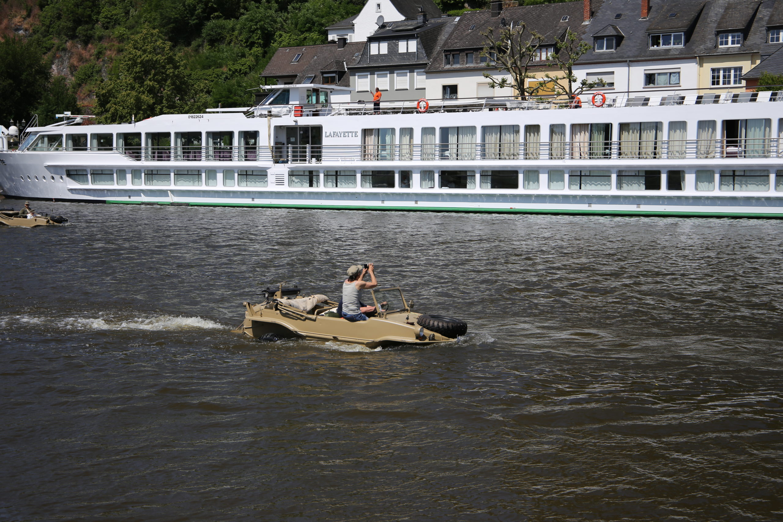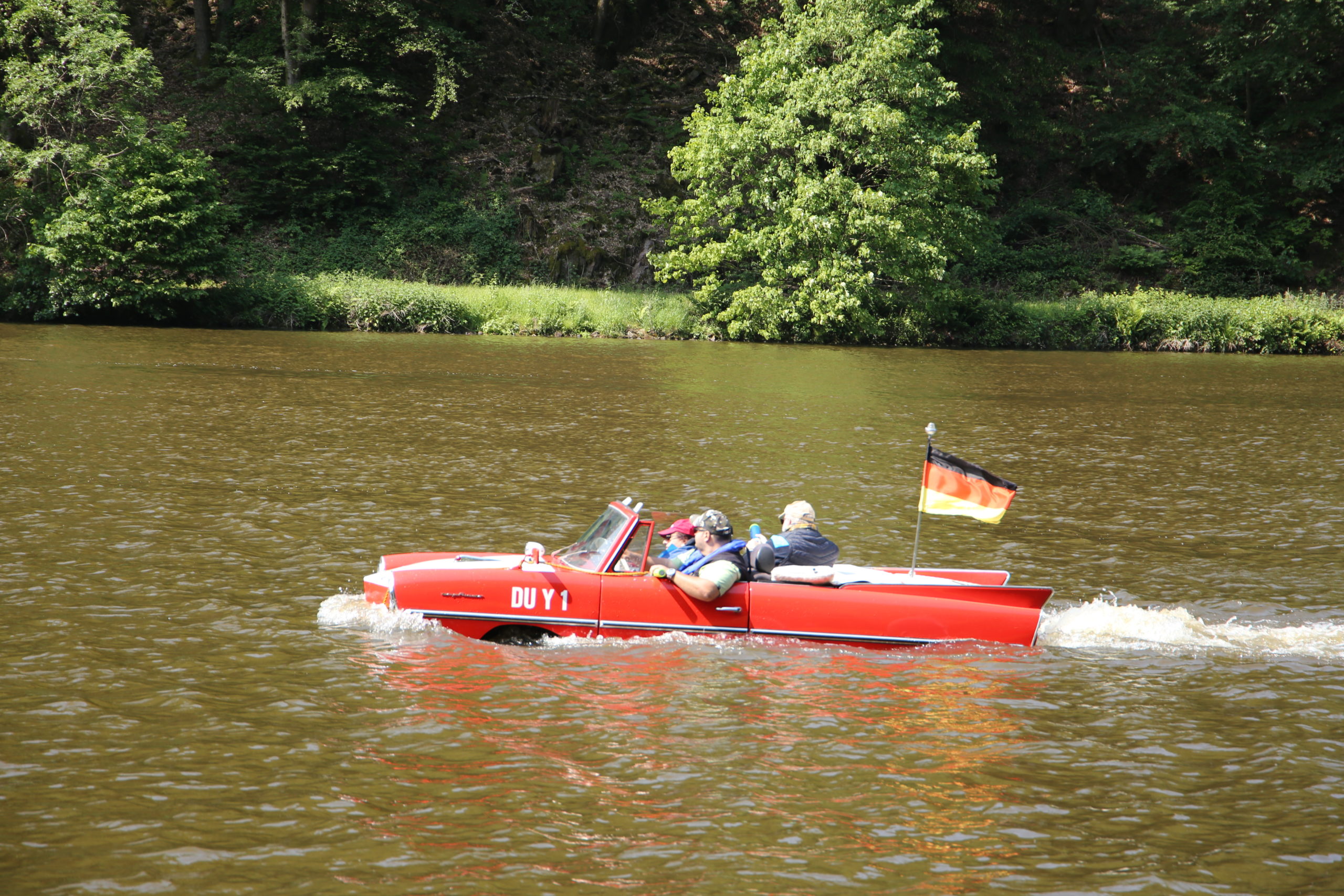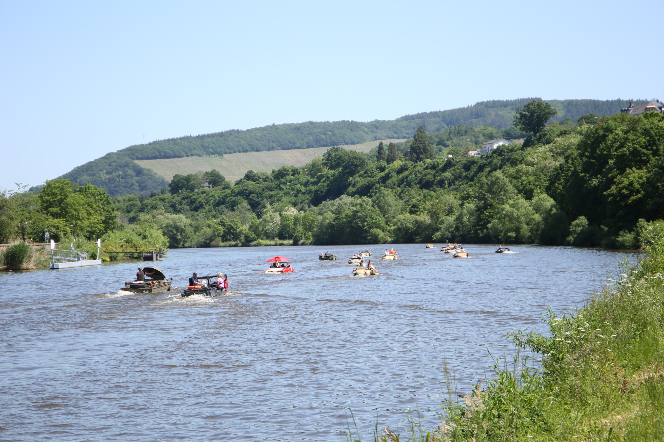 An die einhundertachtzig Mitglieder trafen sich am vergangenen Freitag an der Saarschleife bei Dreisbach zum einwässern und gemeinsamer Fahrt mit etwa vierzig Schwimmwagen in Richtung Schleuse Mettlach. Kurz vor der Schleuse mußte nochmals ausgewässert werden um nochmals nach der Schleuse wieder einzuwässern.