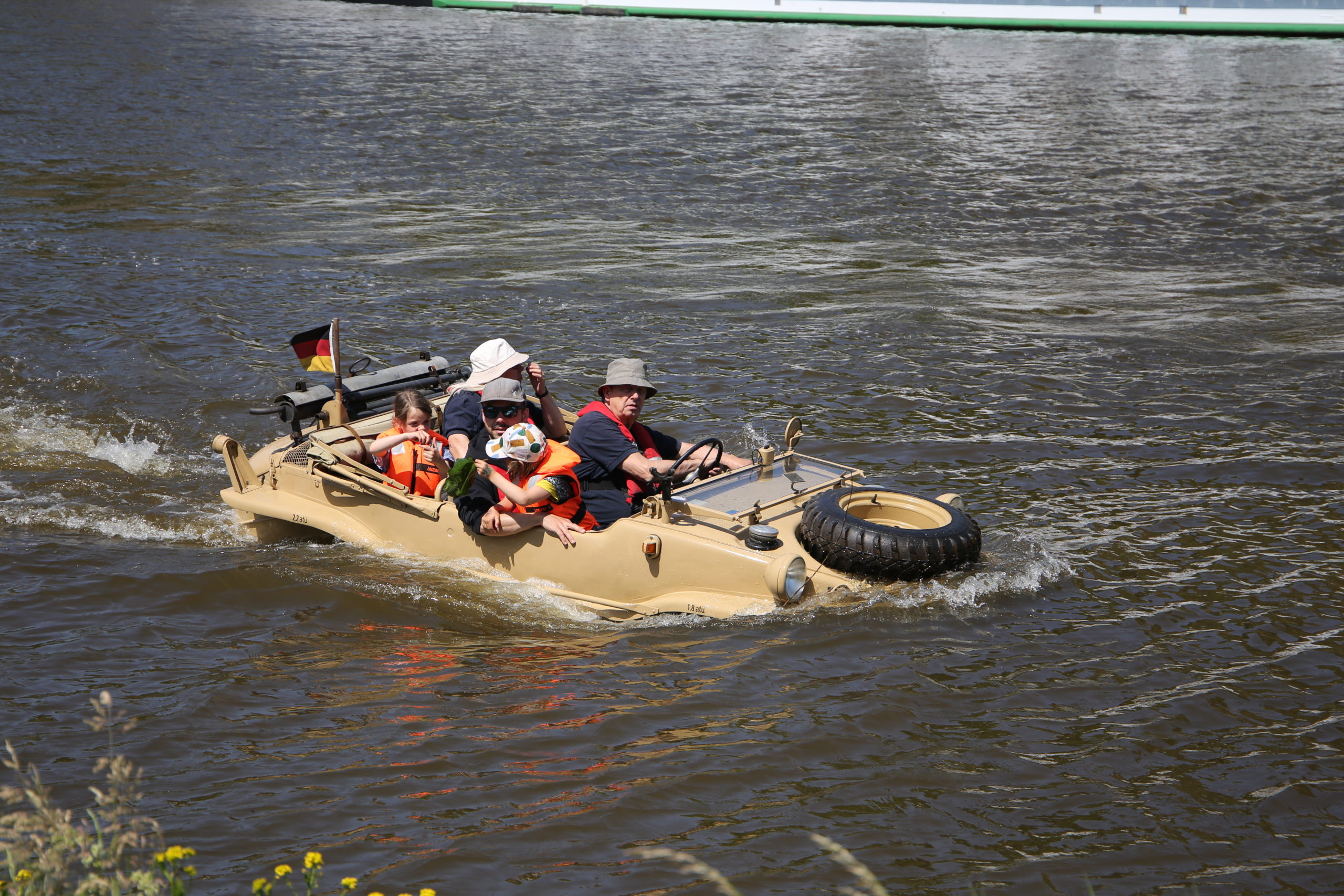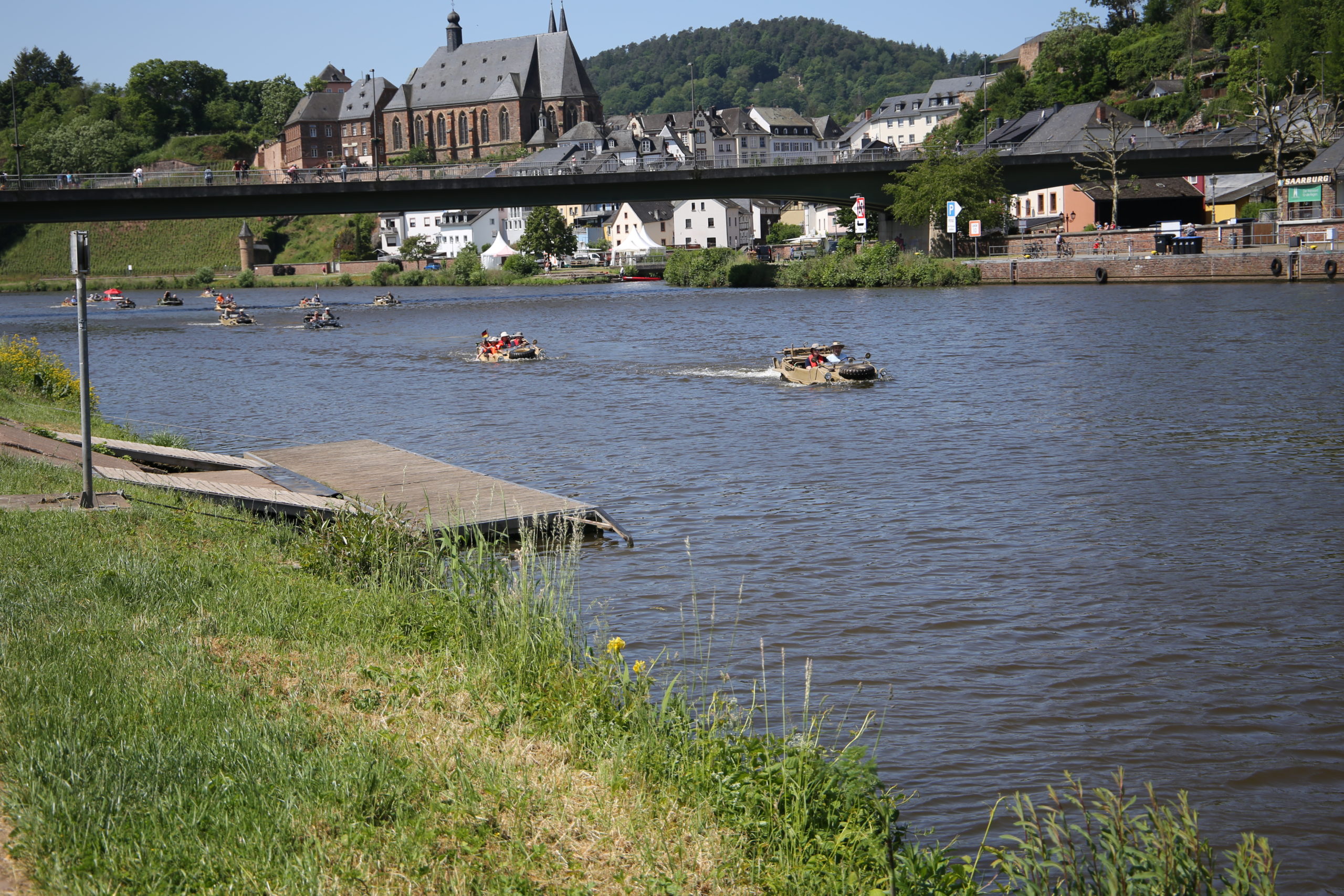 Zahlreiche Zuschauer und Radfahrer schauten dem Spektel auf der gesamten Flußstrecke. Am Mittag passierten ein Gruppe von etwa 20 Schwimmfahrzeuge die Saarbrücke am Schiffsanleger. Nach Auswässern am Jachthafen konnten viele interressierte Passanten und Radfahrer die Fahrzeuge am Parkplatz „Hotel Villa Keller“ besichtigen.