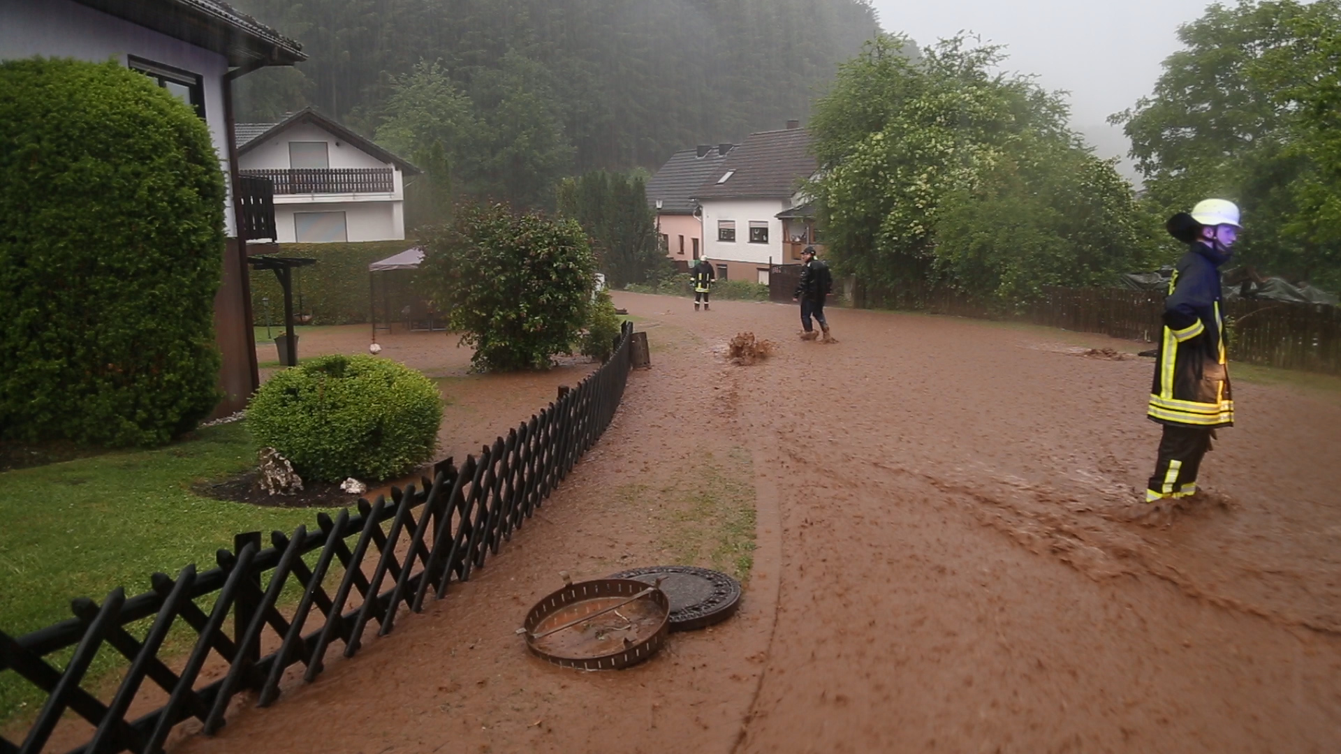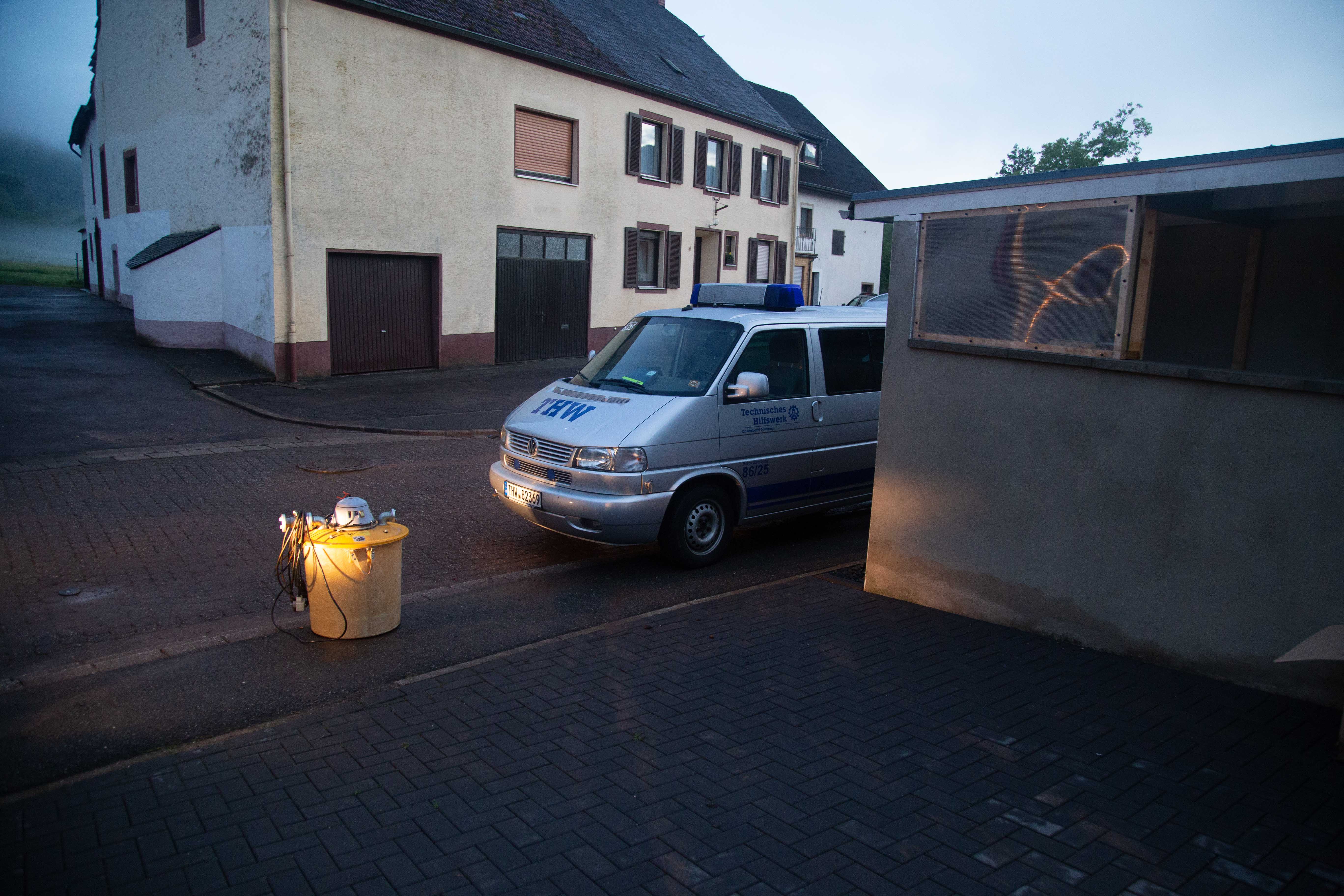 Gullydeckel wurde geöffnet und die Siebe herausgenommen. Schmutzwasserpumpen wurden mehrfach in den Anwesen installiert.