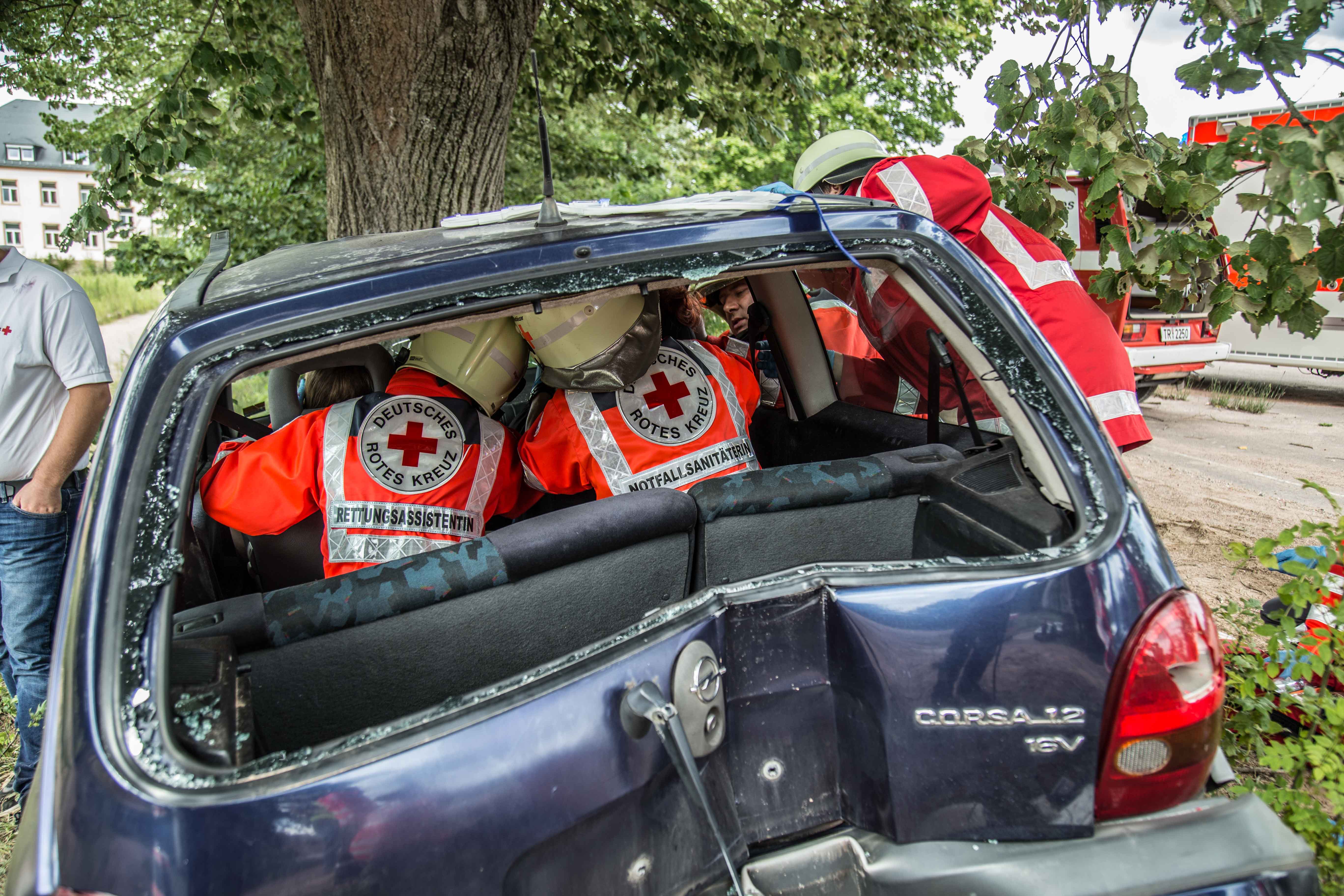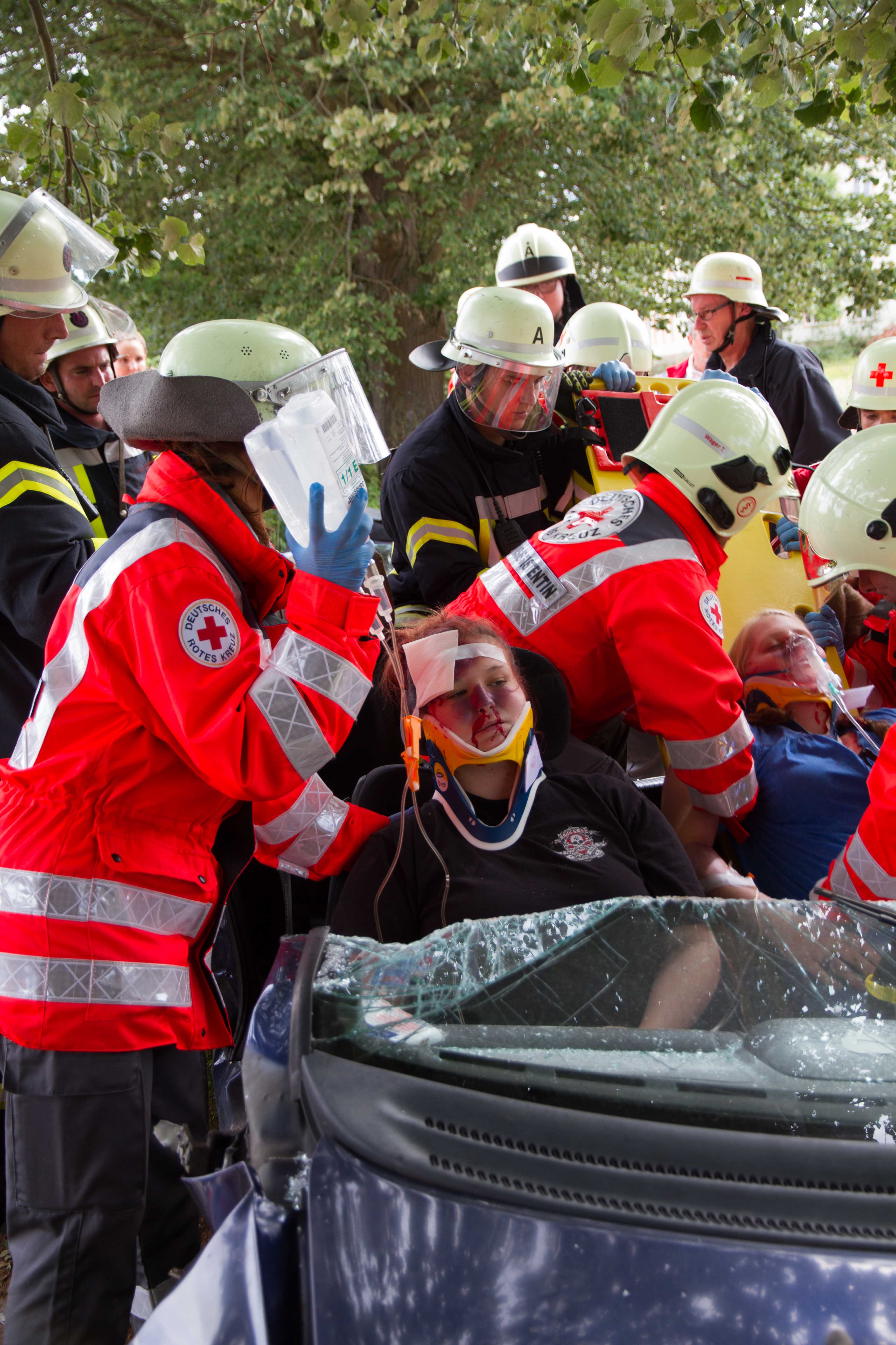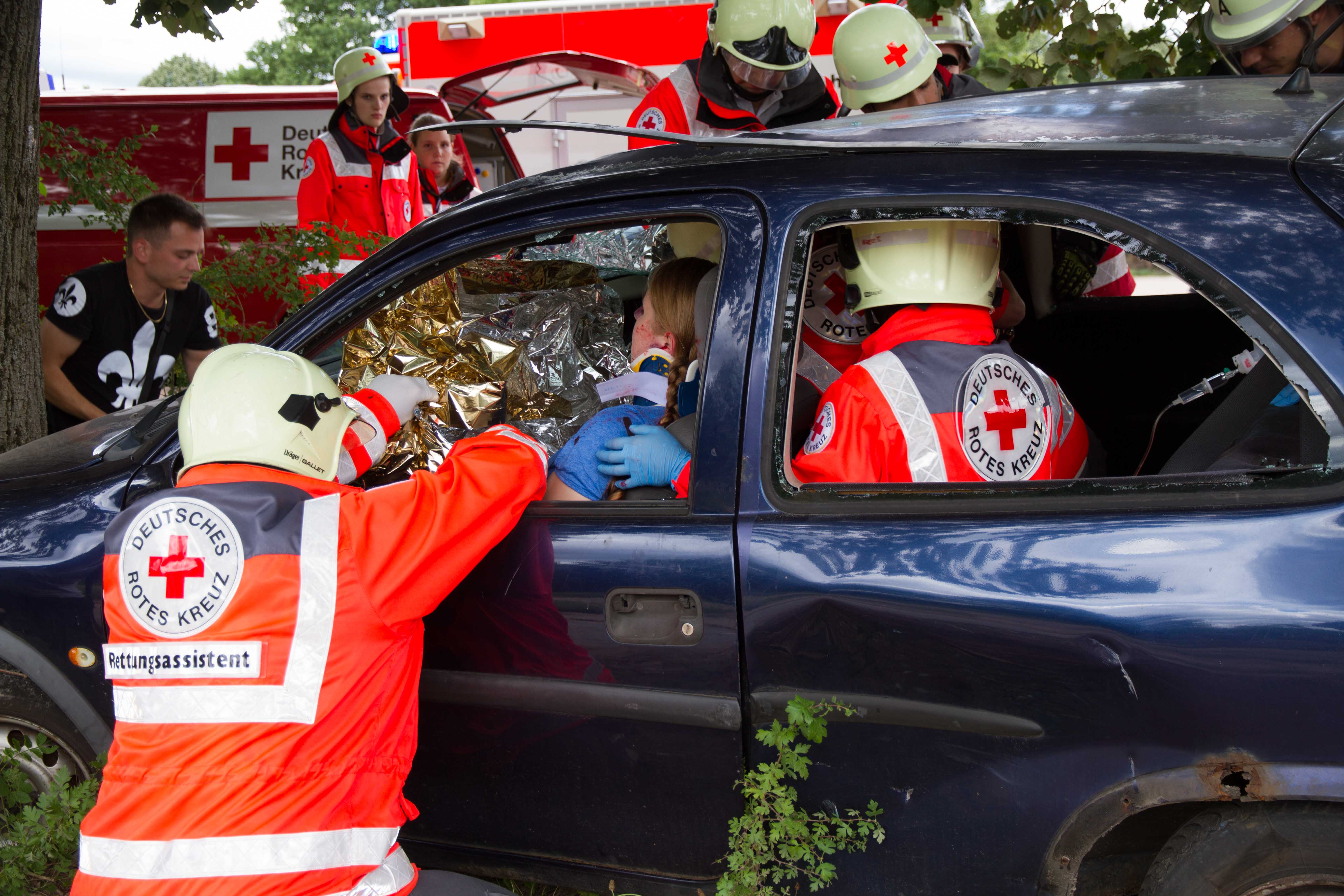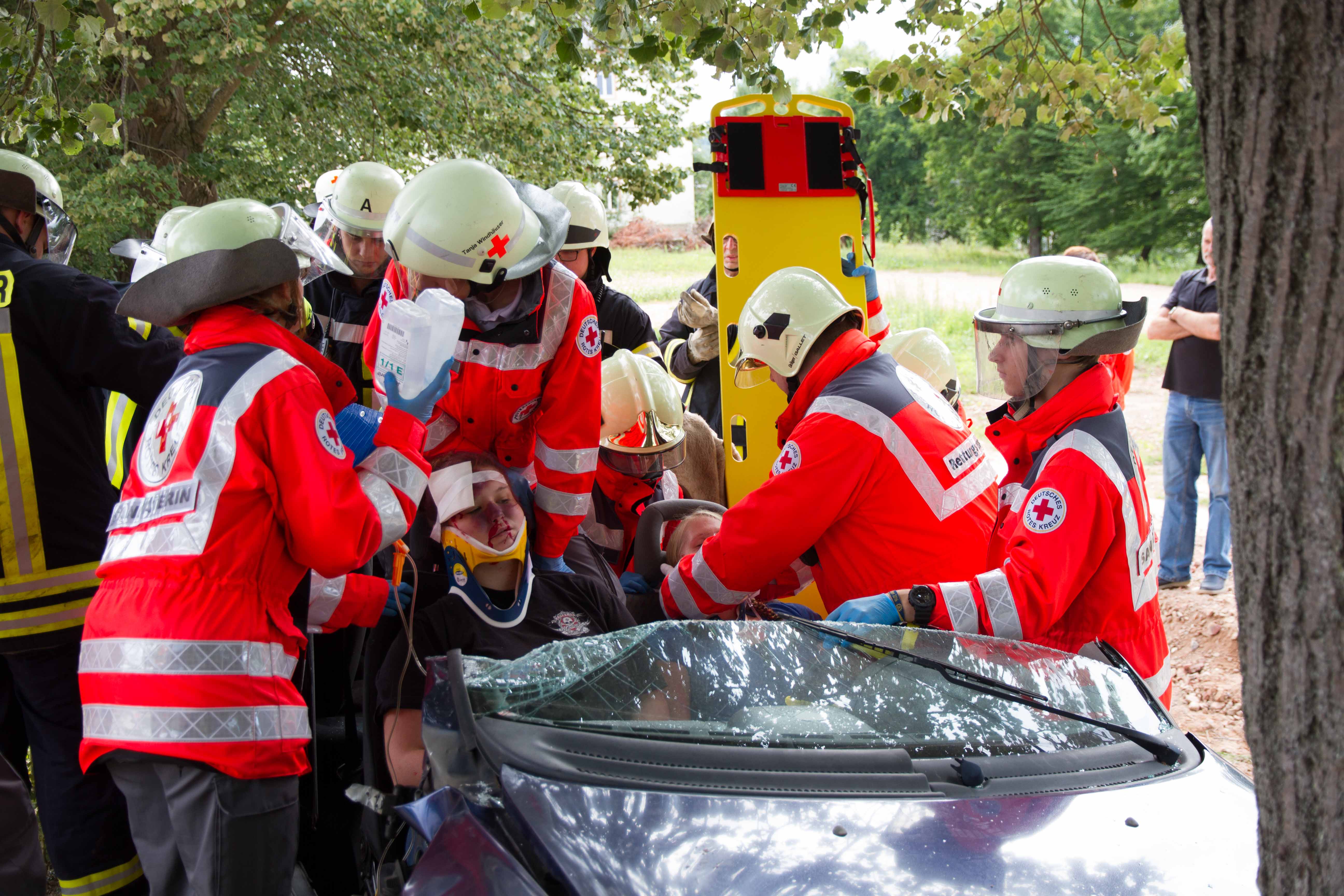 Gegen 15.00 Uhr erreichte der erste Alarm die Einsatzkräfte. Ein Verkehrsunfall mit zwei Leichtverletzten wurde über die Leitstelle-Übung gemeldet. Die ersteintreffenden Rotkreuzler stellten allerdings am Einsatzort fest, dass es sich dabei um zwei schwerstverletzte eingeklemmte Insassen handelt. Ein PKW war frontal in einen Baum gerast. Die Freiwillige Feuerwehr Beurig wurde anschließend angefordert. Die Verletzten wurden durch das medizinische Fachpersonal erstversorgt. Eine Befreiung der Opfer wurde zwischen DRK und Feuerwehr geplant. Die Feuerwehrkameraden mussten schweres Gerät einsetzen, um die Unfallopfer aus dem Wrack befreien zu können. Eine schonende Rettung wurde mittels Spineboard (Rettungsbrett) durchgeführt. Die erste Übung war nach etwa 60 Minuten beendet.