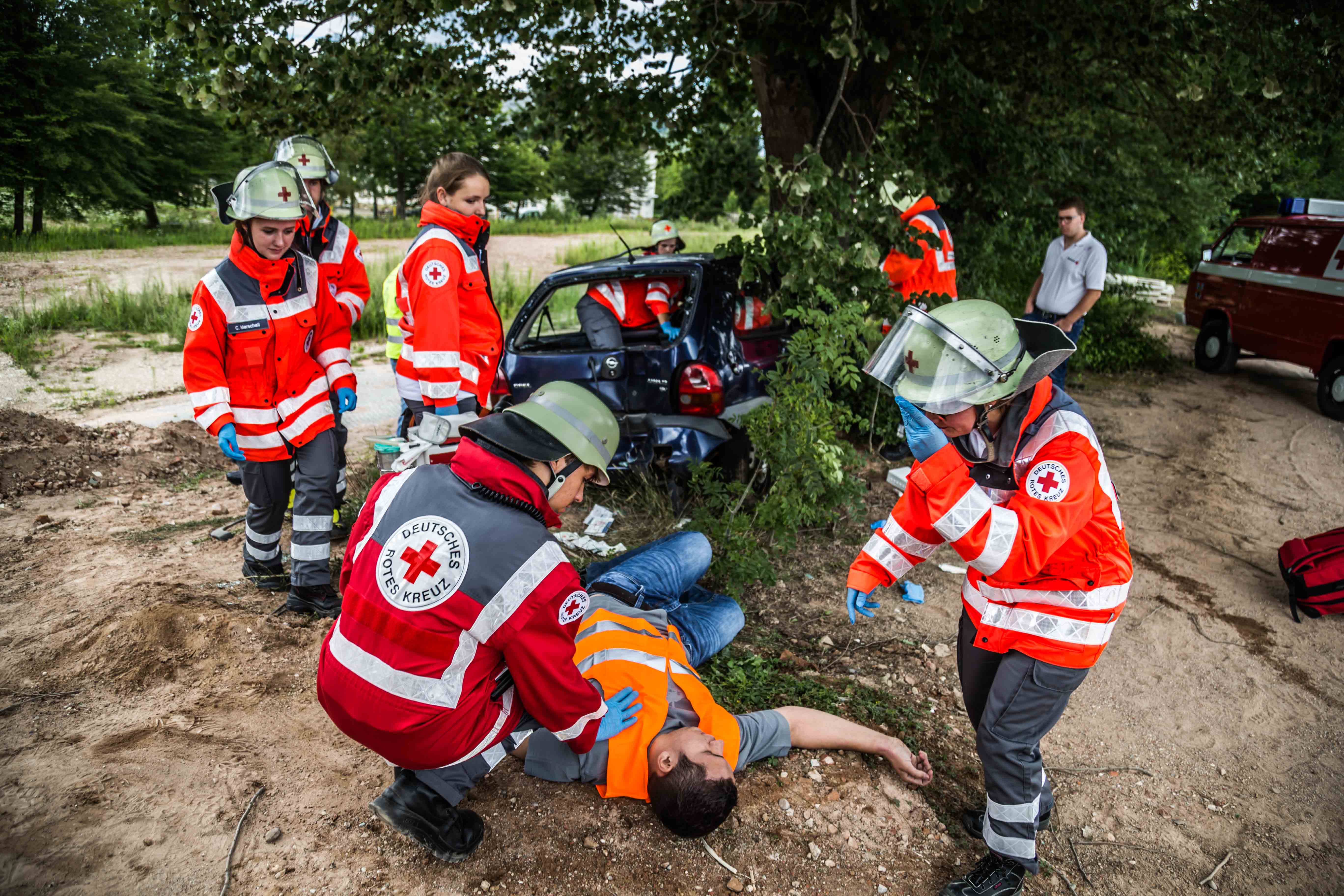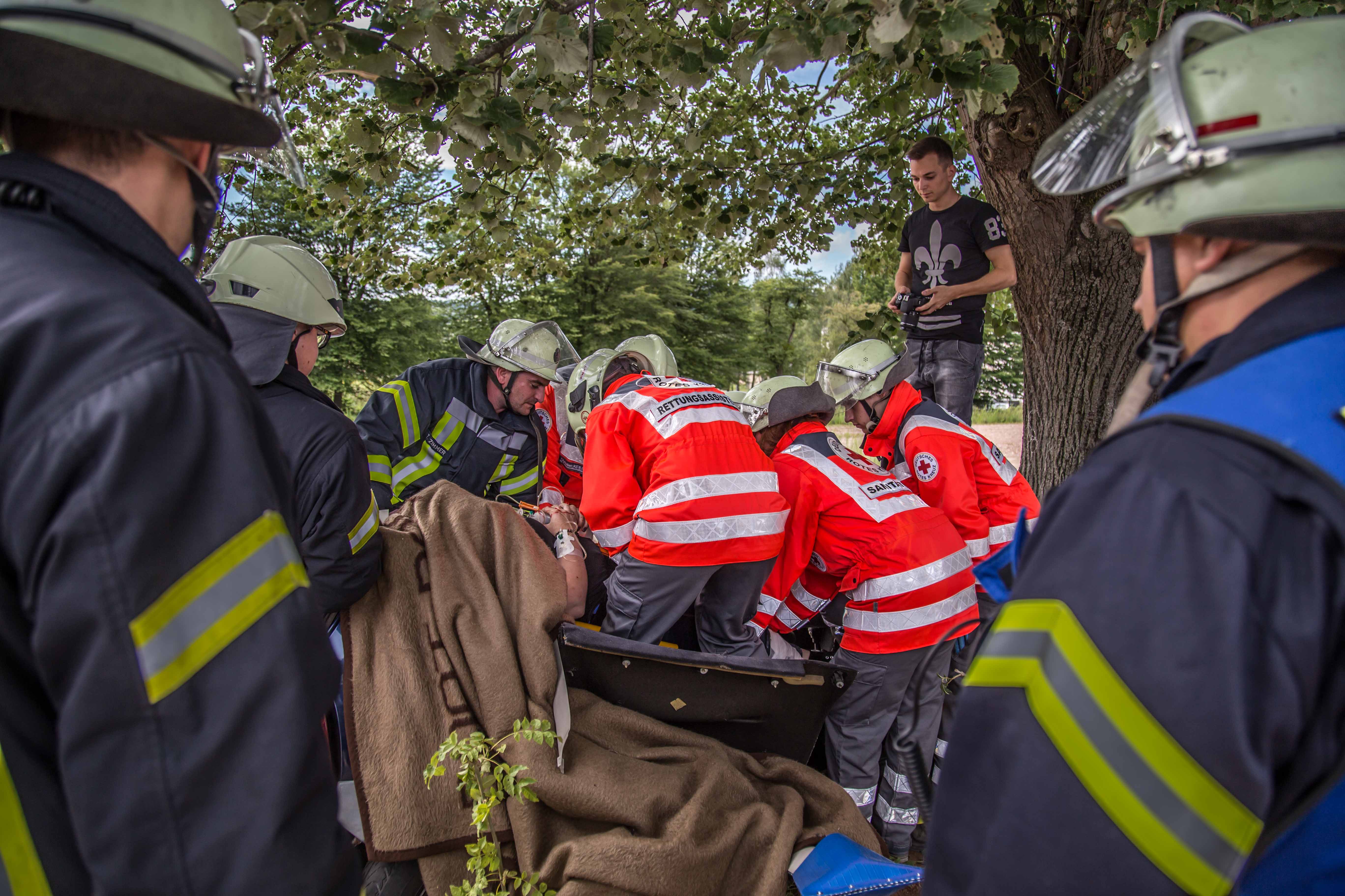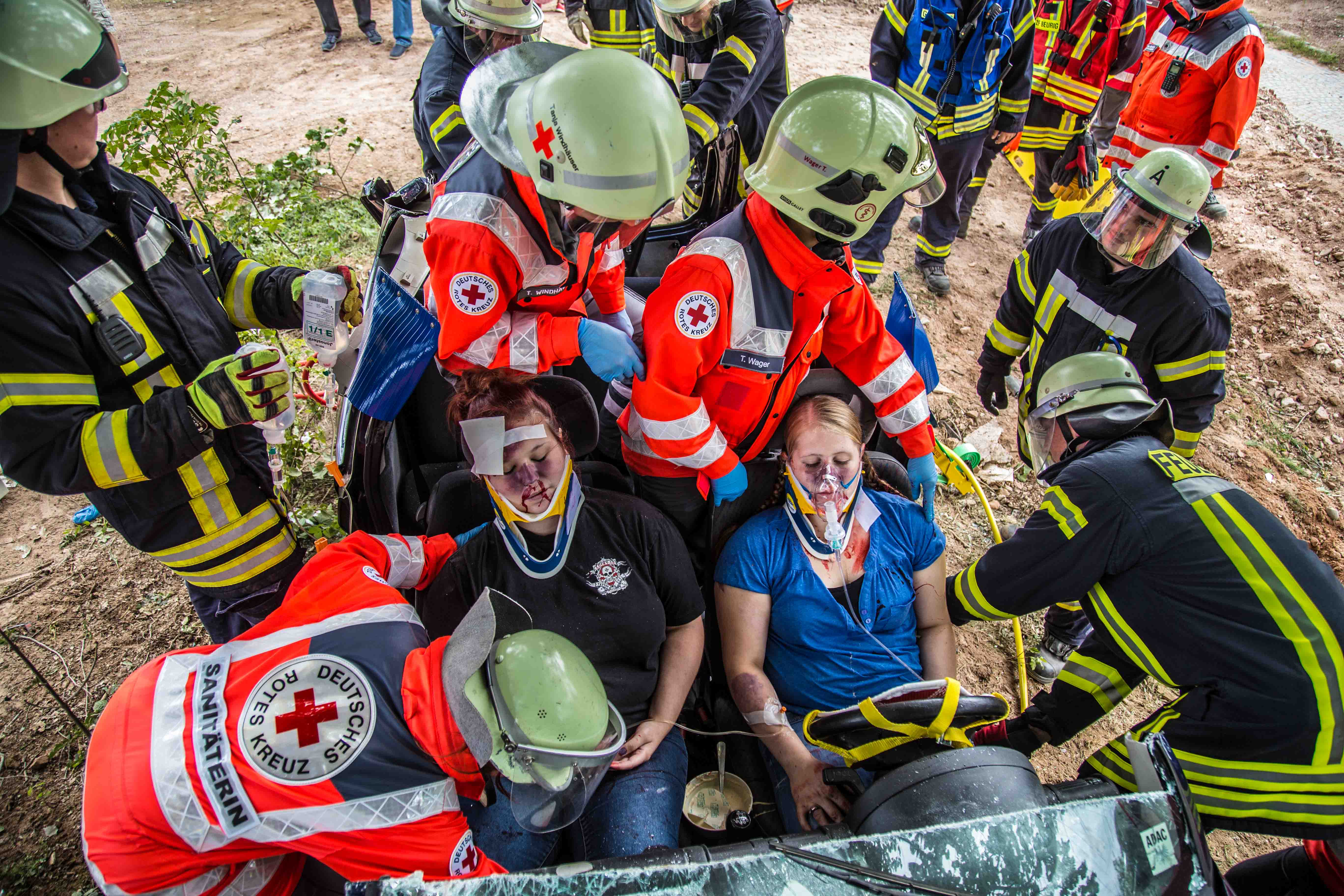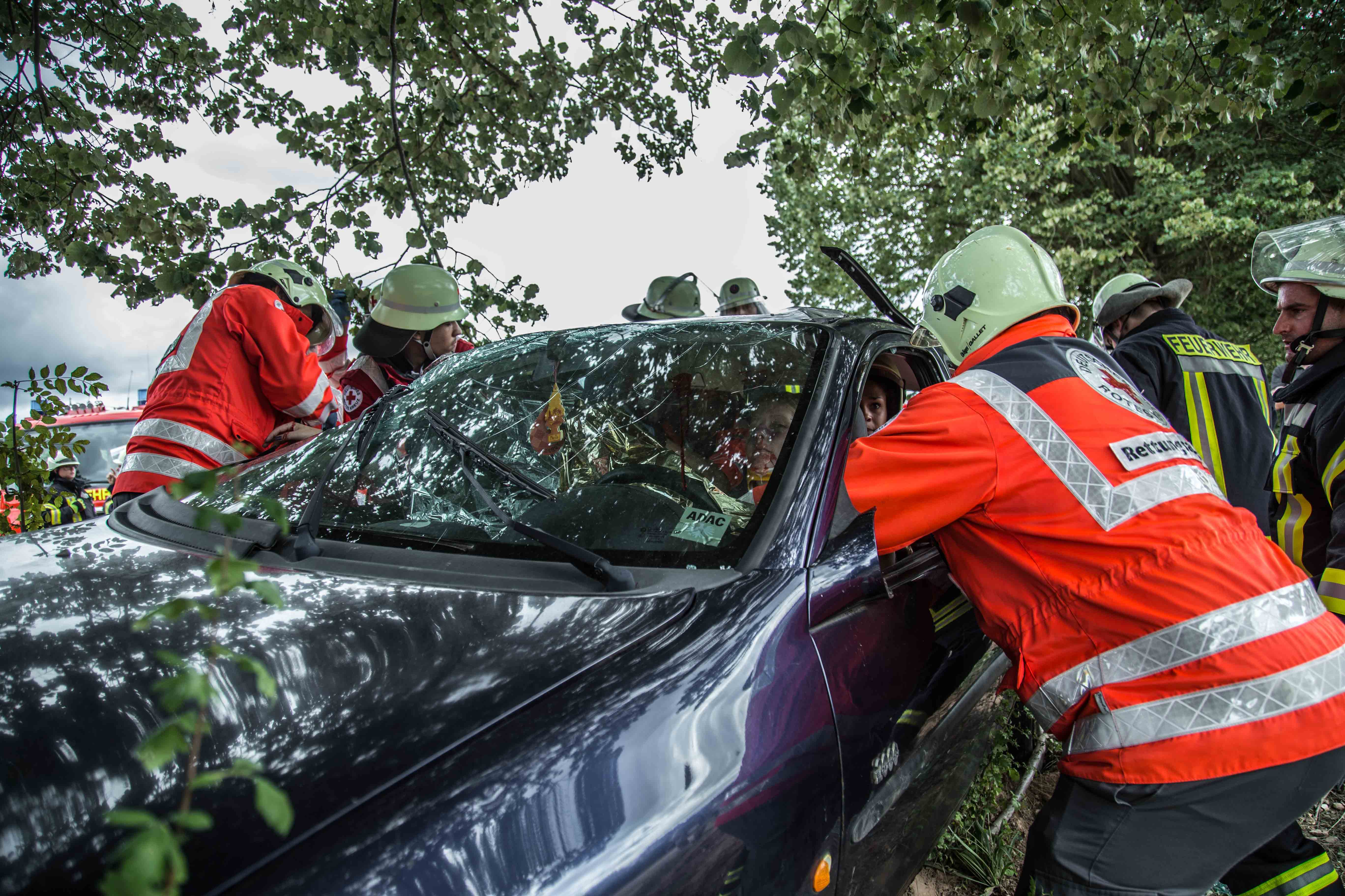 Gegen 15.00 Uhr erreichte der erste Alarm die Einsatzkräfte. Ein Verkehrsunfall mit zwei Leichtverletzten wurde über die Leitstelle-Übung gemeldet. Die ersteintreffenden Rotkreuzler stellten allerdings am Einsatzort fest, dass es sich dabei um zwei schwerstverletzte eingeklemmte Insassen handelt. Ein PKW war frontal in einen Baum gerast. Die Freiwillige Feuerwehr Beurig wurde anschließend angefordert. Die Verletzten wurden durch das medizinische Fachpersonal erstversorgt. Eine Befreiung der Opfer wurde zwischen DRK und Feuerwehr geplant. Die Feuerwehrkameraden mussten schweres Gerät einsetzen, um die Unfallopfer aus dem Wrack befreien zu können. Eine schonende Rettung wurde mittels Spineboard (Rettungsbrett) durchgeführt. Die erste Übung war nach etwa 60 Minuten beendet.