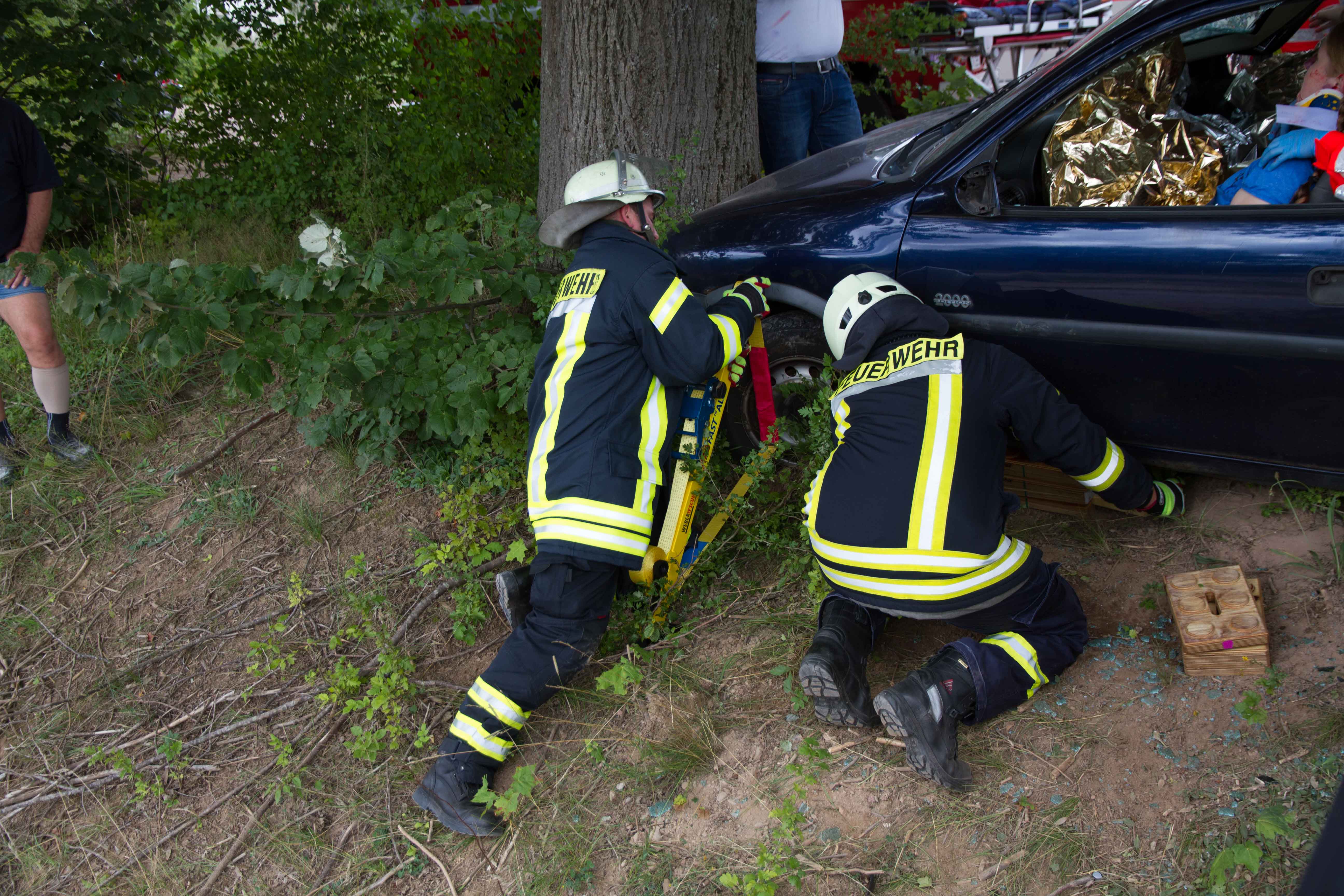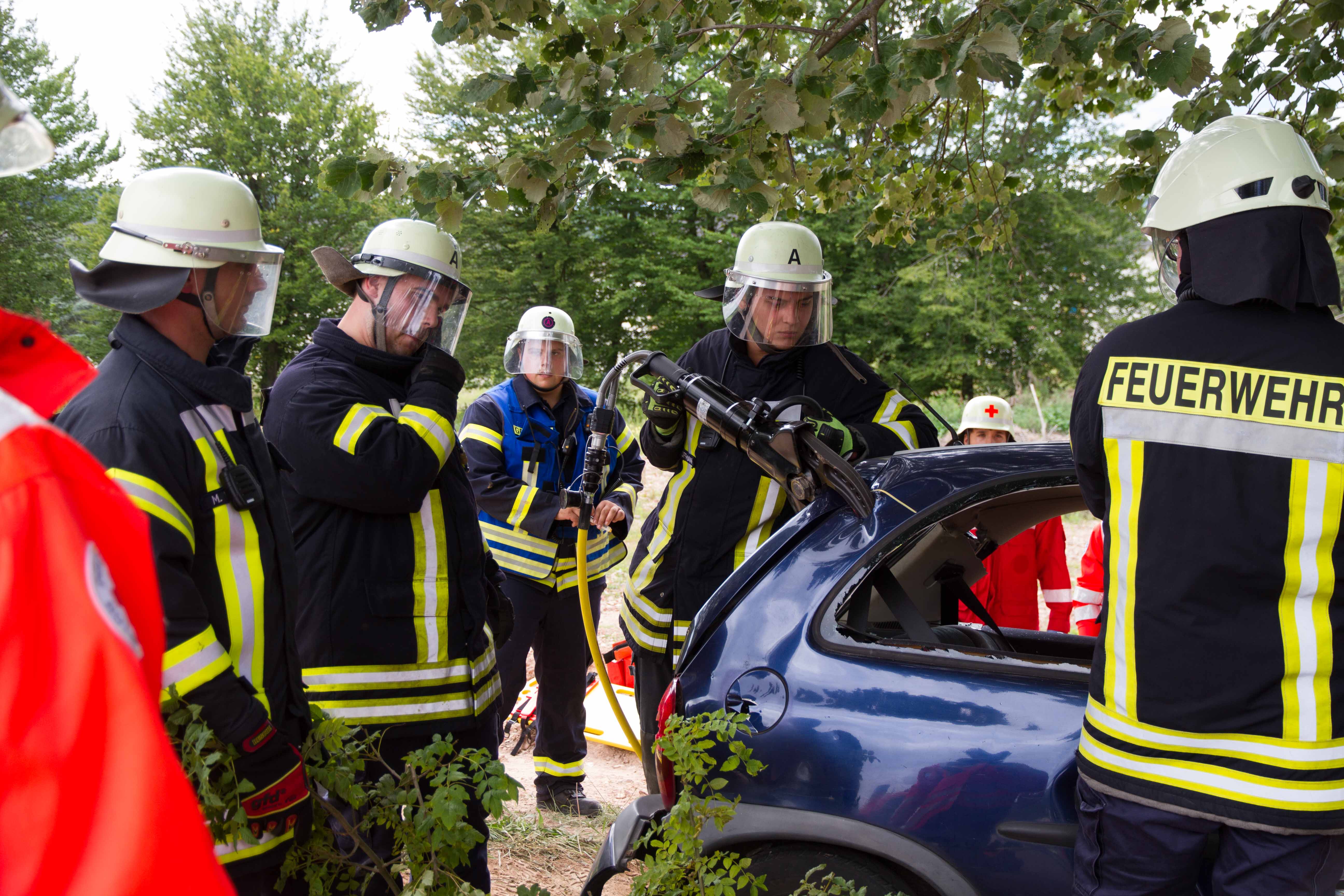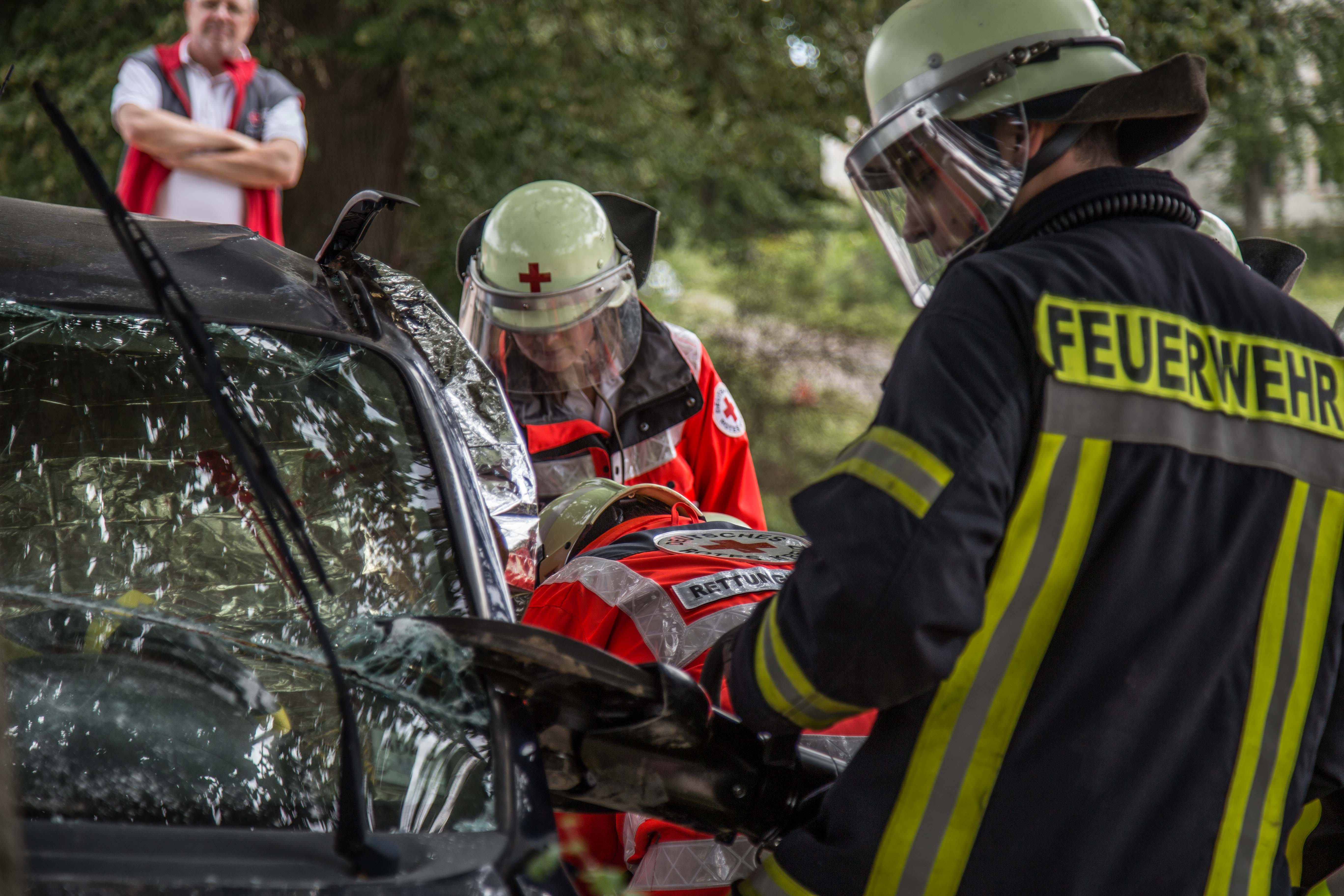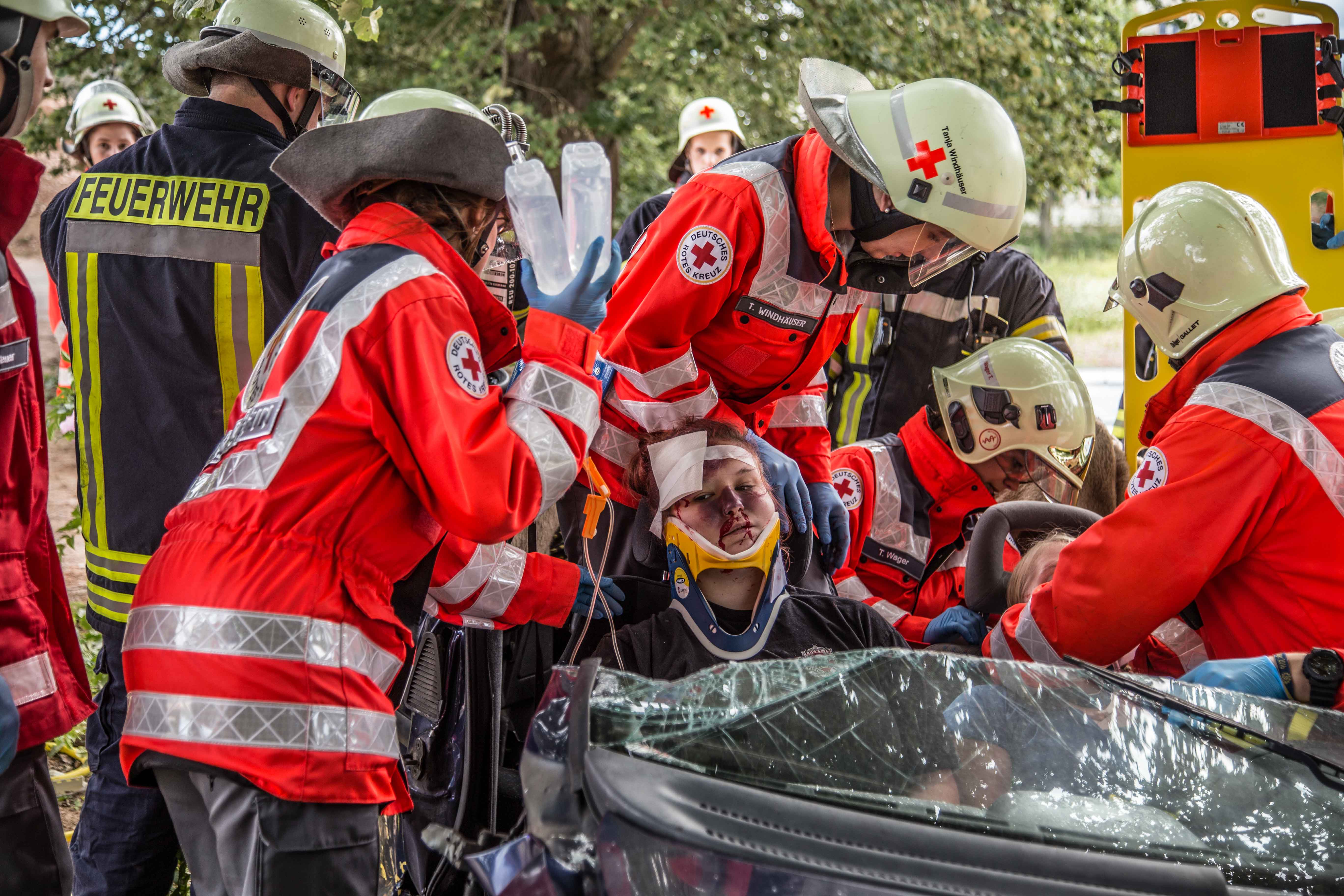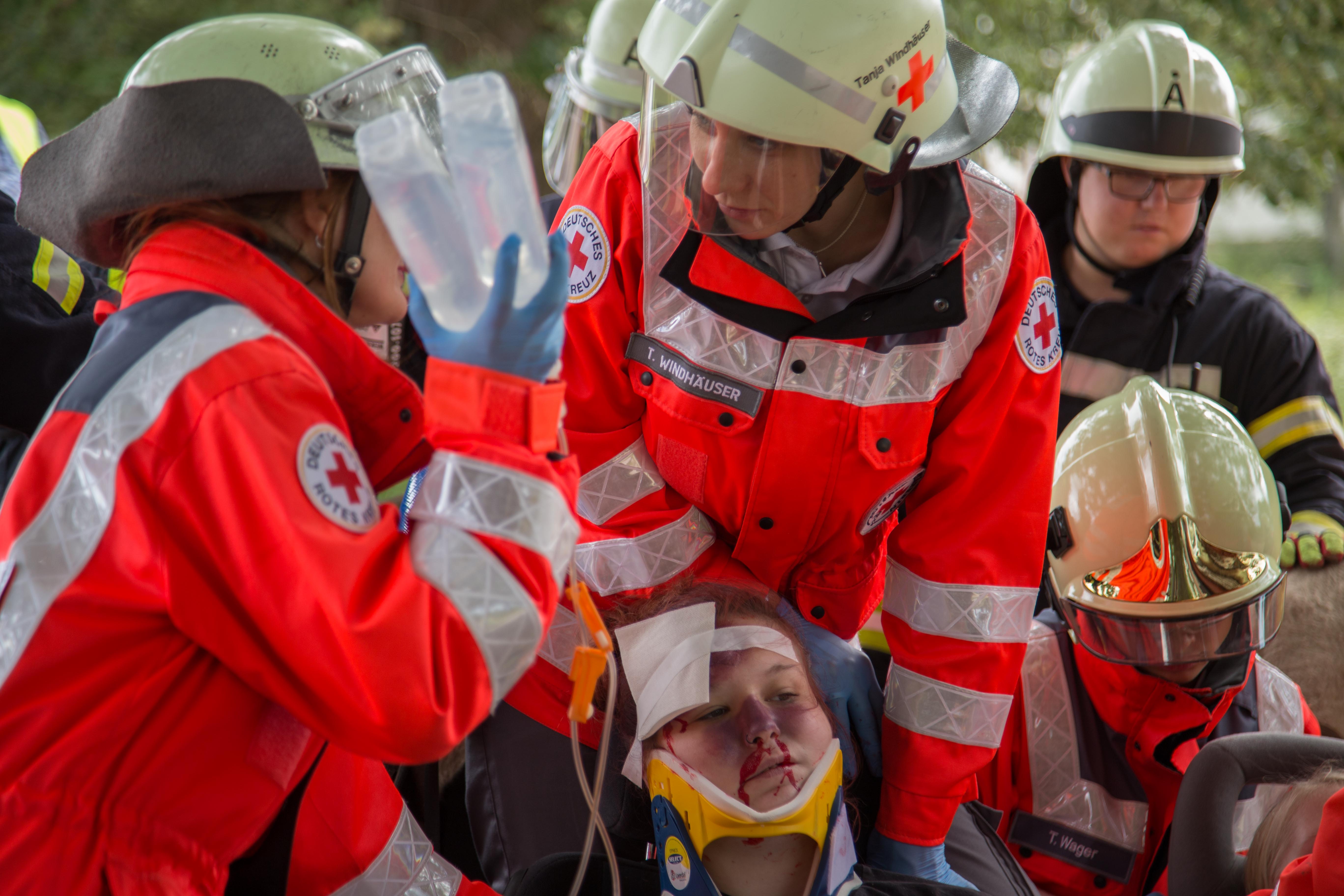 Gegen 15.00 Uhr erreichte der erste Alarm die Einsatzkräfte. Ein Verkehrsunfall mit zwei Leichtverletzten wurde über die Leitstelle-Übung gemeldet. Die ersteintreffenden Rotkreuzler stellten allerdings am Einsatzort fest, dass es sich dabei um zwei schwerstverletzte eingeklemmte Insassen handelt. Ein PKW war frontal in einen Baum gerast. Die Freiwillige Feuerwehr Beurig wurde anschließend angefordert. Die Verletzten wurden durch das medizinische Fachpersonal erstversorgt. Eine Befreiung der Opfer wurde zwischen DRK und Feuerwehr geplant. Die Feuerwehrkameraden mussten schweres Gerät einsetzen, um die Unfallopfer aus dem Wrack befreien zu können. Eine schonende Rettung wurde mittels Spineboard (Rettungsbrett) durchgeführt. Die erste Übung war nach etwa 60 Minuten beendet.