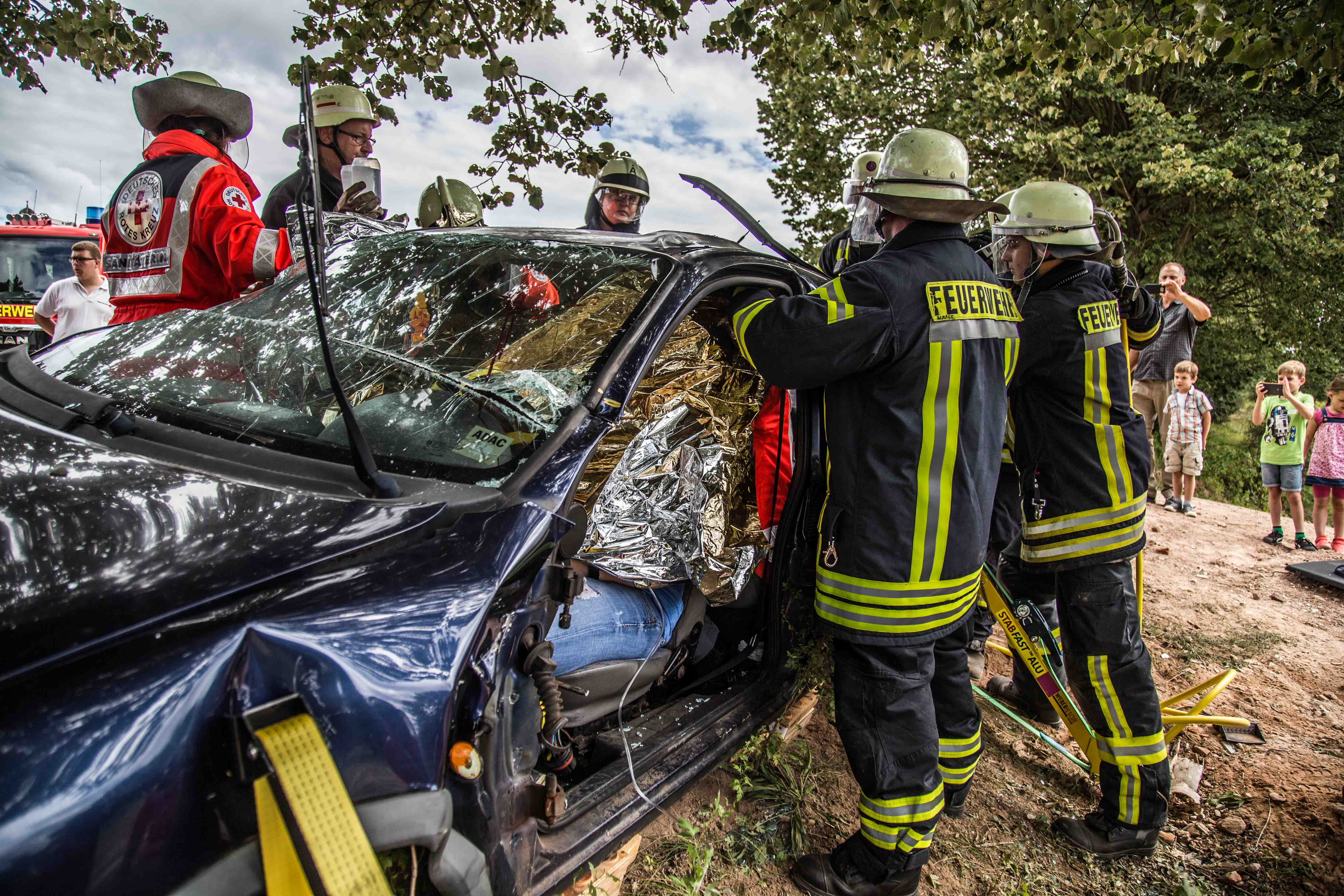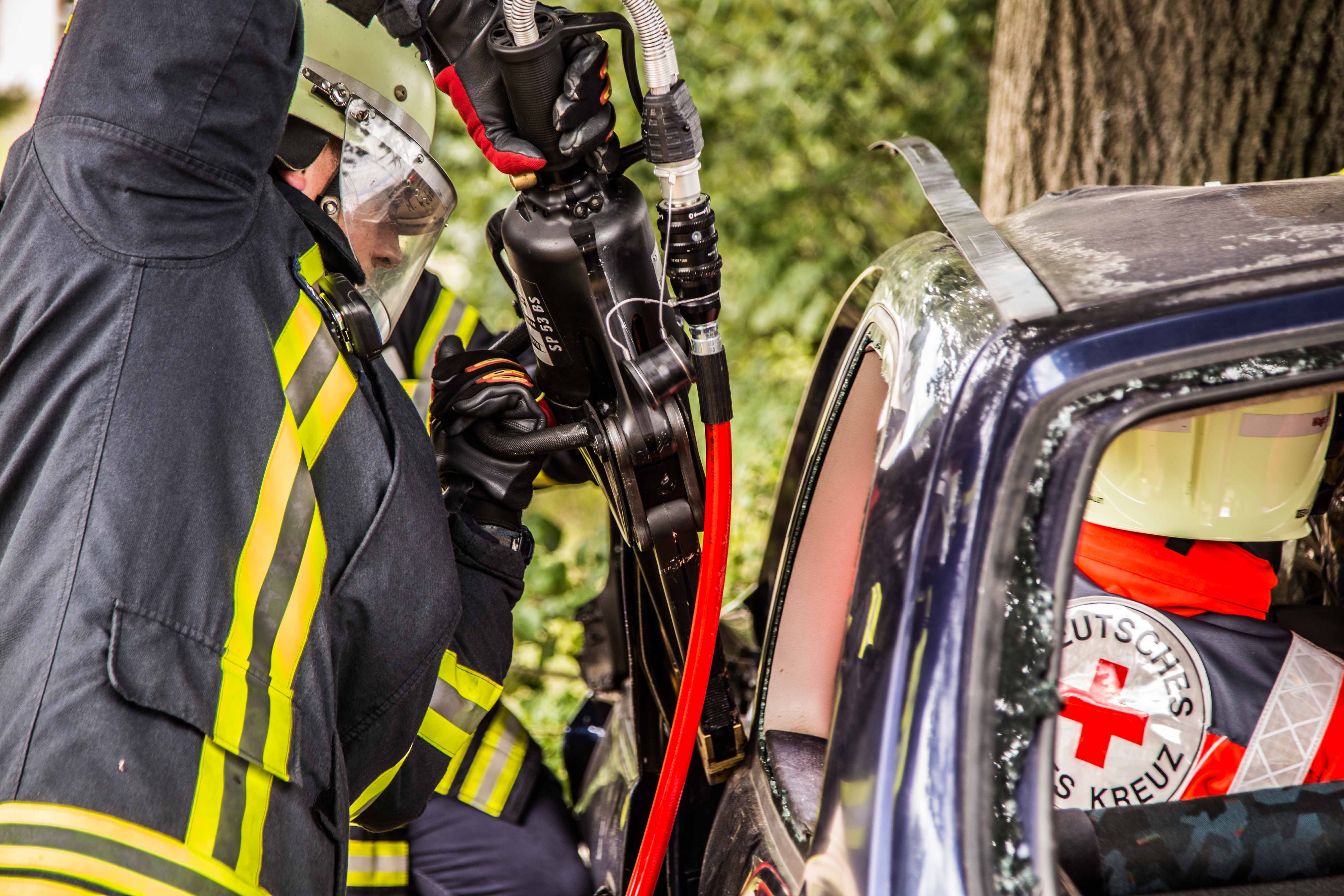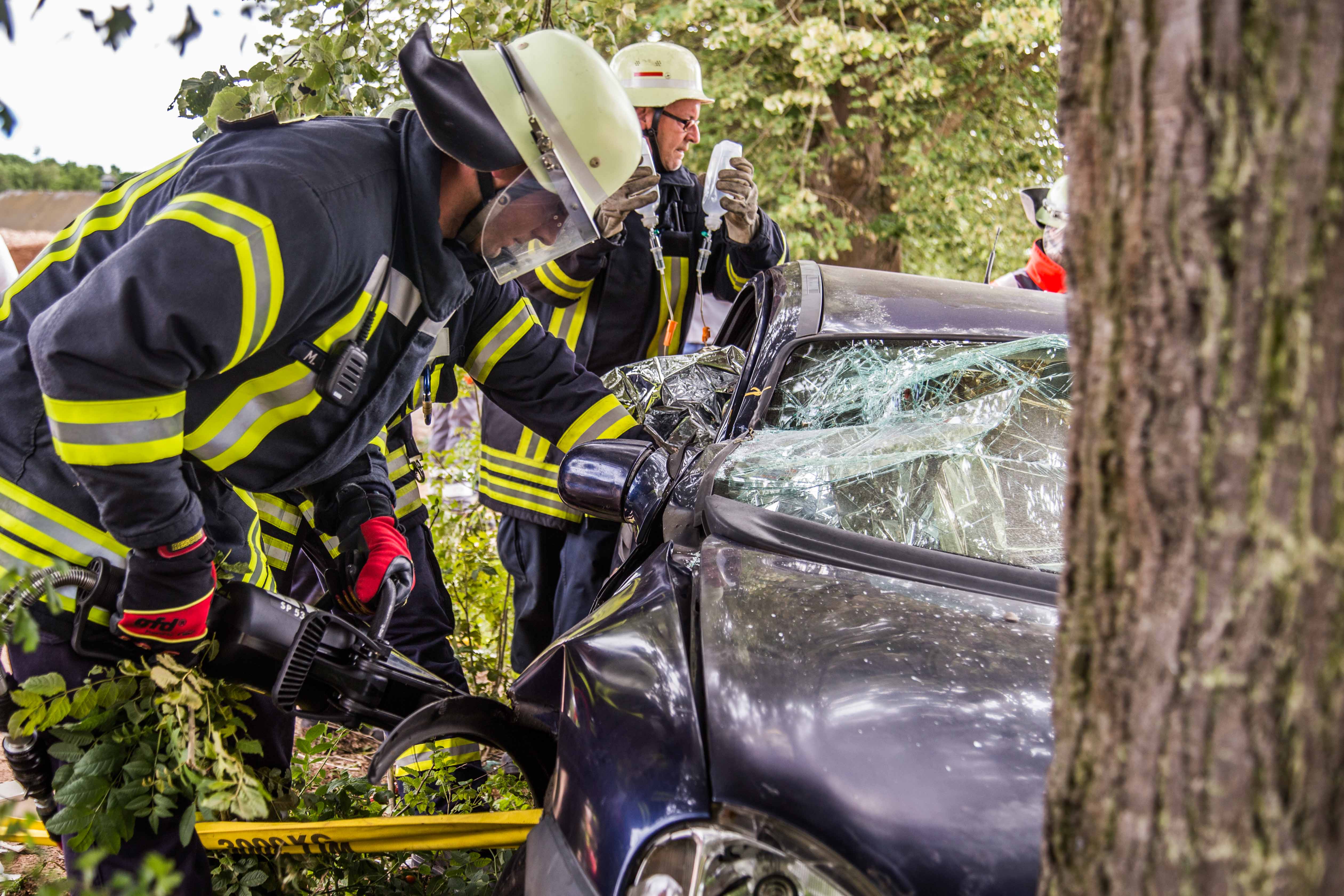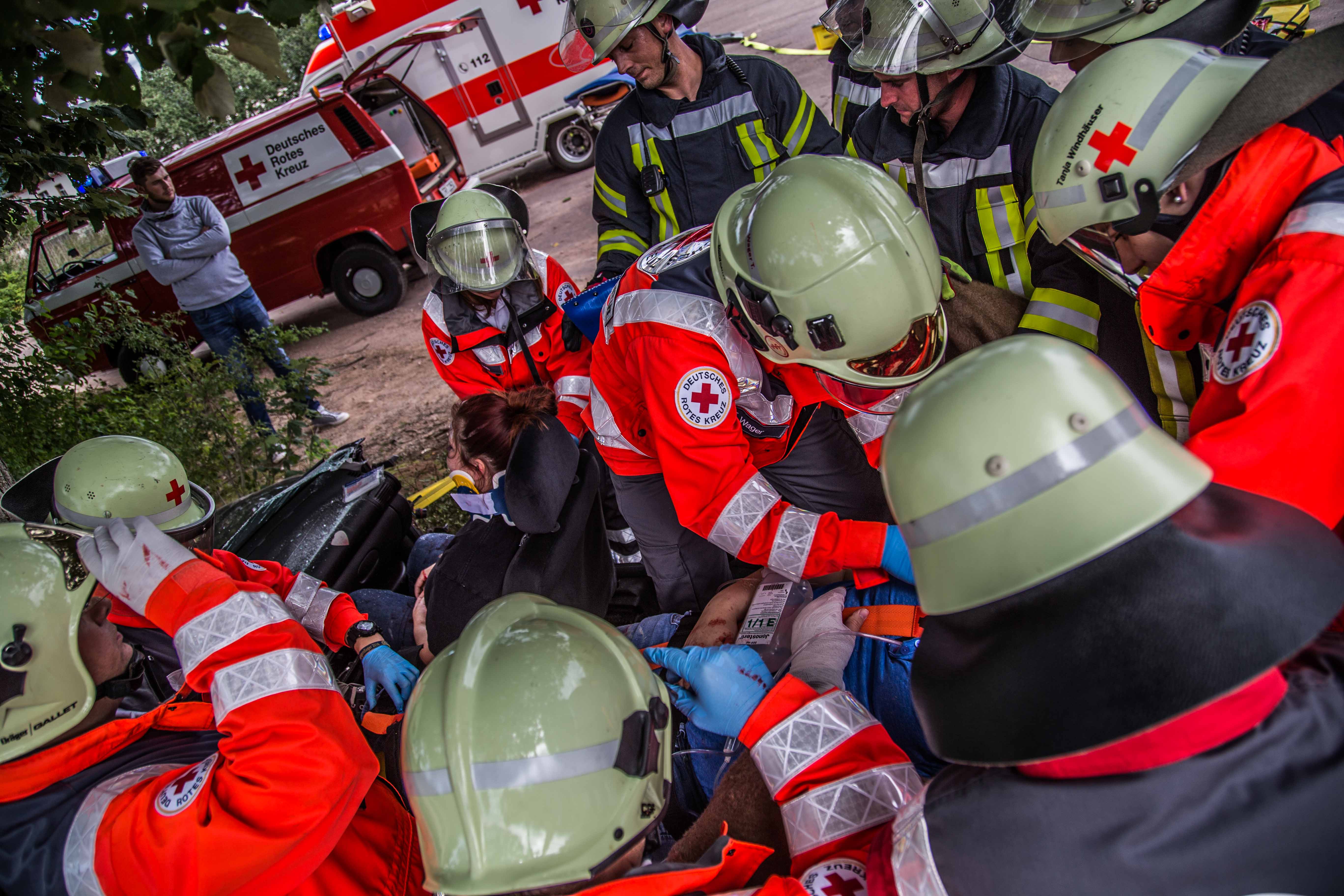 Gegen 15.00 Uhr erreichte der erste Alarm die Einsatzkräfte. Ein Verkehrsunfall mit zwei Leichtverletzten wurde über die Leitstelle-Übung gemeldet. Die ersteintreffenden Rotkreuzler stellten allerdings am Einsatzort fest, dass es sich dabei um zwei schwerstverletzte eingeklemmte Insassen handelt. Ein PKW war frontal in einen Baum gerast. Die Freiwillige Feuerwehr Beurig wurde anschließend angefordert. Die Verletzten wurden durch das medizinische Fachpersonal erstversorgt. Eine Befreiung der Opfer wurde zwischen DRK und Feuerwehr geplant. Die Feuerwehrkameraden mussten schweres Gerät einsetzen, um die Unfallopfer aus dem Wrack befreien zu können. Eine schonende Rettung wurde mittels Spineboard (Rettungsbrett) durchgeführt. Die erste Übung war nach etwa 60 Minuten beendet.
