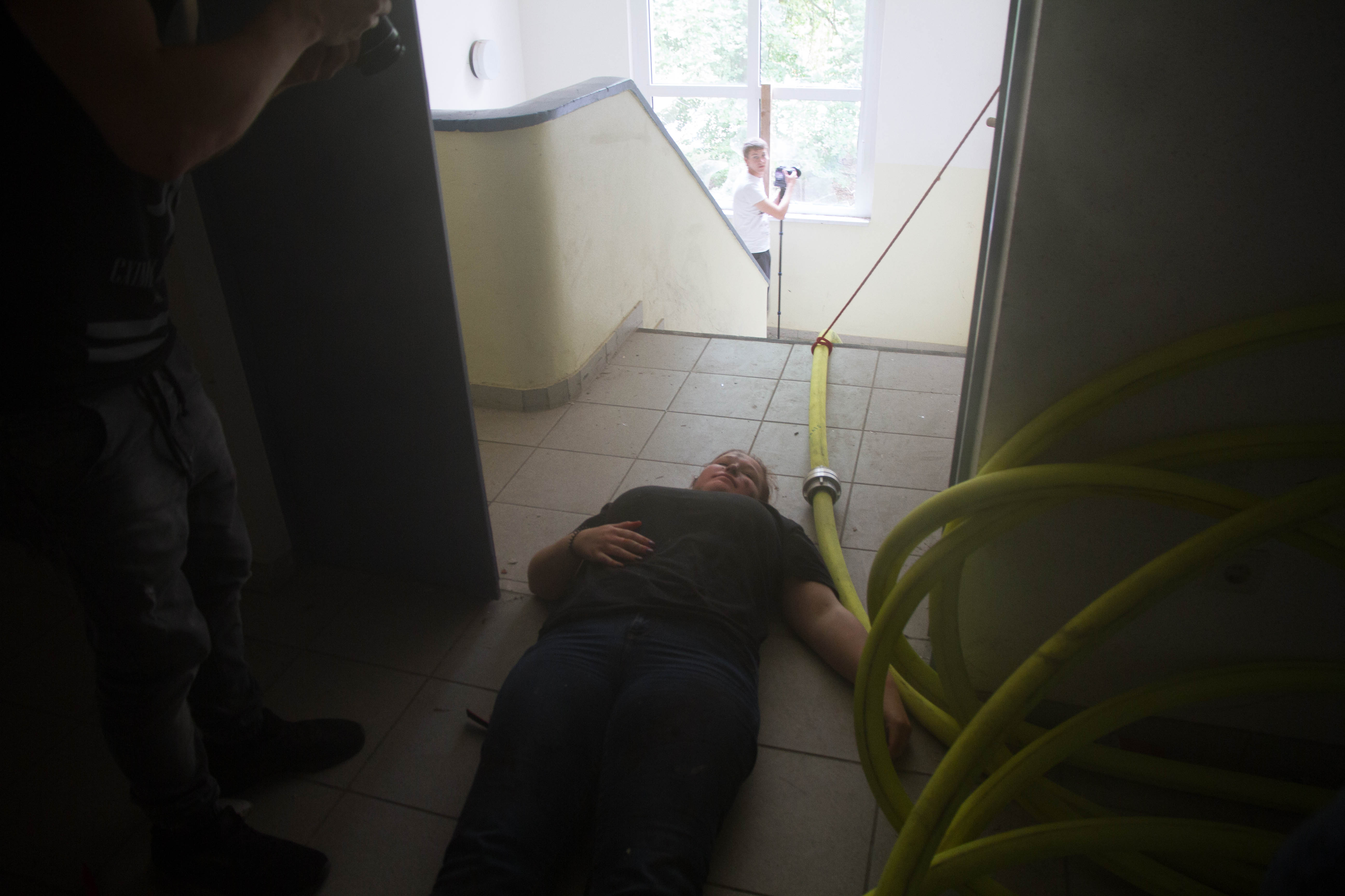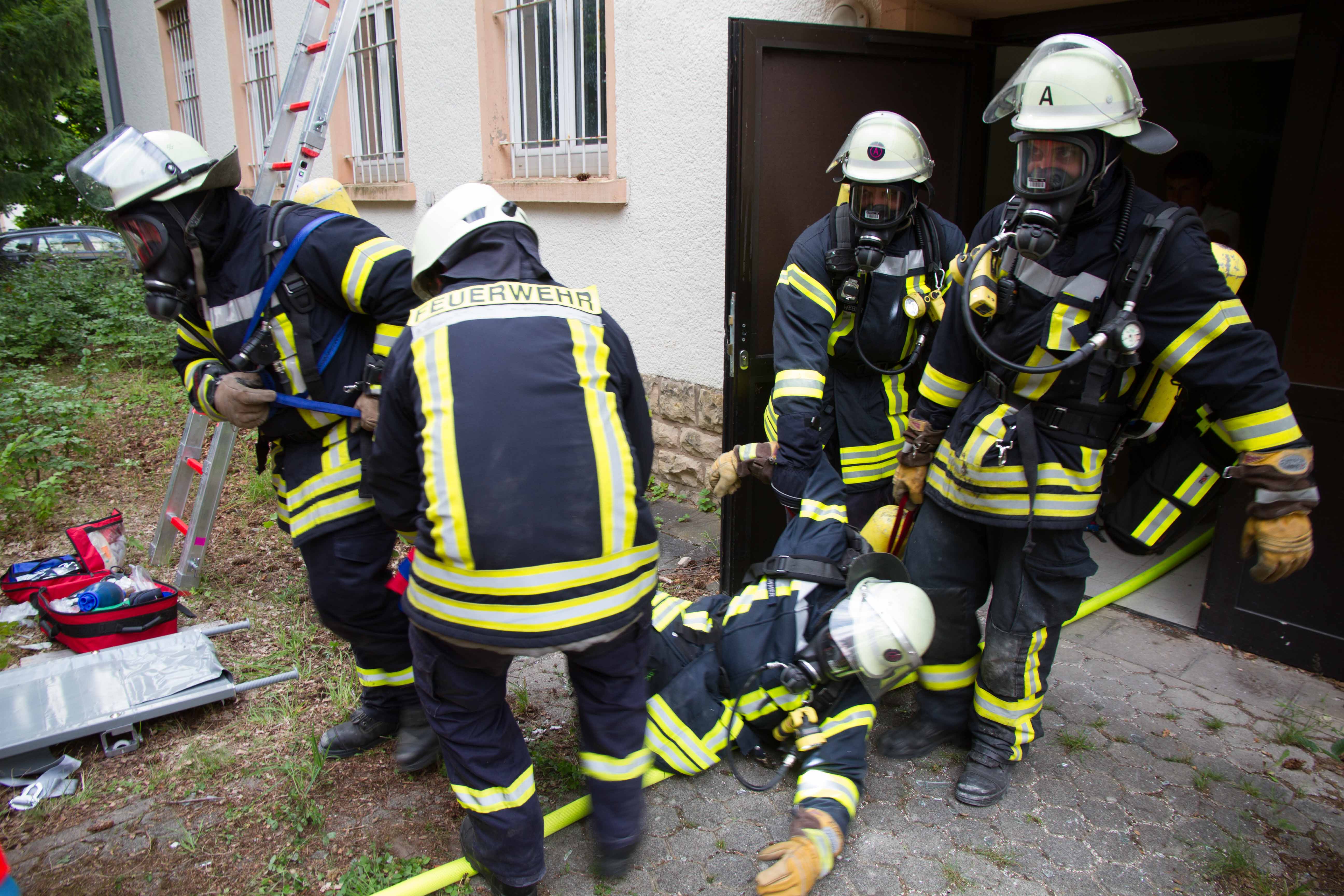 Ein zweiter Alarm erreichte gegen 17.45 Uhr die Einsatzkräfte. In einem Gebäude auf dem ehemaligen Kasernengelände kam es zu einem Zimmerbrand, mehrere Menschen wurden vermisst. Die Freiwillige Feuerwehr Beurig leitete umgehend die Menschenrettung mit Atemschutzgeräteträgern ein. Das DRK stellte währenddessen die Bereitstellung für die Feuerwehr her. Drei Personen konnten durch die Kameraden der Feuerwehr gerettet und an die Helfer des DRK übergeben werden. Ein Feuerwehrmann stürzte während den Löscharbeiten und verletzte sich leicht. Er wurde ebenfalls von seinen Kollegen an die Rotkreuzler übergeben.