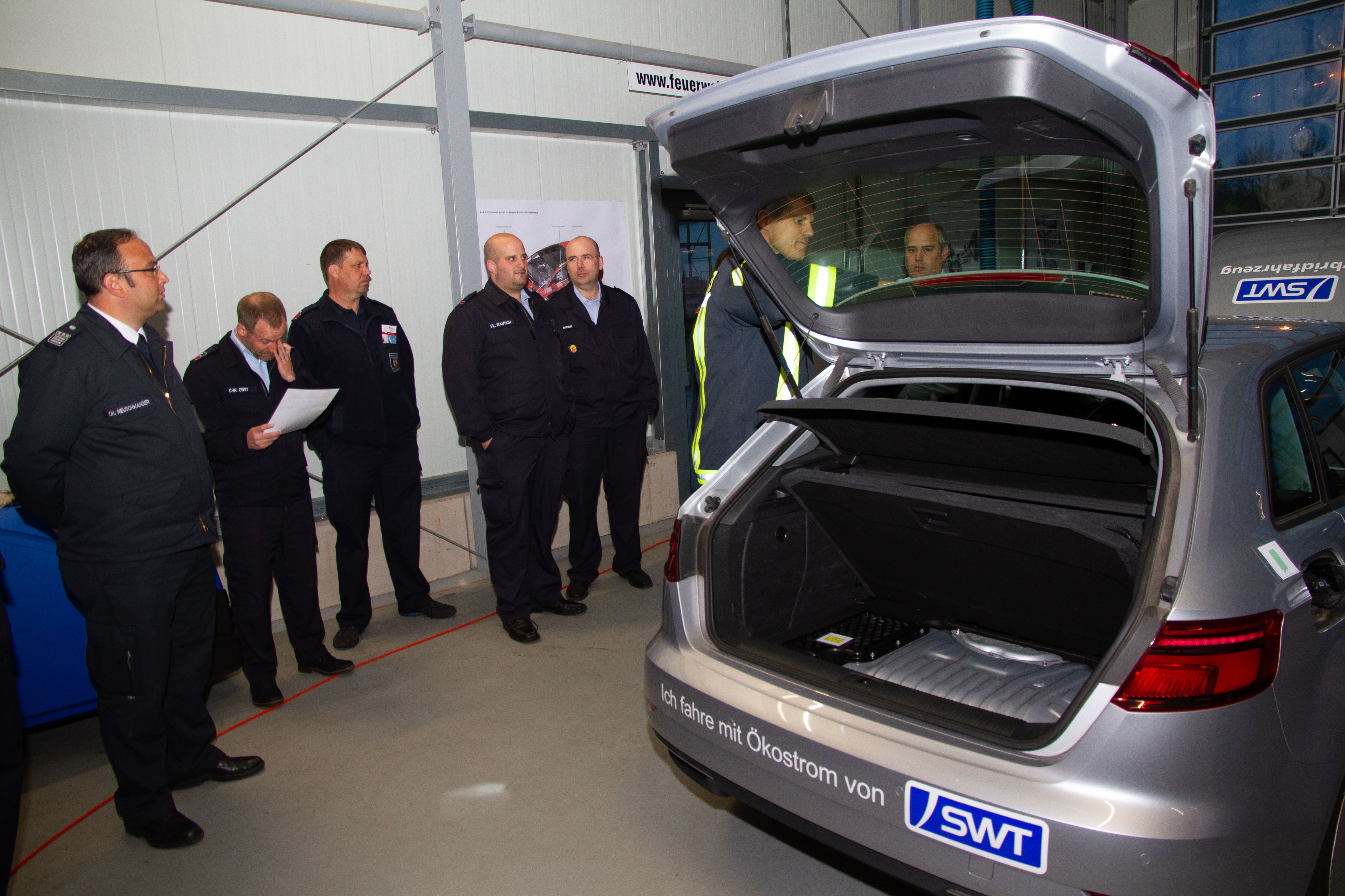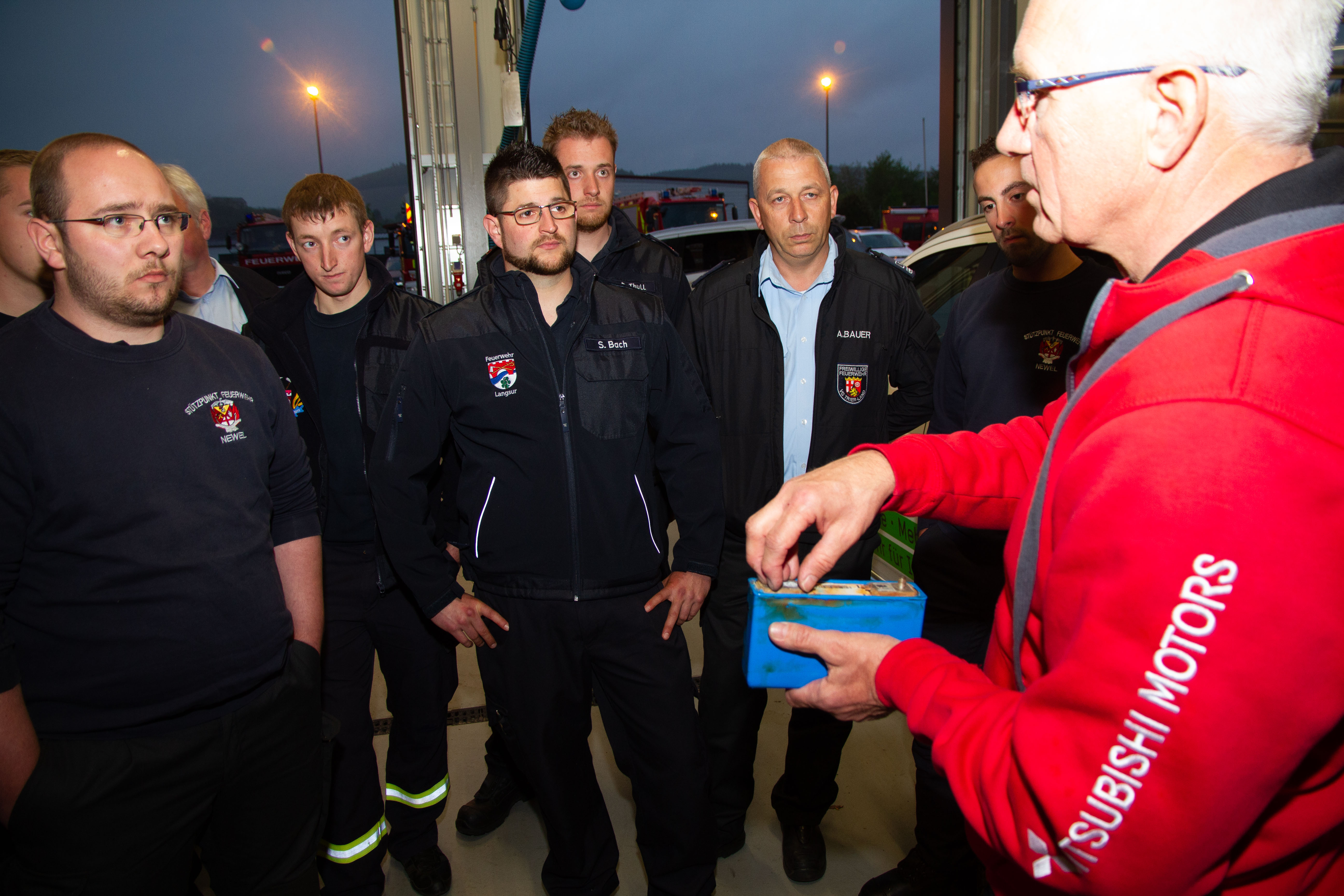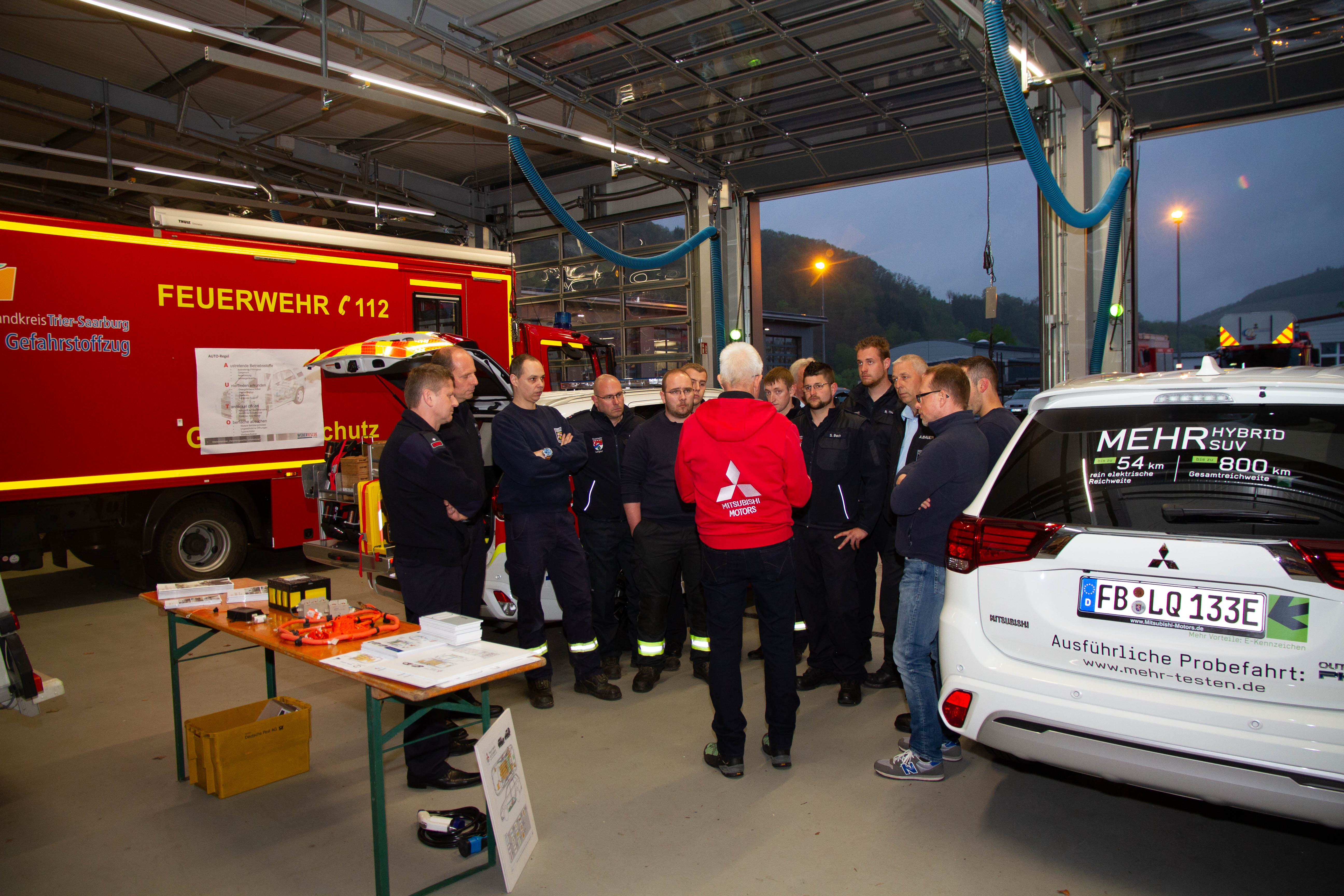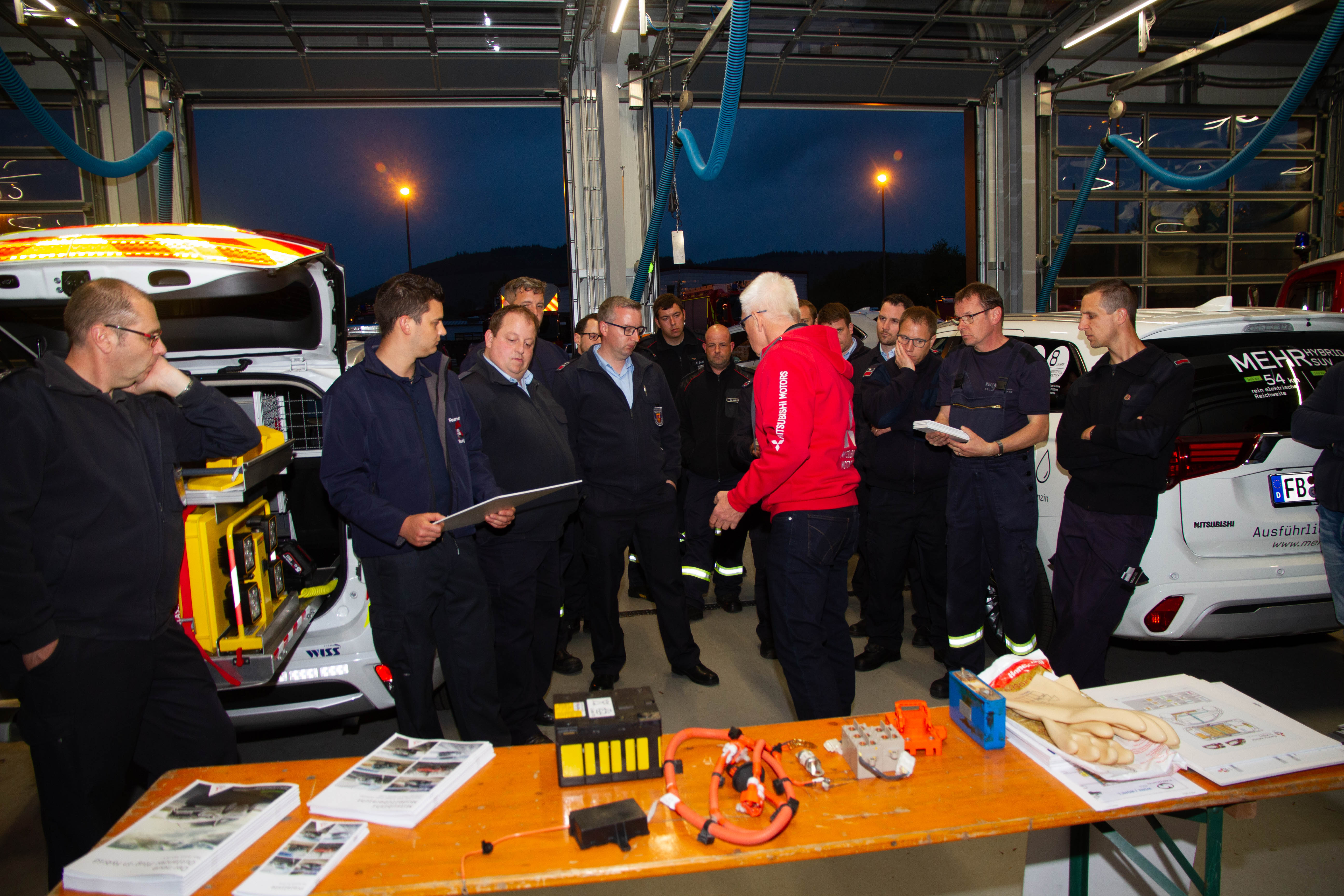 Nach den theoretischen Grundlagen der alternativen Fahrzeugtechnologien ging es in die Fahrzeughalle der Feuerwache Saarburg zu vier Stationen um die praktischen Grundlagen an den neuen Fahrzeugen kennen zu lernen. An zwei mitgebrachten E-Mobilen (SUV) von Mitsubishi Motors sowie von Flüssiggas- und Erdgasfahrzeugen nebst Elektro und Hybrid Fahrzeugen (Stadtwerke Trier) konnten die Teilnehmer die theoretischen Informationen an den Fahrzeugen erkunden und mit Rettungskarten die Gefahrenschwerpunkte an den Fahrzeugen veranschaulichen.   Resümee der Veranstaltung war: Man muss keine Angst, sondern Respekt beim Umgang von neuen elektrotechnischen Fahrzeugen haben.