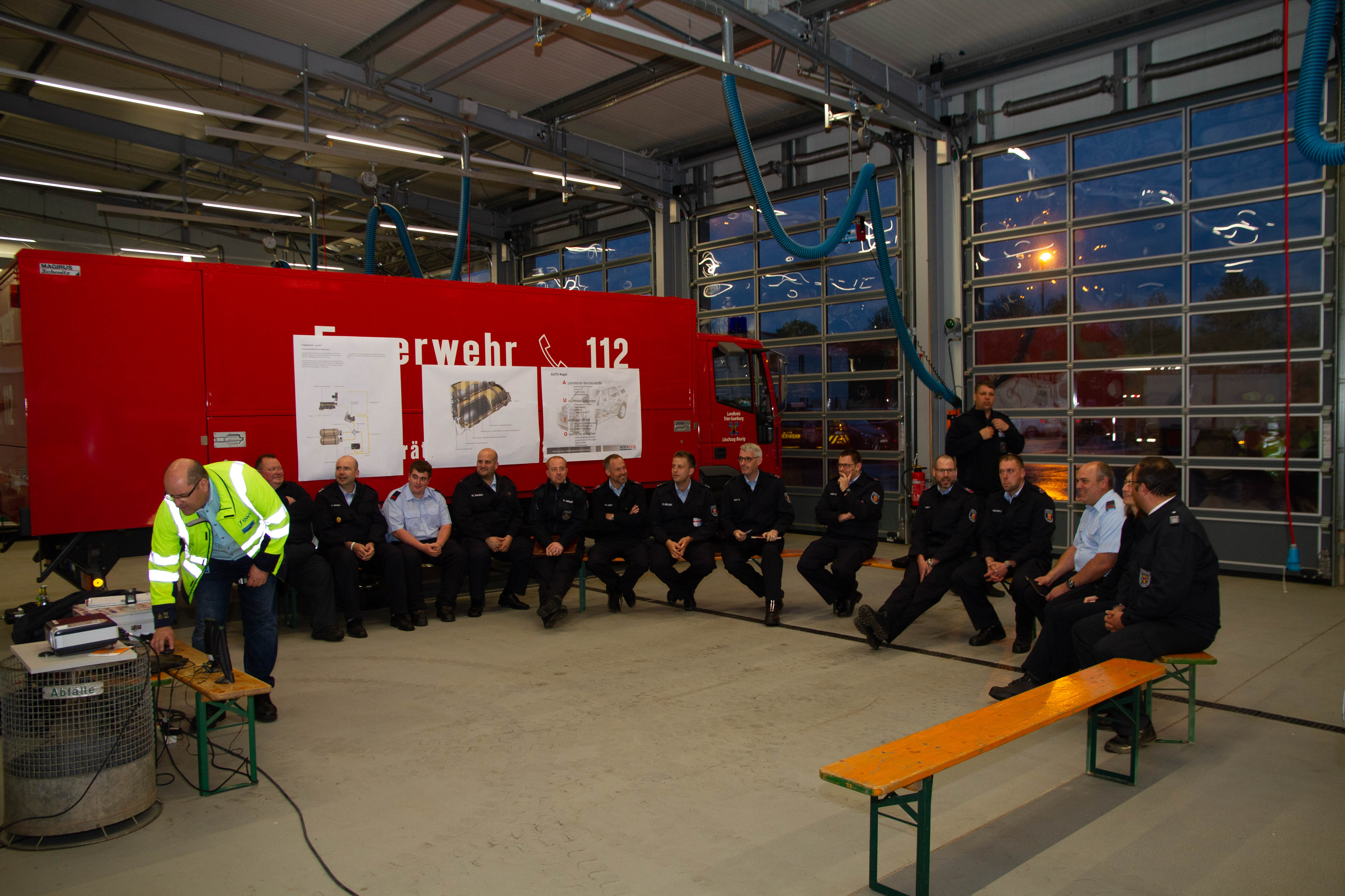 Zunächst traf man sich im Schulungsraum der Feuerwache Saarburg mit den Organisatoren und Referenten. Sie erklärten zunächst einige Grundbegriffe zur Verständniserlangung der Wirkung und Gefahren des elektrischen Stromes, über Sicherheitsmaßnahmen sowie über einige wichtige Bauteile; wie Energiespeicher und Ladesysteme mit denen die Feuerwehr im Einsatz Probleme bekommen könnte.