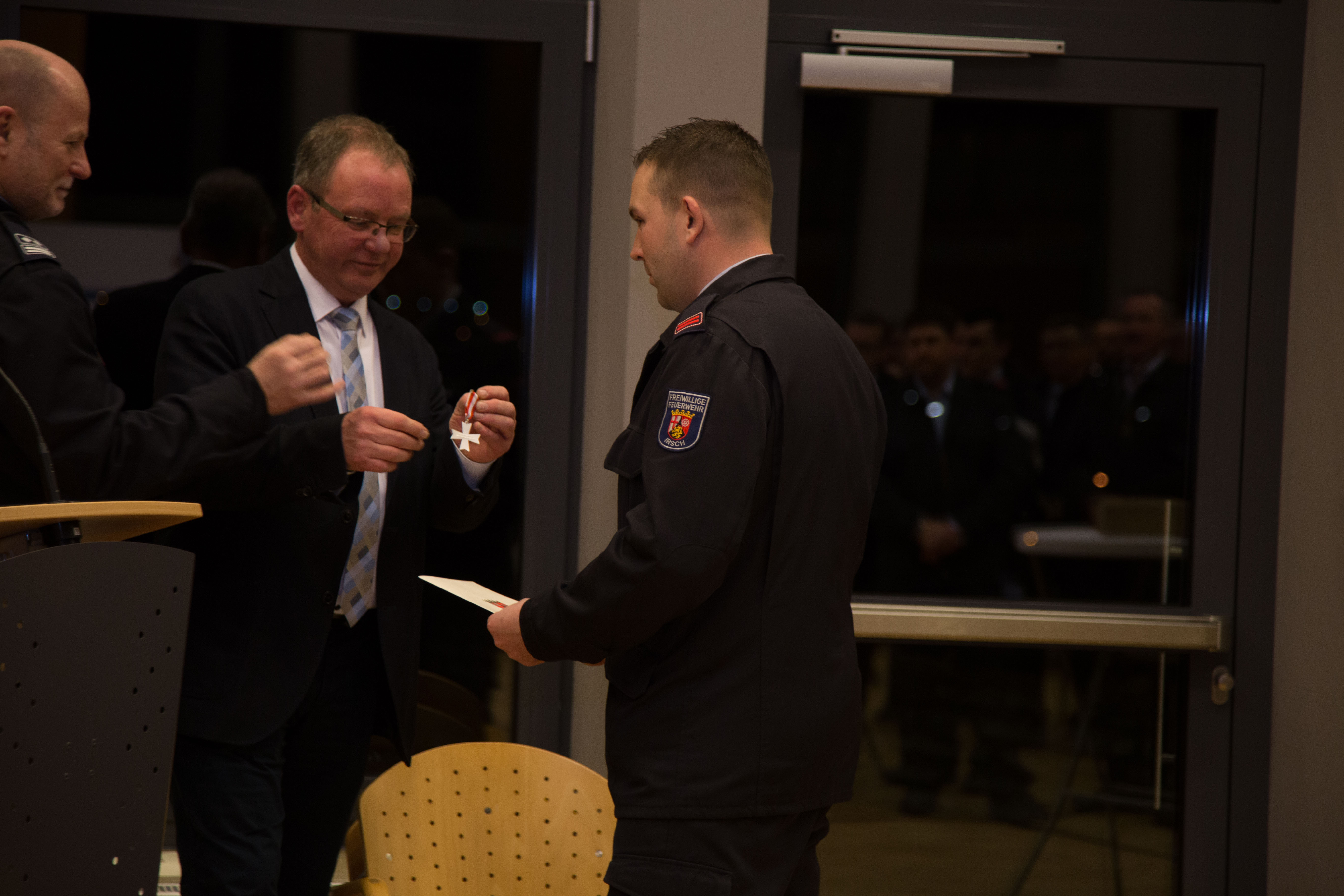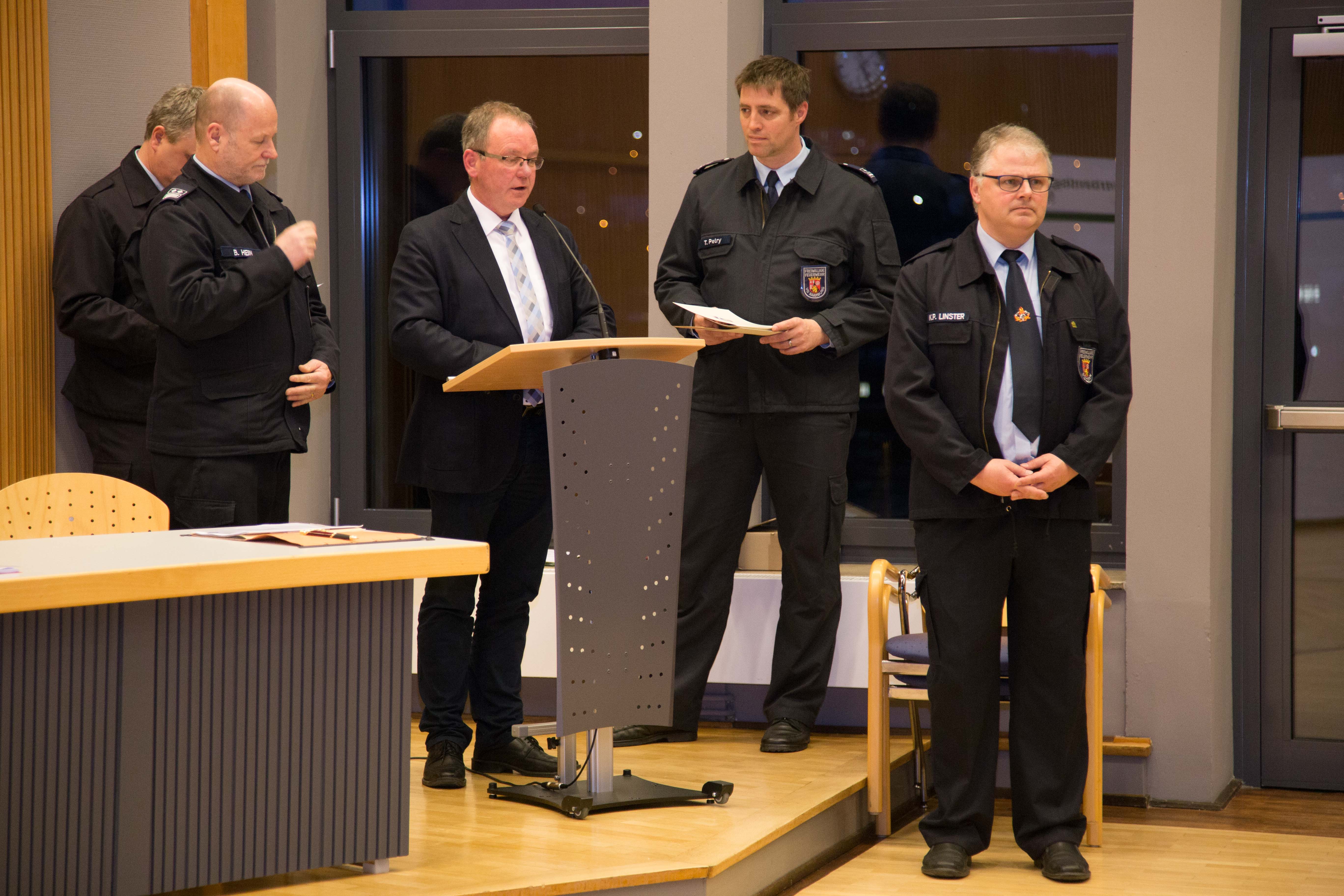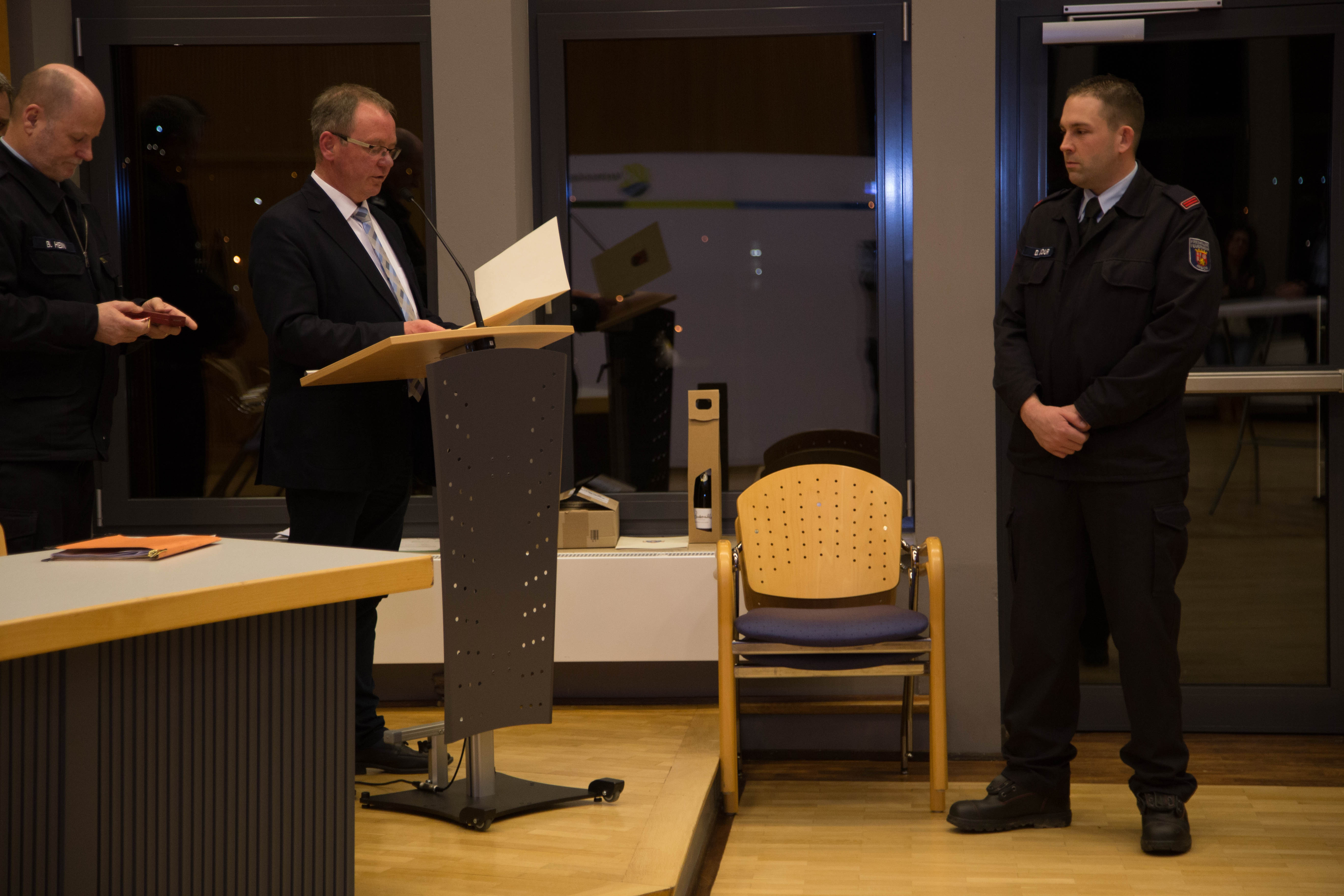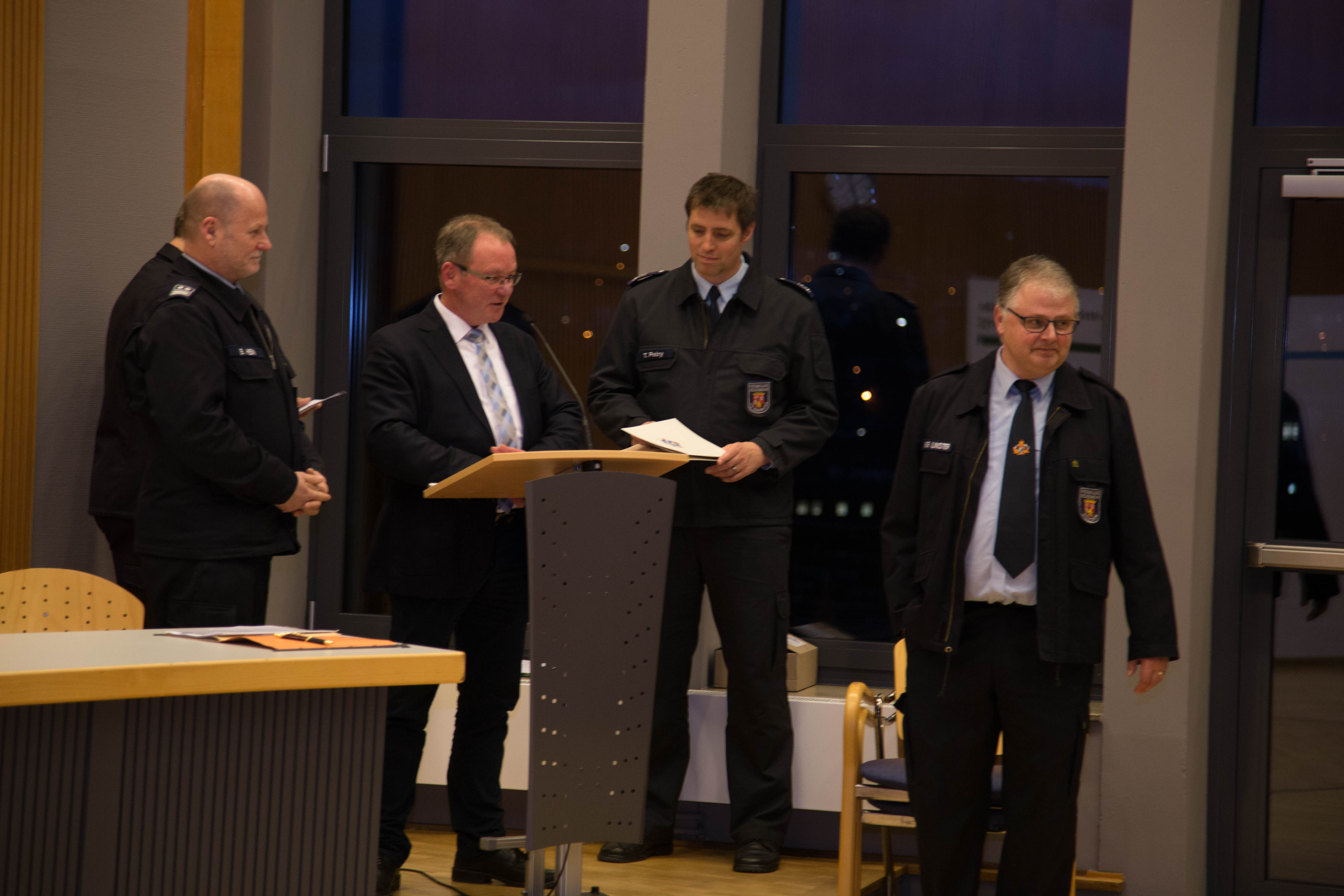 Bürgermeister Jürgen Dixius begrüßte zunächst die zahlreich erschienenen Kameraden, den Wehrleiter der VG Saarburg Bernhard Hein, seinen Stellvertreter Thorsten Petry und anwesende Orstbürgermeister. Ein Dankesgruß richtete Jürgen Dixius für eine so lange Zeit des Arrangement was die Kameraden für die Feuerwehr gebracht haben. Es folgten Verabschiedungen in die aktive Alterswehr, Neuverpflichtungen, Leitungsfunktionen zu übertragen und Ernennungen. Ein ganz wichtiger Anteil sind die Familien, die Alterswehr, die Bambini Feuerwehr und aktive Kameradinnen und Kameraden die die Familie der Feuerwehr darstellen. Im letzten Jahr sind wir ein gutes Stück weitergekommen was die Investitionen in die Feuerwehr angeht. Wir werden auch in diesem Jahr weiter darin investieren, auch was die technische Ausrüstung, Fahrzeuge und Unterkünfte betrifft. Herzlichen Dank richtete Jürgen Dixius an die Wehrleitung, seinen Stellvertreter und Harald Faber, der für die verwaltungstechnische Abwicklung in der VG Saarburg verantwortlich ist. Durch die anstehende Fusionierung mit der VG Kell am See am 1. Januar 2019 laufen die Vorbereitungen. Die Familie der „Feuerwehr“ wird somit größer werden, sie werden aber auch vor Ort gebraucht. Alle Feuerwehren vor Ort sind uns wichtig und wir werden uns weiterhin dabei einsetzen und unterstützen; so Jürgen Dixius.