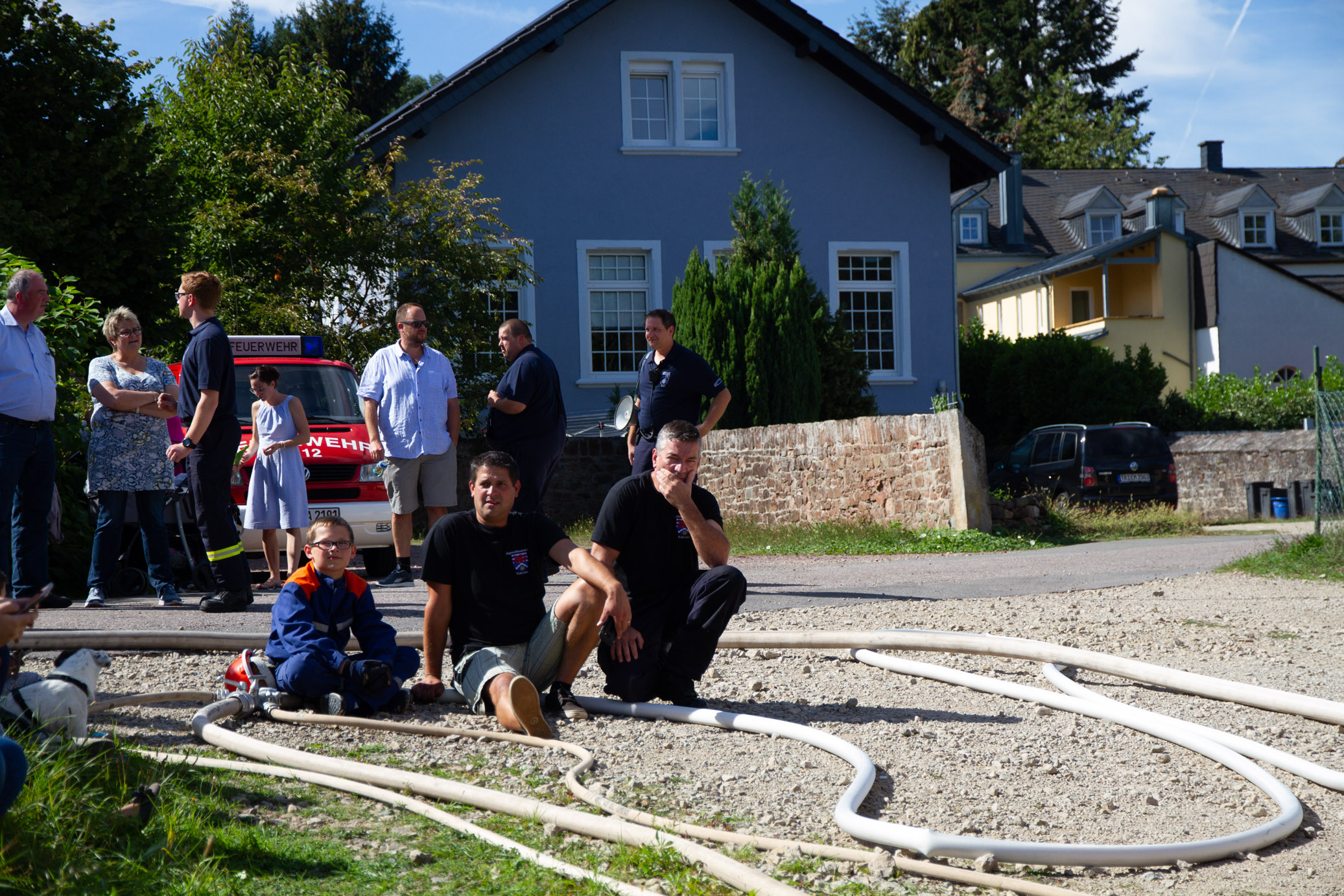 Die ersten Einsatzfahrzeuge der Feuerwehr Könen und der Feuerwehr Kanzem eilten mit Blaulicht und Martinshorn zu einem brennenden Palettenstapel. Die Jugendfeuerwehren aus Könen und Kanzem bauten schnell mit Unterstürzung erfahrener Kameraden die Wasserversorgung mit drei Strahlrohren auf.