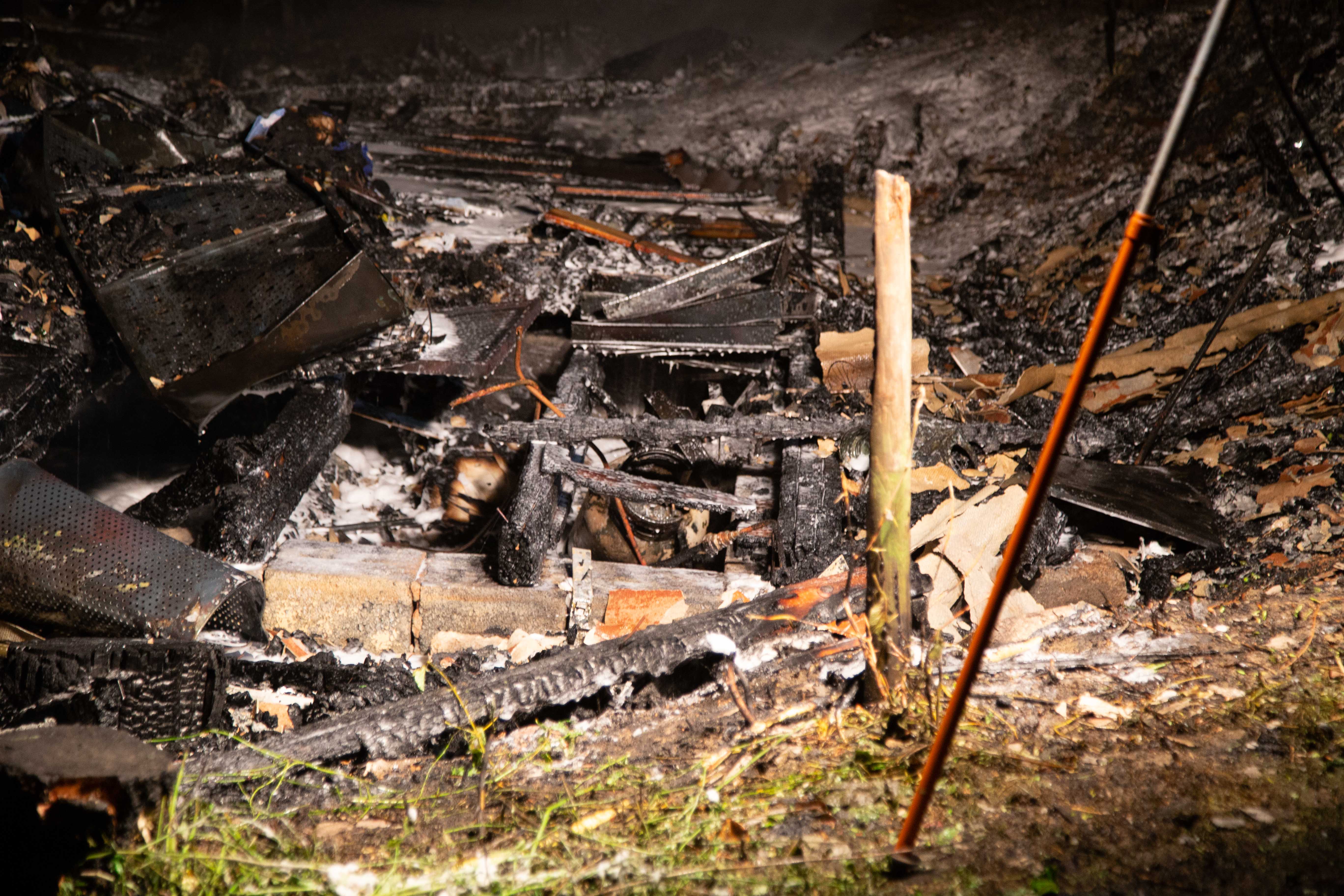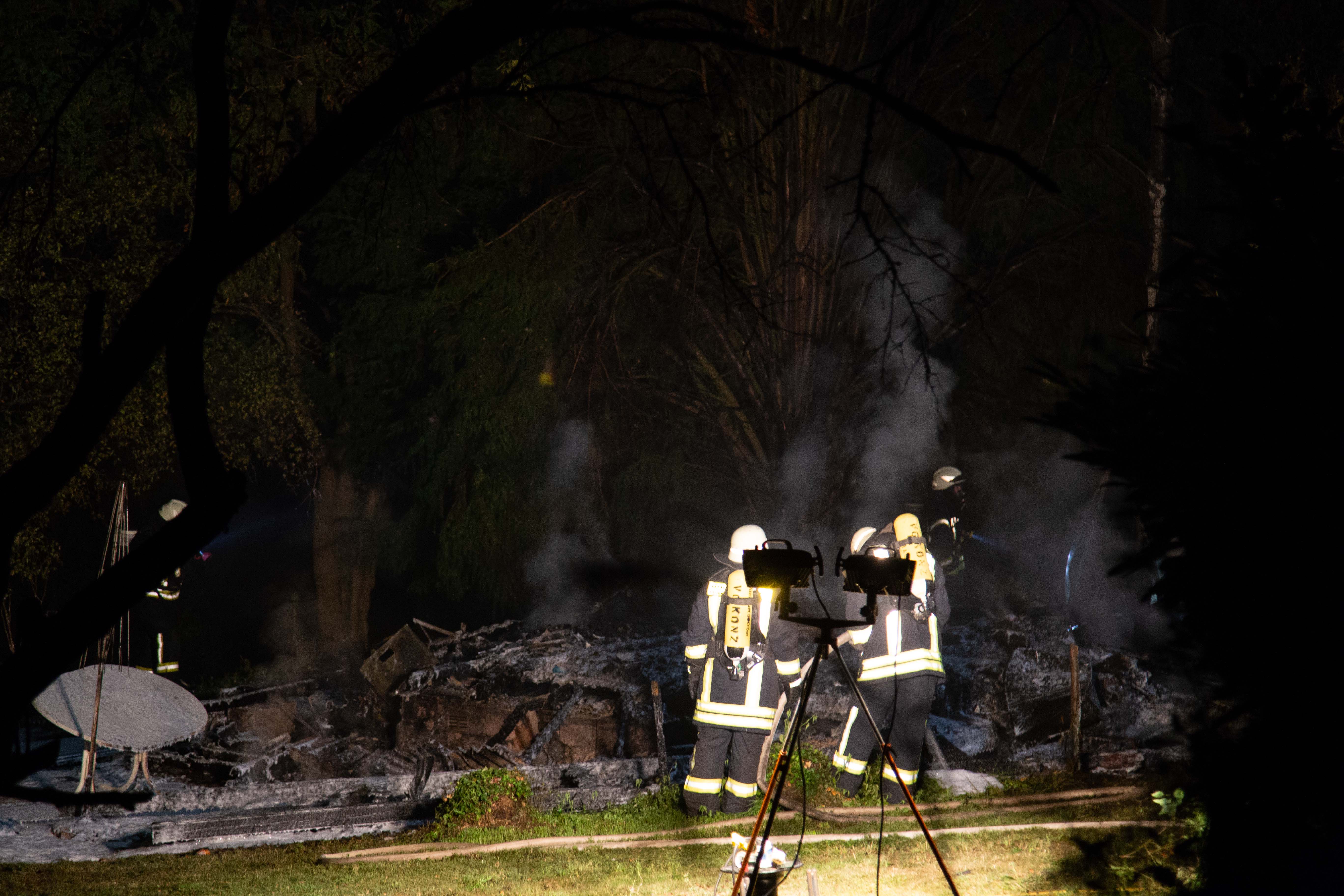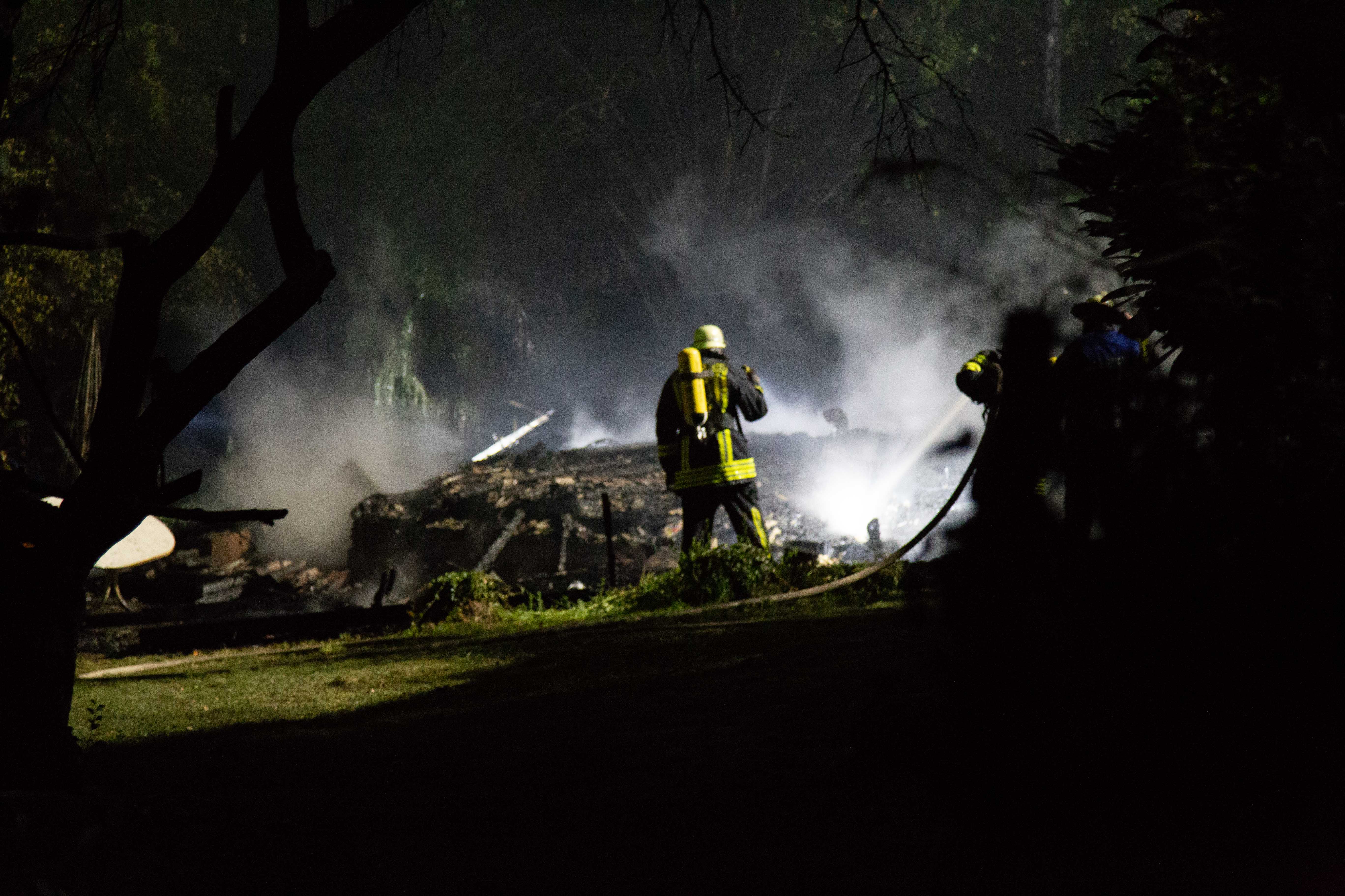 Das Holzhaus ist komplett zusammengefallen und weitestgehend verbrannt.