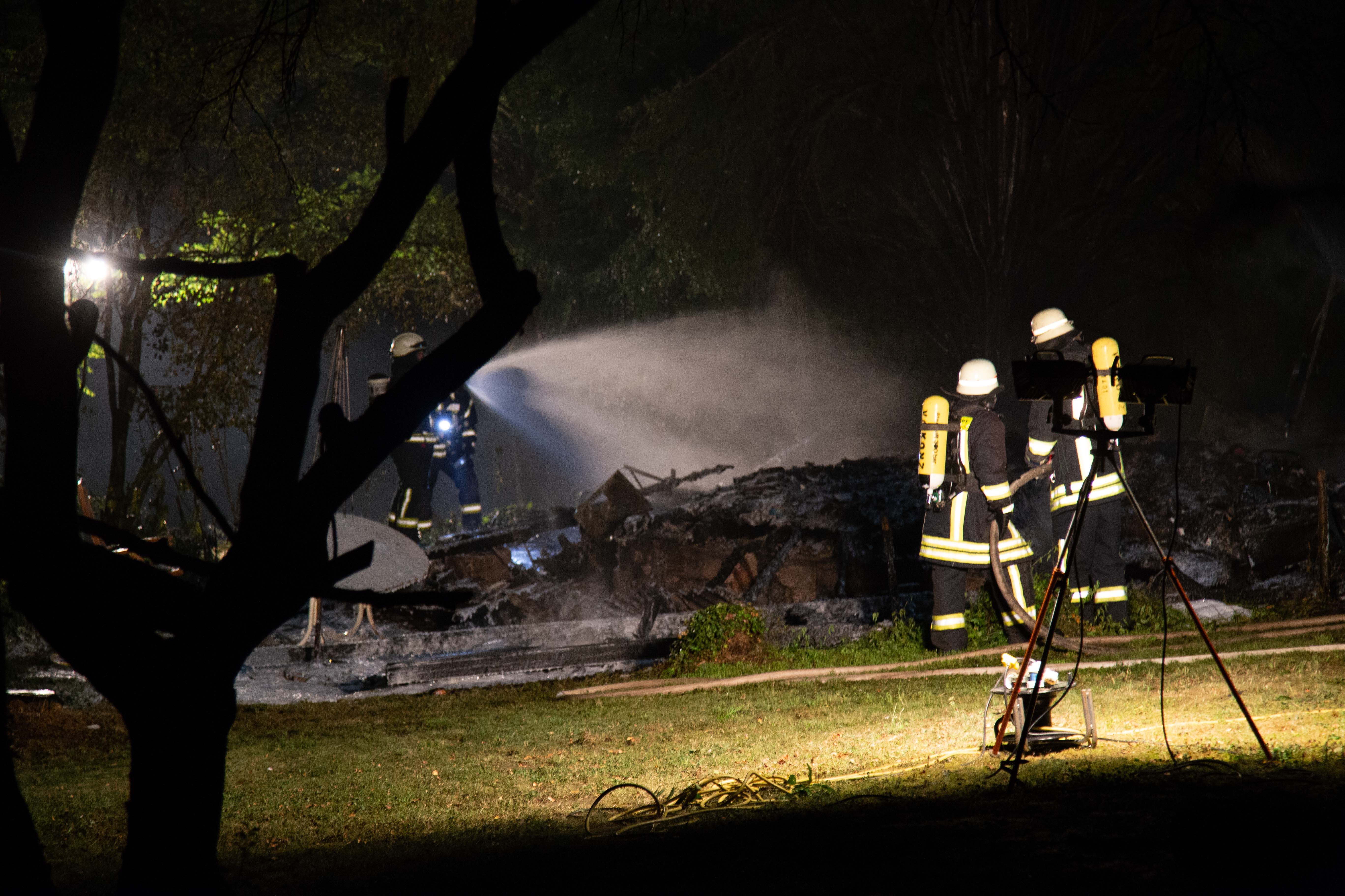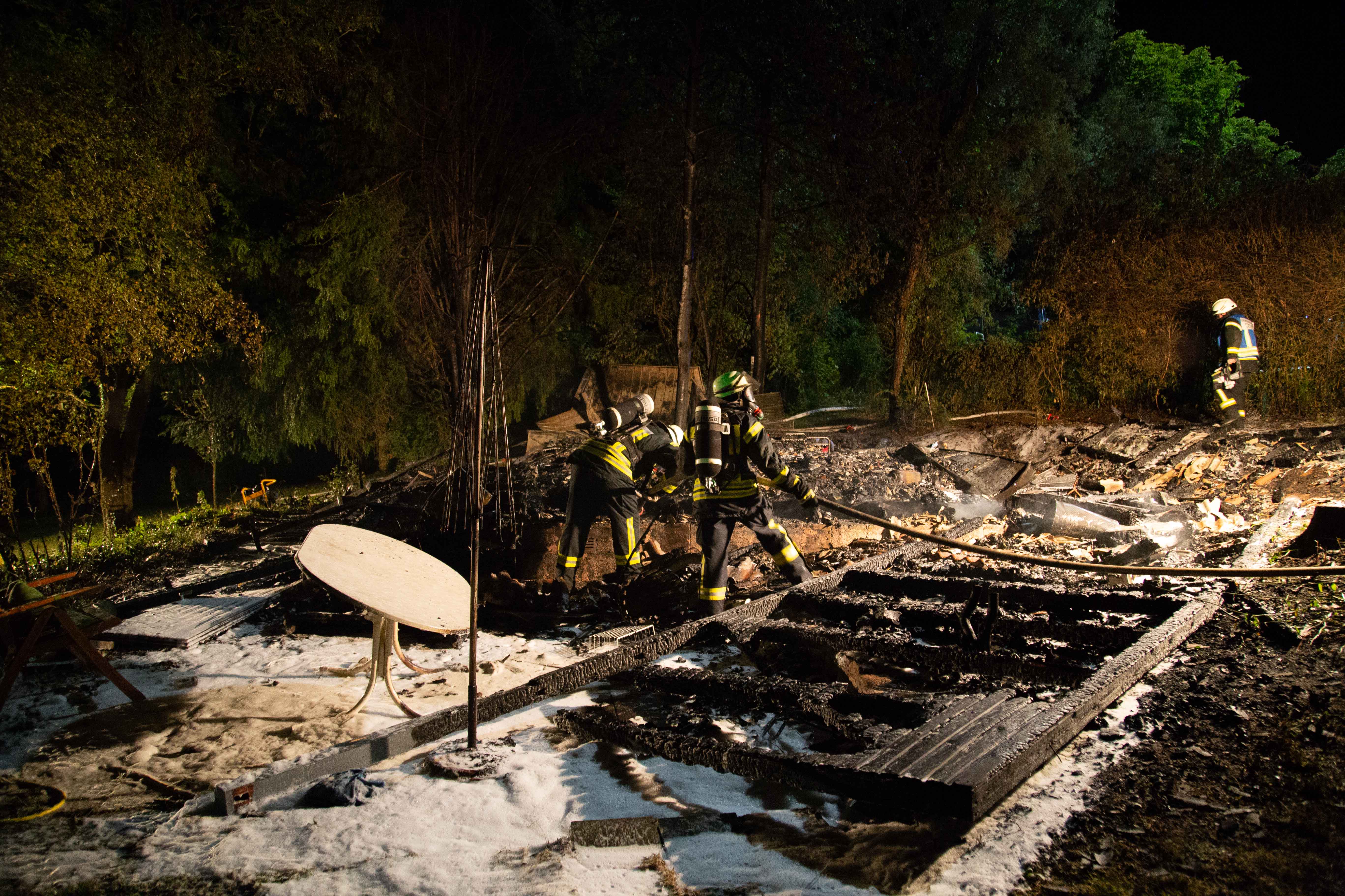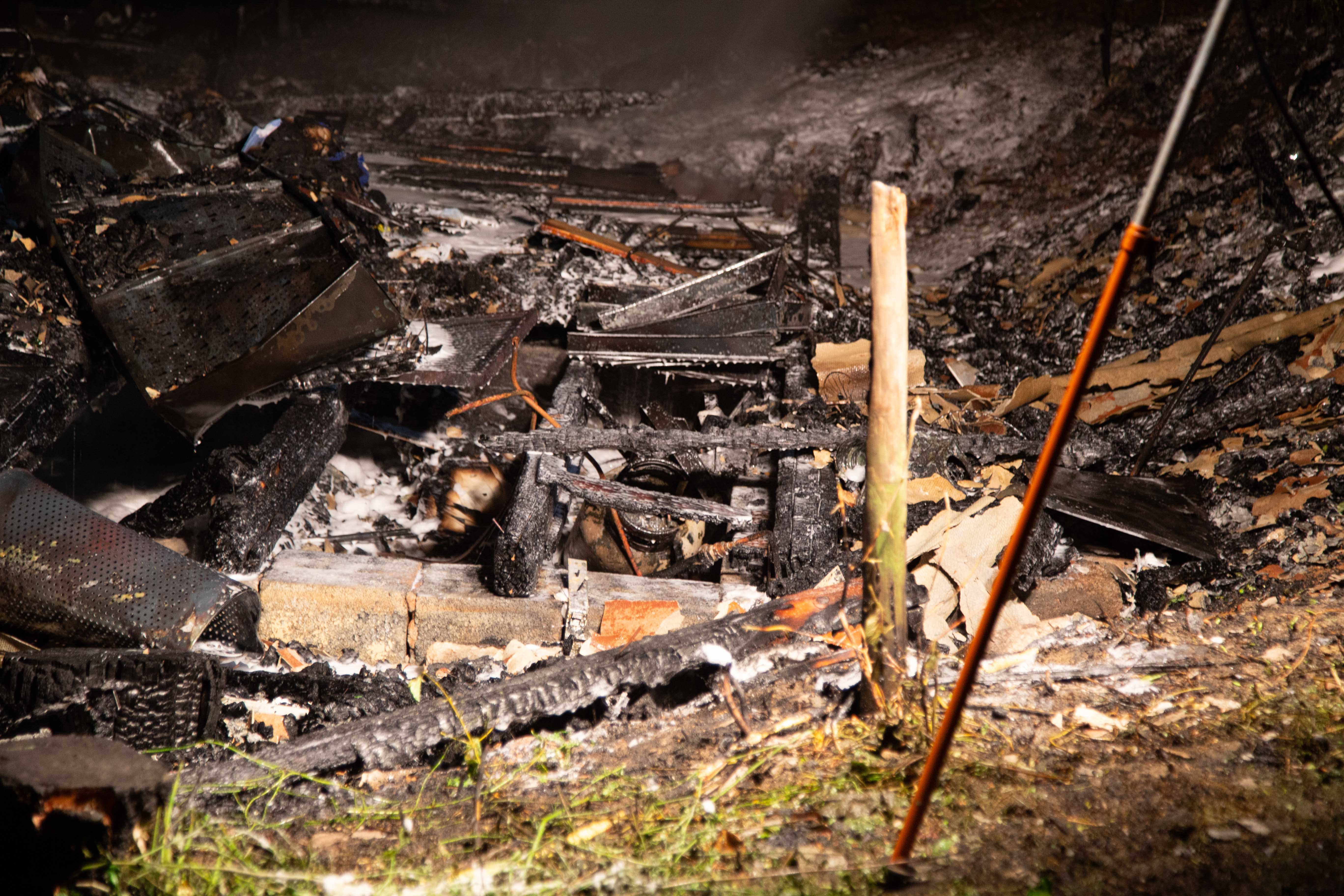 Das Holzhaus ist komplett zusammengefallen und weitestgehend verbrannt.