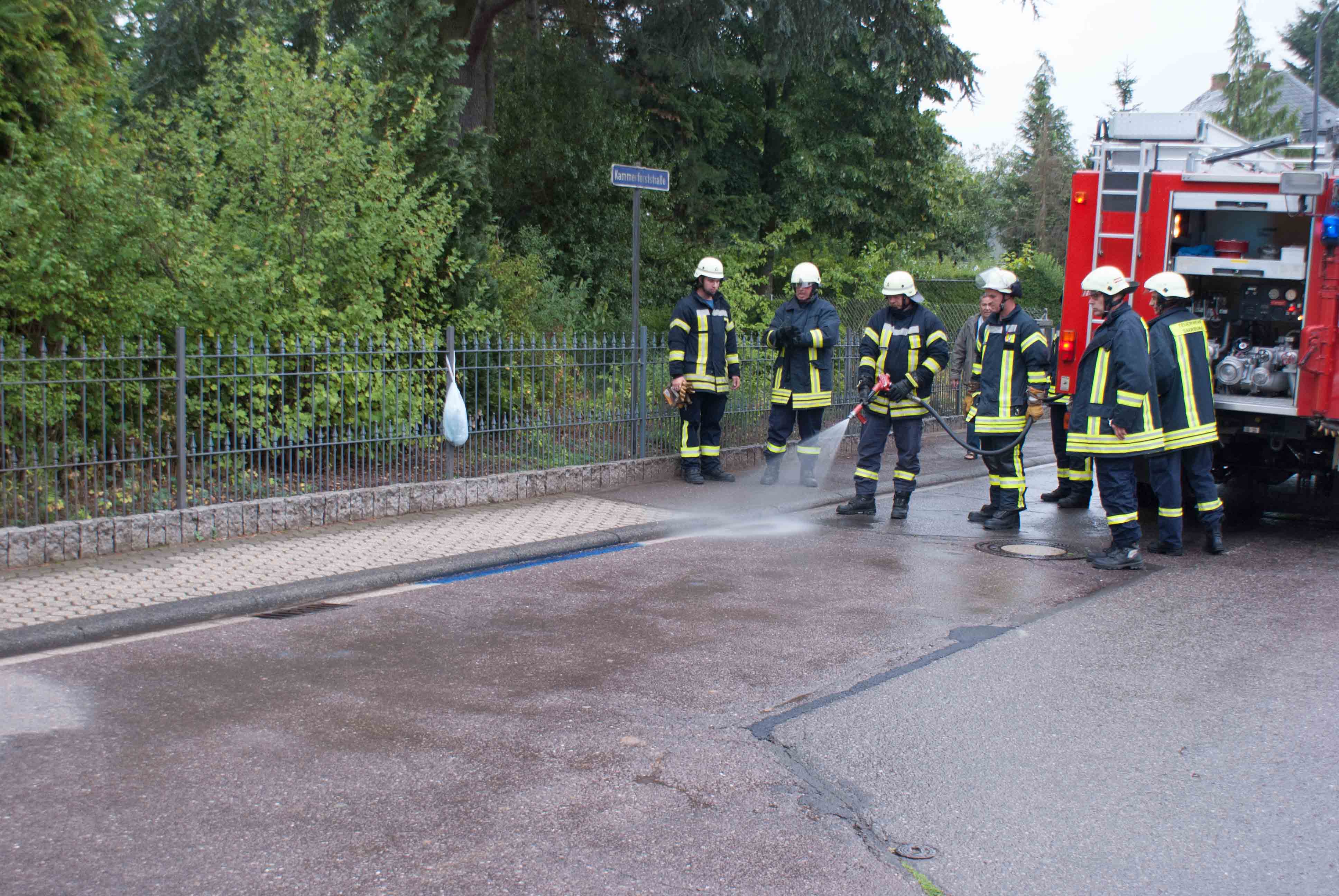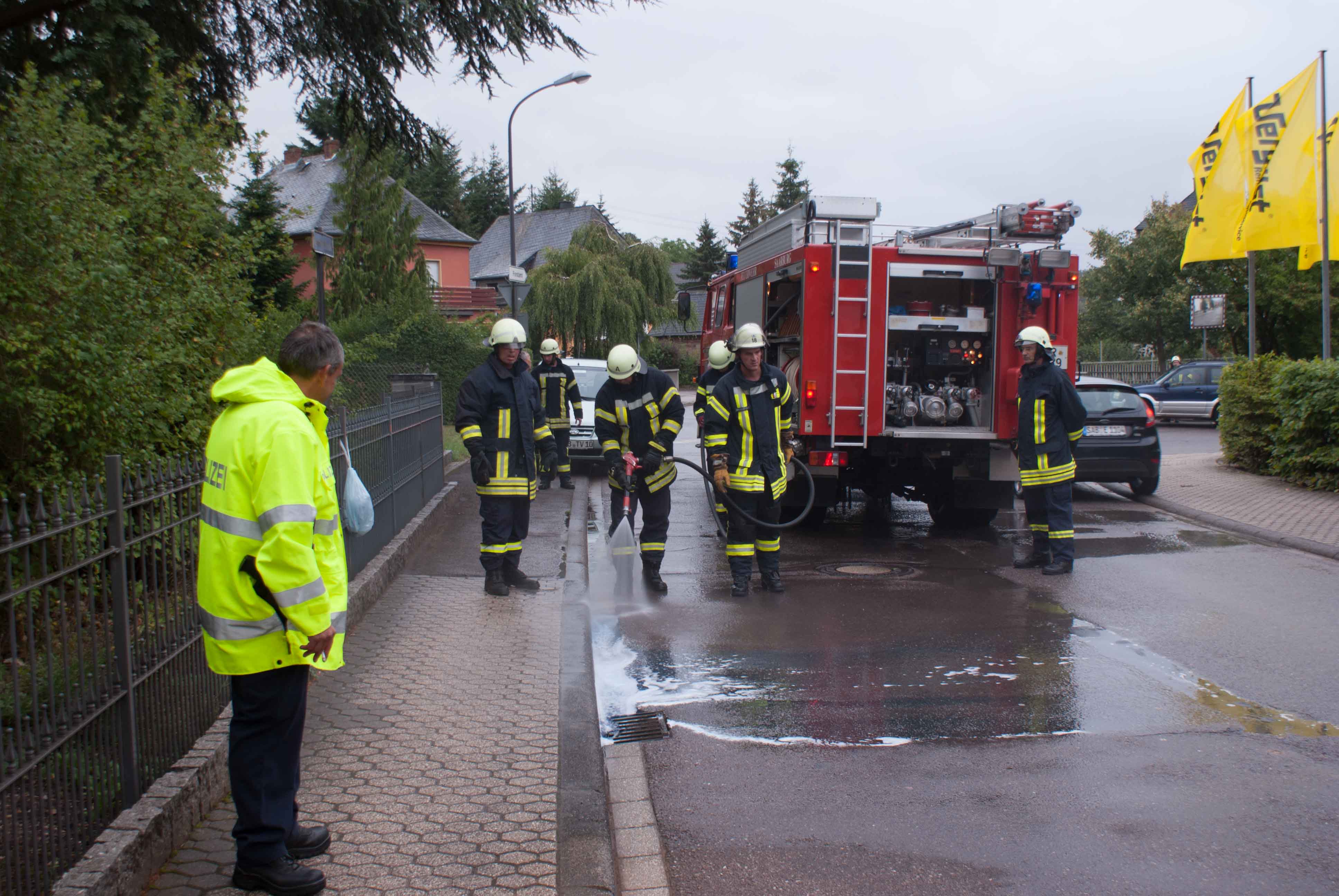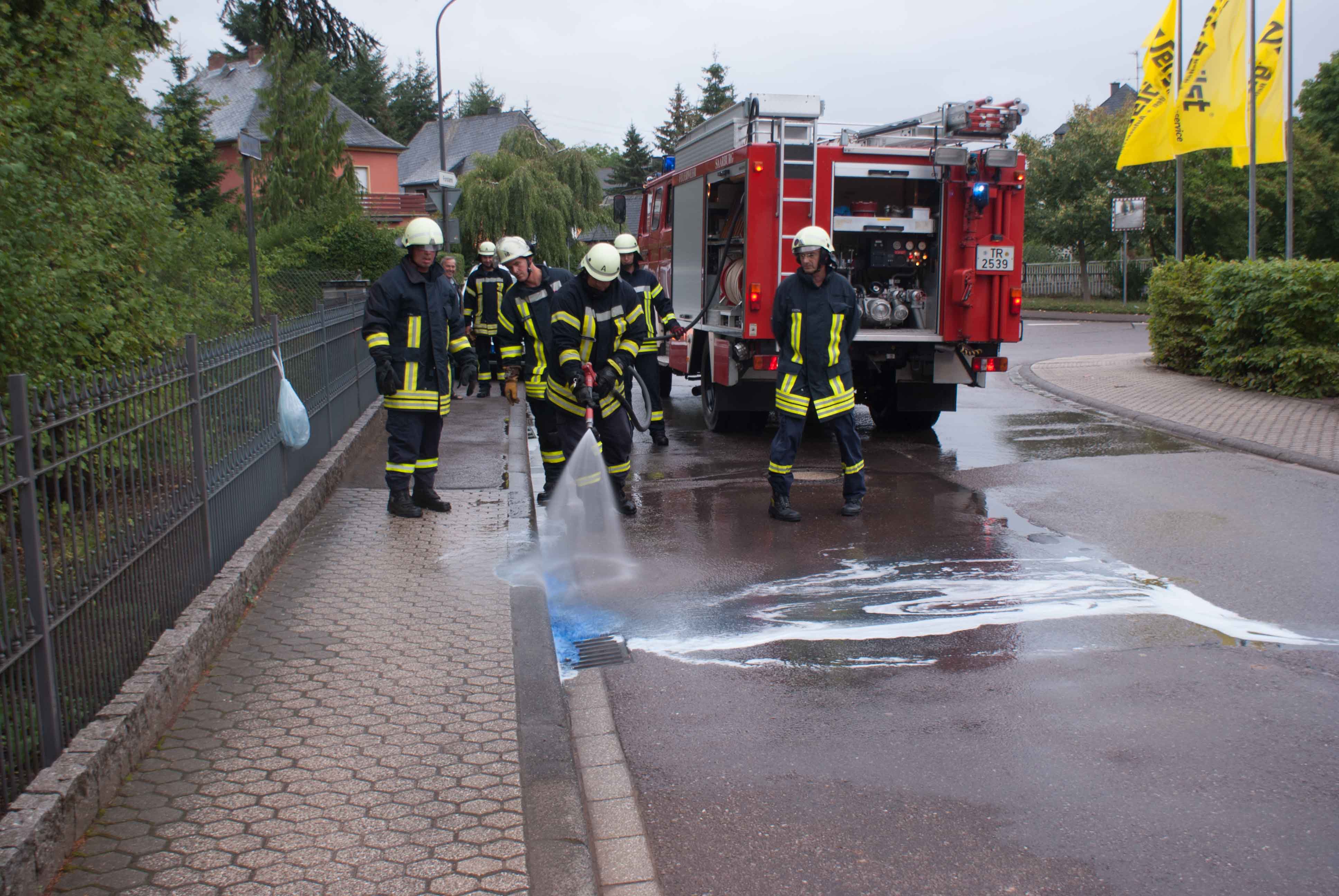 Am Freitagabend gegen 18.40 Uhr wurde der Löschzug Mitte der Feuerwehr Saarburg zu einem gemeldeten Gefahrstoff in der Kammerforststraße alarmiert. Ein aufmerksamer Bürger meldete dies, weil er eine Flasche mit blauen Inhaltsstoff und einen etwa zwei Meter breiten blauen Fremdstoff in der Regenrinne festgestellt hat. Bei der genauen Analyse der Feuerwehr und der Polizeiinspektion Saarburg stellte sich heraus, das es sich um eine Sanitärflüssigkeit blau handelt, wie man sie für Campingtoiletten benutzt wird um eine Fäkalienzersetzung zu beschleunigen. Diese Flüssigkeit wird nach EG-Sicherheitsdatenblatt und EG Richtlinie nicht als gefährlich eingestuft. Ein Fahrzeug muss wohl in der Linkskurve diese Flasche verloren haben. Nach Reinigung der Regenrinne konnten die zwei Fahrzeuge mit etwa zehn Wehrleuten den Einsatz abbrechen. Es entstanden keine Personen, Sach -oder Umweltschäden. Die Aufmerksamkeit  und Meldung des Bürgers war auf jedenfall richtig, den es hätte auch eine andere Substanz gewesen können.