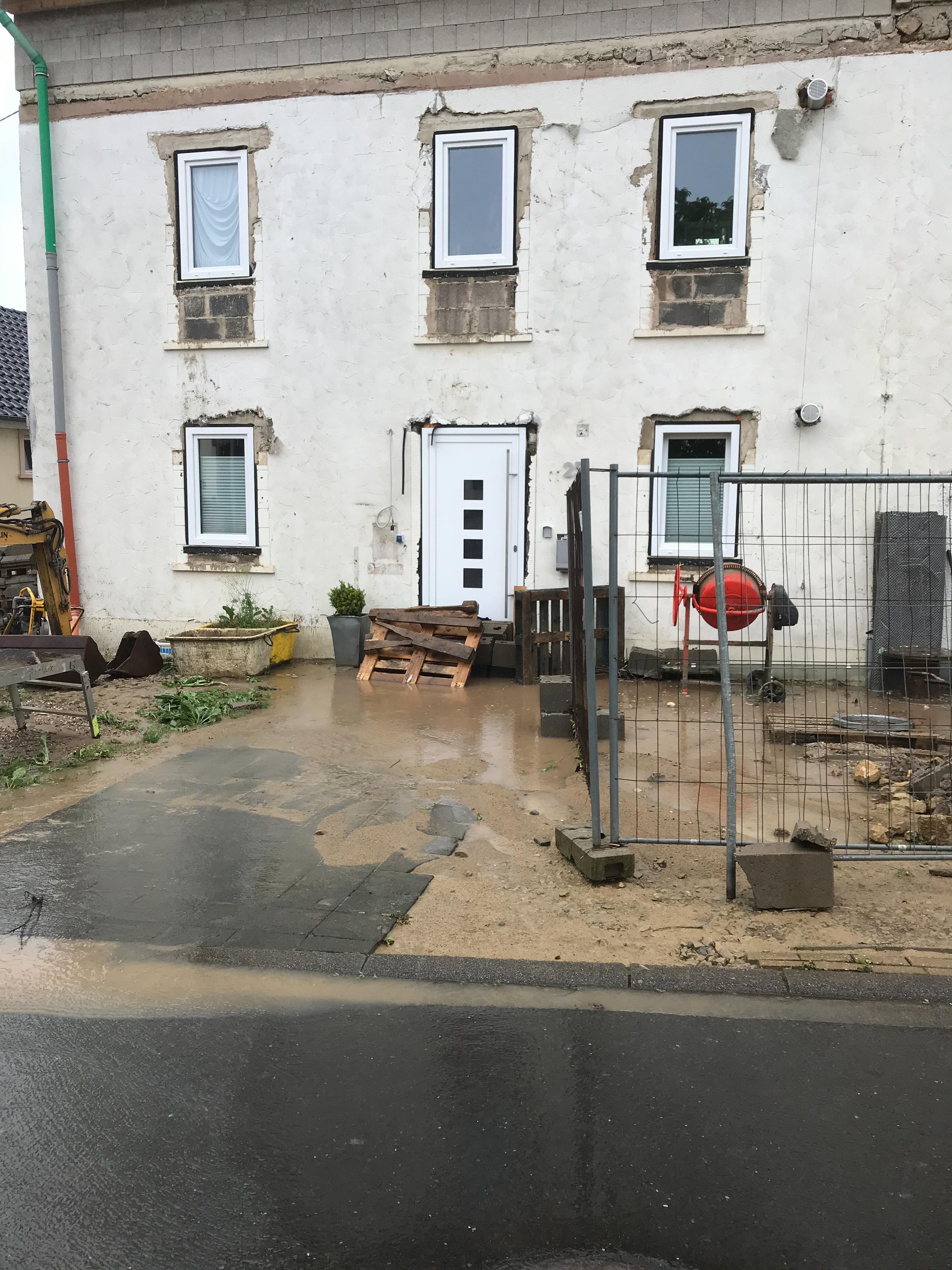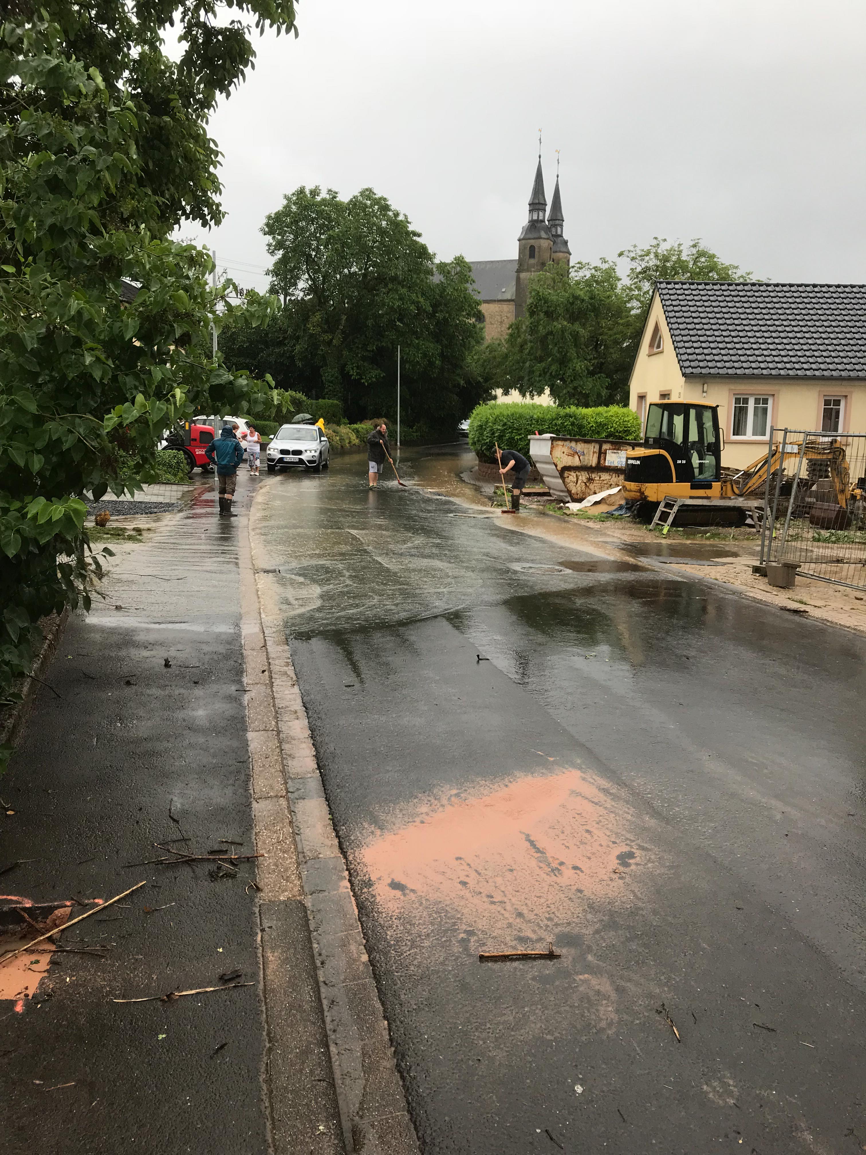 In Niederleuken wurde durch einen Erdrutsch aus den Weinbergen die Straße komplett blockiert, ein PKW teilweise verschüttet. Die Ortsdurchfahrt Niederleuken wurde durch die Polizei komplett gesperrt. Noch in der Nacht informierte sich Verbandsbürgermeister Jürgen Dixius in der Einsatzleitung über die Lage. Er sicherte sofort die Unterstützung des Bauhofs der Stadt Saarburg zu, die gemeinsam mit dem Radlader des THW den Erdwall in Niederleuken beseitigte. Hier arbeiten Feuerwehr, THW und der Bauhof den ganzen Vormittag gemeinsam um die Straße in Niederleuken von Schlamm, Geröll zu reinigen.