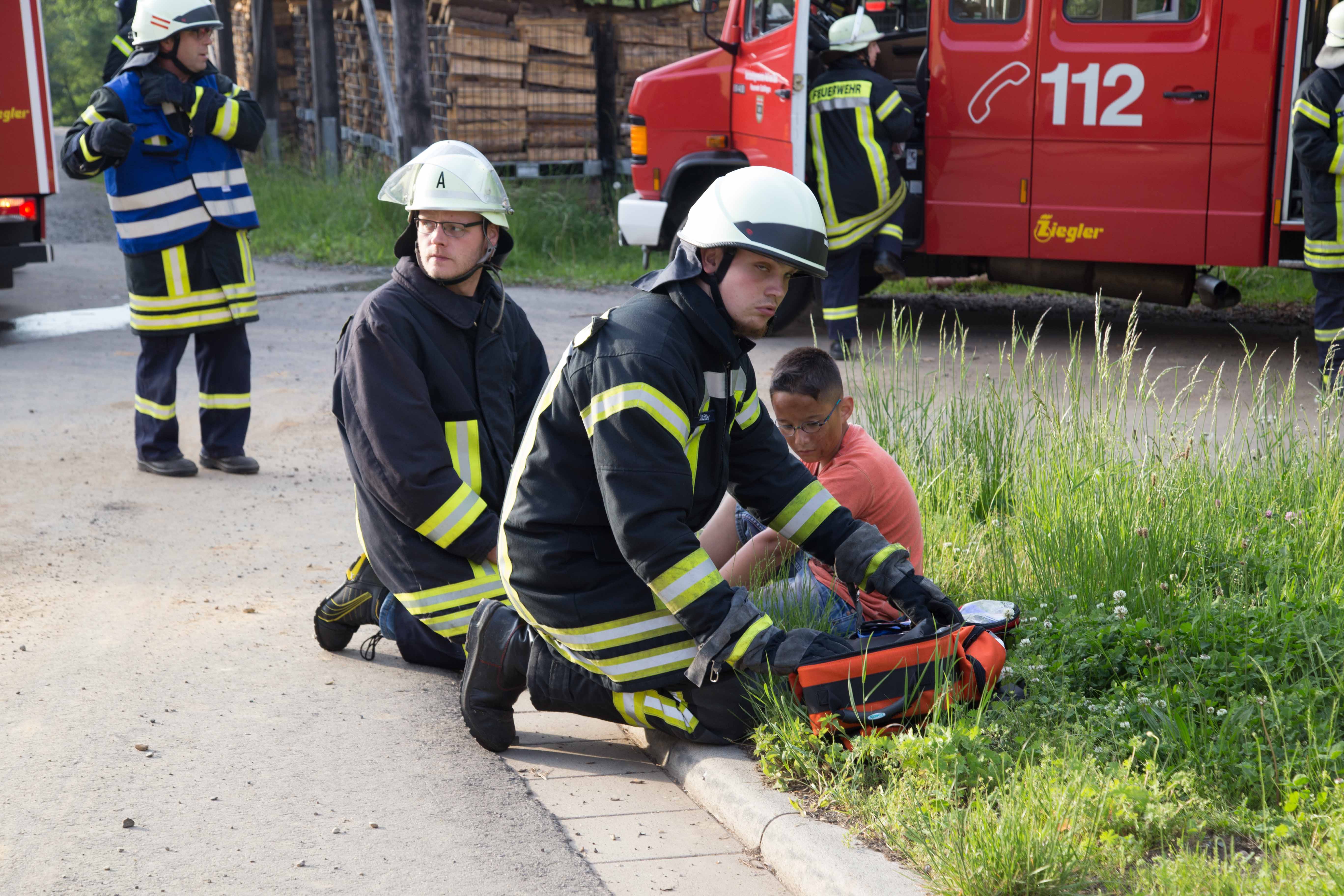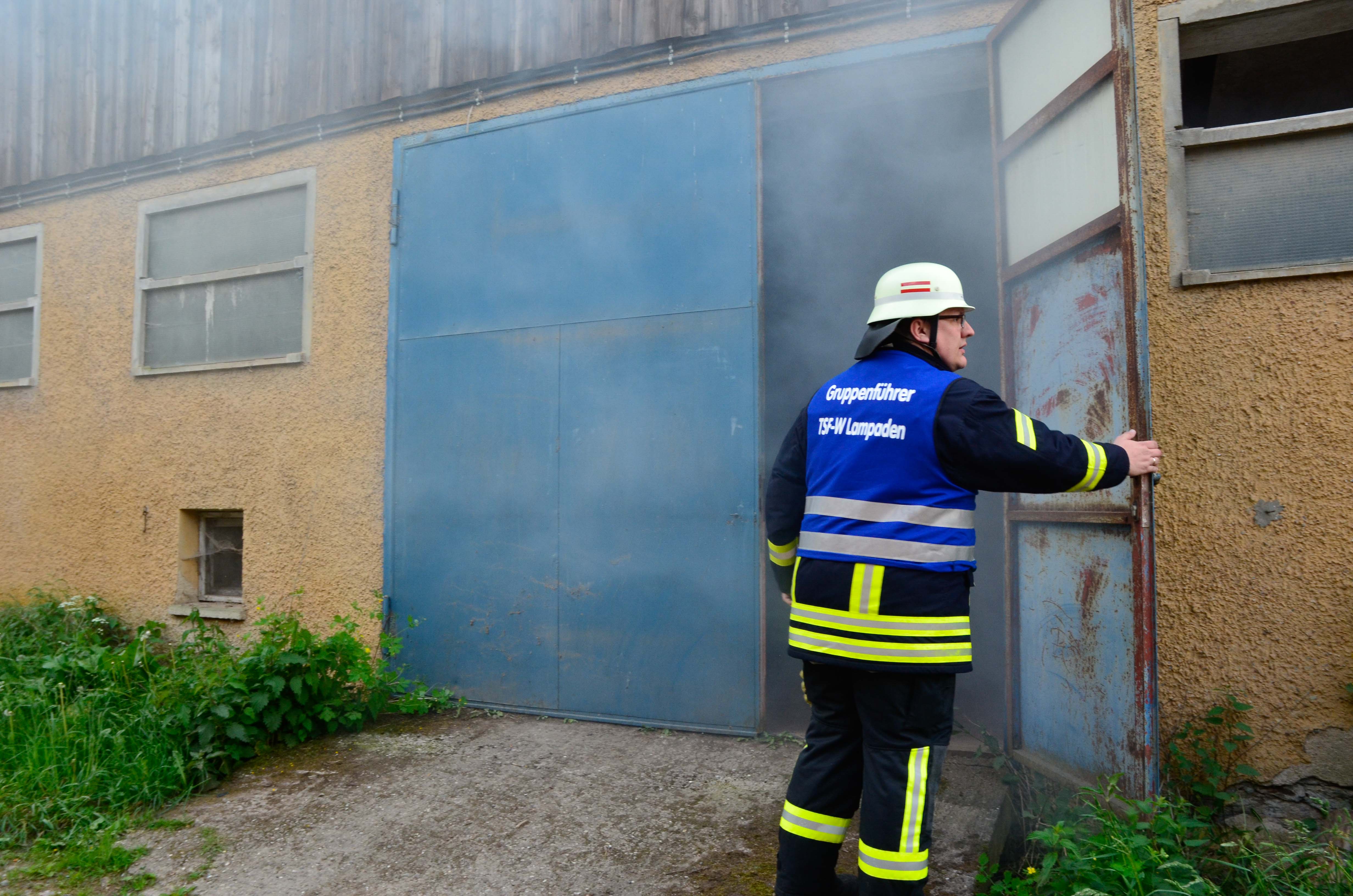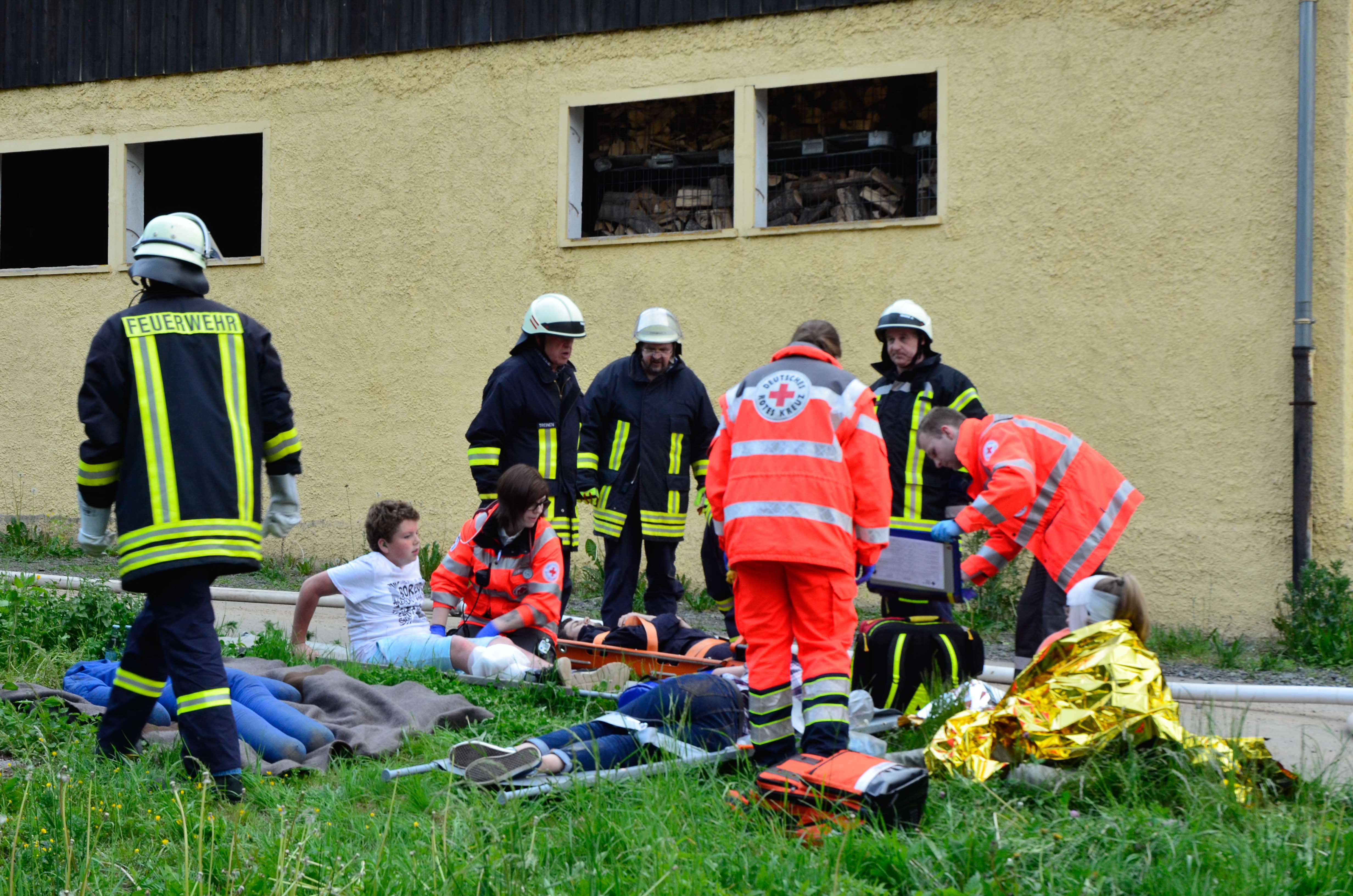 Etwas aufwendiger gestaltete sich die Wasserversorgung, die lediglich aus einem Löschteich aufgebaut werden musste. Mehrere Atemschutzträger wurden von der Abschnittsleitung zu den brennenden Gebäuden beordert, um die Verletzten zu retten und an einer Sammelstelle den Ersthelfern der First Responder Lampaden zu übergeben.