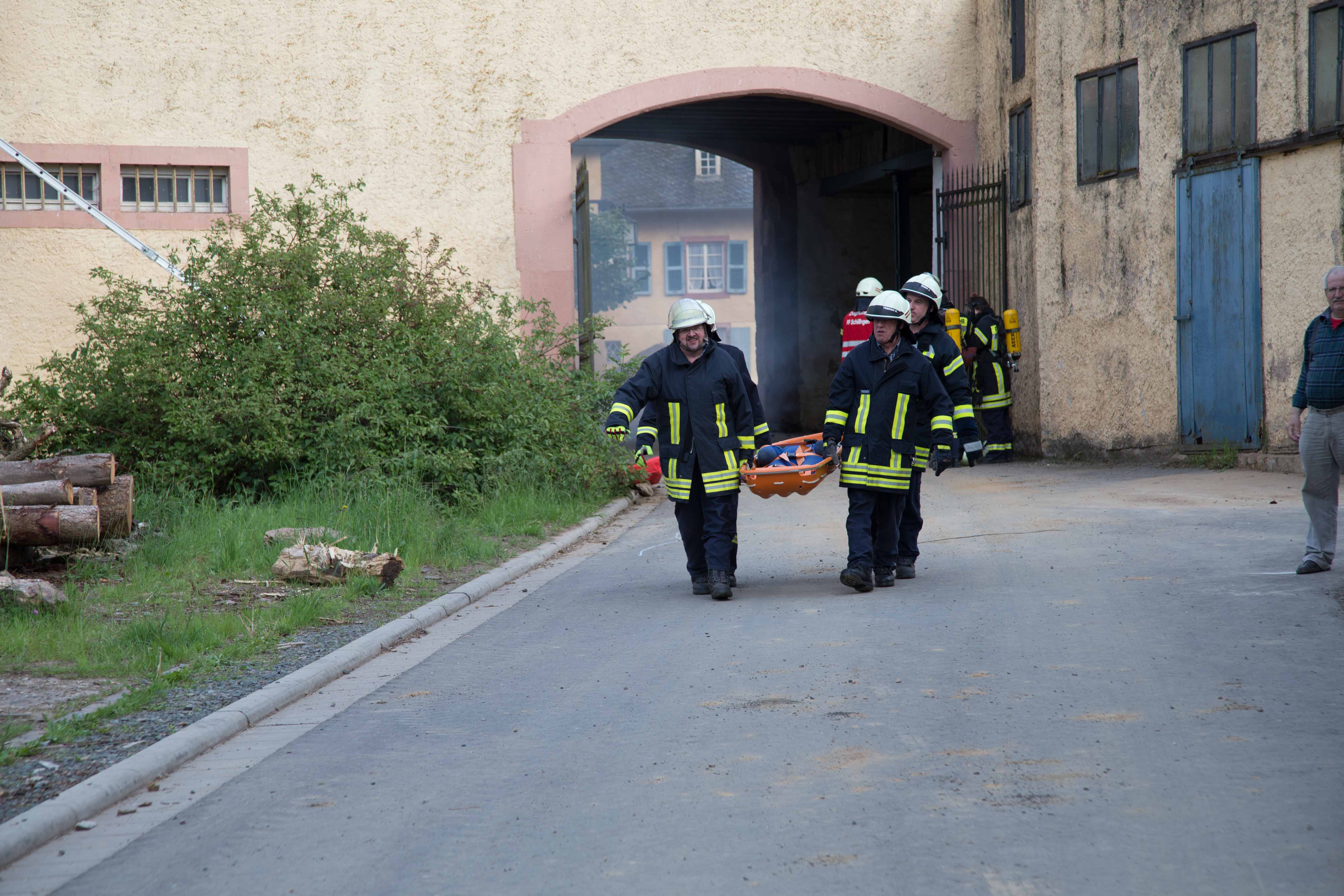 Die alarmierten Einsatzkräfte waren beim Eintreffen auf die Hinweise des Gutsherrenbesitzers Christian Achter angewiesen. In den Werkstätten sowie in einem Zwischengebäude brannte es. Fünf Personen wurden als vermisst gemeldet. Eine Person lag bewusstlos in einem Burgfried und musste mittels einer Steckleiter und Schleifkorbtrage gerettet werden.