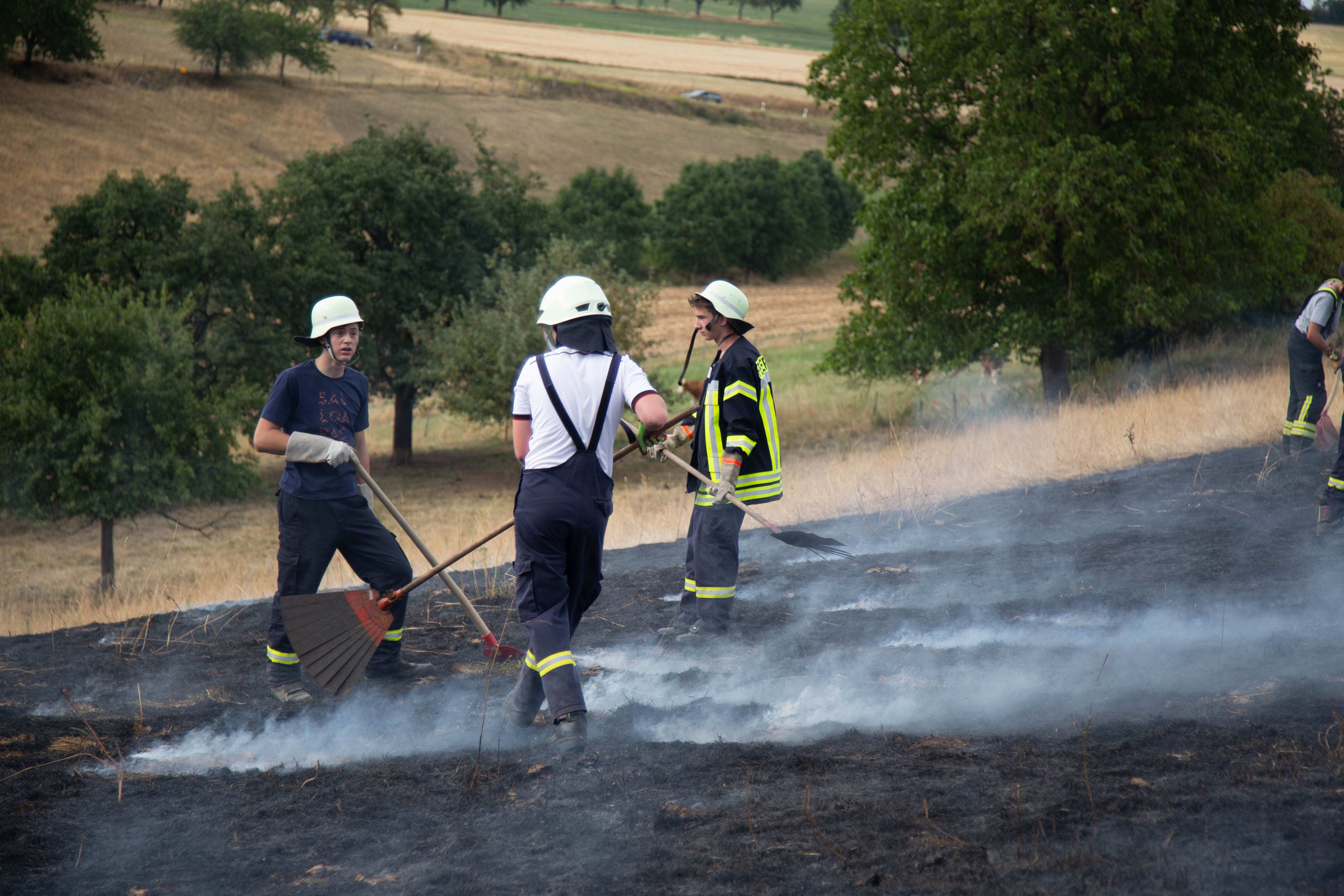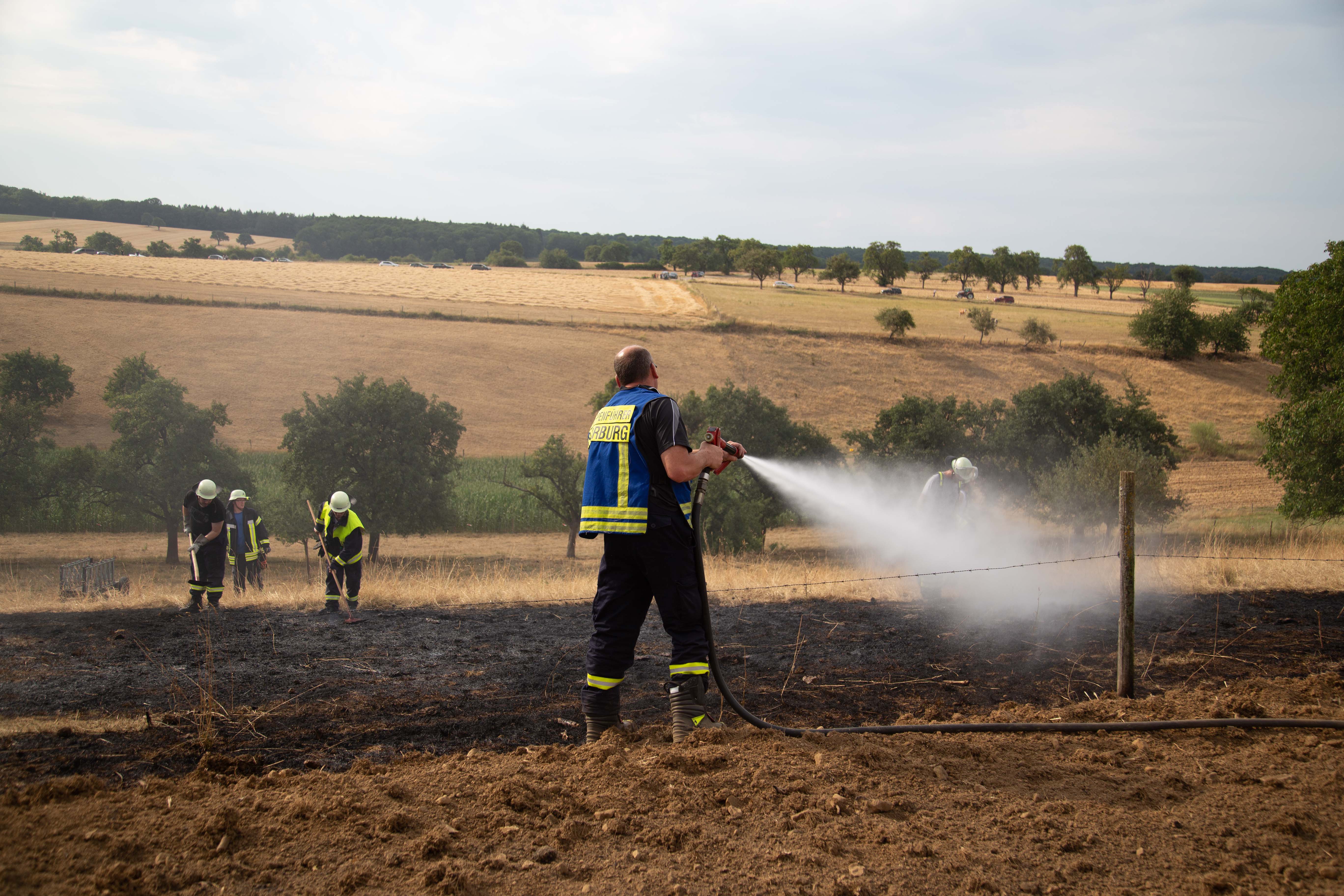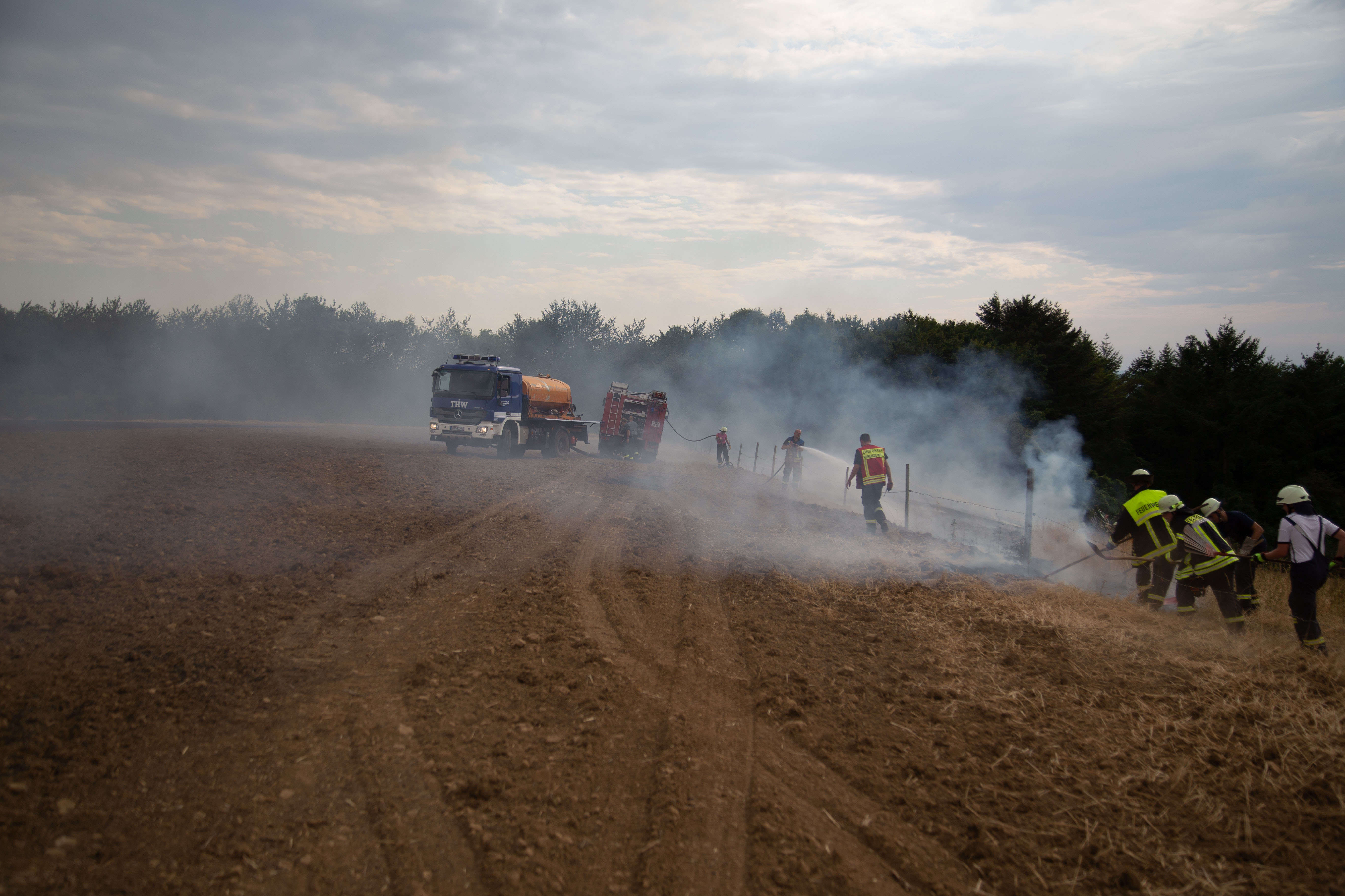Mit mehreren wasserführenden Fahrzeugen und Angriffstrupps wurde das Feuer gelöscht. Mit einem Güllefass wurde die Fläche von Landwirten gewässert.