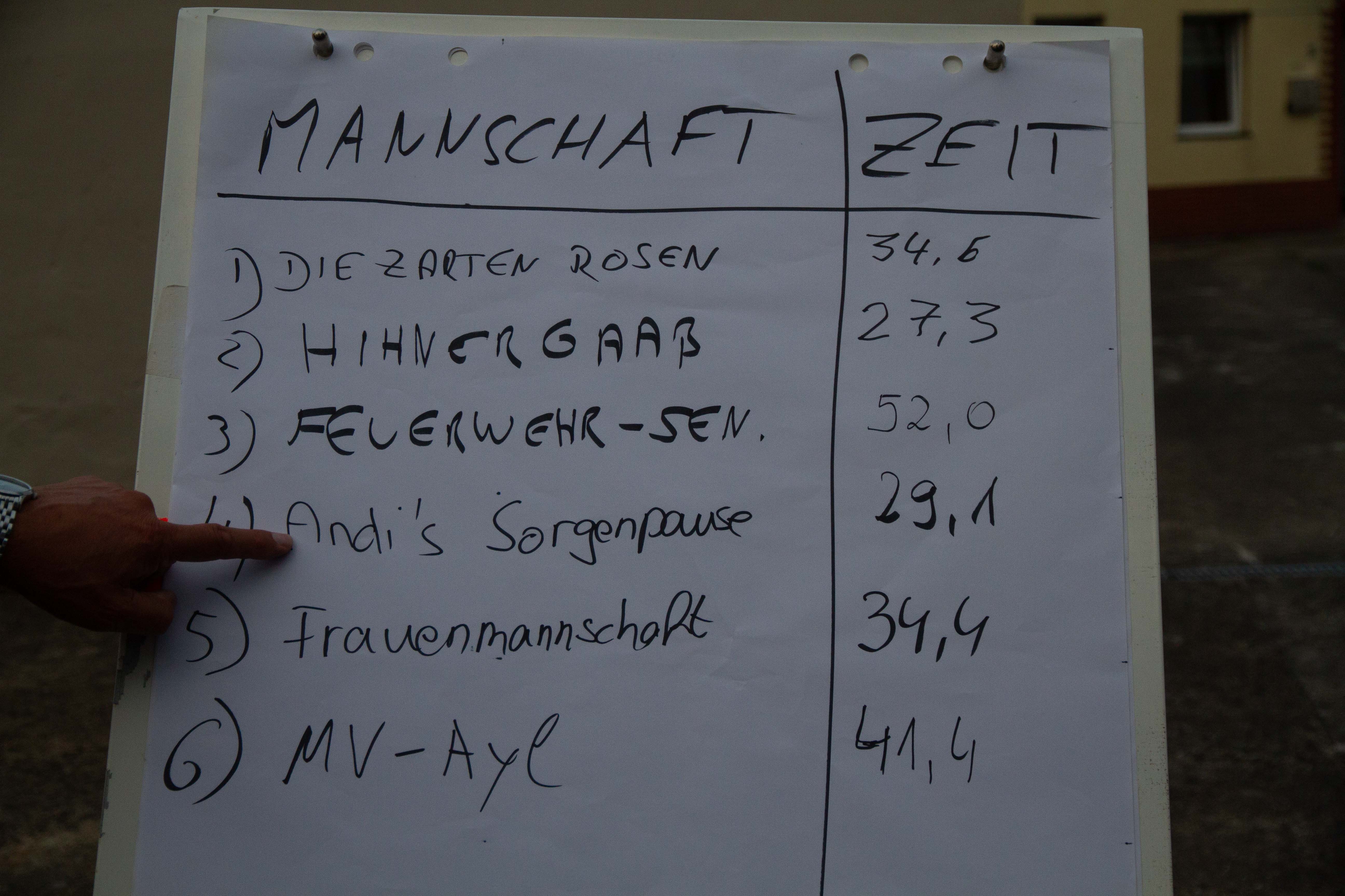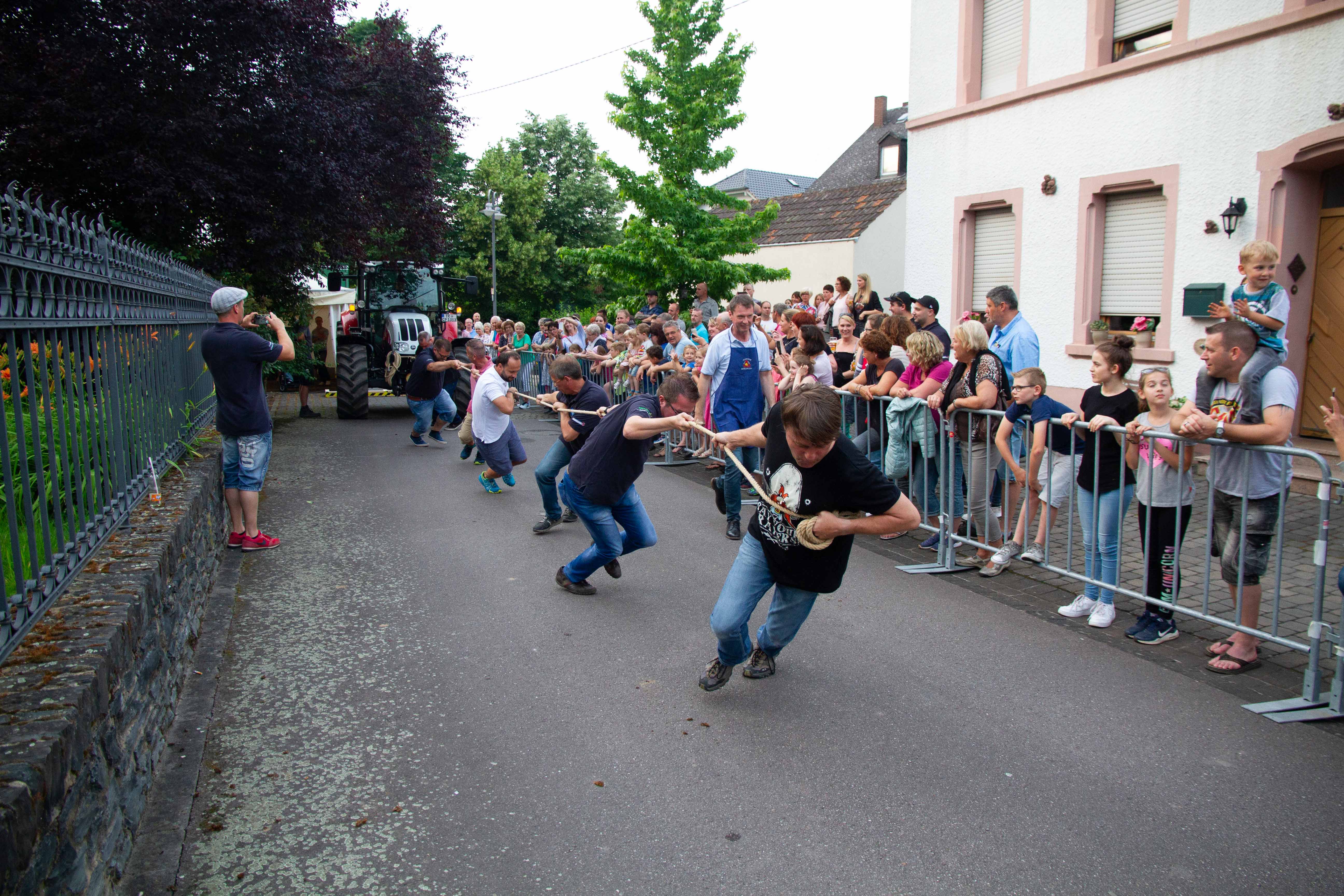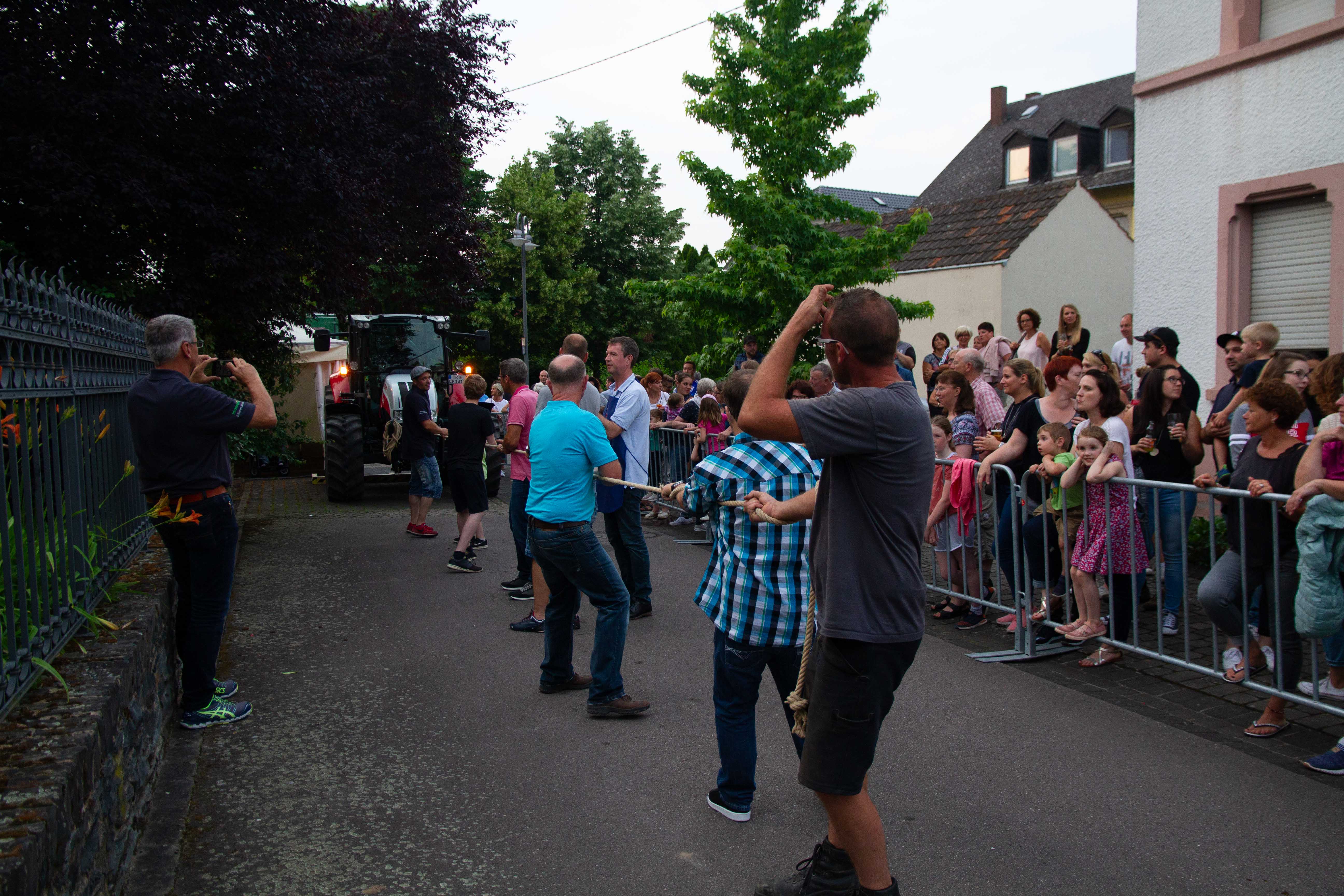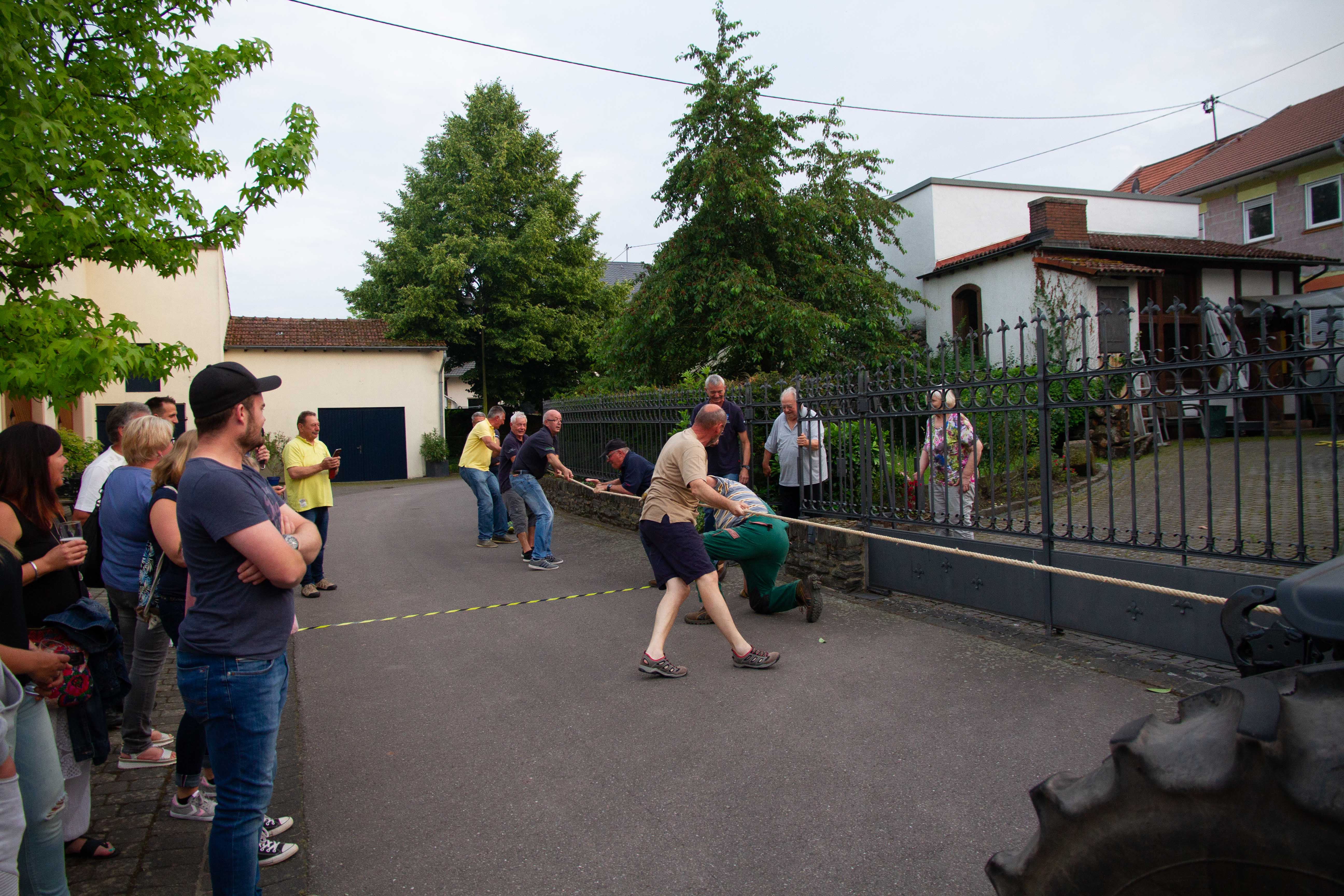 Auf dem Flipchart an der bereits präparierten 30 Meter Zugstrecke konnte in Kürze sechs Mannschaften notiert werden. Biebelhausener Bürger halten halt zusammen. Die Bestzeit lag wie im Vorjahr auf Platz 1, die „Hühnergaß bei 27,3 Sekunden, um genau genommen eine Sekunde länger als in 2017