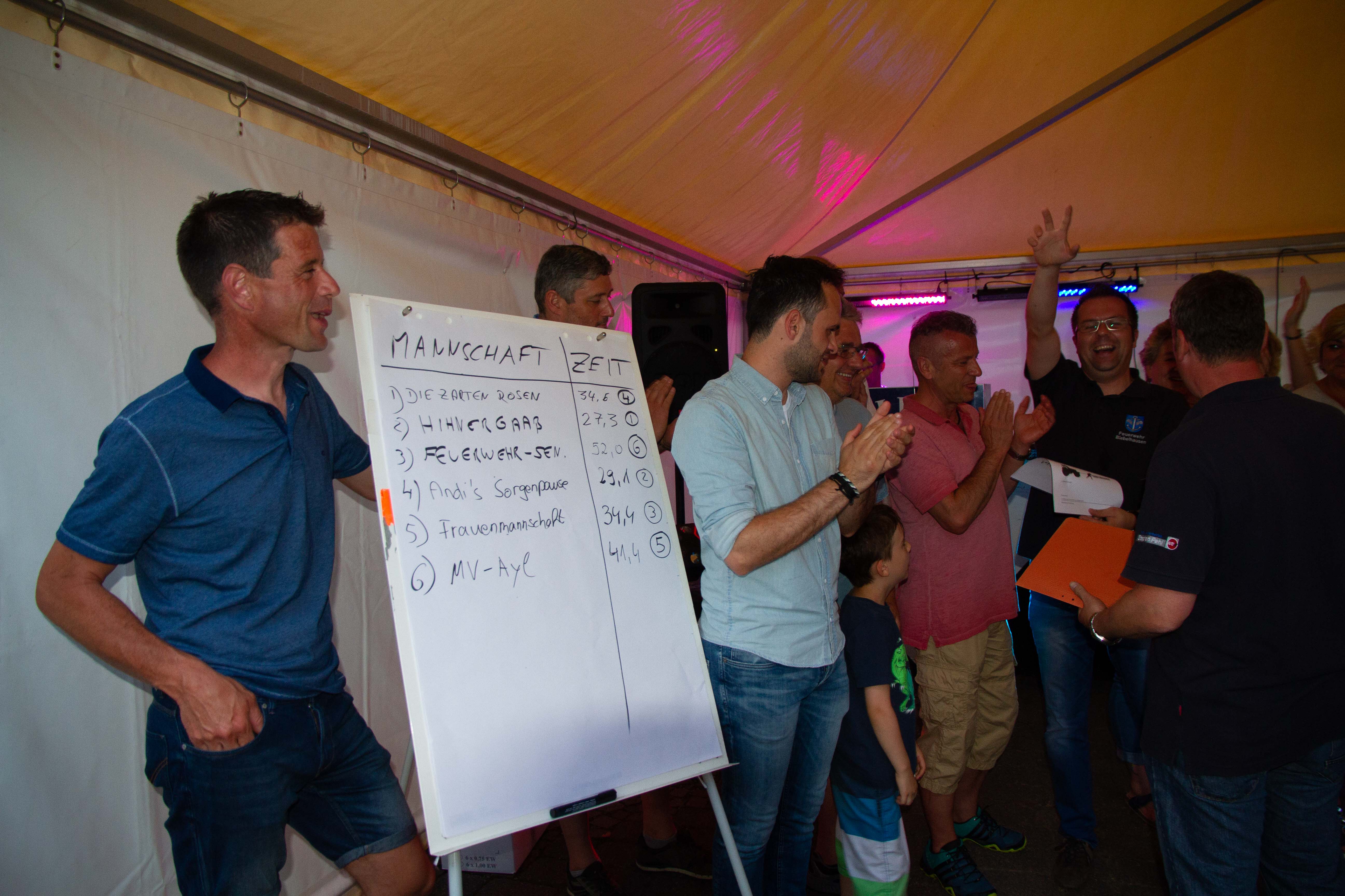 Platz 4 ging an „Die zarten Hosen“, Platz 2 „Andy Sorgenpause“, Platz 5 „Musikverein Ayl und Platz 6 an die Senioren der Feuerwehr. Auch die Kinder durften Traktor ziehen, sie wurden Sieger der Besucherherzen, Unbemerkt blieb dem Traktorfahrer, das hinter seinen Fahrzeug doch etwas nachgeholfen wurde. Zur Unterhaltung spielte im Anschluß DJ der gelbe Helm – Feten Fritz.