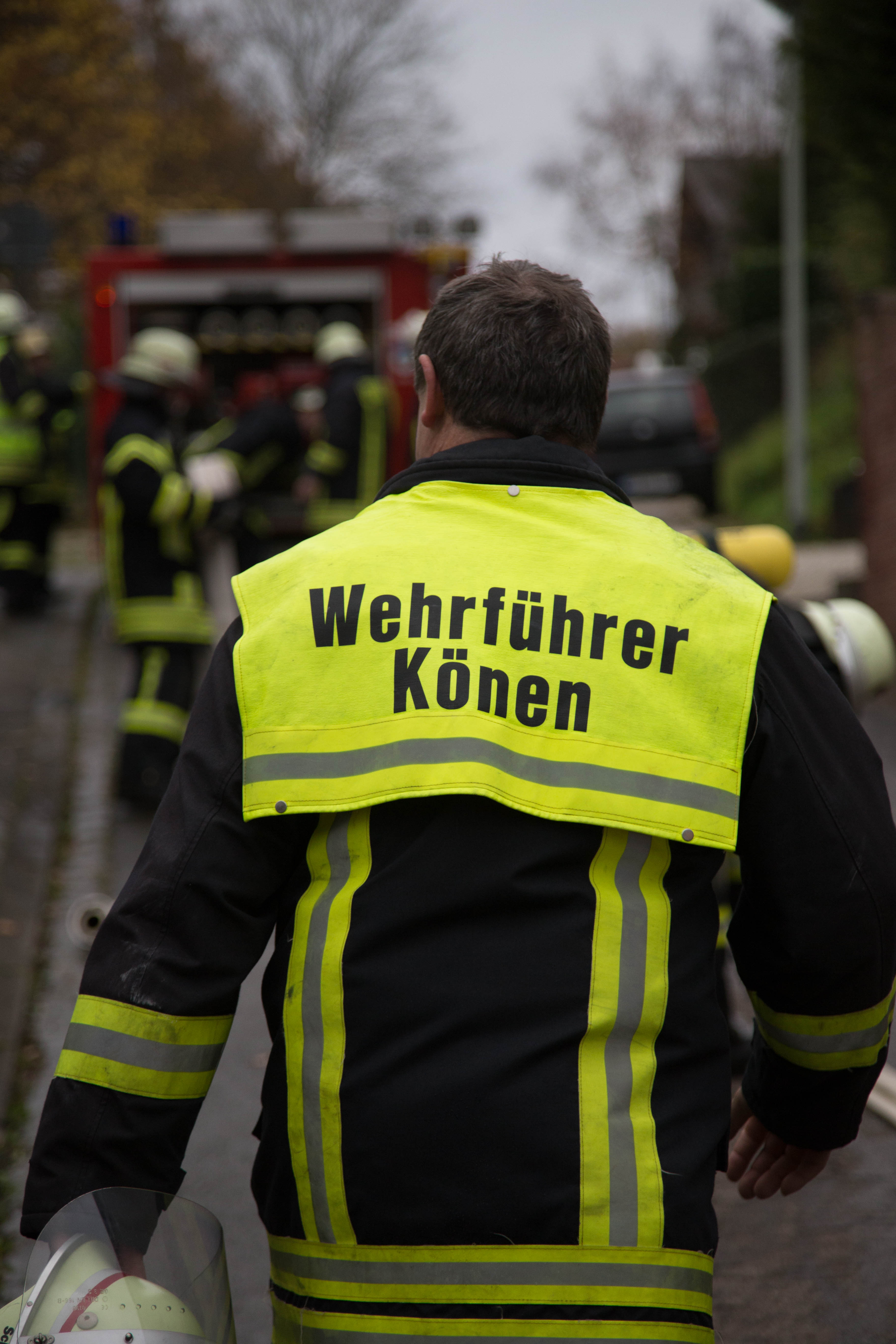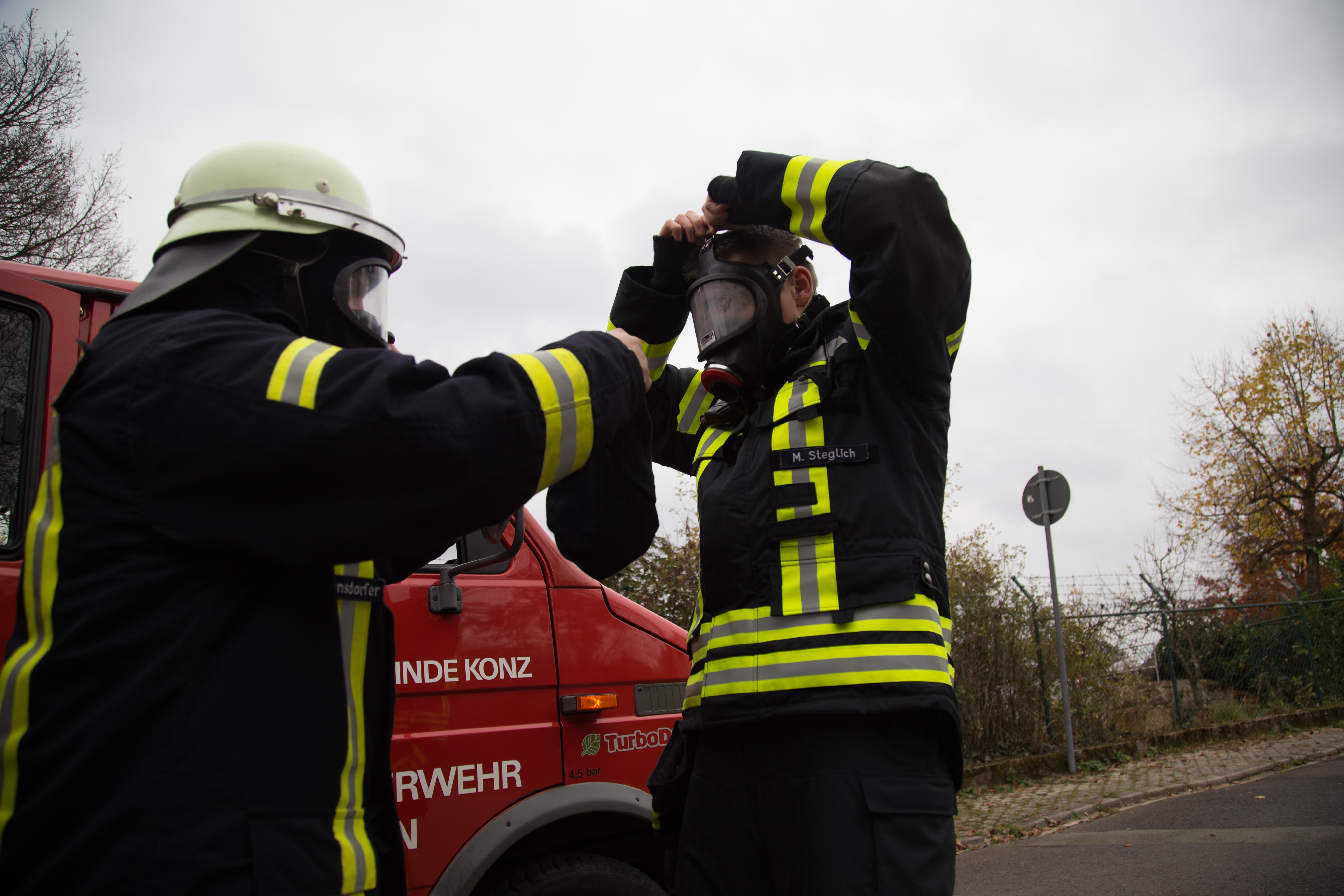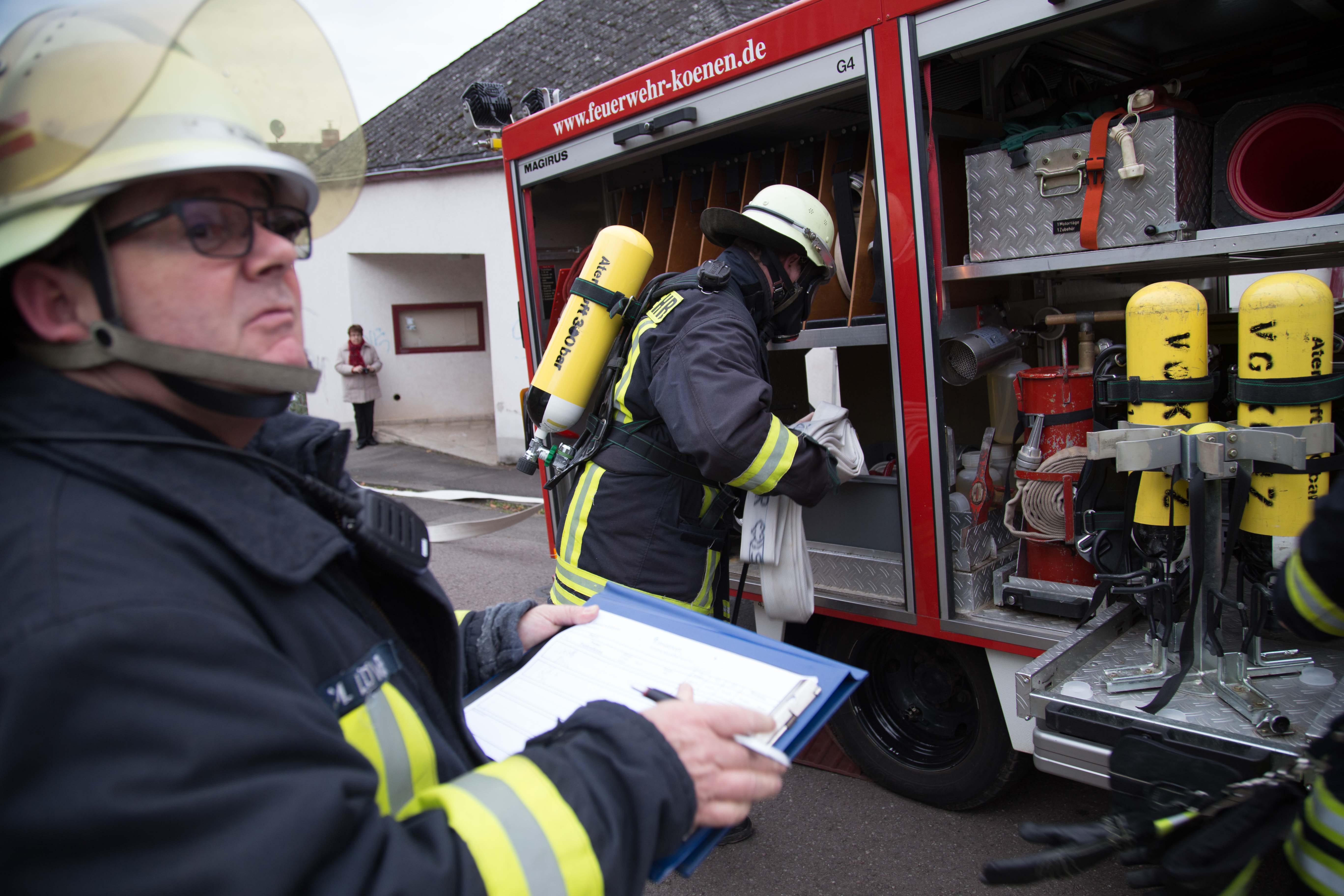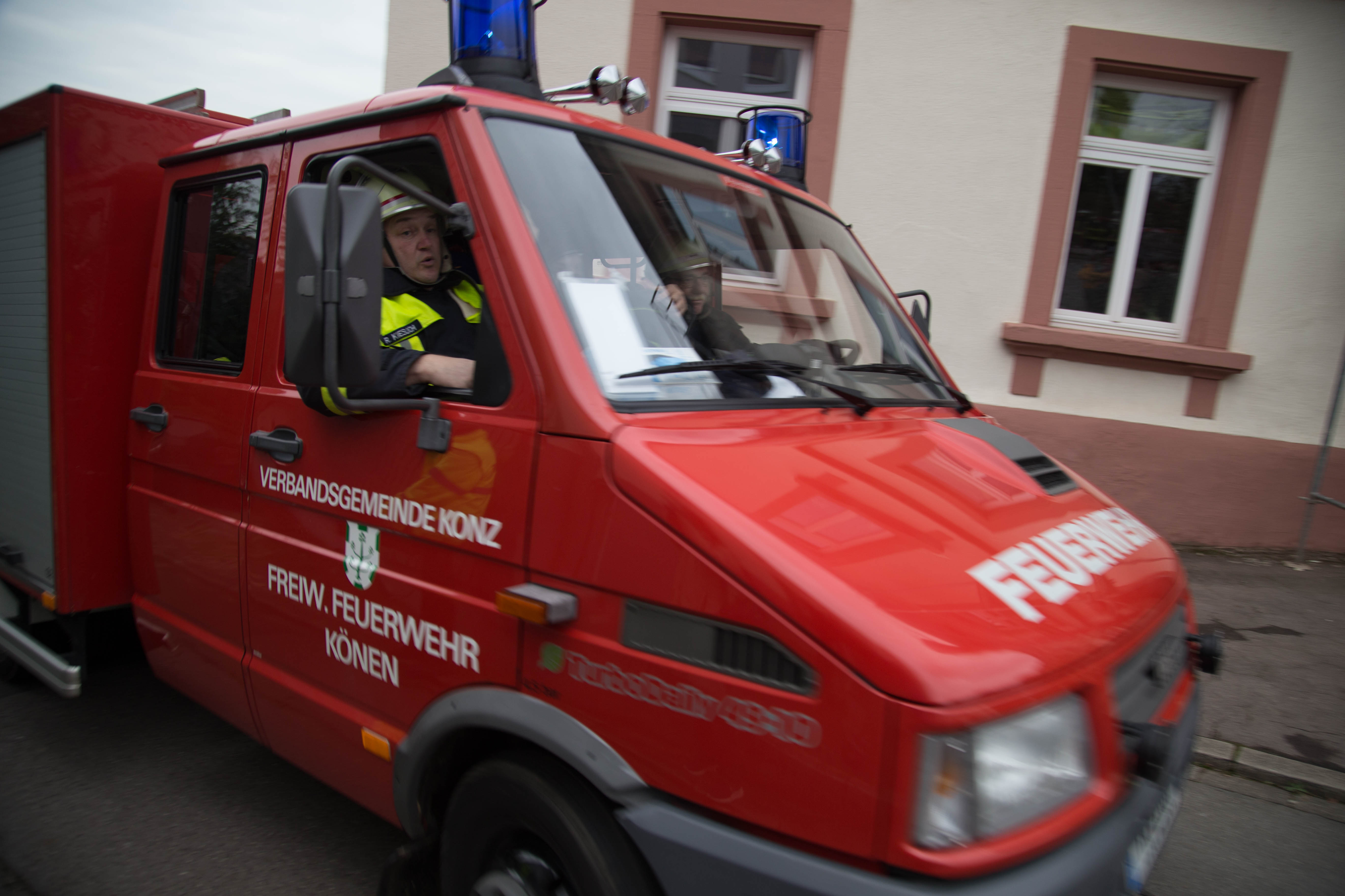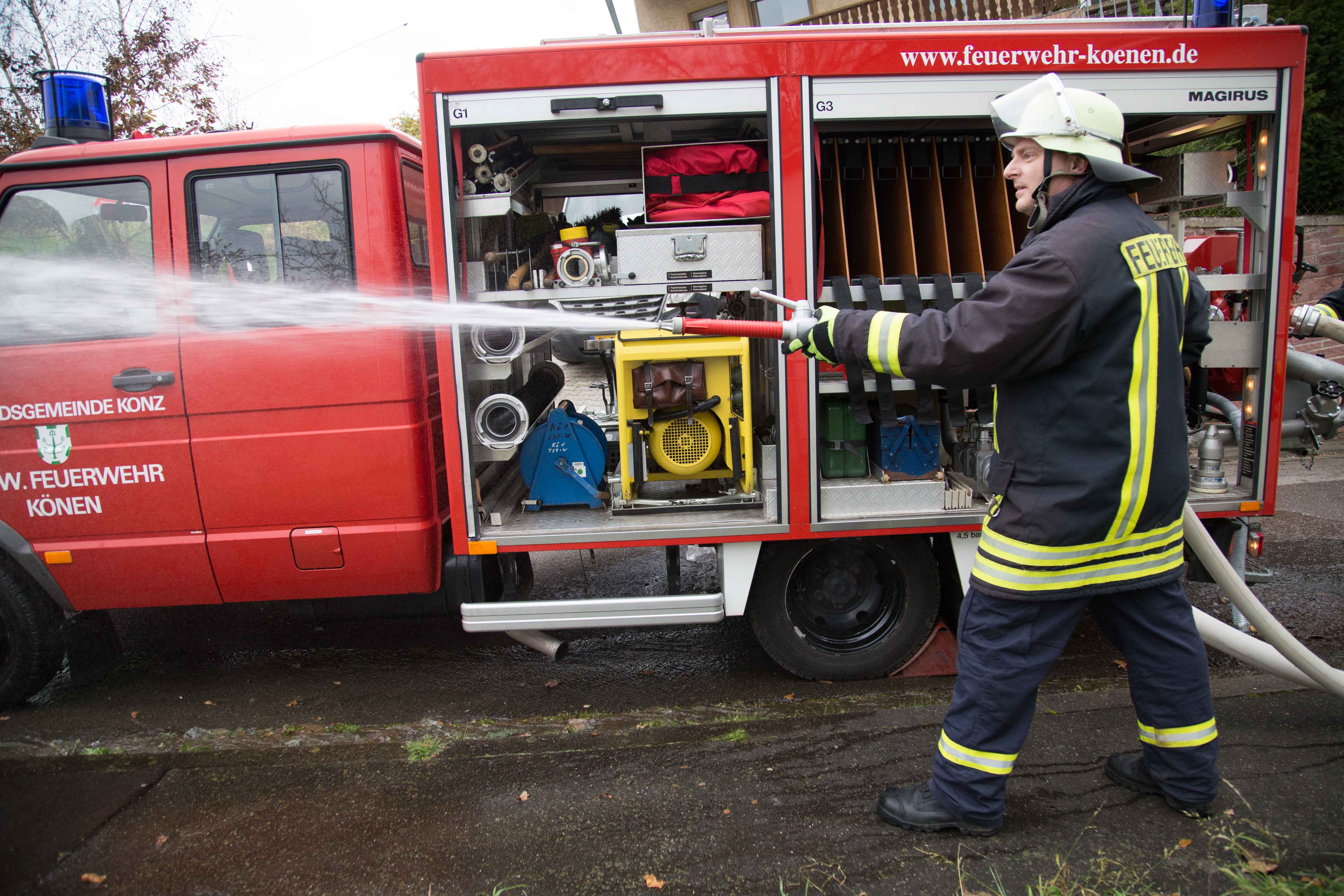 Es war die letzte Jahreshauptübung an gestrigen Samstag für Wehrführer Ralf Kieslich in Konz-Könen. Um 14.00 Uhr heulten mit Unterstützung der FEZ Konz die Sirenen in Könen. Im Jugendheim Am Hohberg entstand ein Schwelbrand mit drei Verletzen im Erdgeschoss. Eine Wasserversorgung aus zwei weiter entfernt liegenden Hydranten mussten aufgebaut werden, während sich der erste Angriffstrupp mit Atemschutzgeräten ausstattete und in das Gebäude vorrückte. Ein zweiter AGT Trupp machte sich zur Ablösung ebenfalls bereit. Viele Könener Bürger schauten die kommentierte Übung über ein Megaphon zu. Drei „Mimen“ konnten im Gebäude unter Bänken und Stühlen aus der Gefahrenzone gerettet werden. Der Wehrleiter der VG Konz Mario Gaspar, der neue Bürgermeister der VG Konz und der Stadt Konz, Joachim Weber und Ortsvorsteher Dr. Detlef Müller-Greis beobachteten den Übungsablauf.
