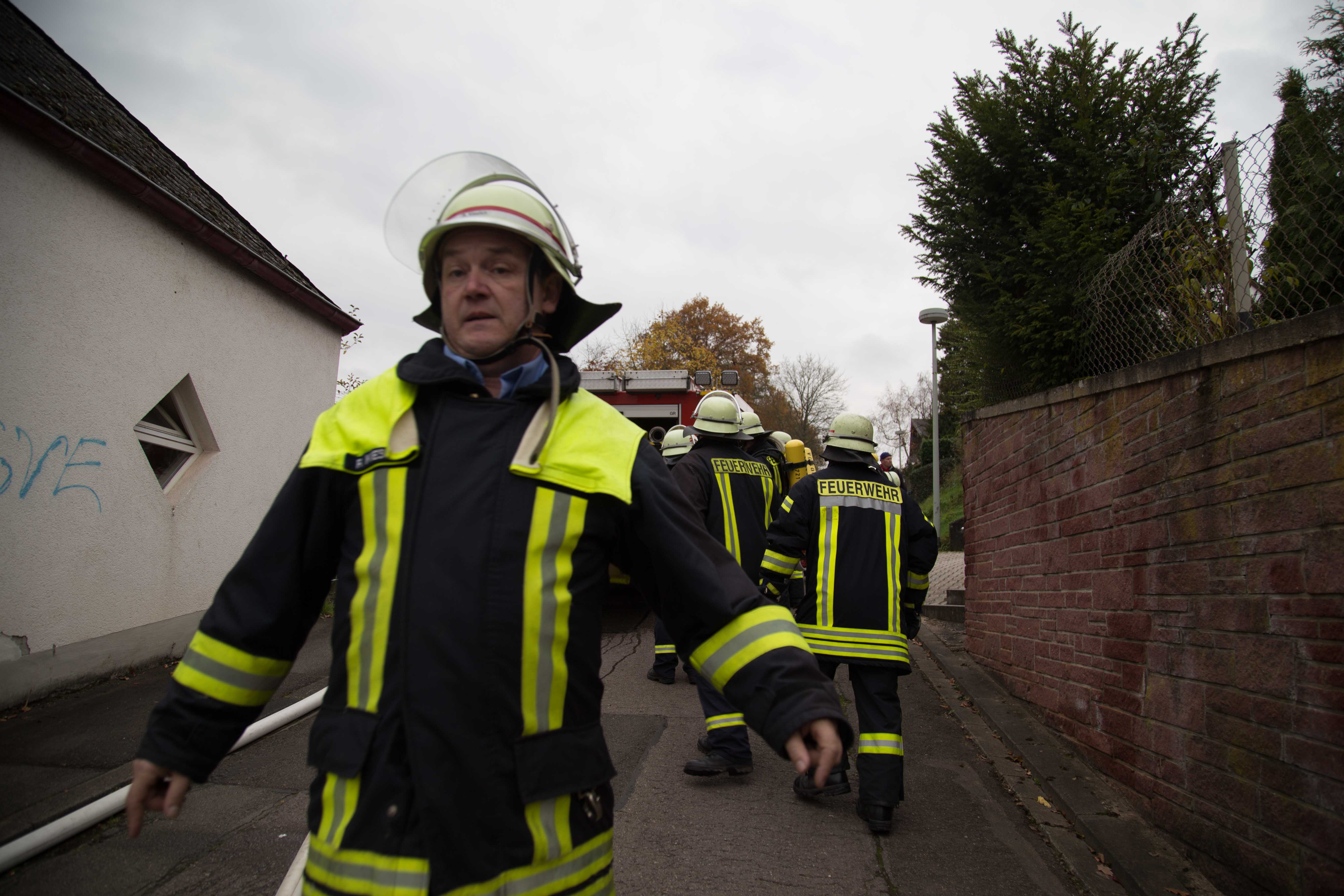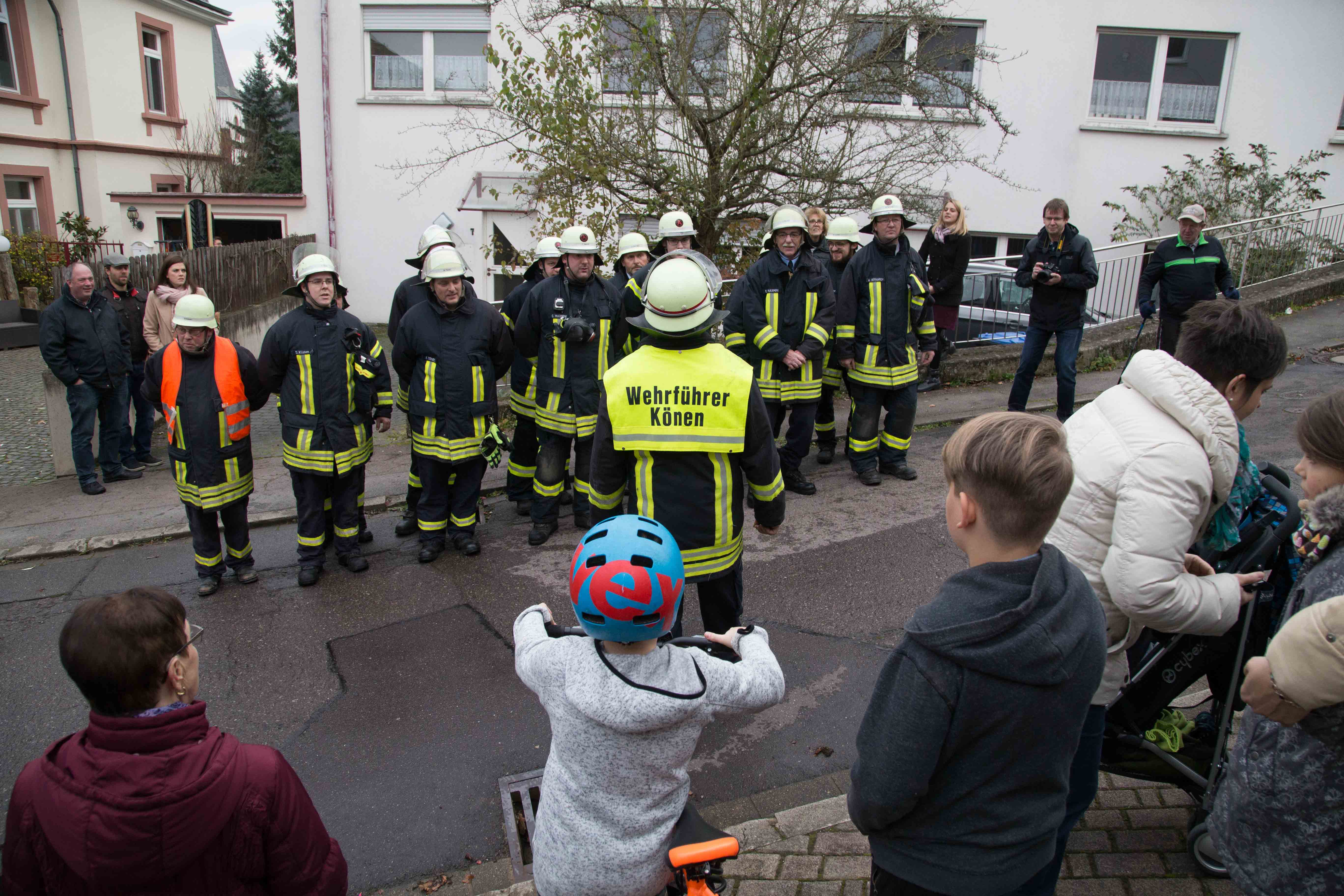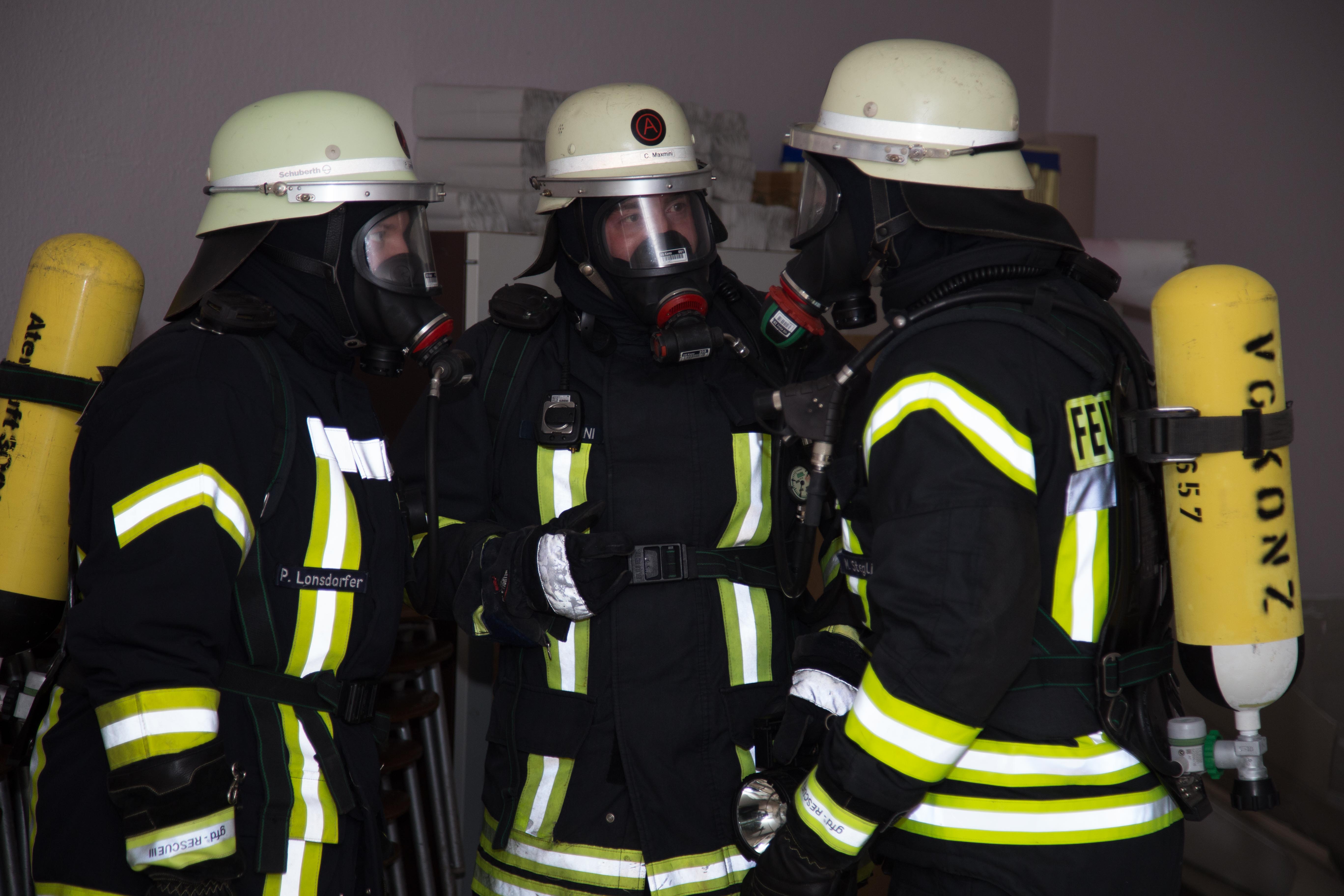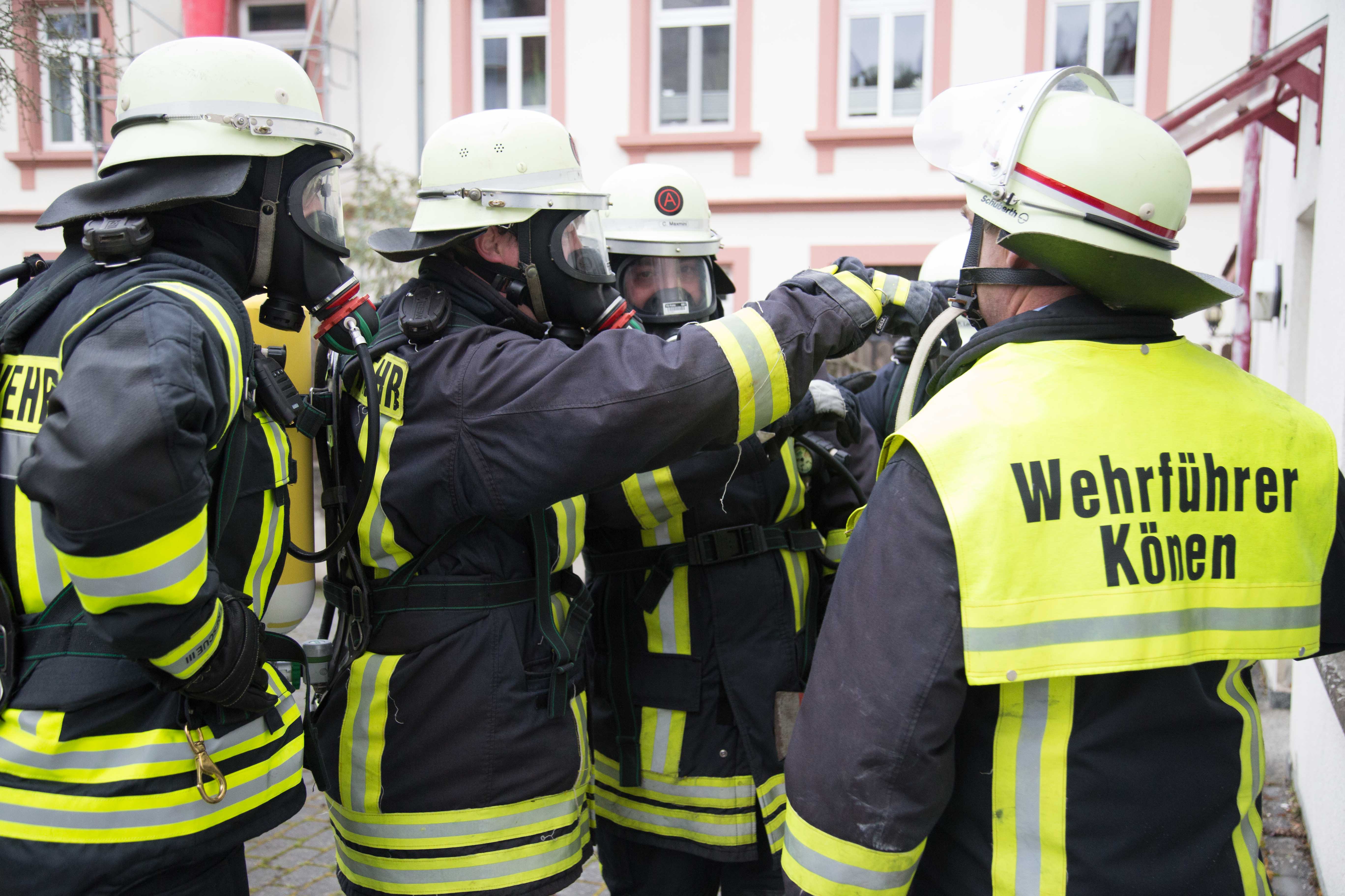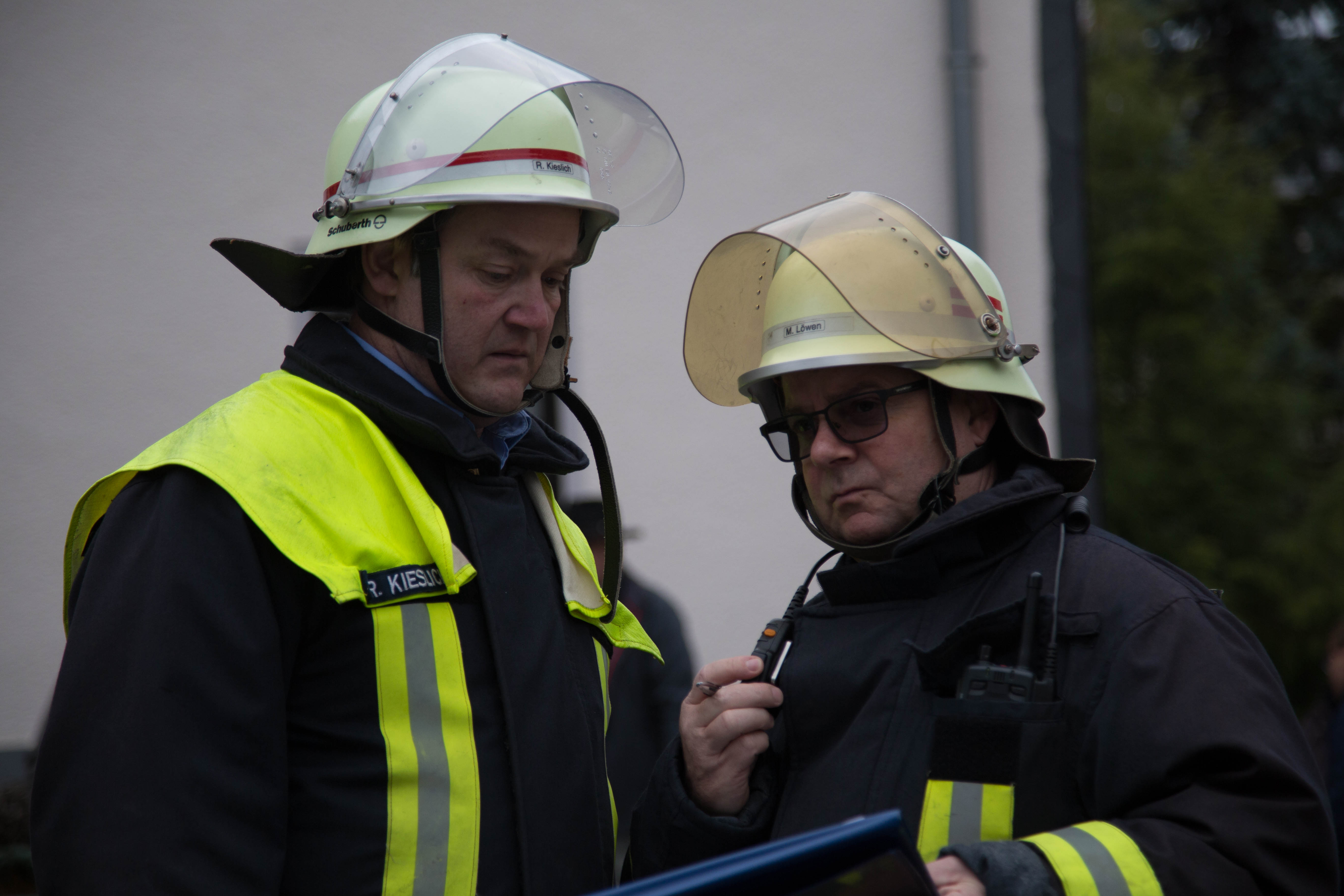 Es war die letzte Jahreshauptübung an gestrigen Samstag für Wehrführer Ralf Kieslich in Konz-Könen. Um 14.00 Uhr heulten mit Unterstützung der FEZ Konz die Sirenen in Könen. Im Jugendheim Am Hohberg entstand ein Schwelbrand mit drei Verletzen im Erdgeschoss. Eine Wasserversorgung aus zwei weiter entfernt liegenden Hydranten mussten aufgebaut werden, während sich der erste Angriffstrupp mit Atemschutzgeräten ausstattete und in das Gebäude vorrückte. Ein zweiter AGT Trupp machte sich zur Ablösung ebenfalls bereit. Viele Könener Bürger schauten die kommentierte Übung über ein Megaphon zu. Drei „Mimen“ konnten im Gebäude unter Bänken und Stühlen aus der Gefahrenzone gerettet werden. Der Wehrleiter der VG Konz Mario Gaspar, der neue Bürgermeister der VG Konz und der Stadt Konz, Joachim Weber und Ortsvorsteher Dr. Detlef Müller-Greis beobachteten den Übungsablauf.