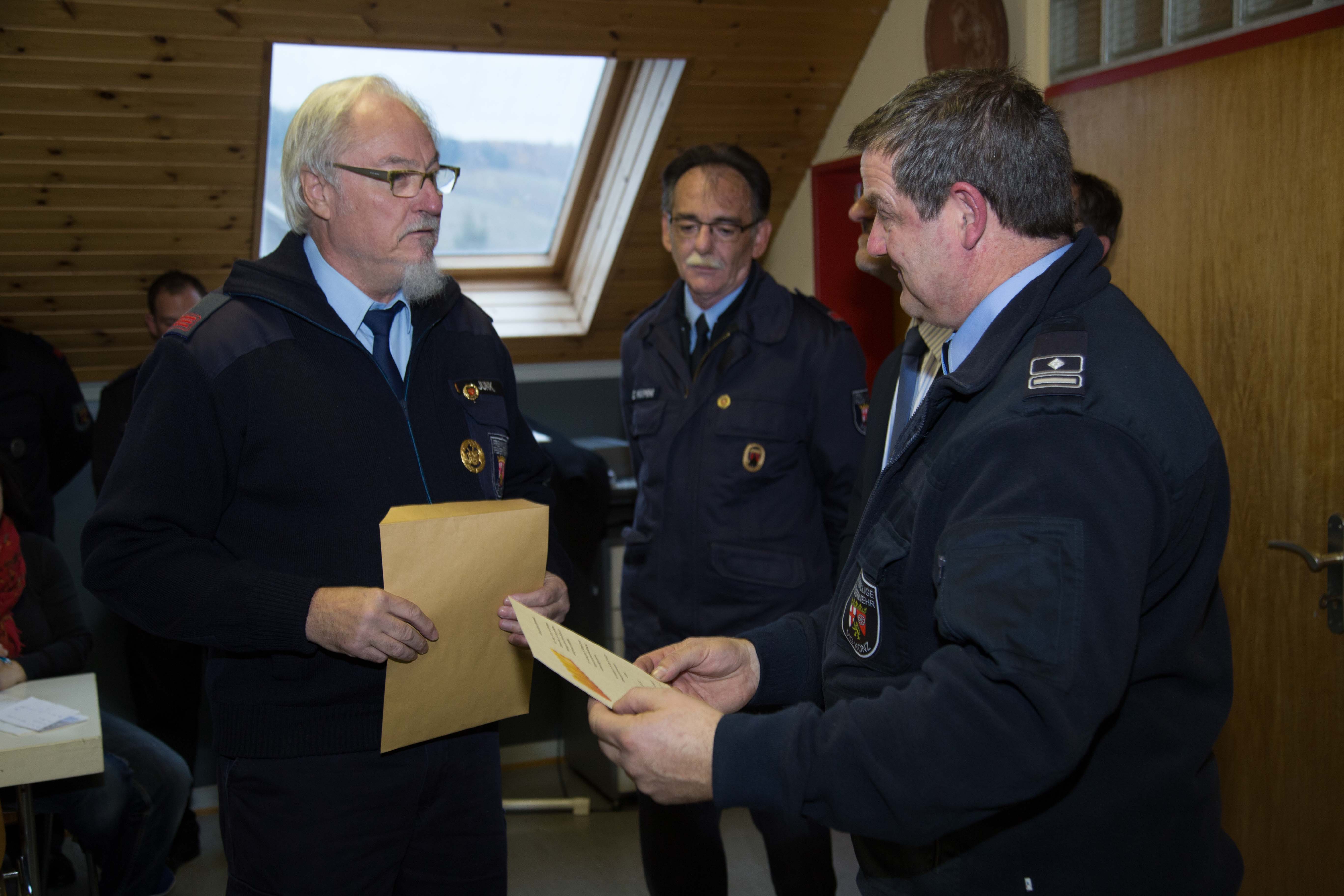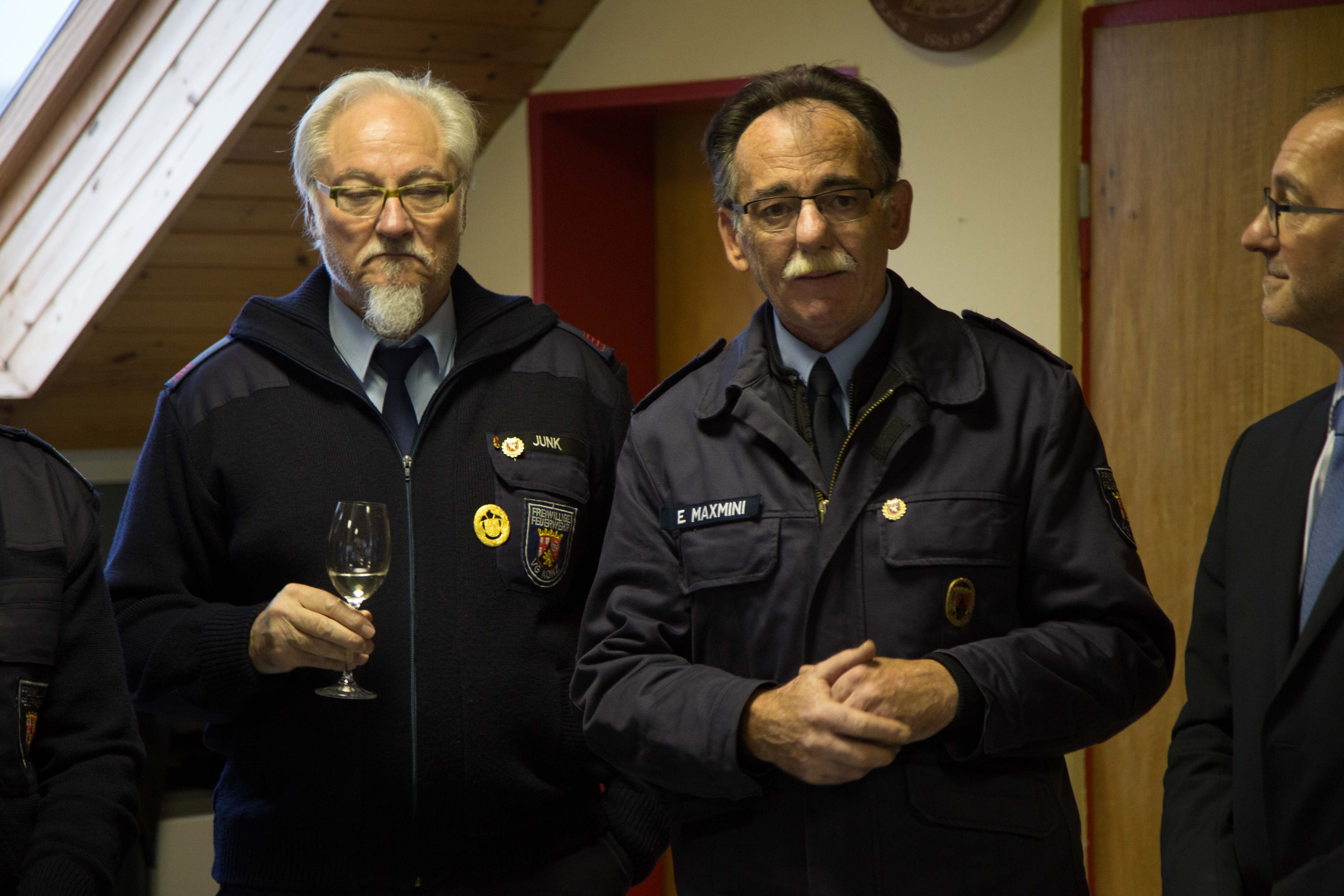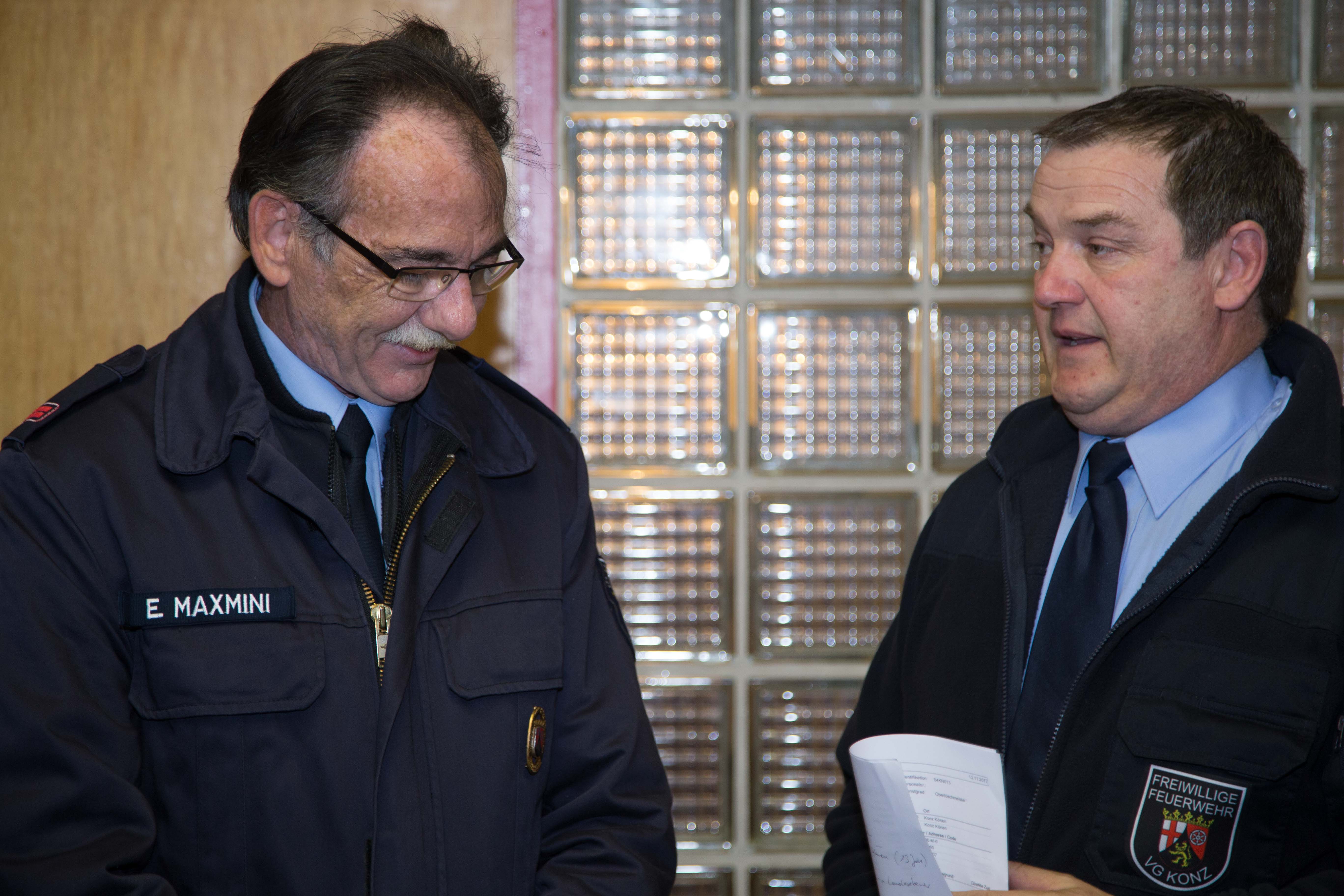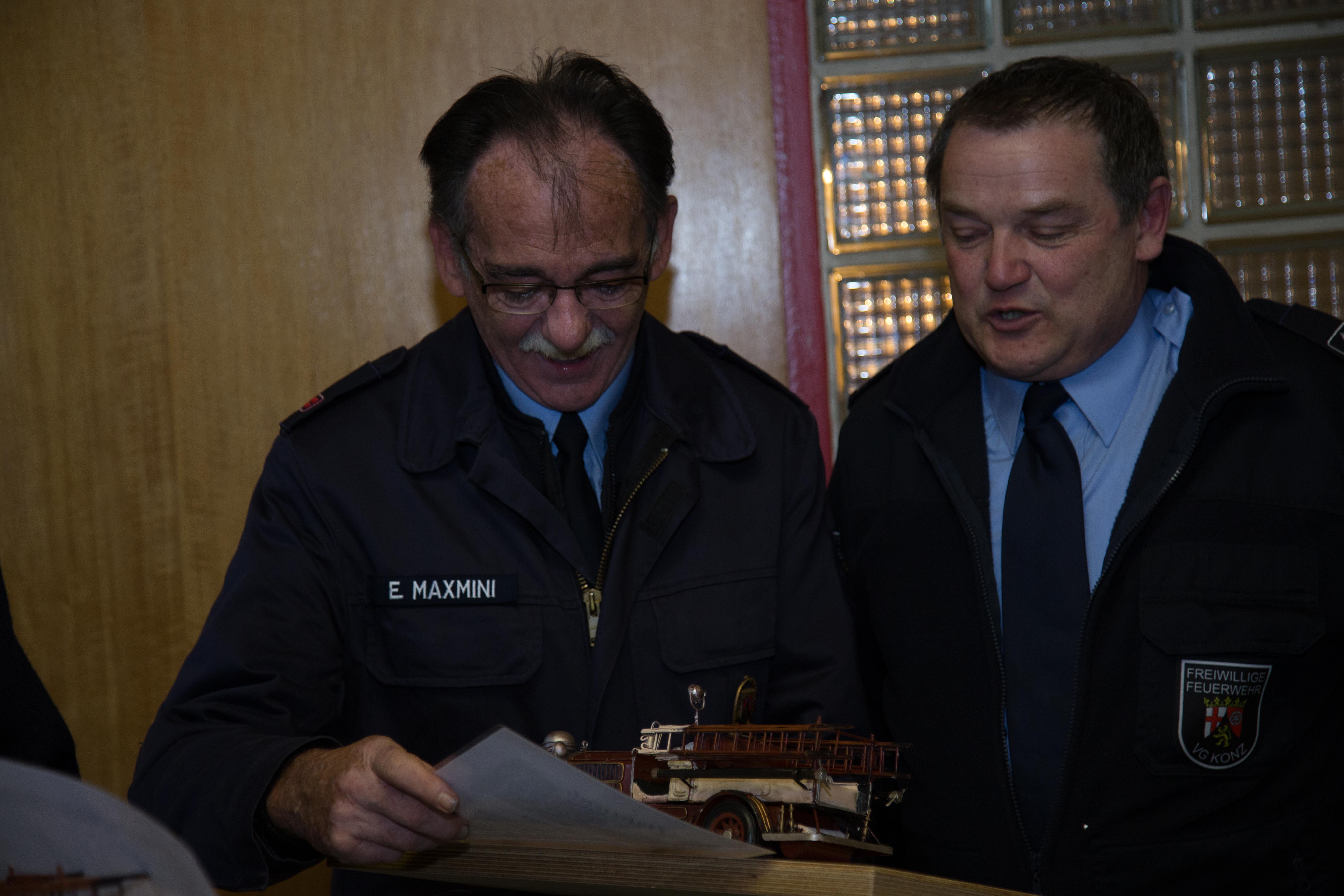 Den besonderen Dank galt zunächst den Verabschiedungen aus dem aktiven Dienst nach 48 Jahren in der Feuerwehr Könen für Reinhard Junk und Erwin Maximini. Solch ein lange Zeit als ehrenamtlicher und freiwilliger Kamerad in der Feuerwehr ist nur mit Unterstützung der Partner und Familie möglich. Ein großes Dankeschön galt auch den Kameradinnen und Kameraden in der „Familie“ der Feuerwehr Könen.Die Urkunden, das Ehrenzeichen sowie Präsente, auch für die Ehepartner wurden seitens der Verwaltung und der Wehrleitung überreicht.