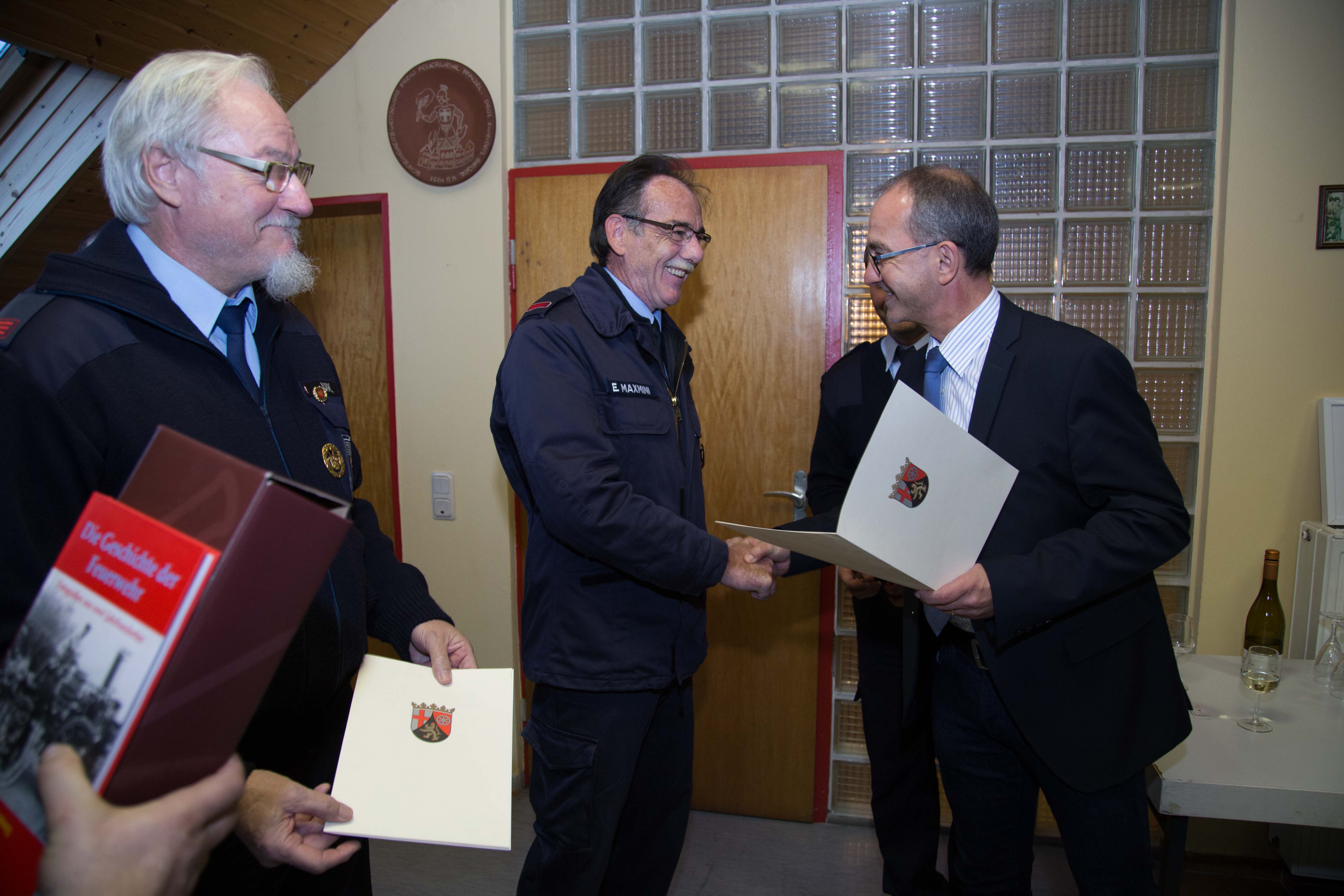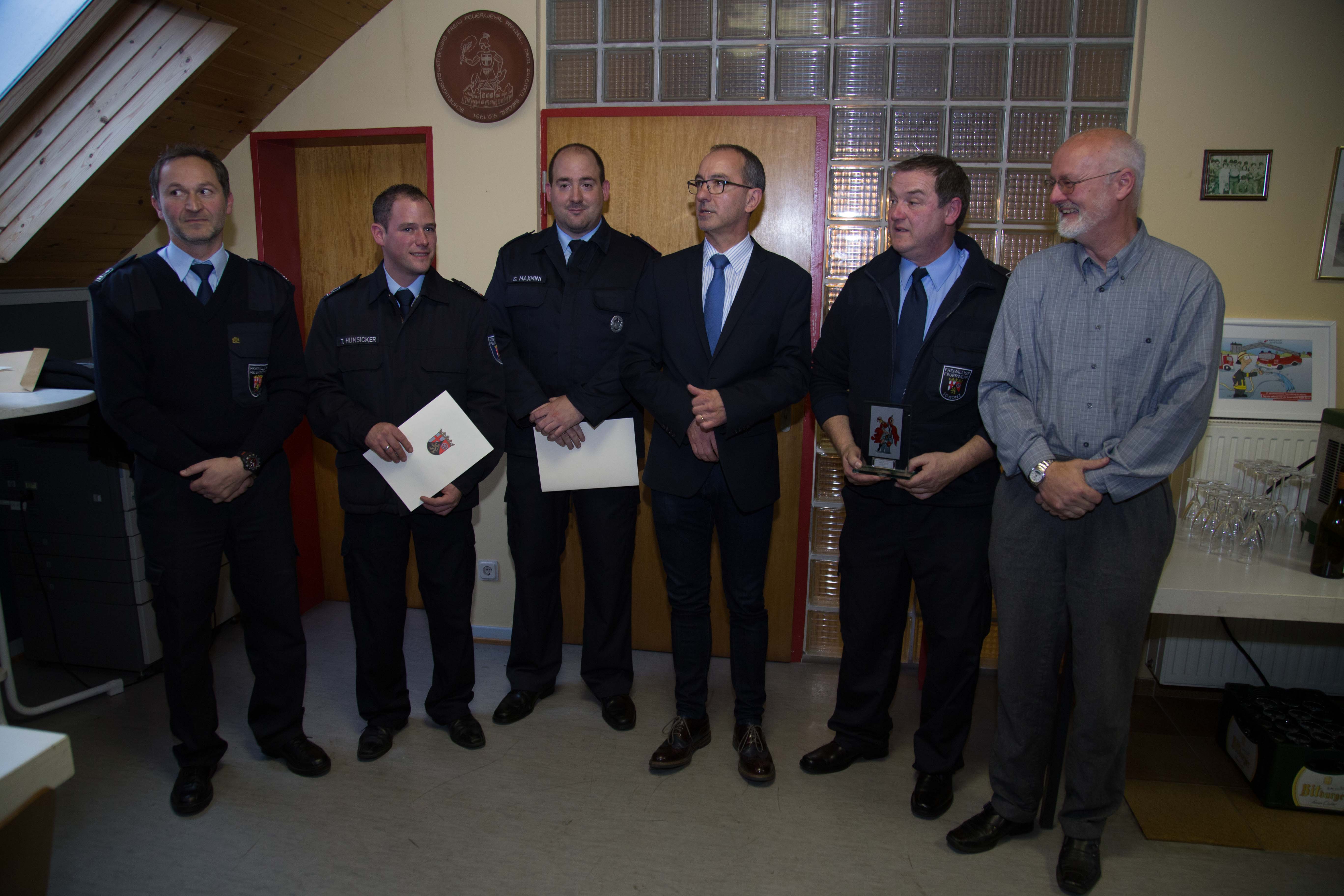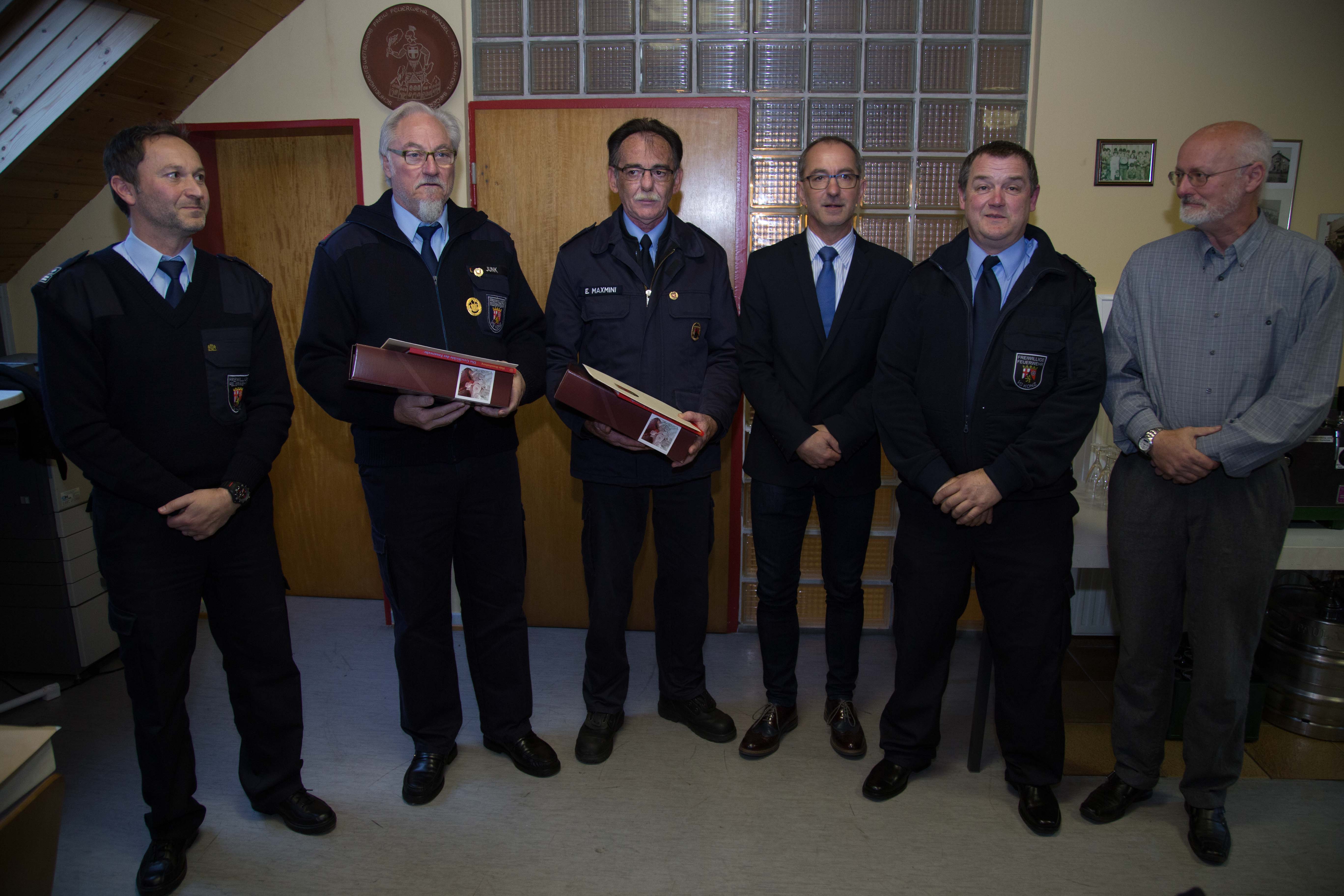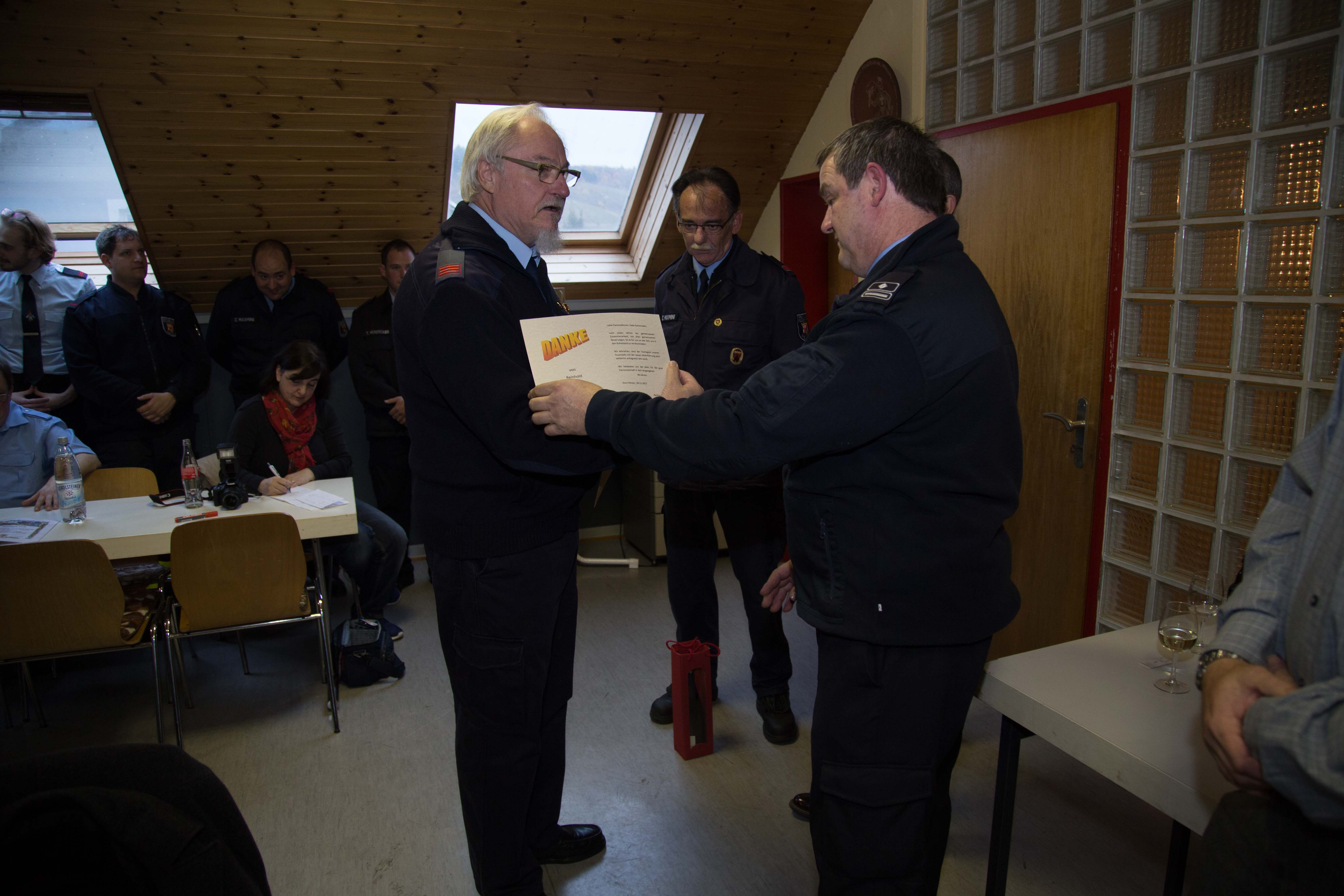Den besonderen Dank galt zunächst den Verabschiedungen aus dem aktiven Dienst nach 48 Jahren in der Feuerwehr Könen für Reinhard Junk und Erwin Maximini. Solch ein lange Zeit als ehrenamtlicher und freiwilliger Kamerad in der Feuerwehr ist nur mit Unterstützung der Partner und Familie möglich. Ein großes Dankeschön galt auch den Kameradinnen und Kameraden in der „Familie“ der Feuerwehr Könen.Die Urkunden, das Ehrenzeichen sowie Präsente, auch für die Ehepartner wurden seitens der Verwaltung und der Wehrleitung überreicht.