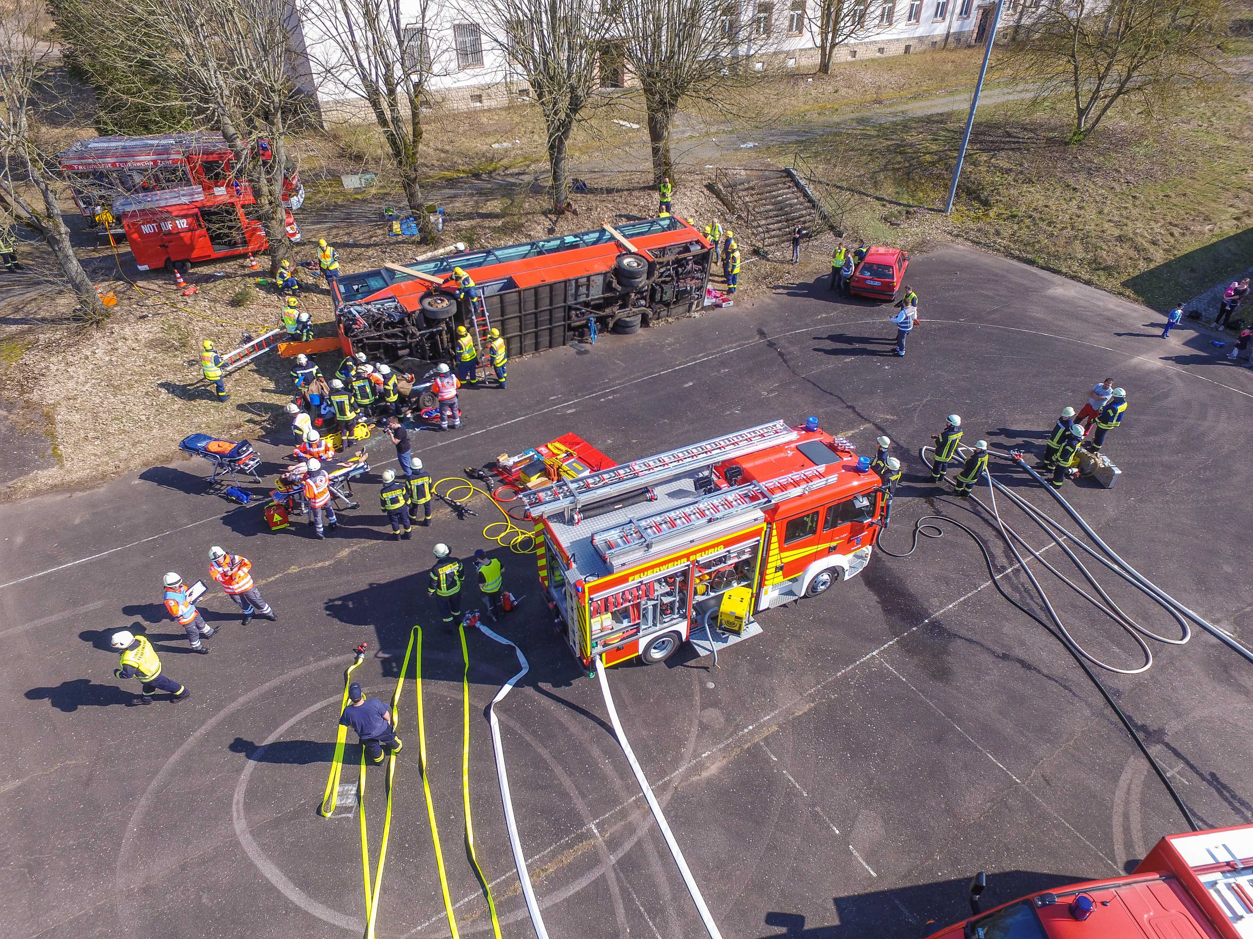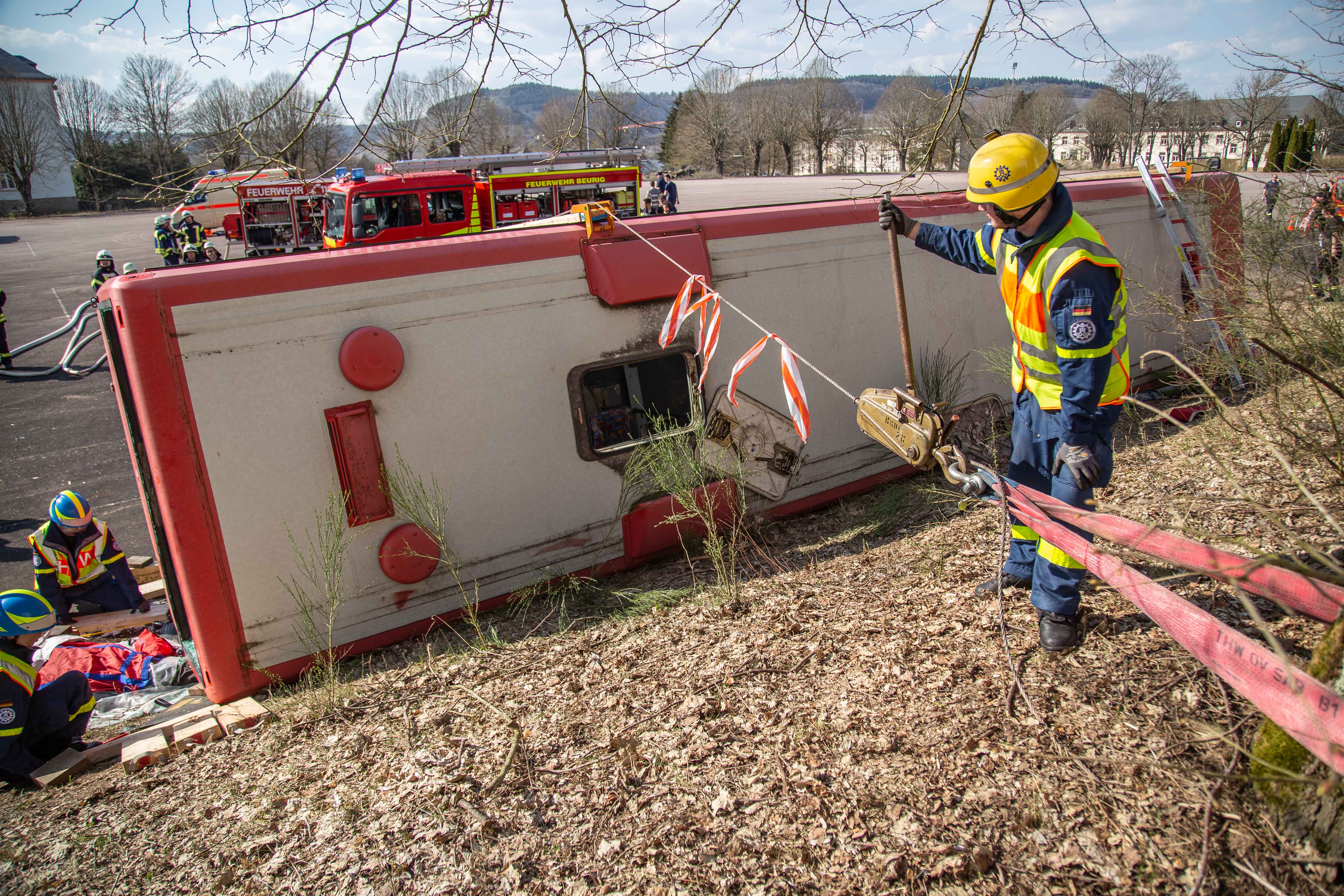 Saarburg. Die Unfall-Darstellung -Ein Reisebus kippt in einer Böschung um, ein PKW fährt frontal in die Unfallstelle – war schon realistisch dargestellt worden.