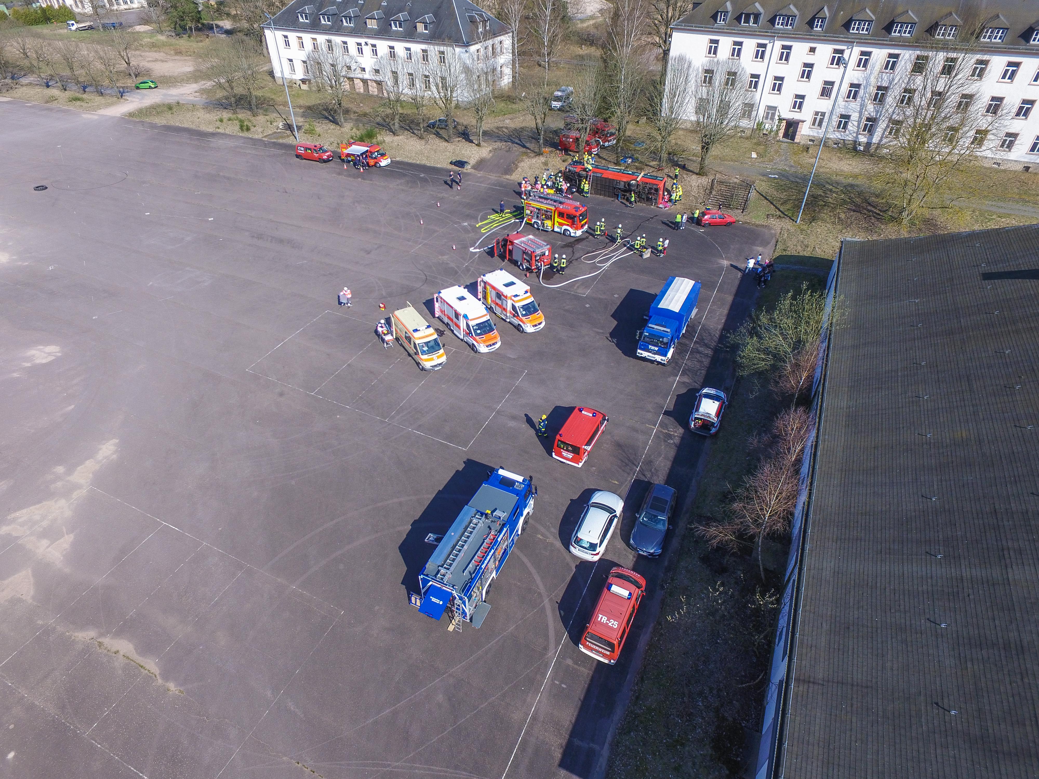 An der Einsatzstelle im ehemaligen Kasernengelände finden die ersten Einsatzkräfte folgende Lage vor: Ein Reisebus ist in der Böschung auf die Seite gekippt, und ein PKW ist frontal auf den Bus aufgefahren. Im PKW befinden sich zwei schwerverletzte Personen. Beide beide sind im Fahrzeug eingeklemmt. Im Bus liegen 6 Personen, davon zwei zwischen den Sitzen eingeklemmt.